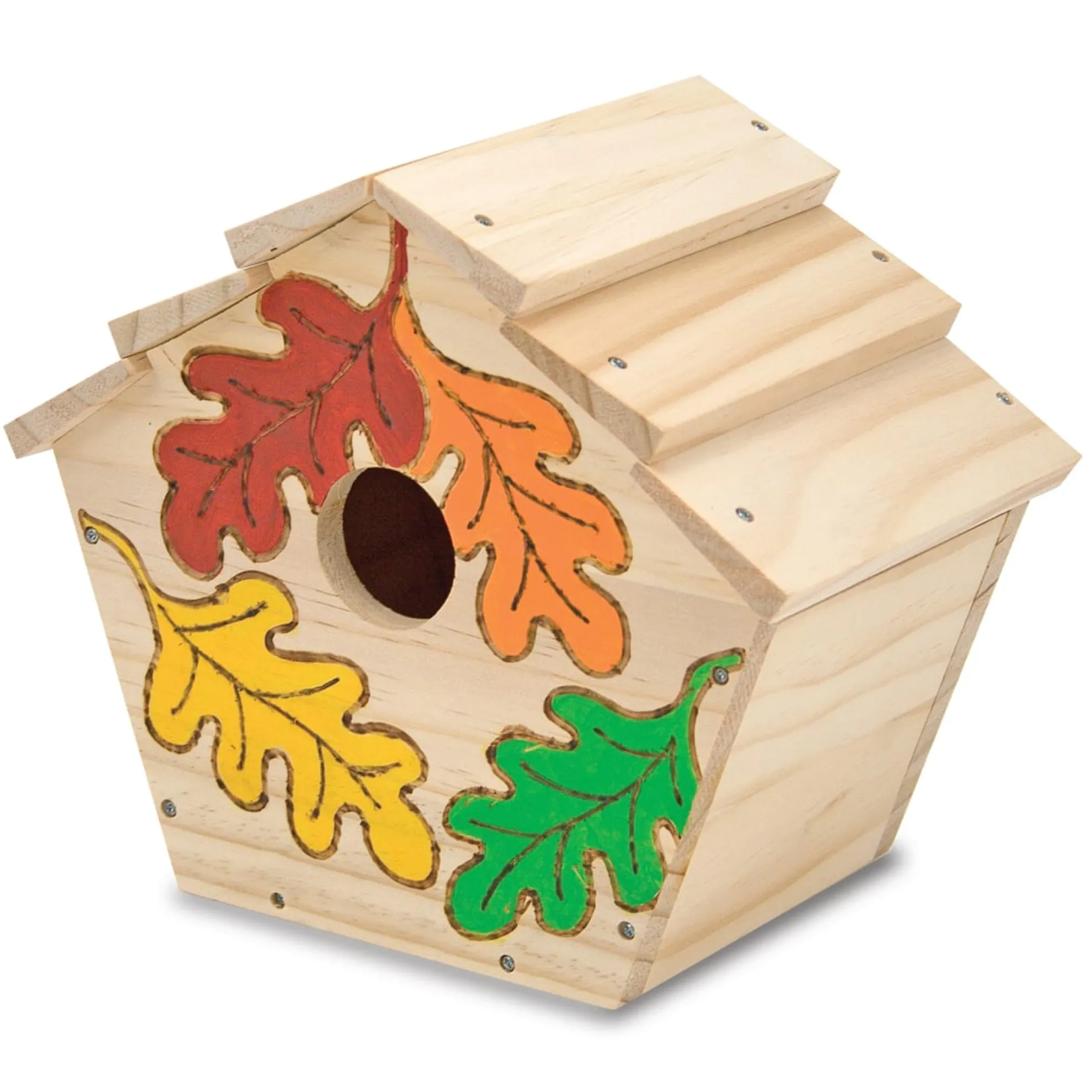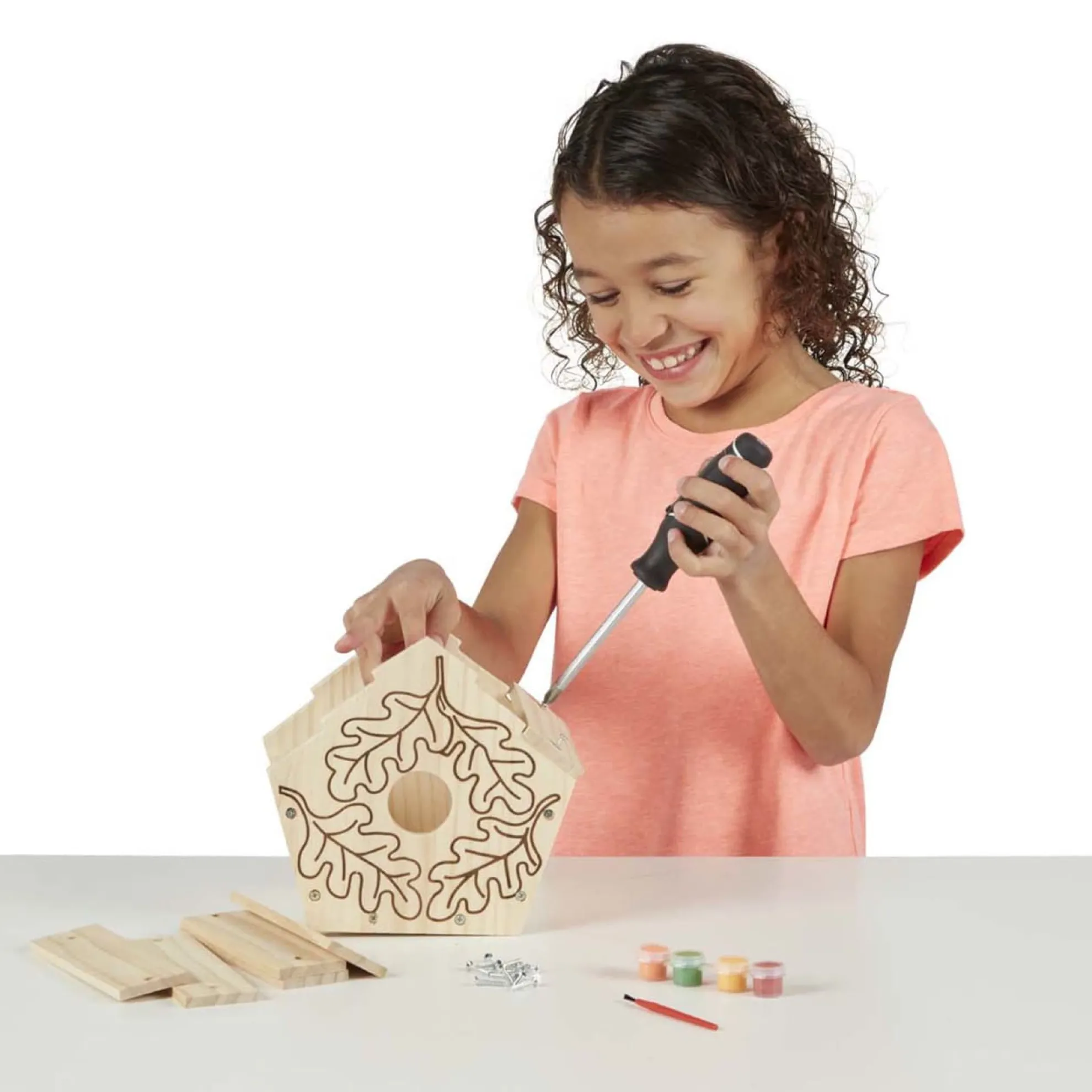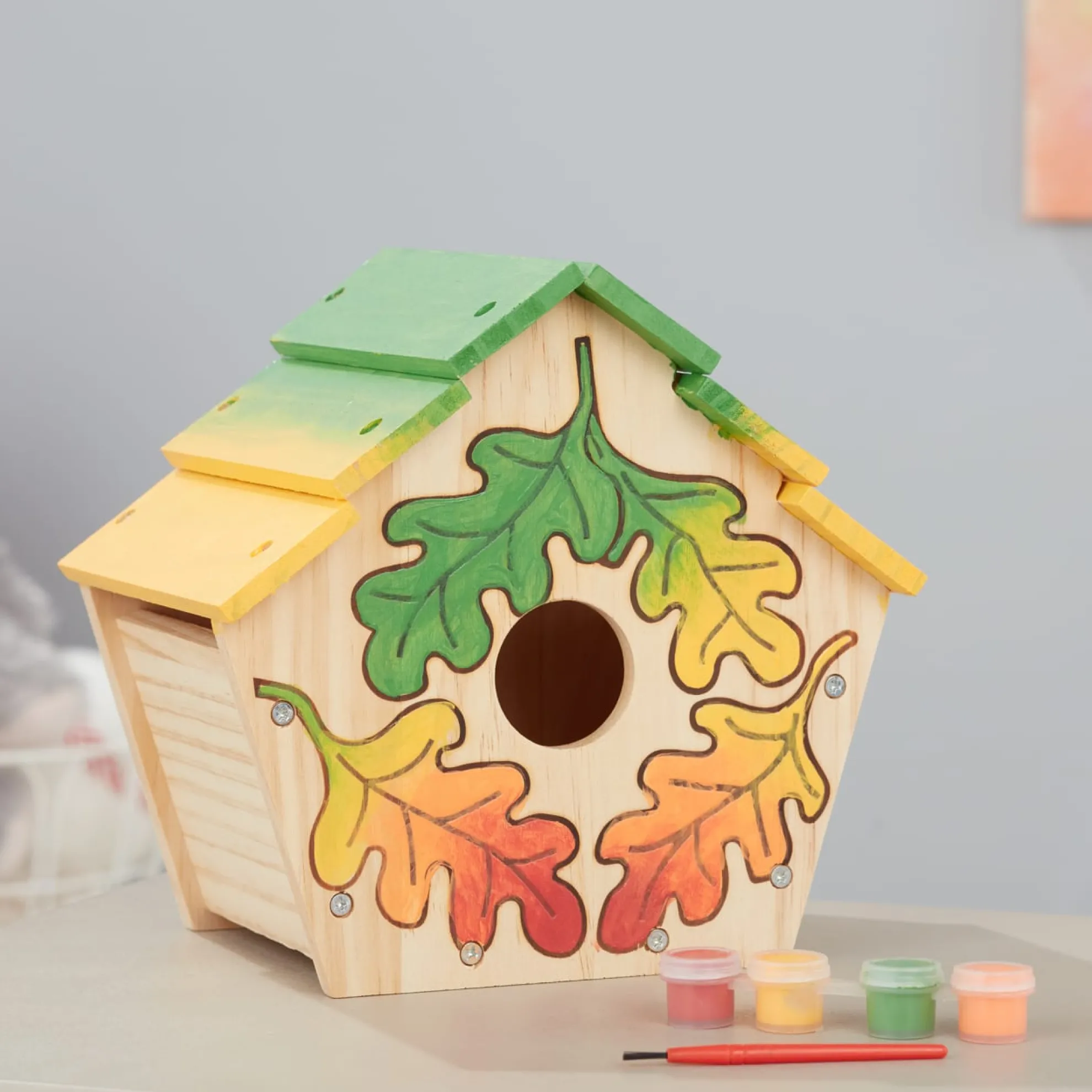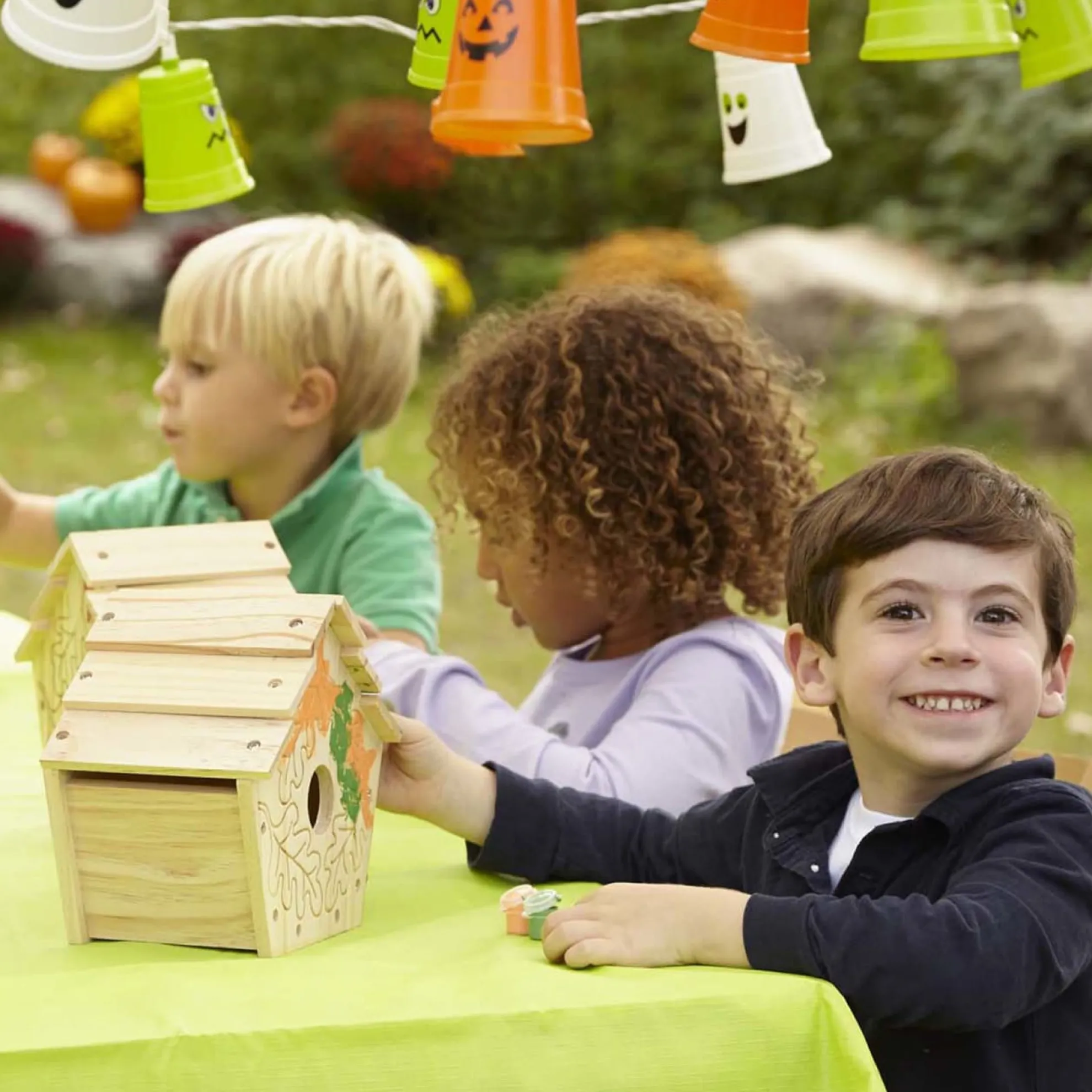 Add your unique personal touches to make an original craft inspired by you and your imagination! It’s fun and easy to assemble and decorate this adorable wooden birdhouse. Hang in the yard and feathered friends will love their home-tweet-home! Wooden panels, screws, 4 pots of paint and brush included.