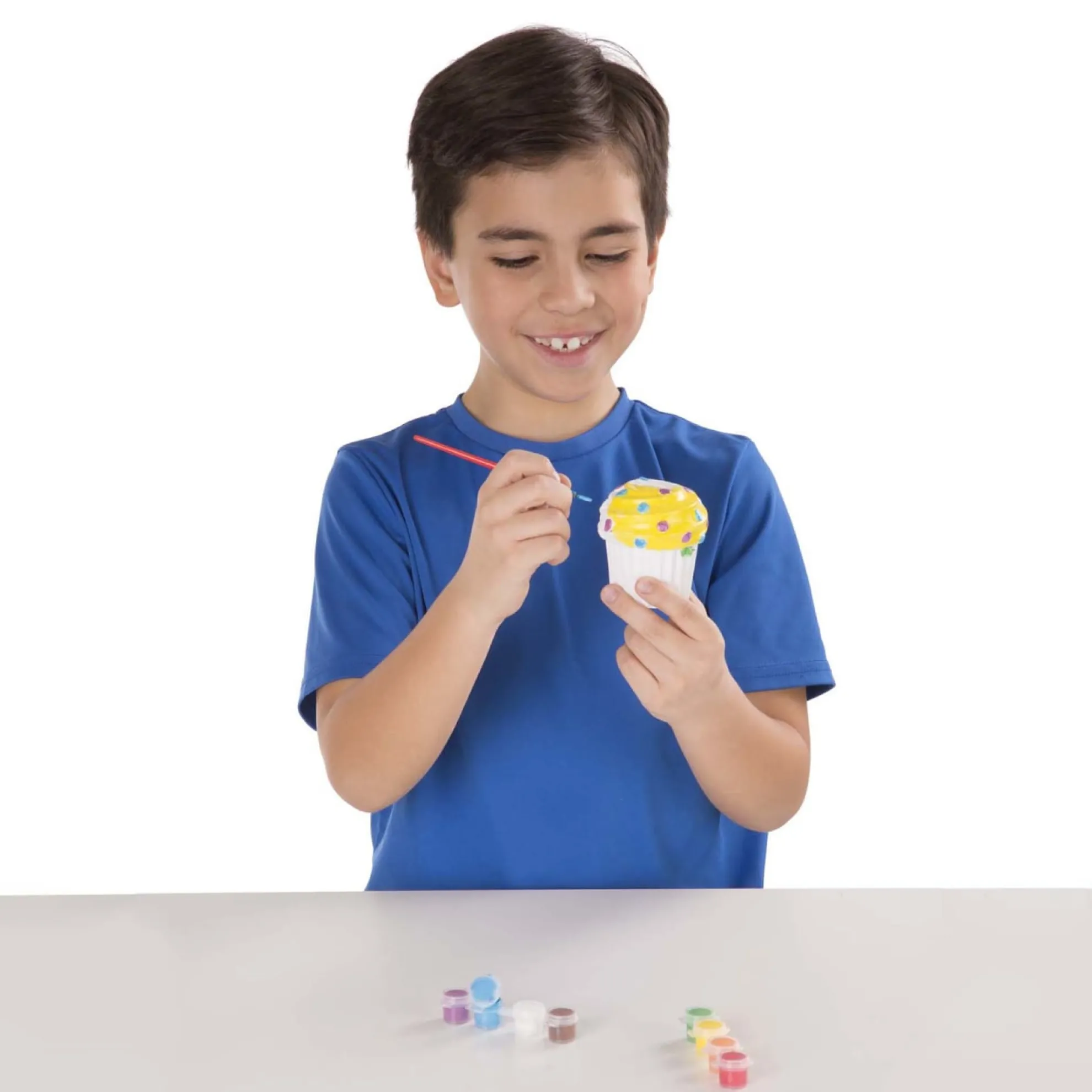 - Use the included paint and brush to decorate this little bank and make it your own. A rubber stopper keeps coins inside until it’s time to count the “sweet” rewards! Includes everything you need! Resin cupcake bank, 8 pots of paint and paintbrush. Bank measures 3″ high.