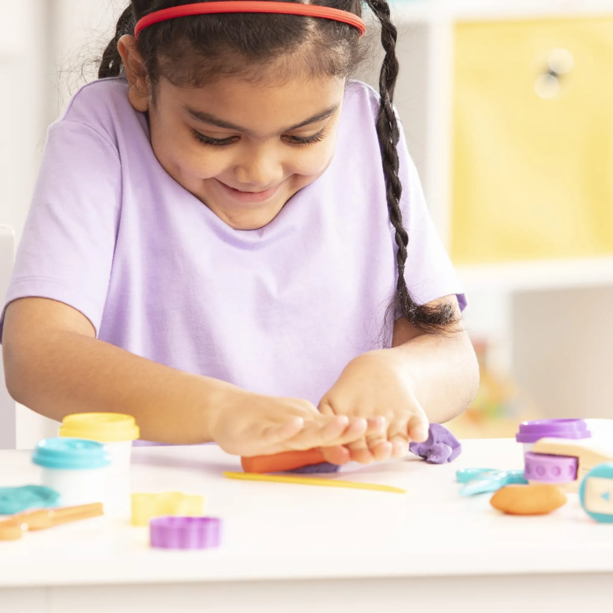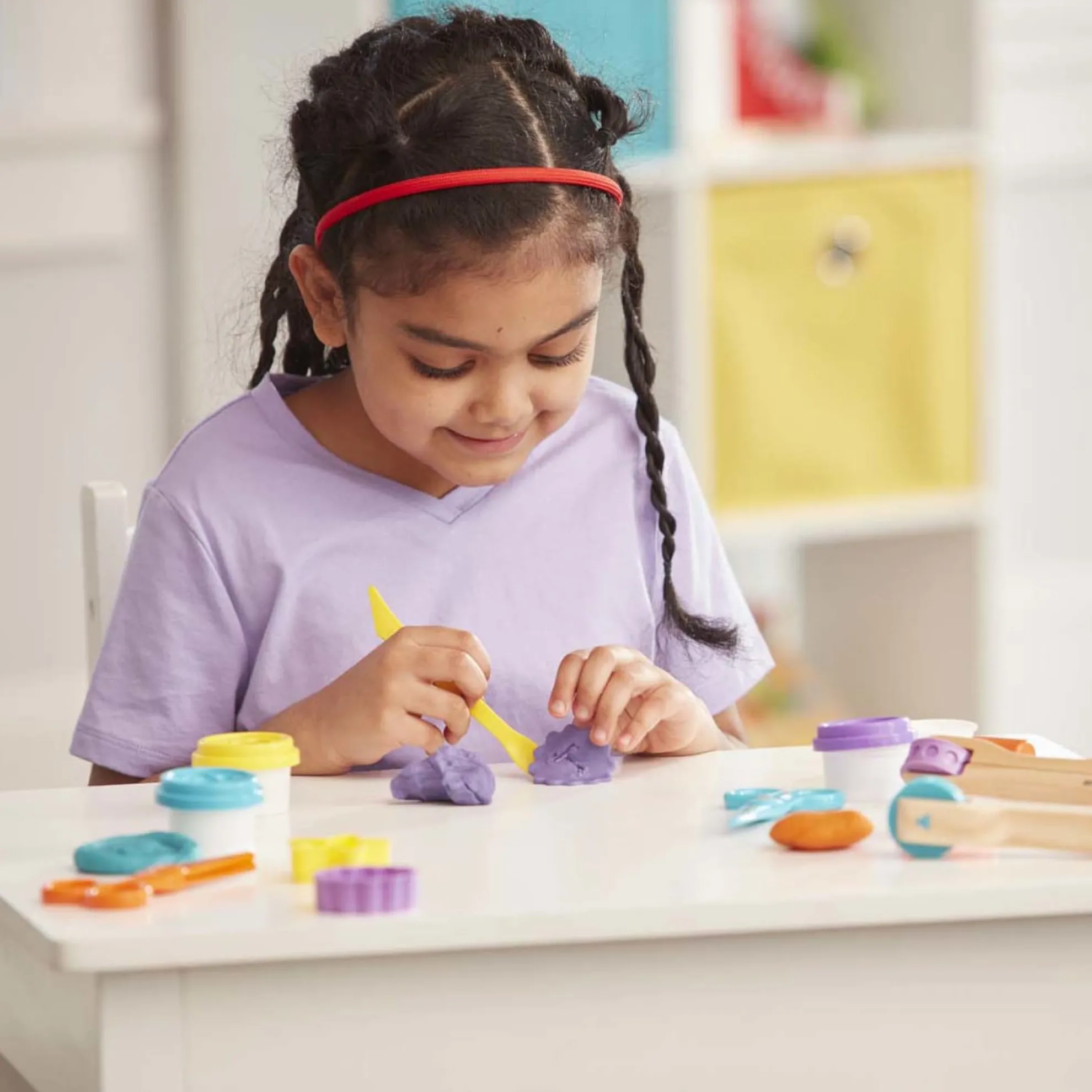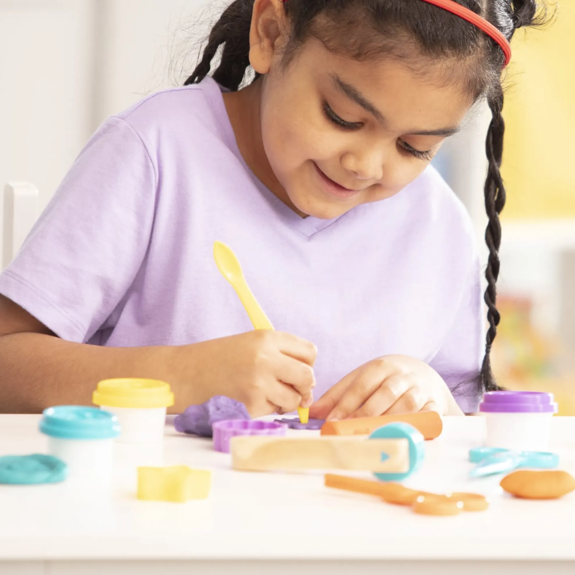 - 4 vibrant dough colors: purple, orange, yellow, and blue