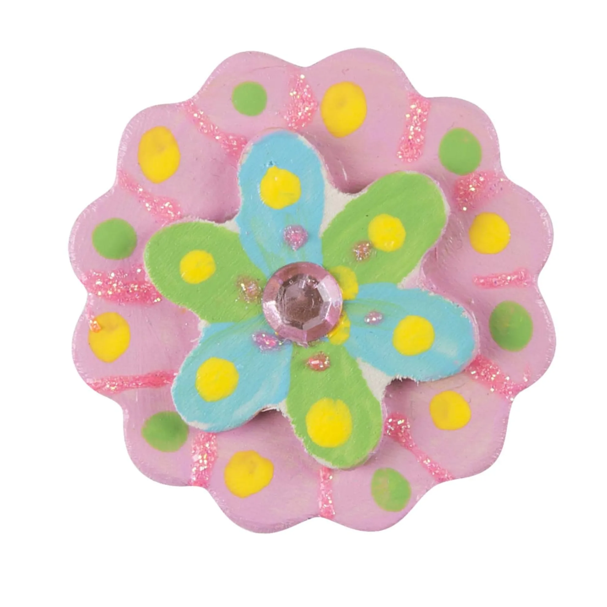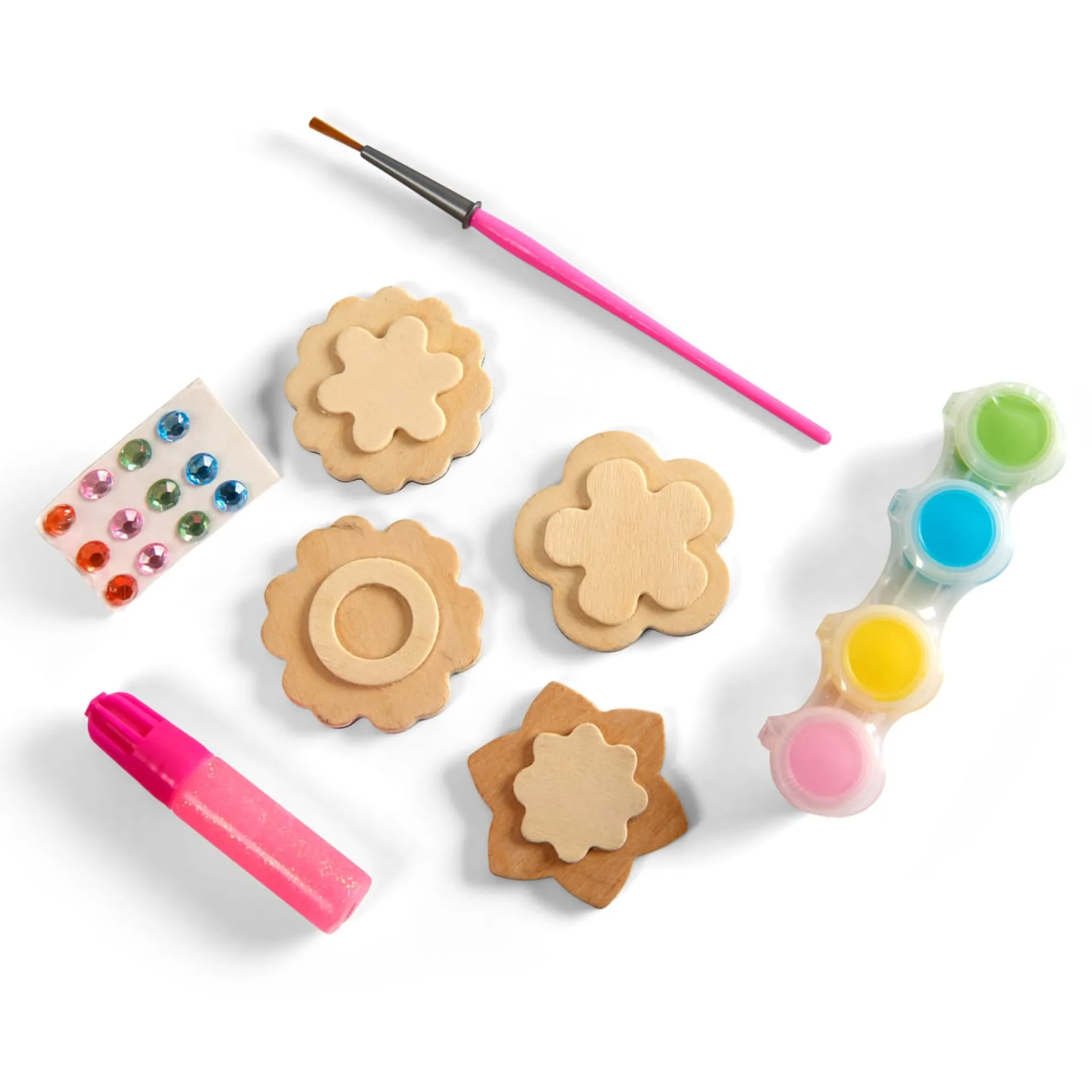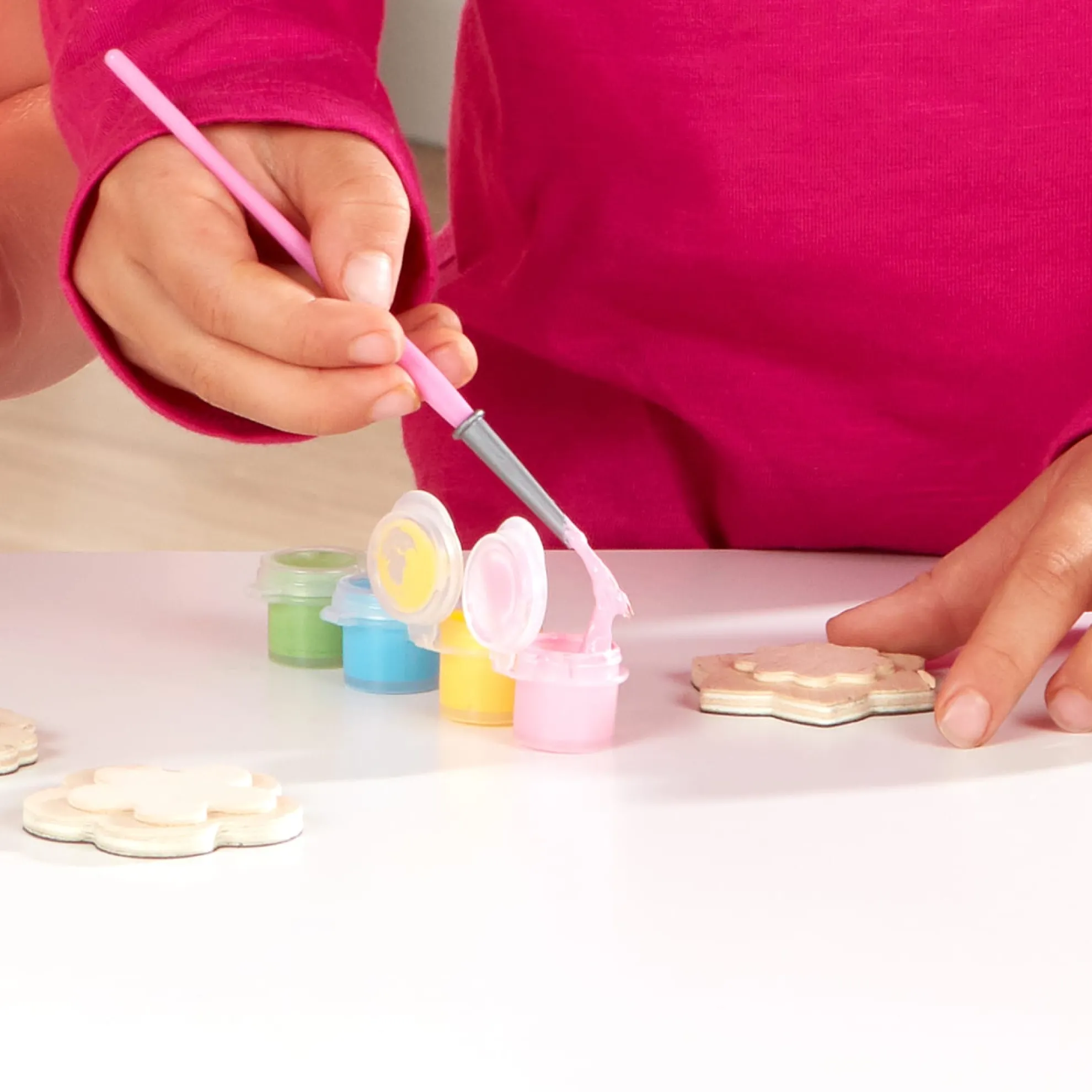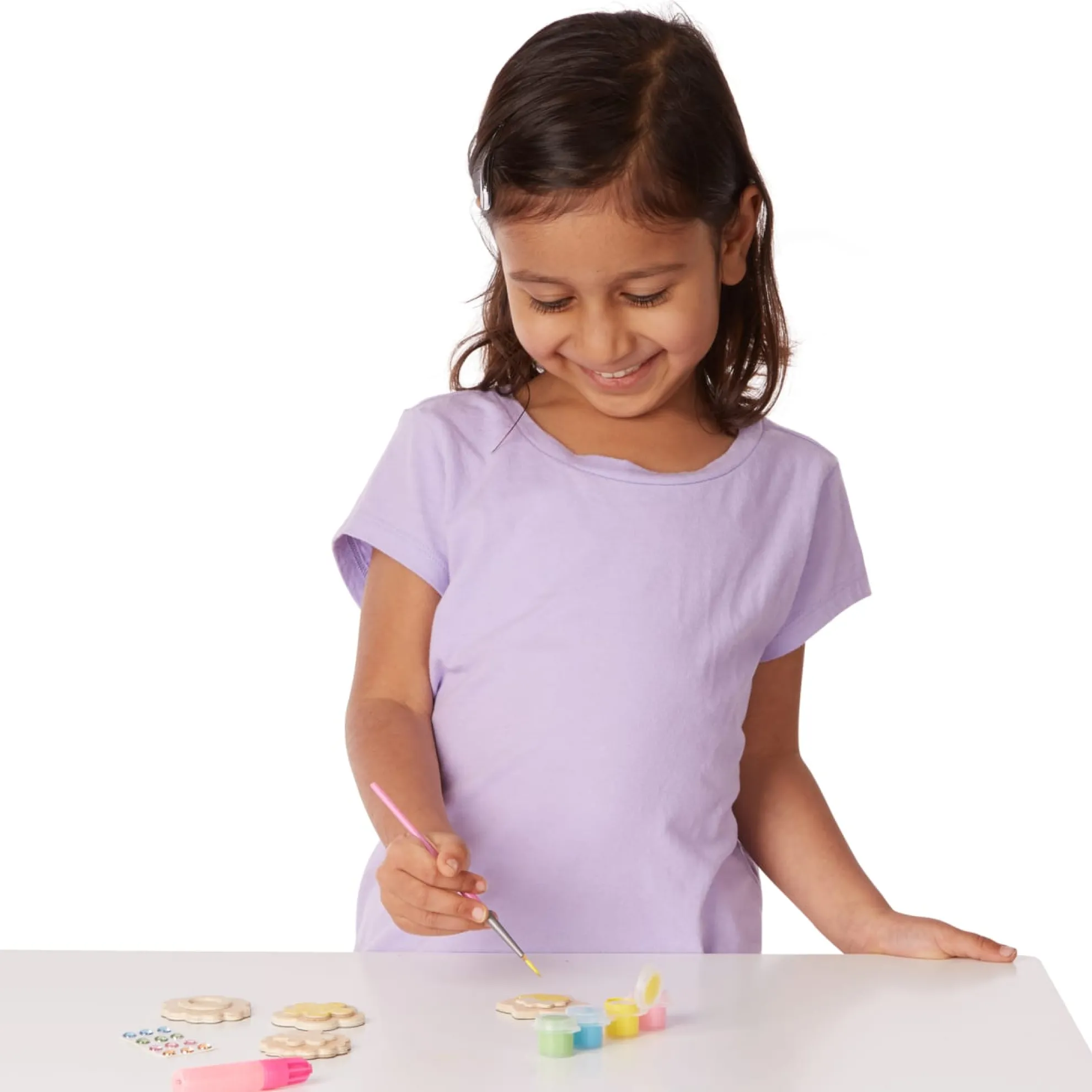 Add your unique personal touches to four wooden flower magnets to make original crafts inspired by you and your imagination! This all-inclusive kit includes four three-dimensional flower magnets in different designs, four pots of paint, a paintbrush, 12 gem stickers, and glitter glue to add extra sparkle. Fun for kids four and older to do on their own or with friends, these crafts make special keepsakes or gifts.