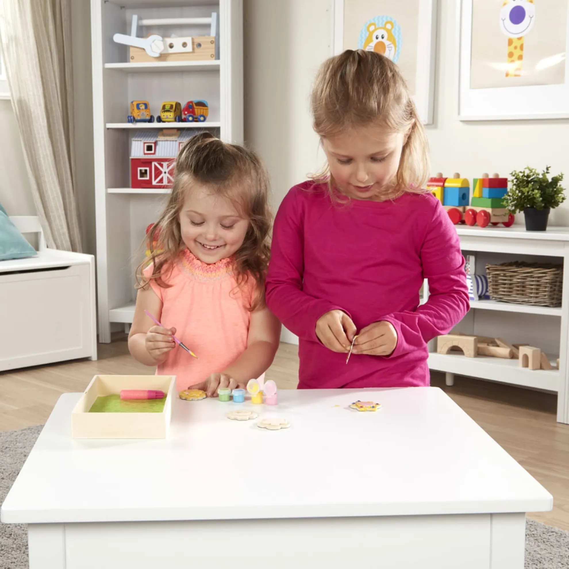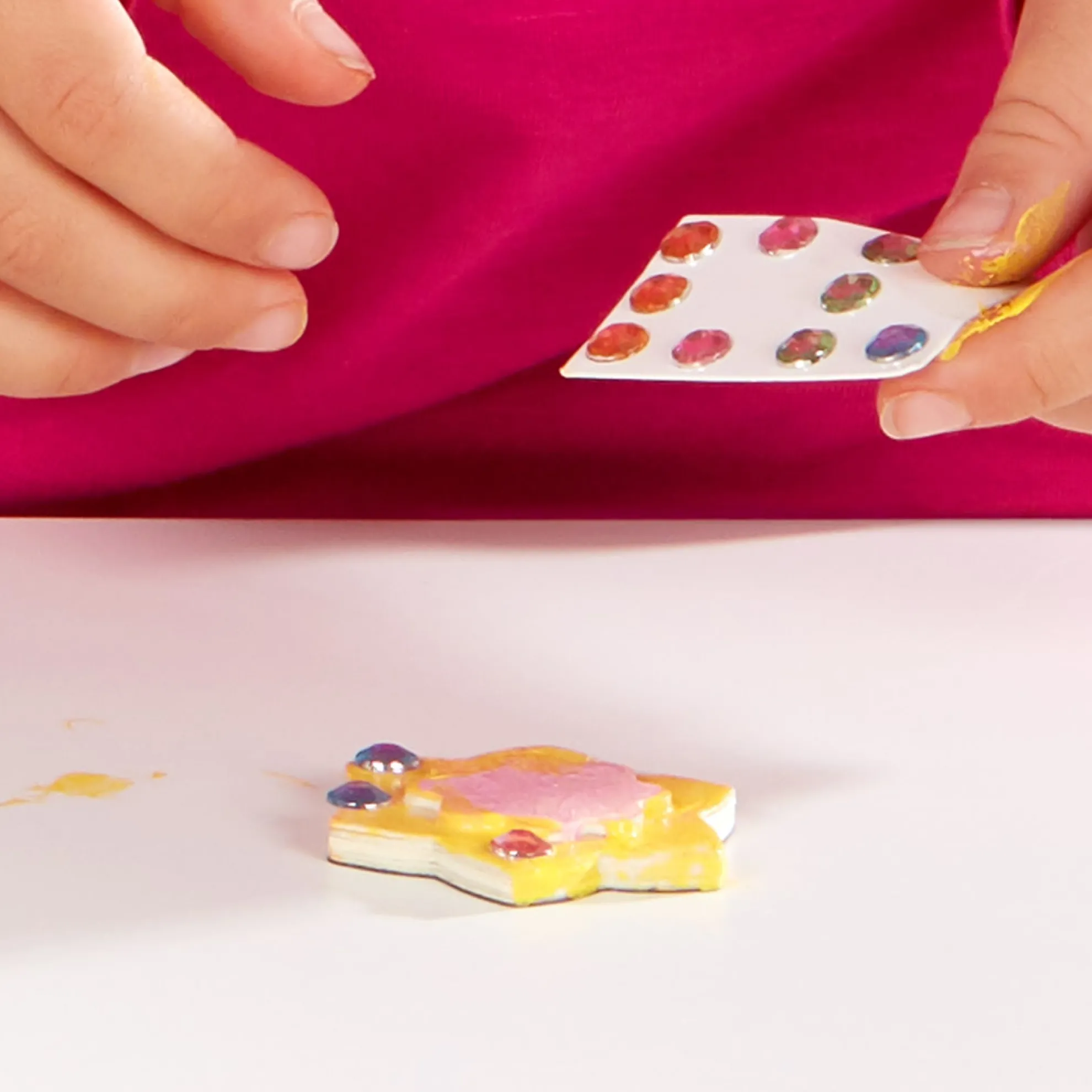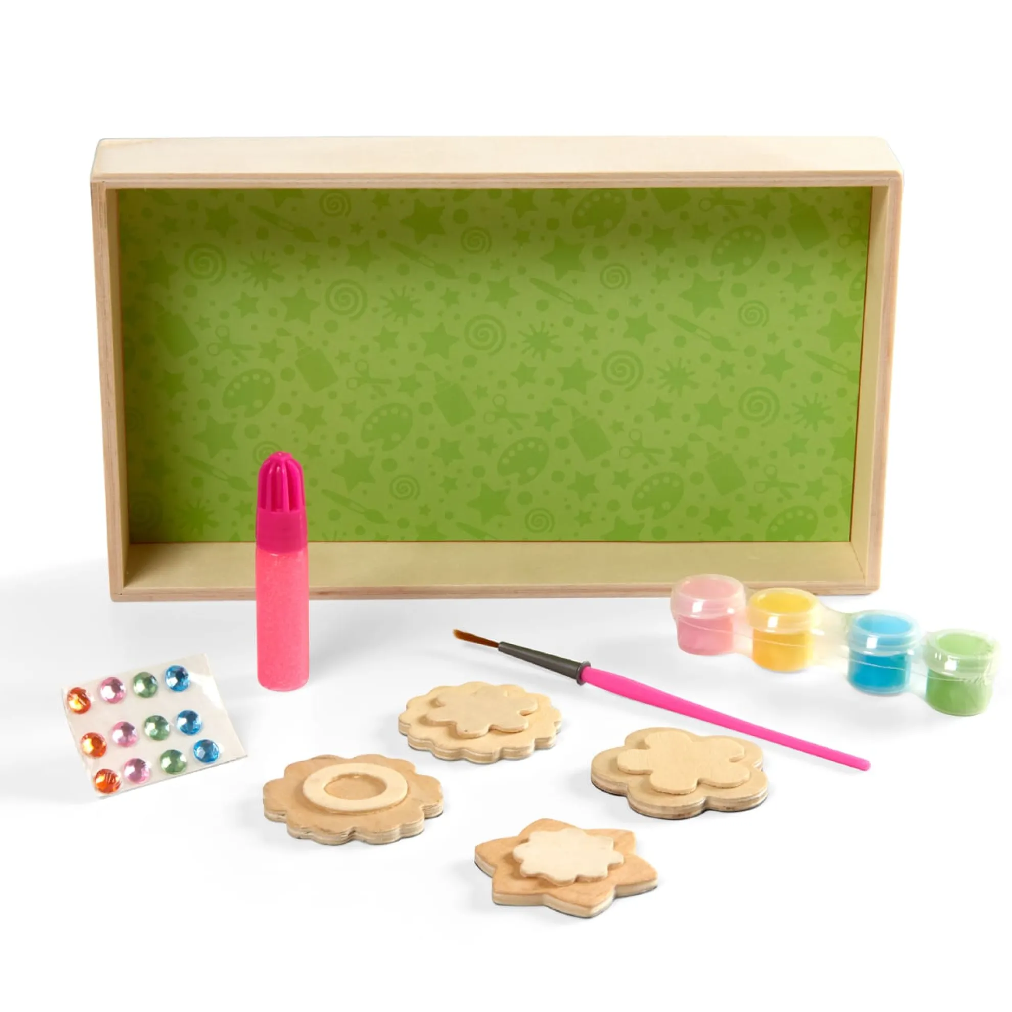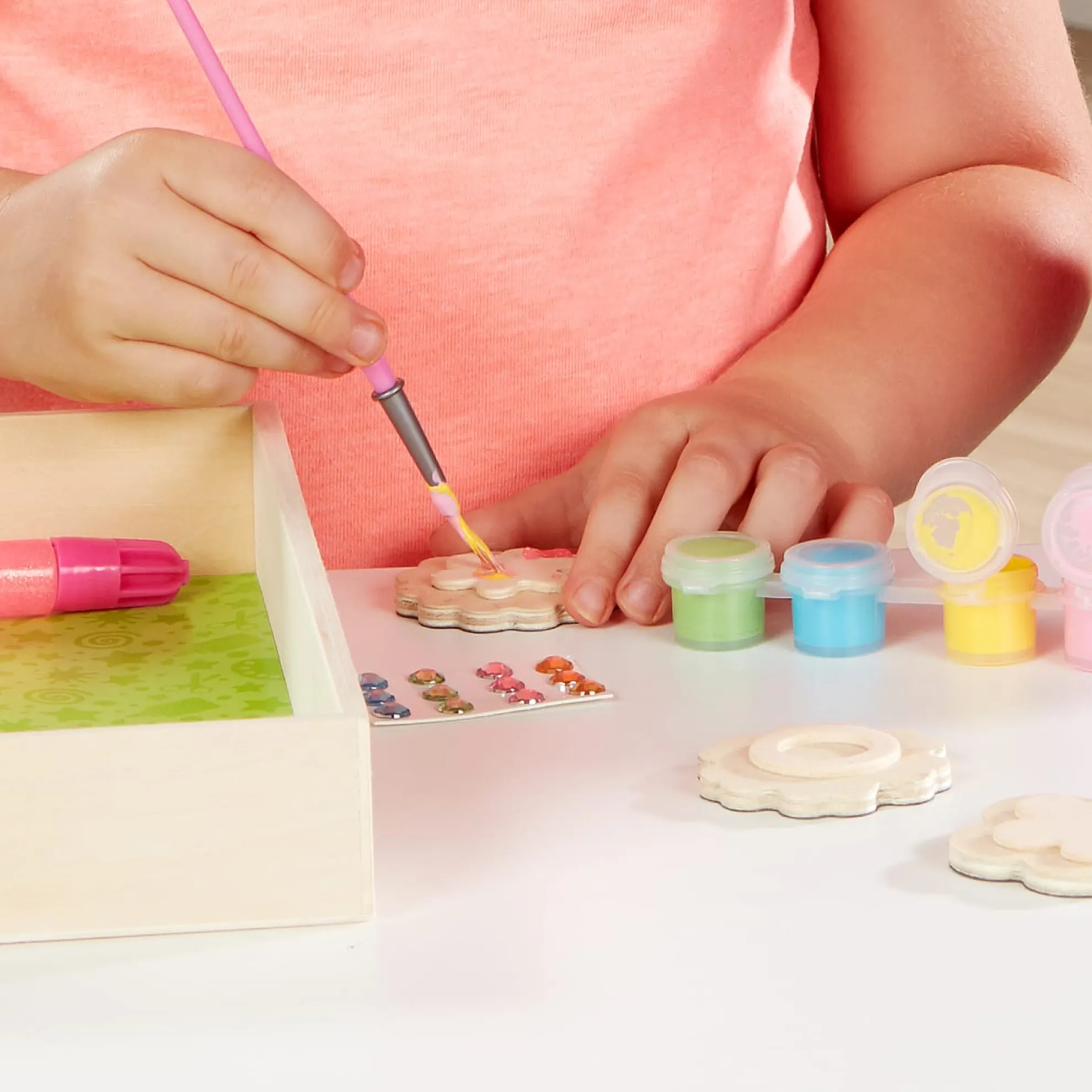 Add your unique personal touches to four wooden flower magnets to make original crafts inspired by you and your imagination! This all-inclusive kit includes four three-dimensional flower magnets in different designs, four pots of paint, a paintbrush, 12 gem stickers, and glitter glue to add extra sparkle. Fun for kids four and older to do on their own or with friends, these crafts make special keepsakes or gifts.