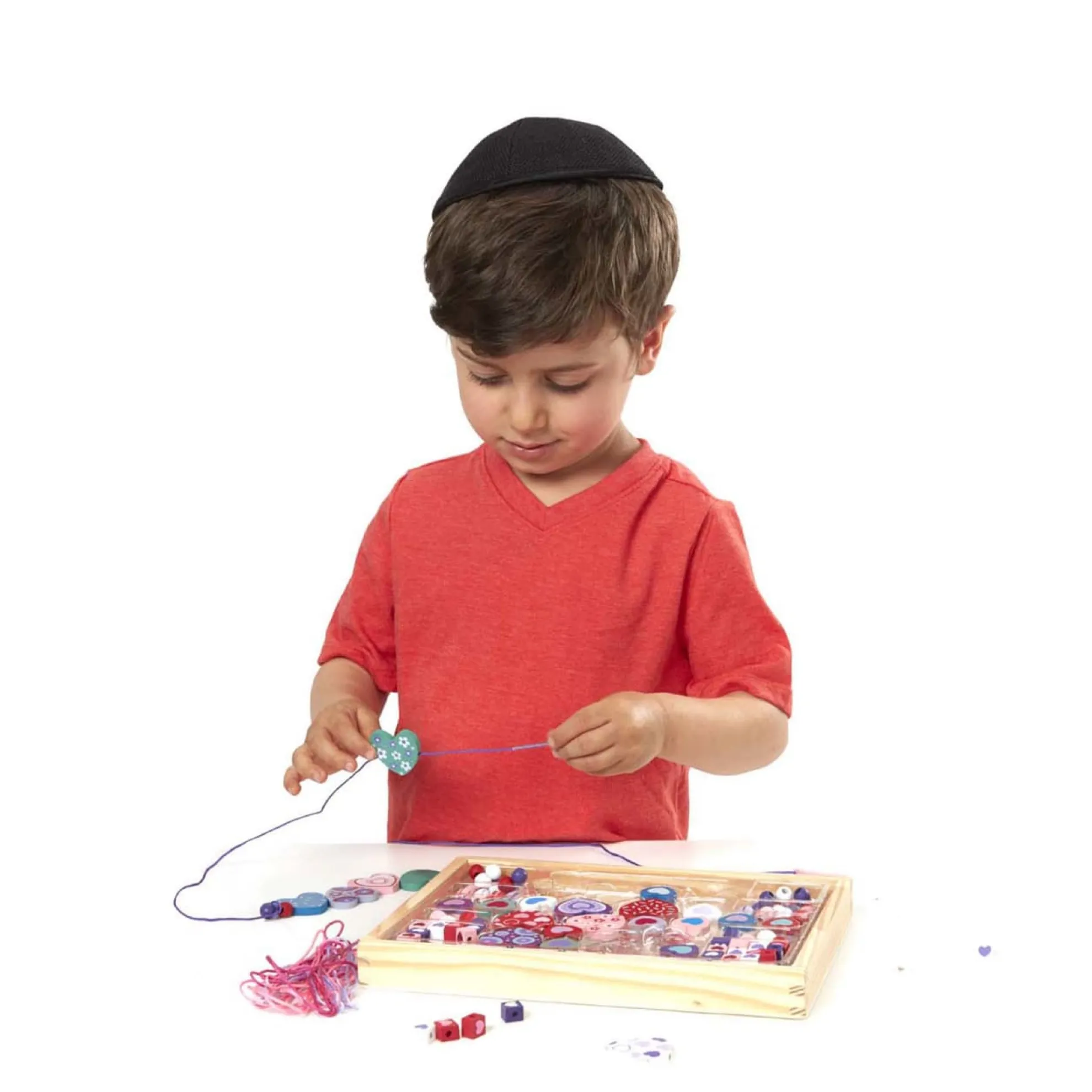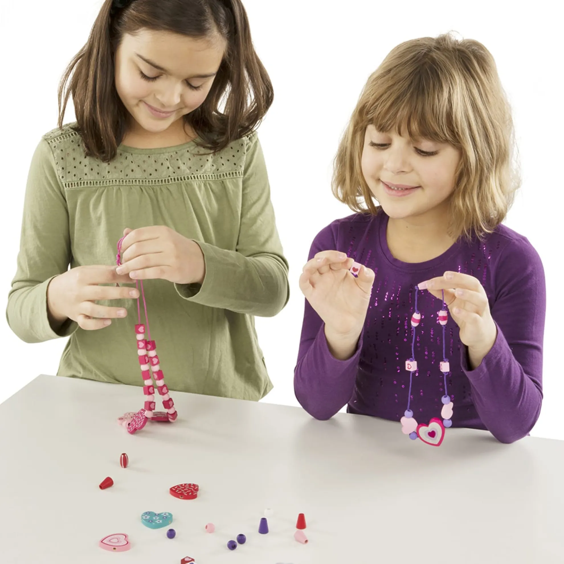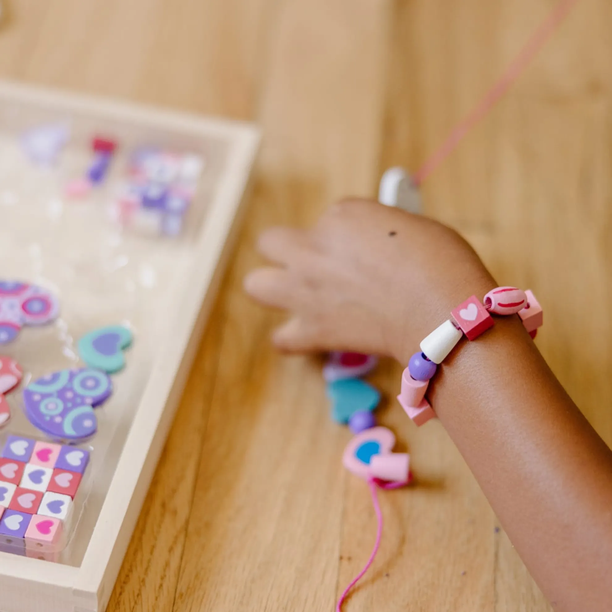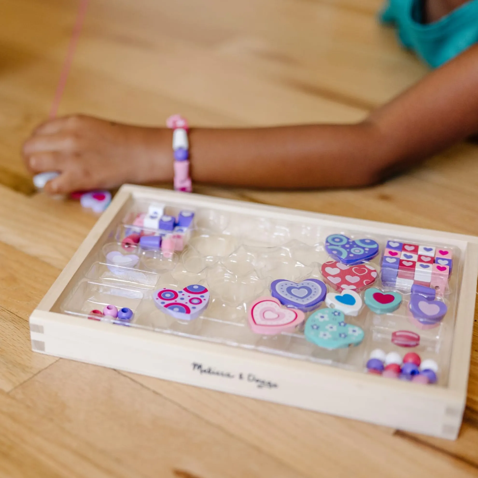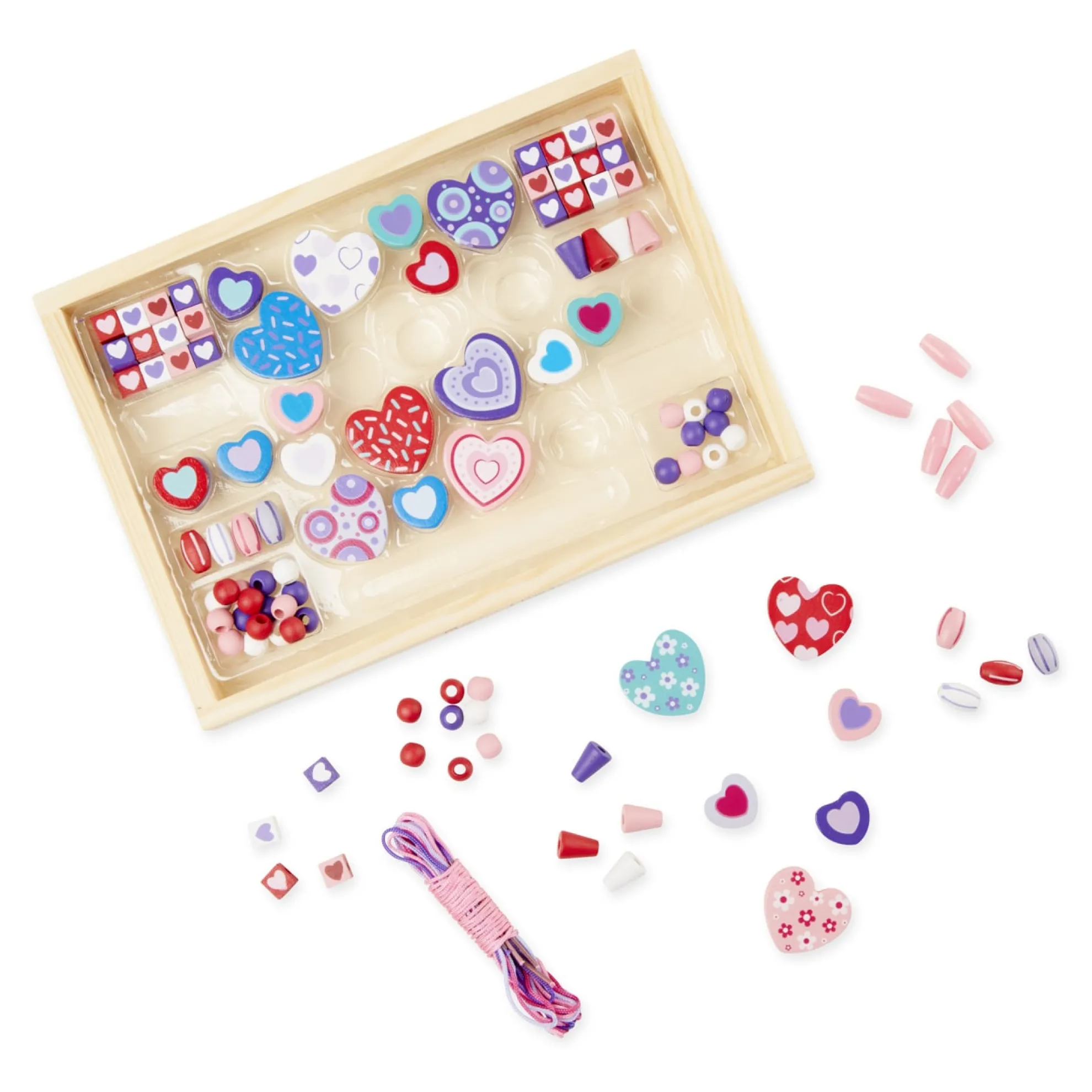 - Design jewelry with a heart-themed wooden bead set.