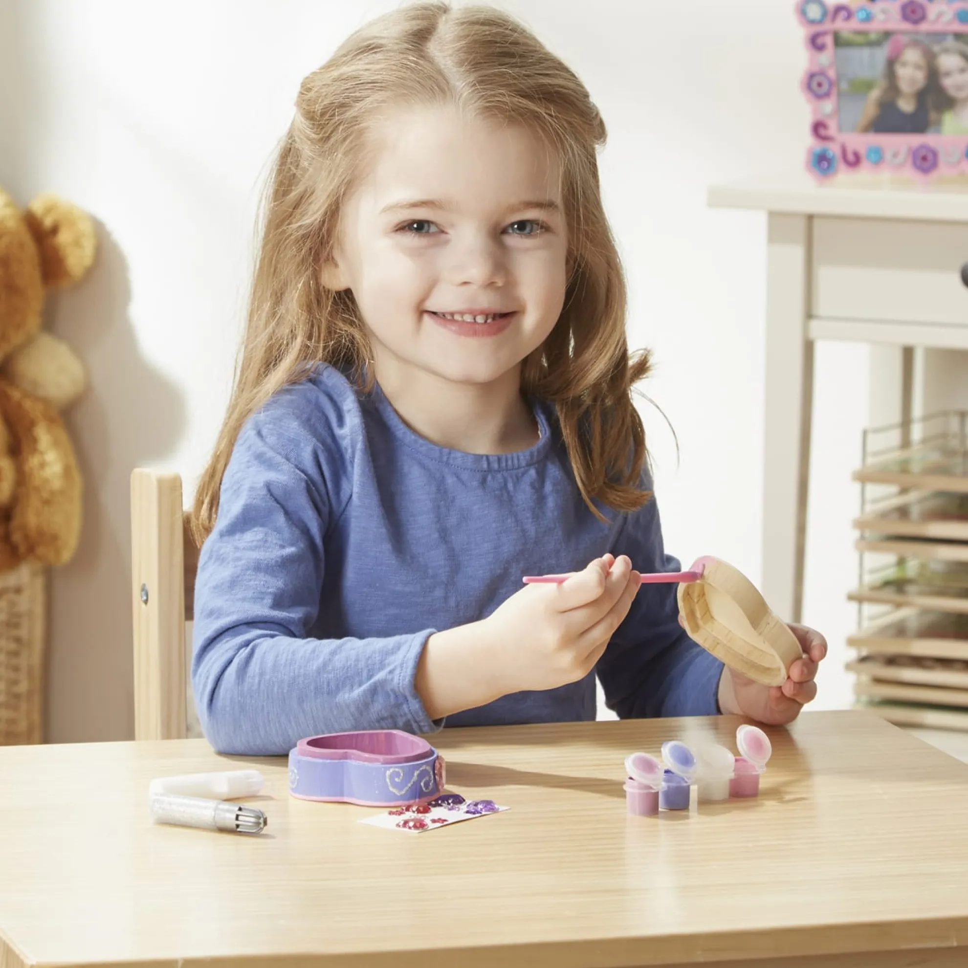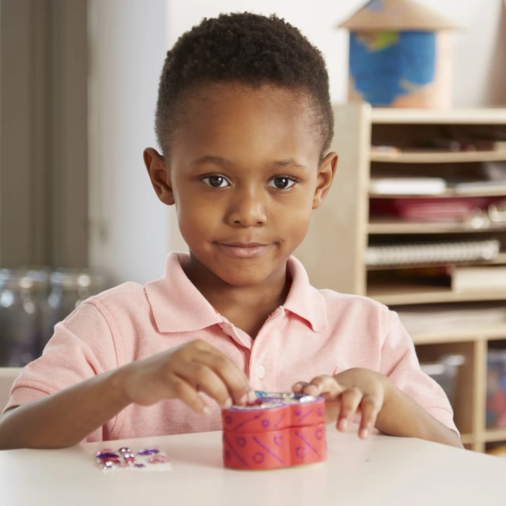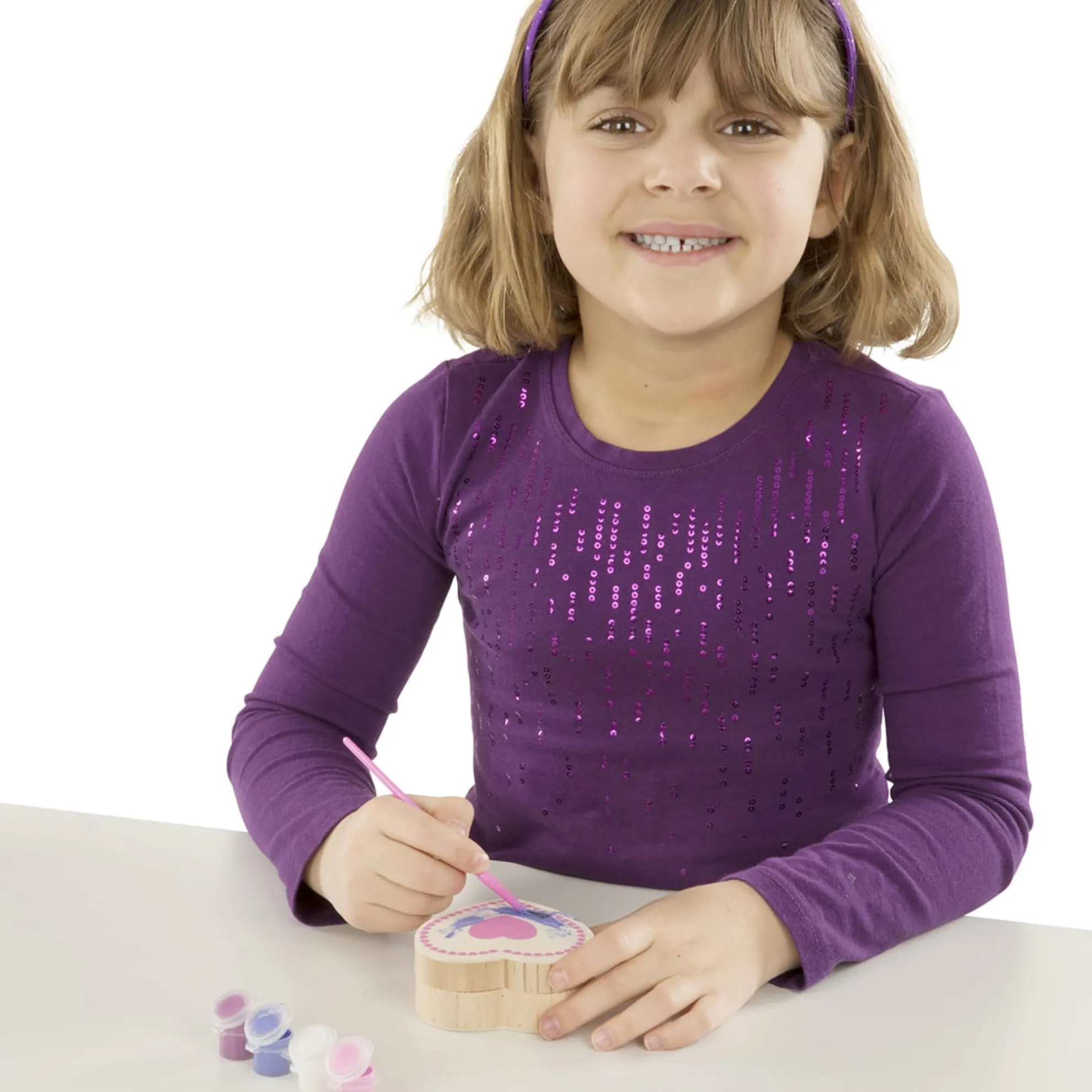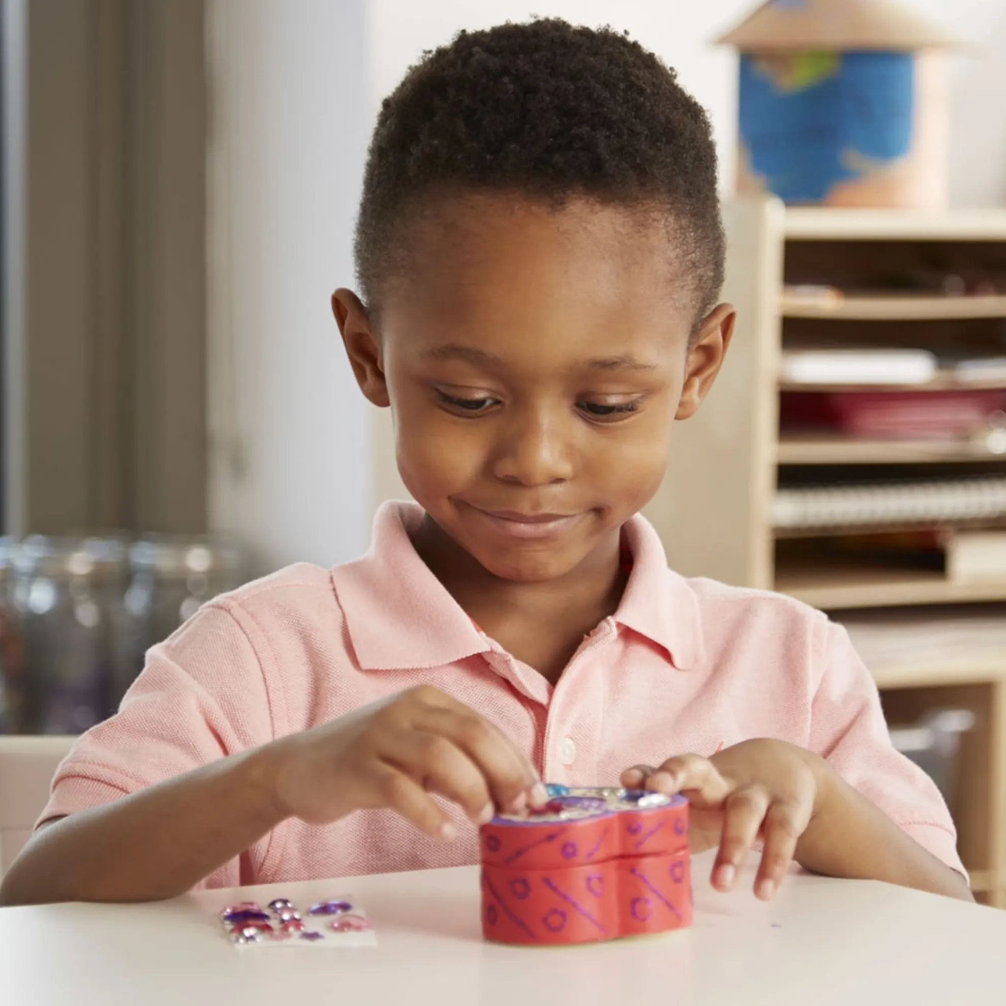Looking for the perfect spot for storing those treasures that are close to your heart? This kit includes a sturdy wooden heart-shaped box (3.1 x 1.4 x 2.9 in.), glitter glue, white glue, colorful gem stickers, 4 pots of paint, and a paintbrush to let you add your own unique personal touches to make an original craft inspired by you and your imagination! A perfect activity for parties or rainy days.
