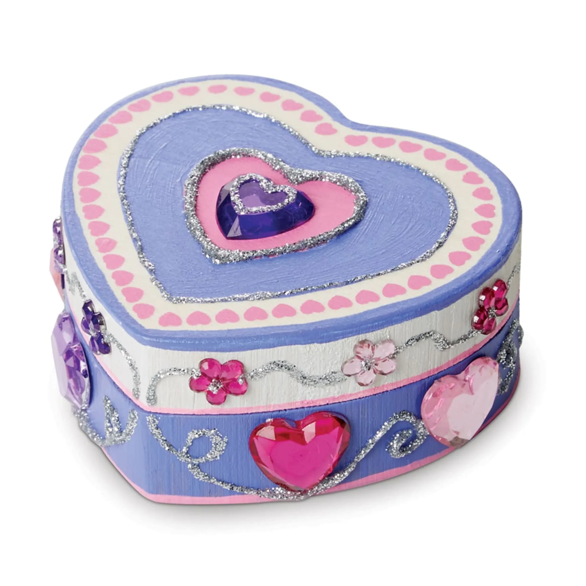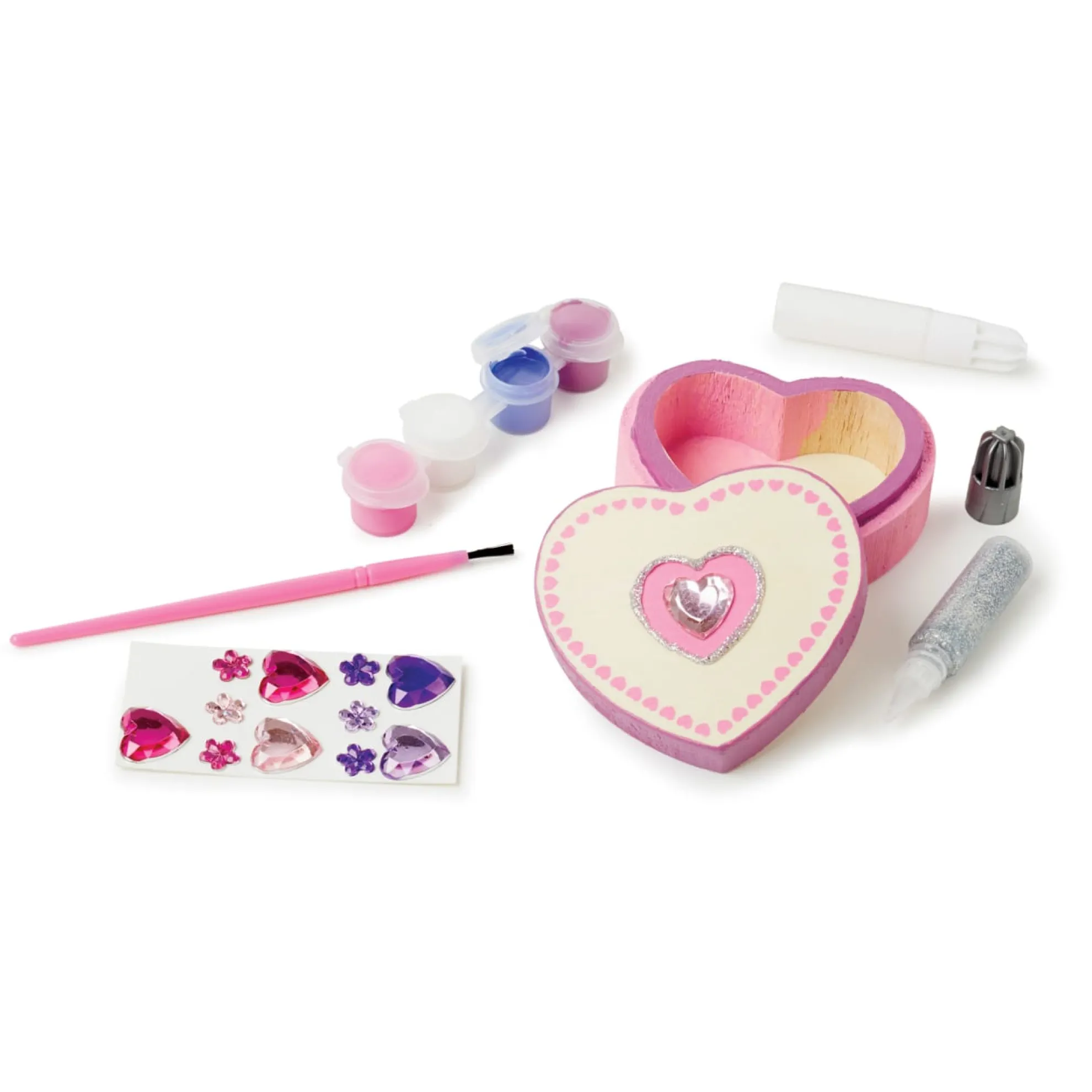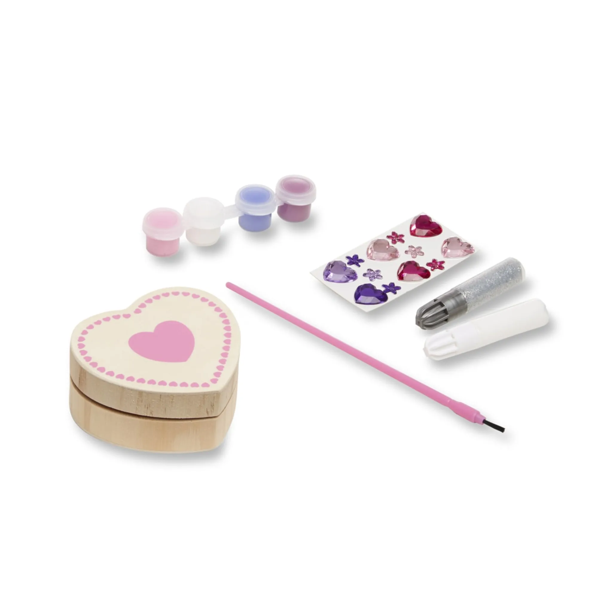 - Includes wooden heart box, 12 gem stickers, 4 pots of paint, paintbrush, glitter glue, and white glue