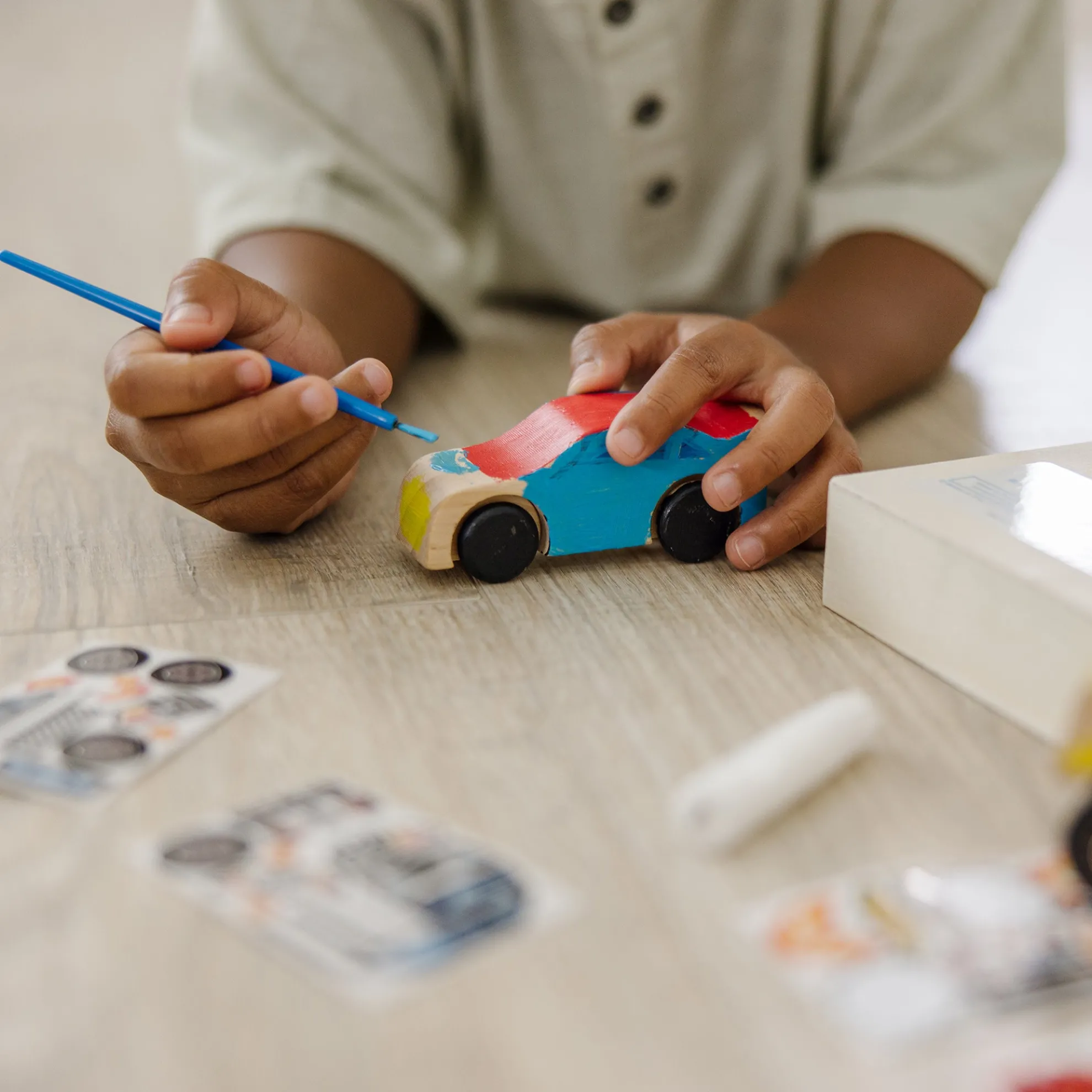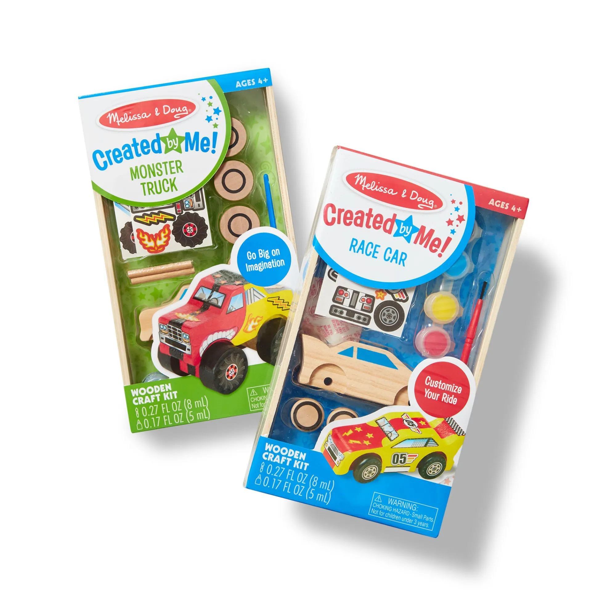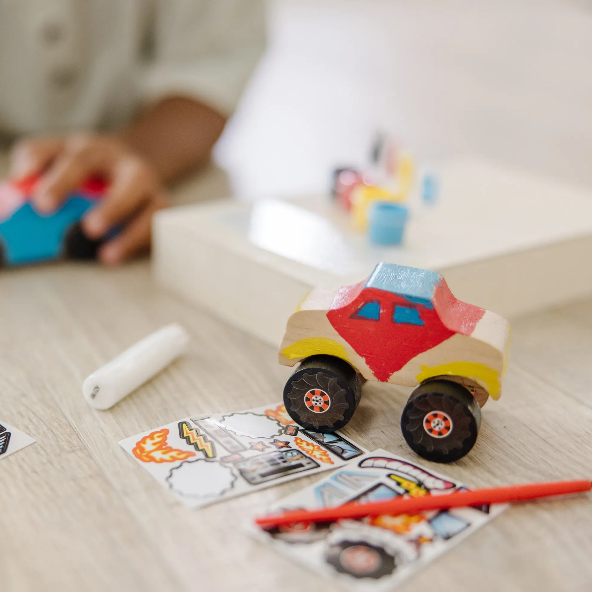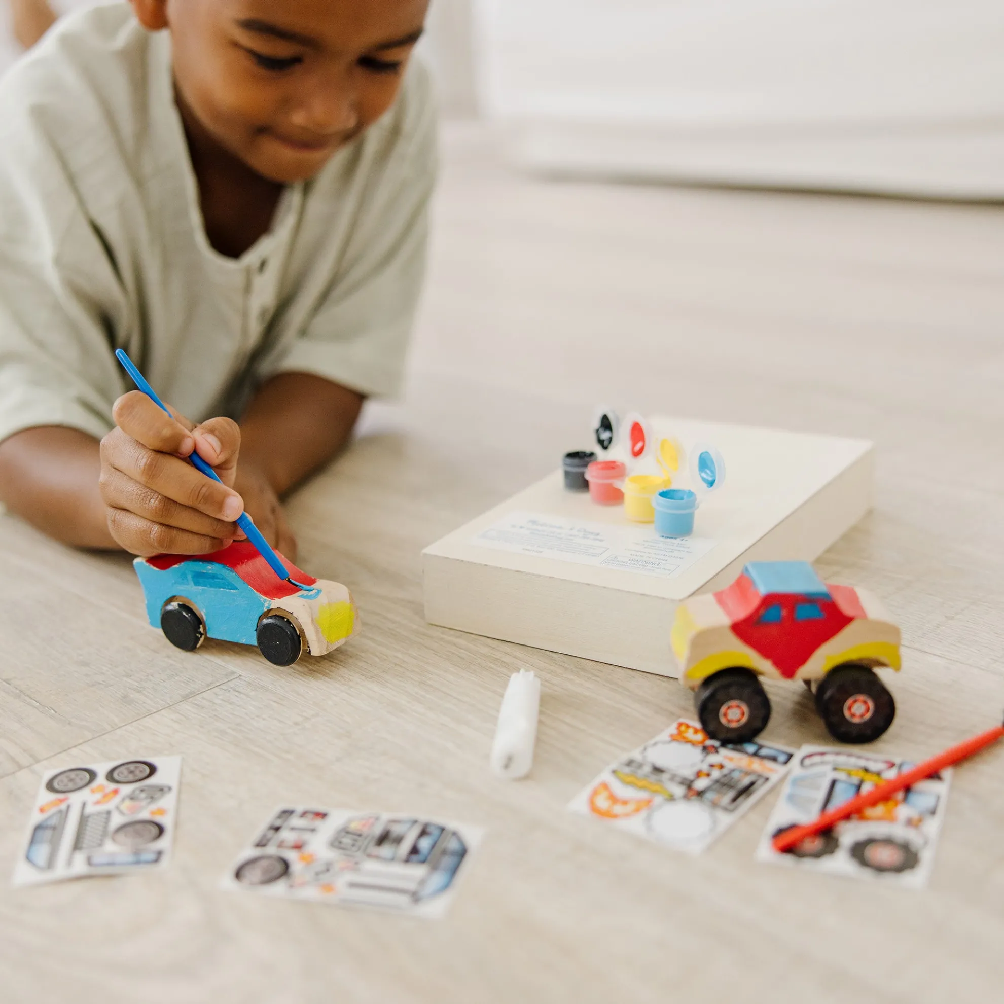 These cool vehicle kits contain everything you need to assemble and decorate a race car and a monster truck. Attach the axles and wheels, and then add custom details with the included brush, paints, and stickers. Great gifts or rainy-day activities, these cool little kits bring big horsepower to arts-and-crafts time! Melissa & Doug products provide a launch pad to ignite imagination and a sense of wonder in all children so they can discover themselves, their passions, and their purpose.