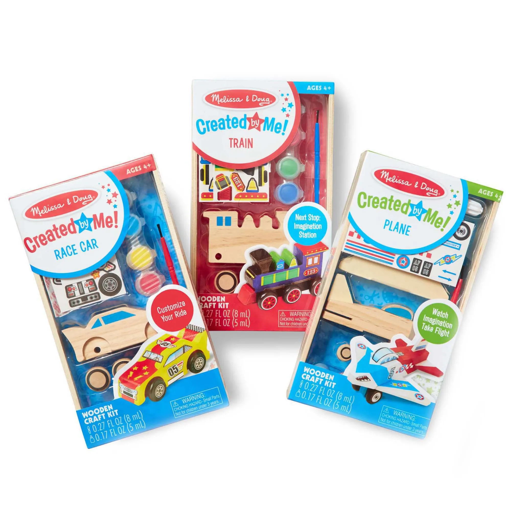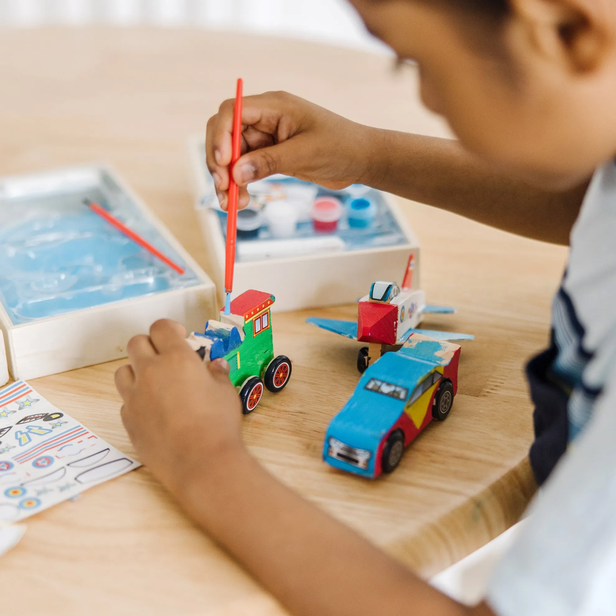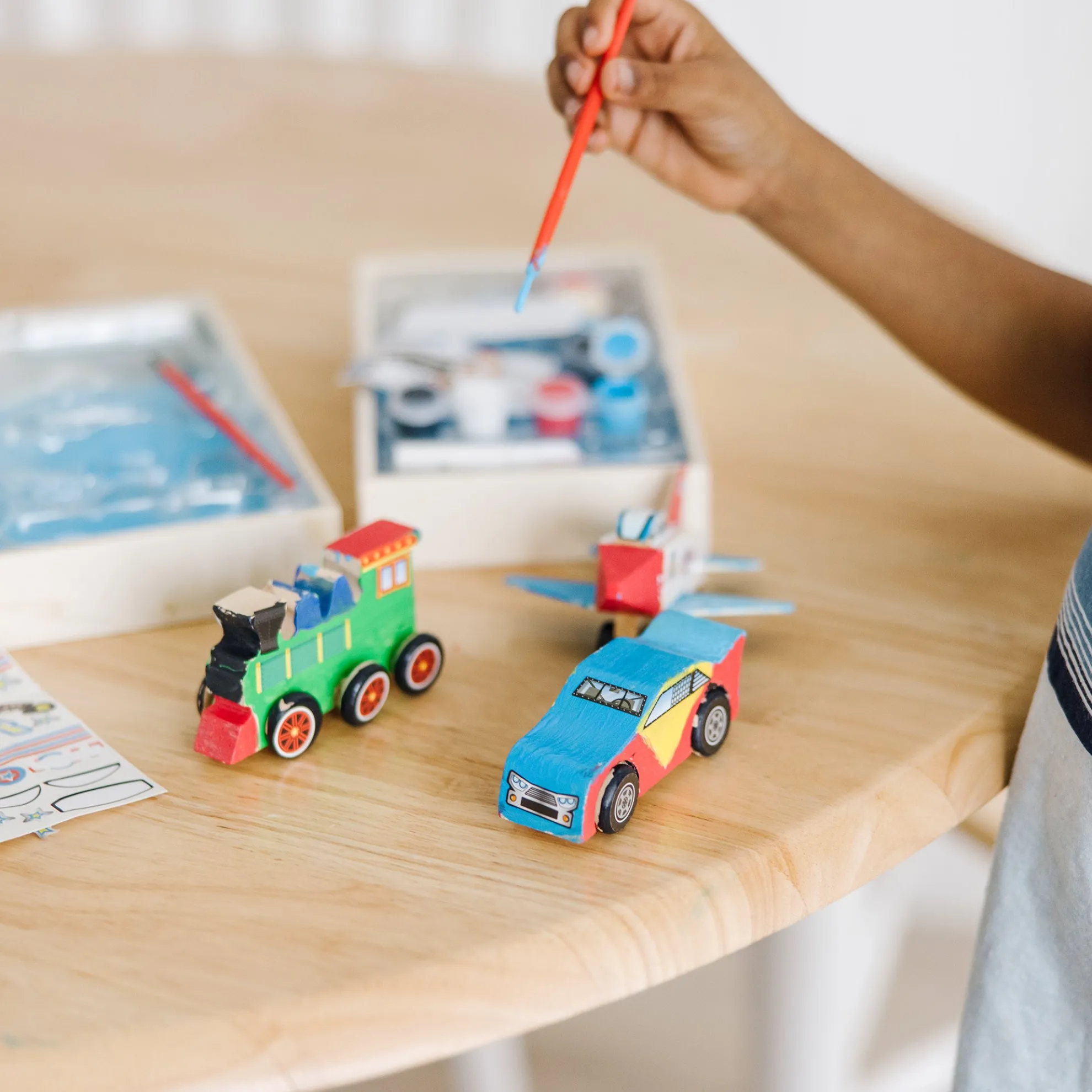 - Includes Plane, Train, and Race Car all-inclusive kits with paints, brush, and stickers in each