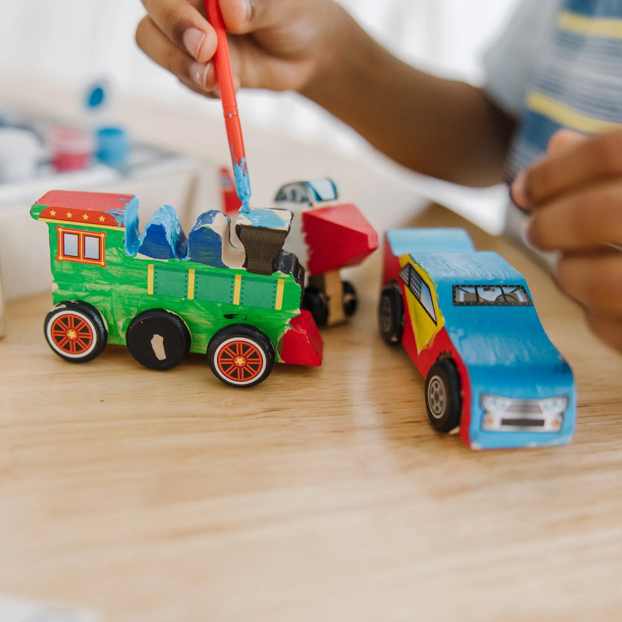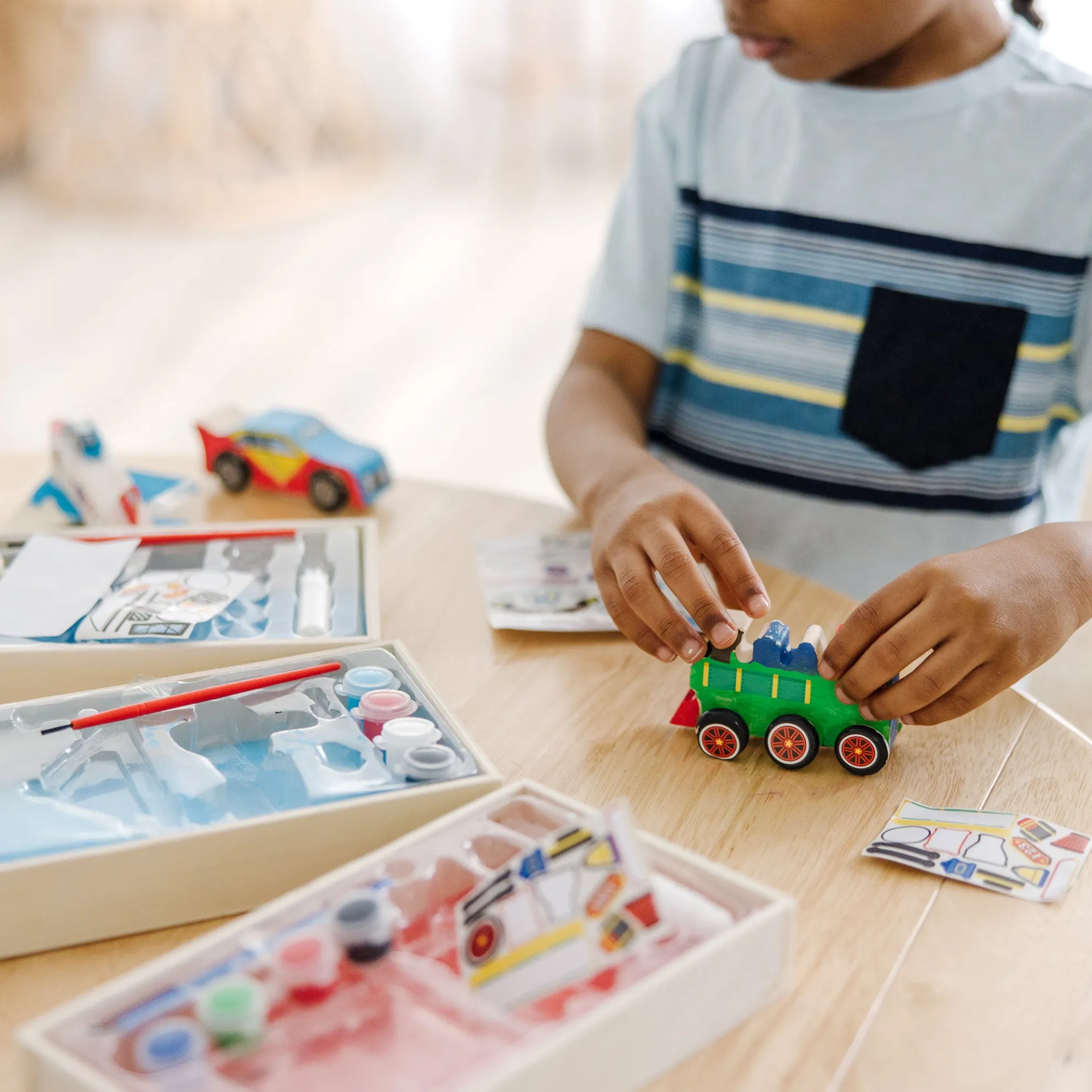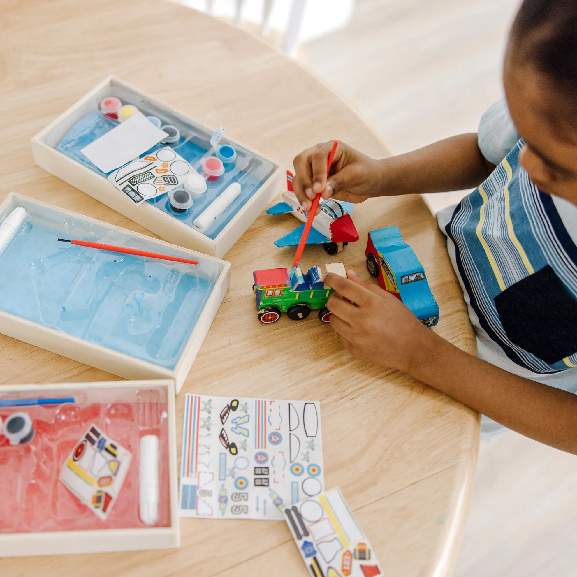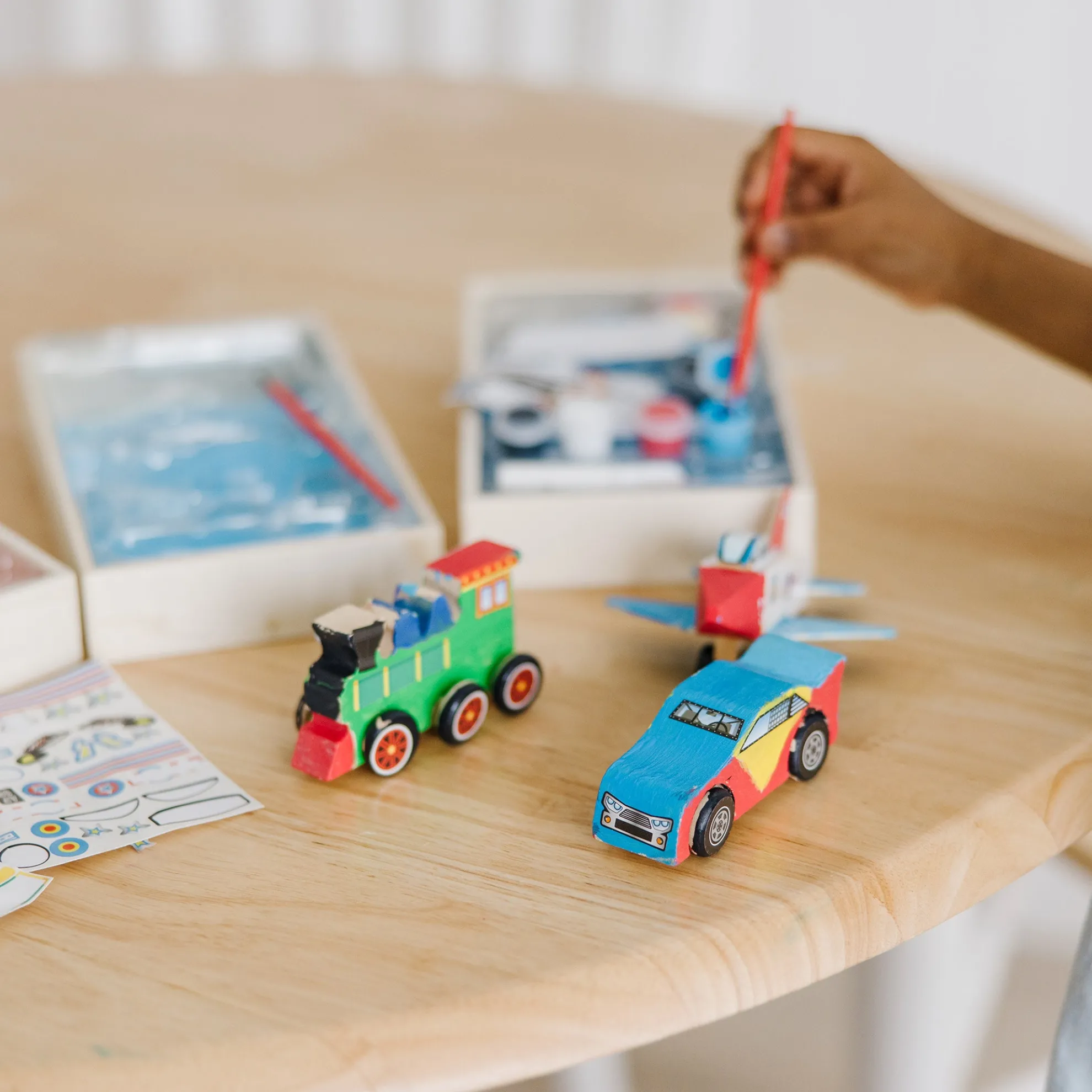 - Includes Plane, Train, and Race Car all-inclusive kits with paints, brush, and stickers in each