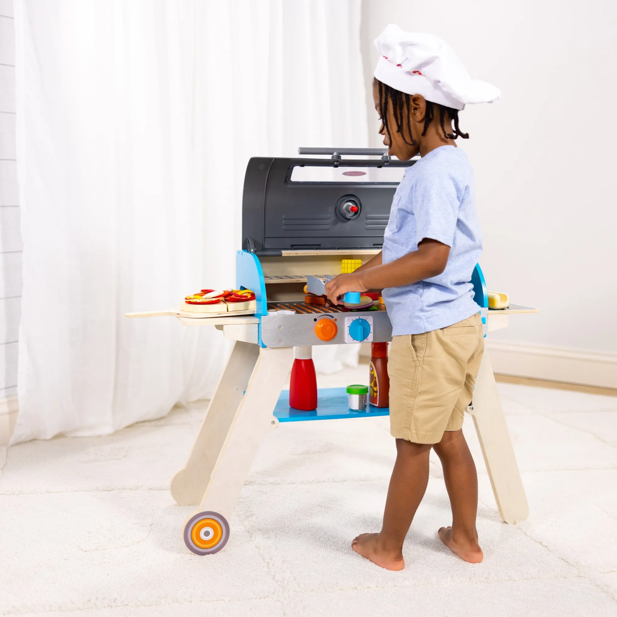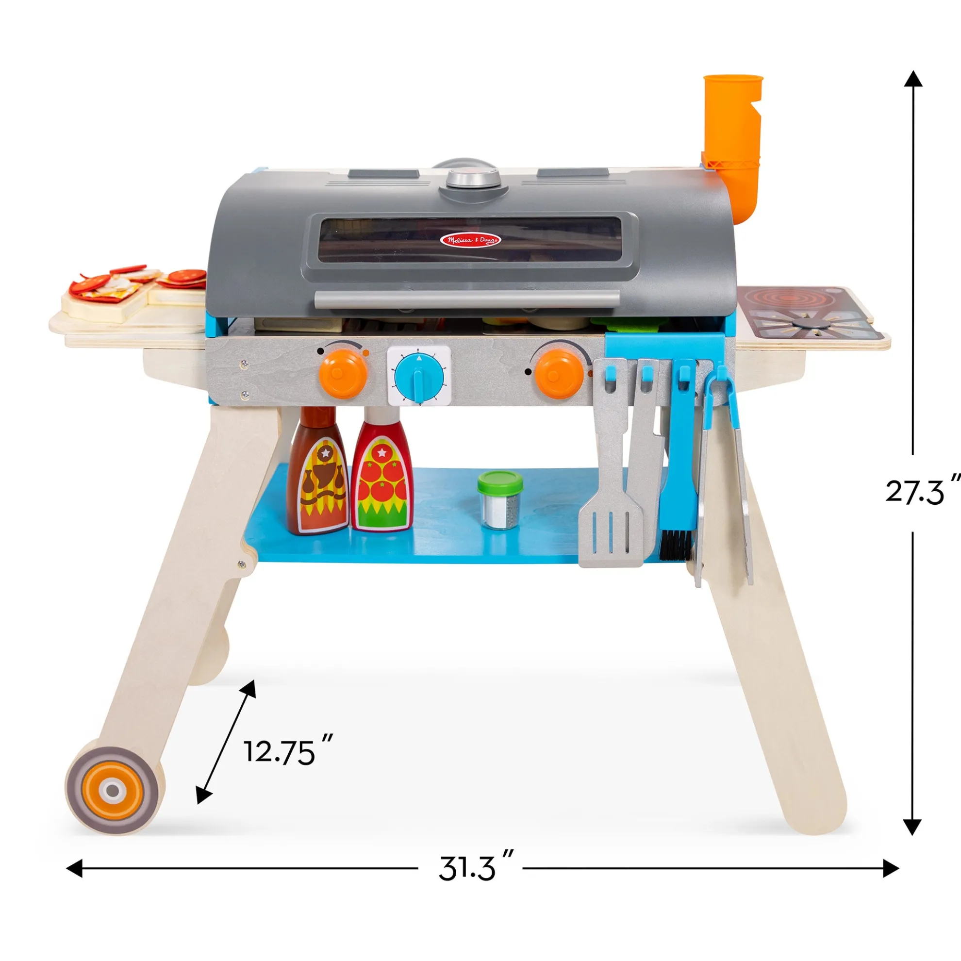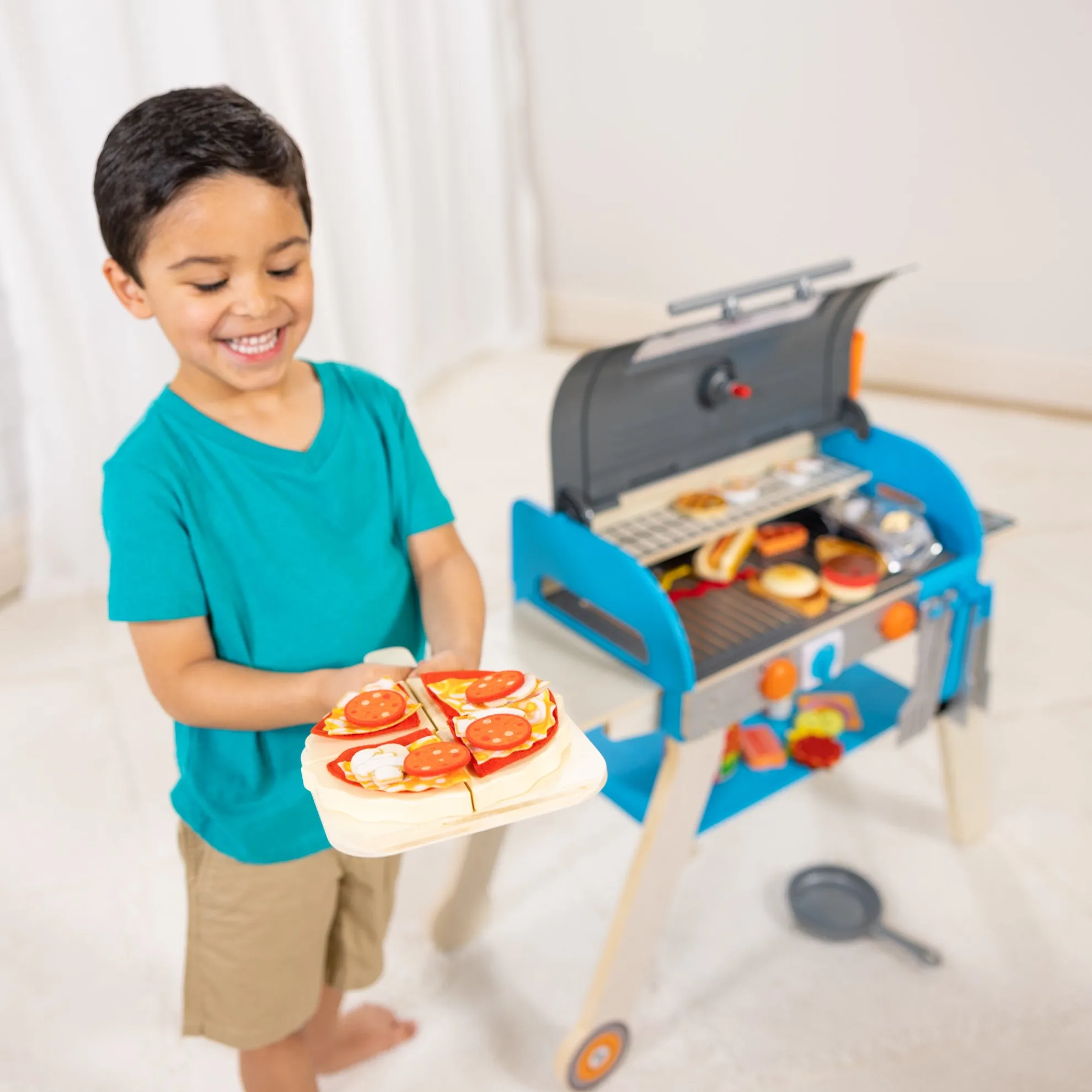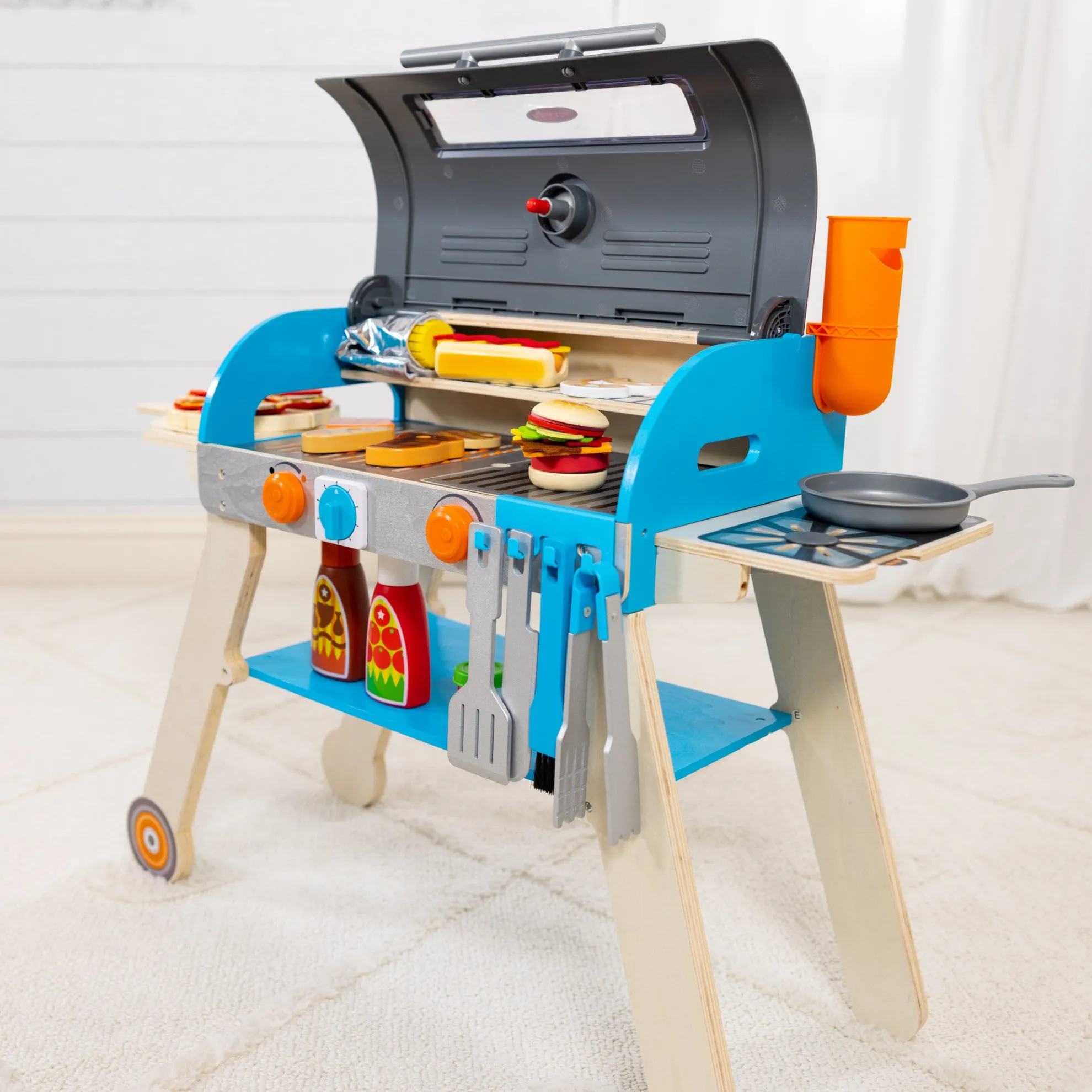 - Fire up imaginative pretend play with a wooden BBQ grill, smoker, and pizza oven play set, complete with wooden and felt play food and condiments, durable utensils, frying pan, and wooden pizza paddle