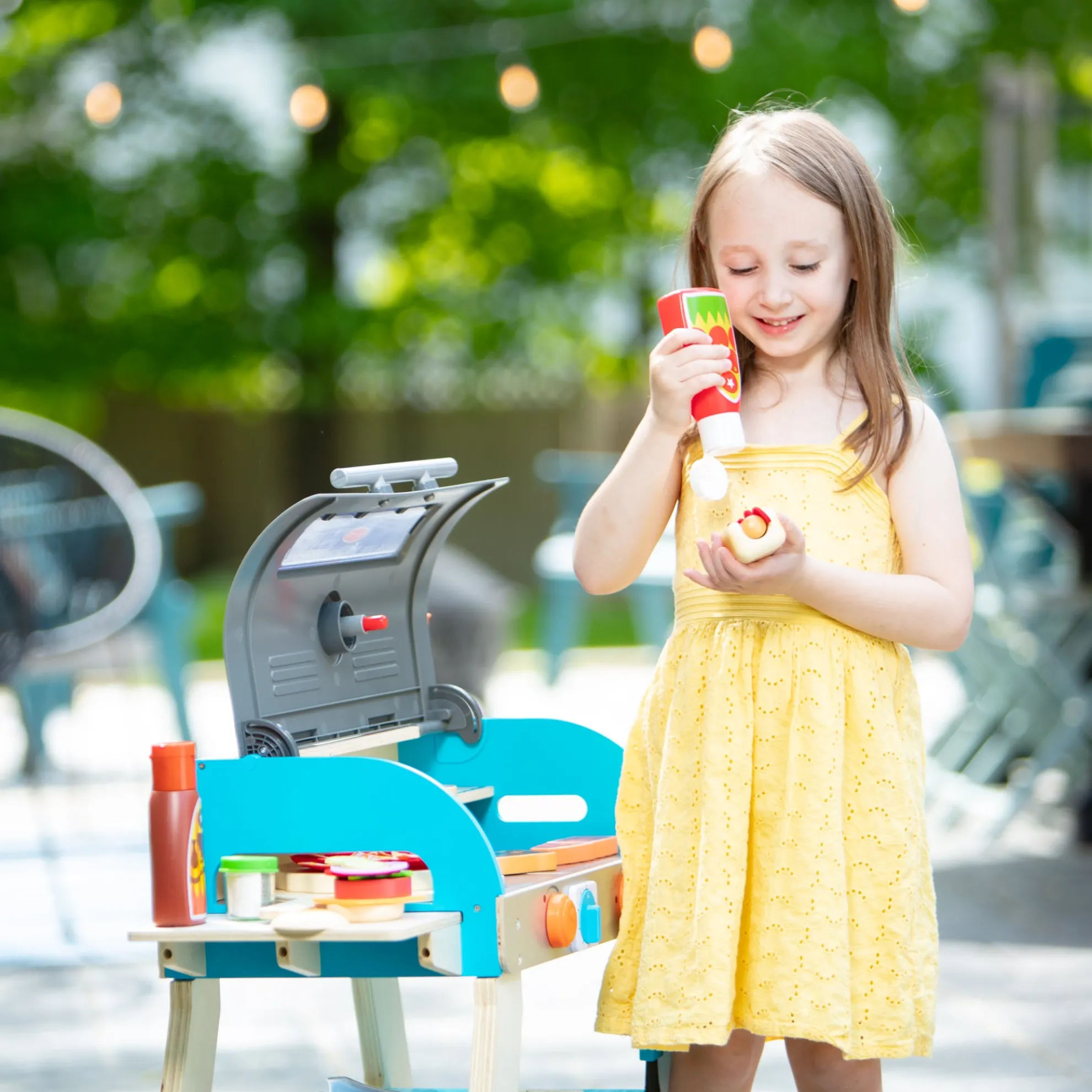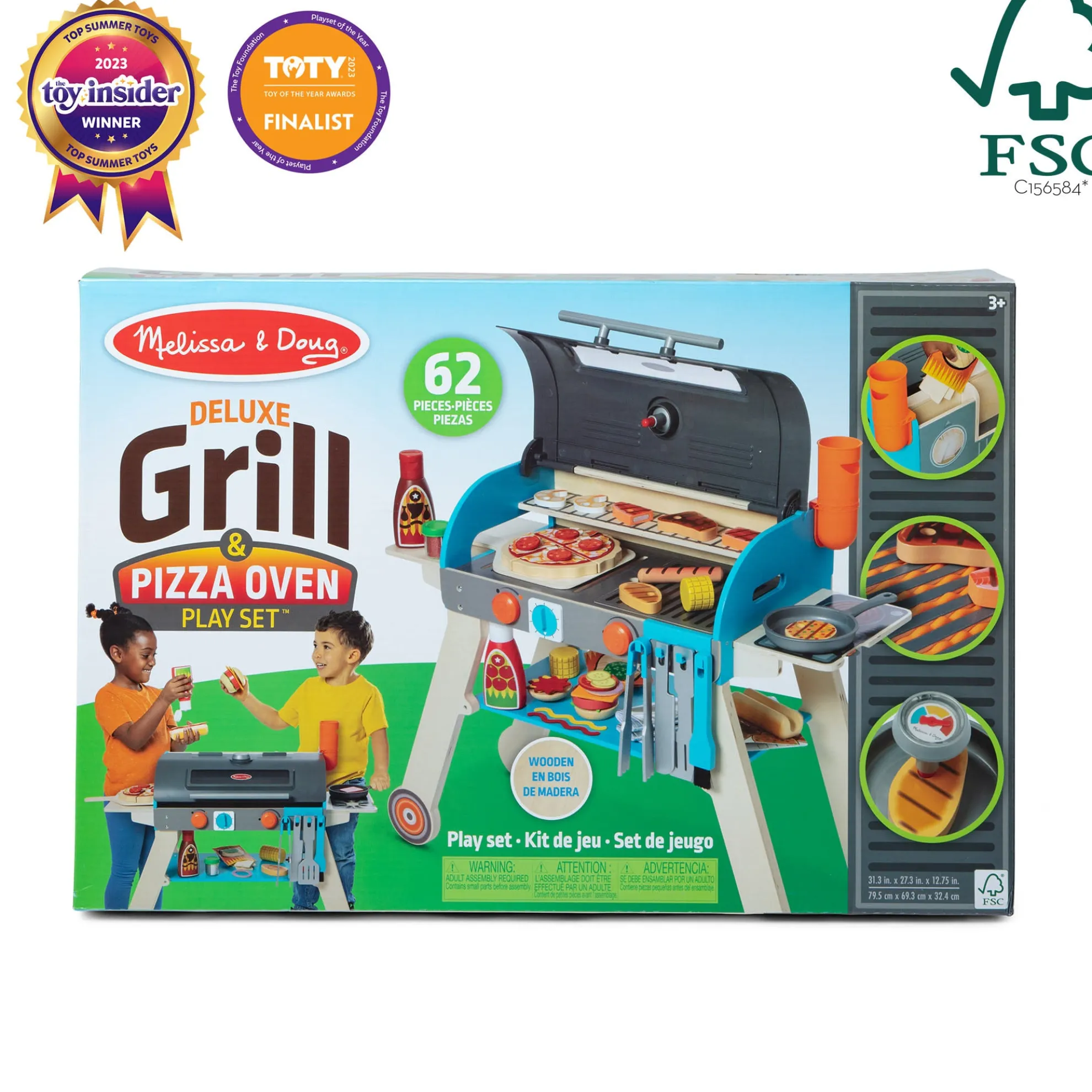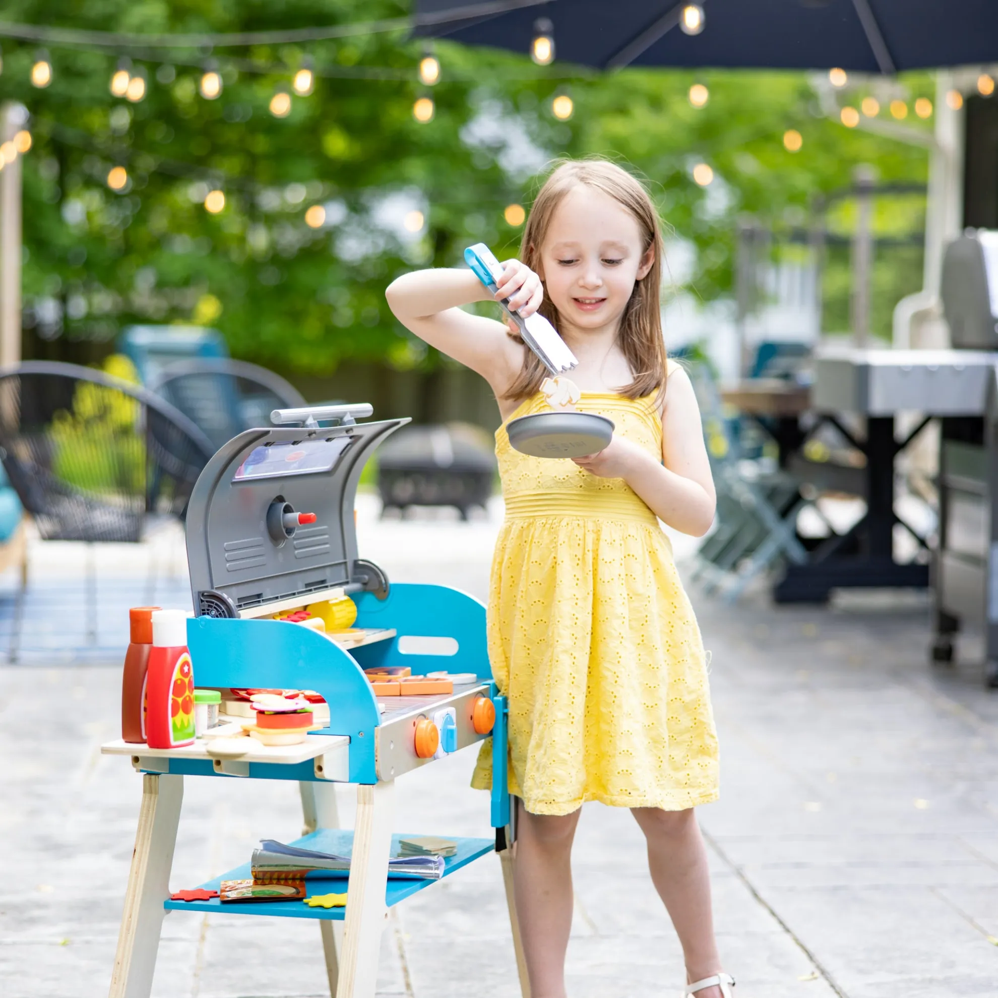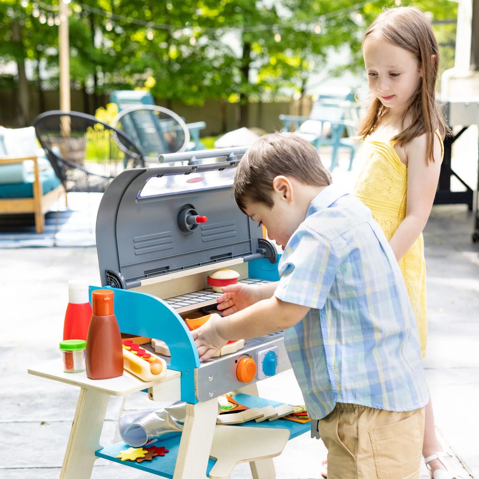 - Fire up imaginative pretend play with a wooden BBQ grill, smoker, and pizza oven play set, complete with wooden and felt play food and condiments, durable utensils, frying pan, and wooden pizza paddle