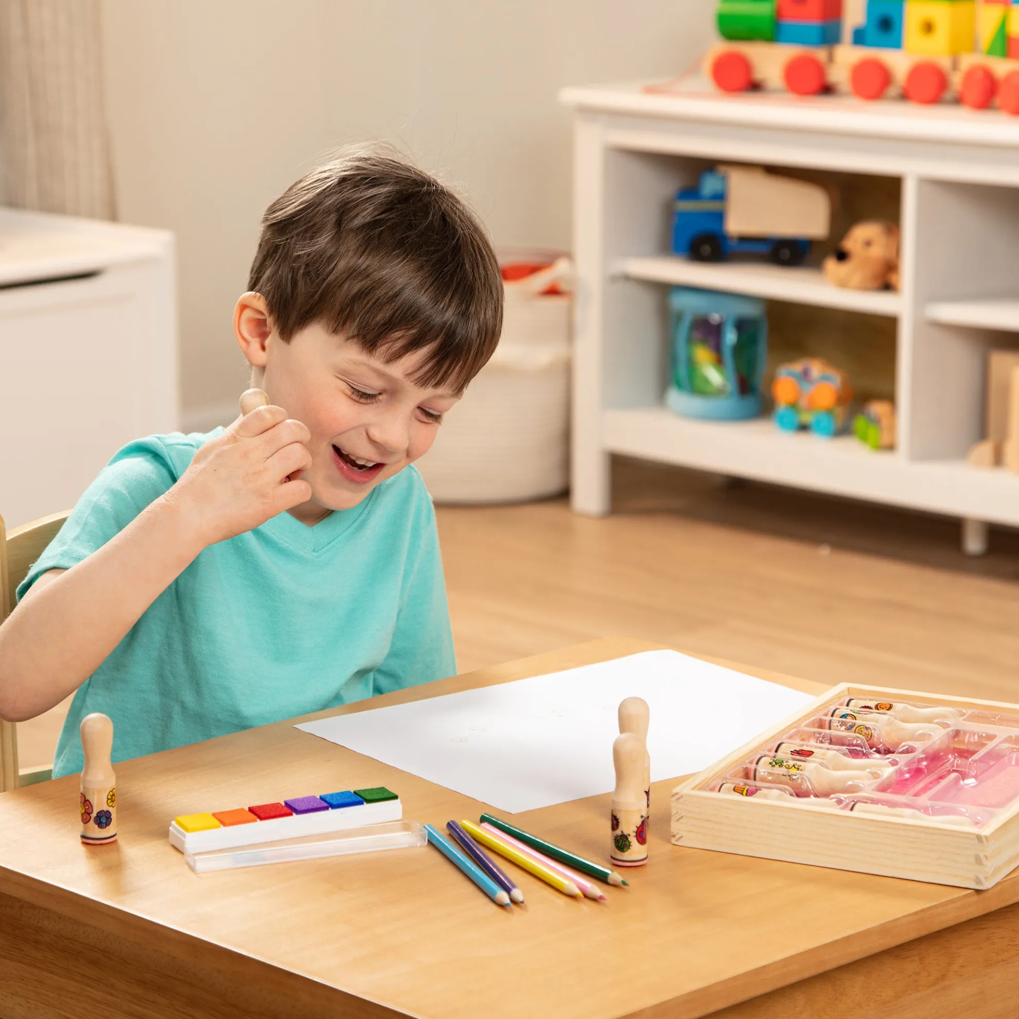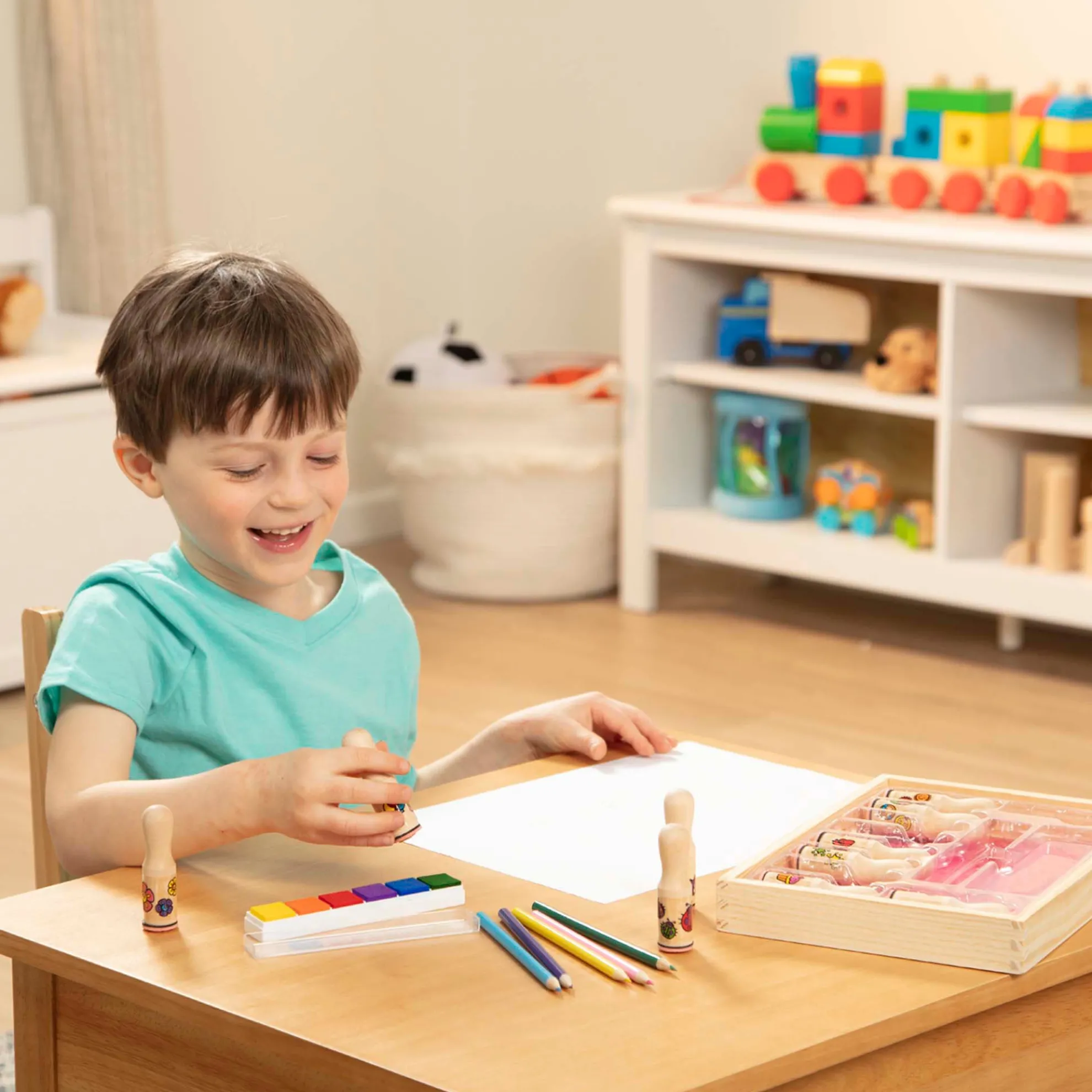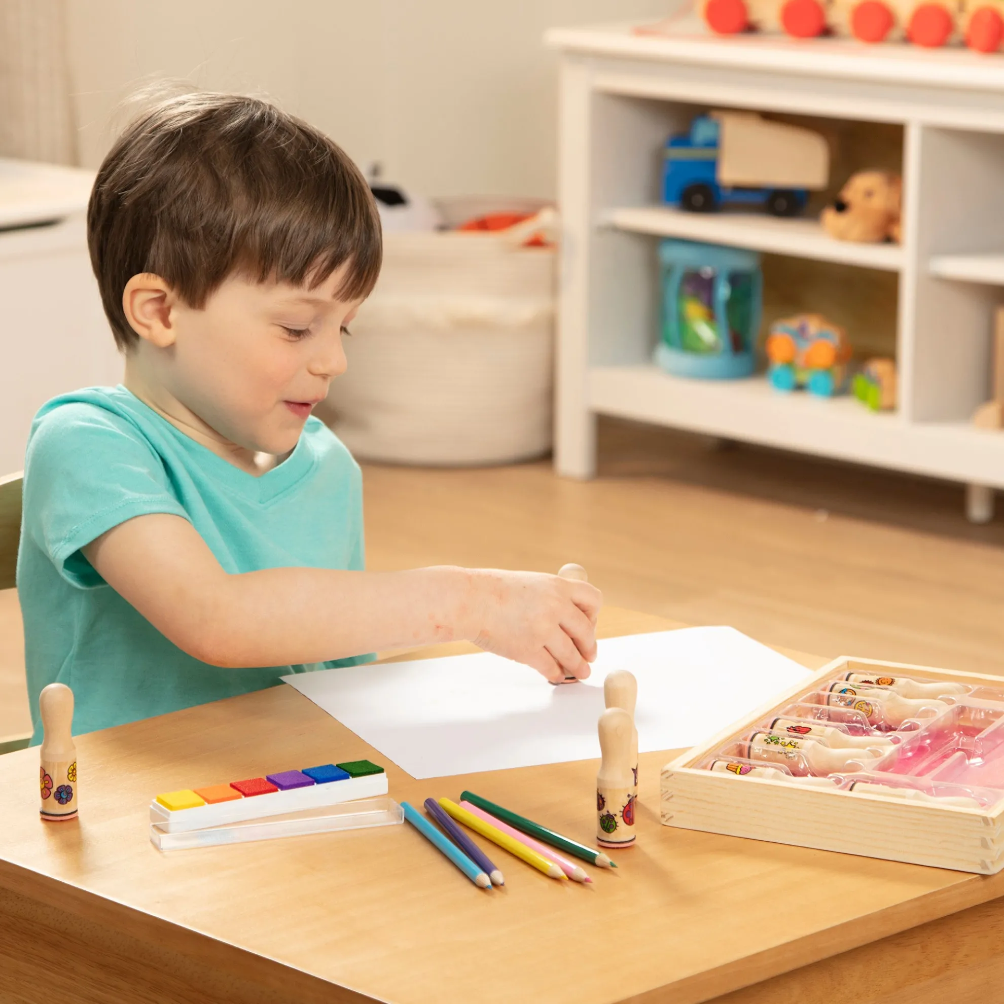 - Includes 6-color ink pad with washable ink, 5 colored pencils, and sturdy wooden storage tray.
