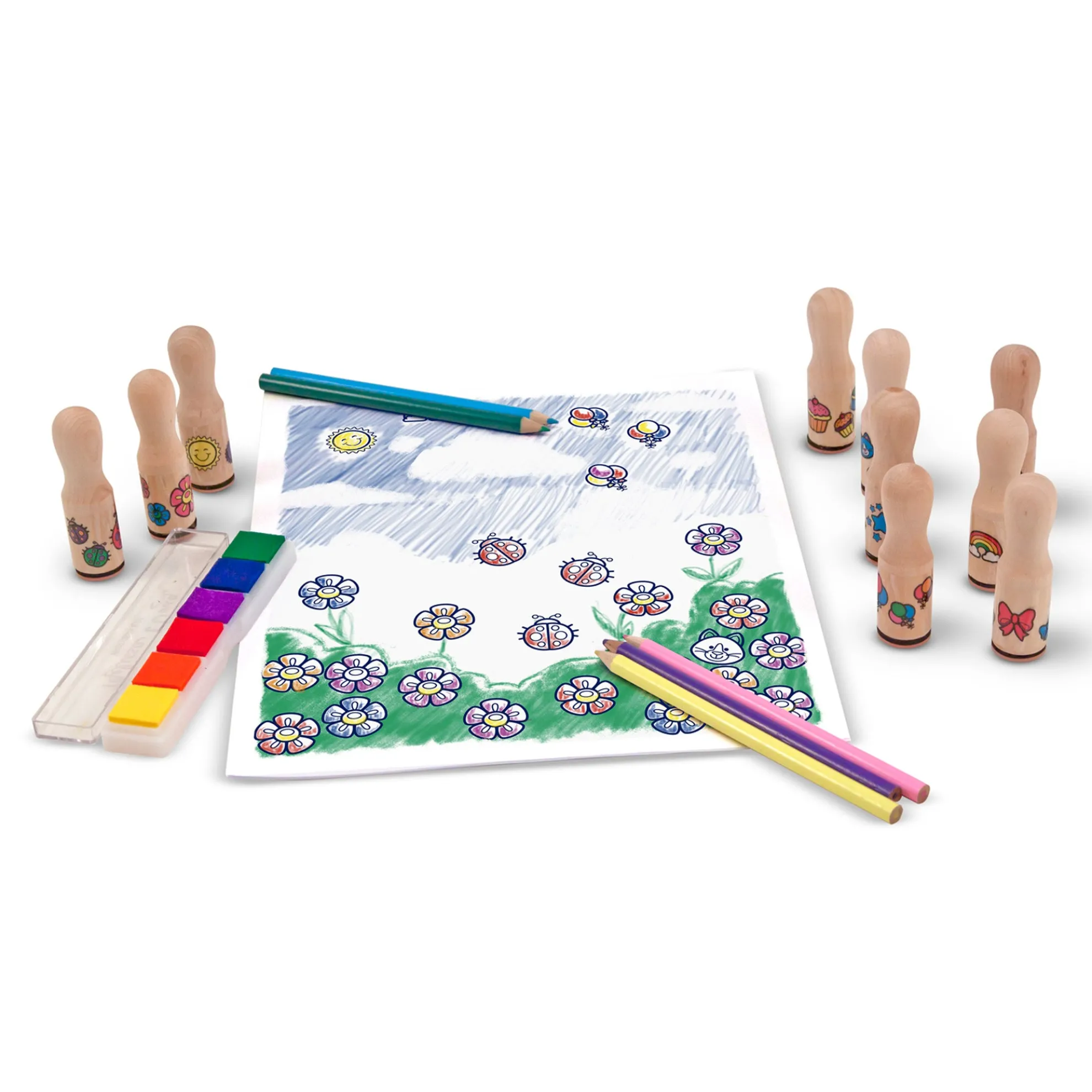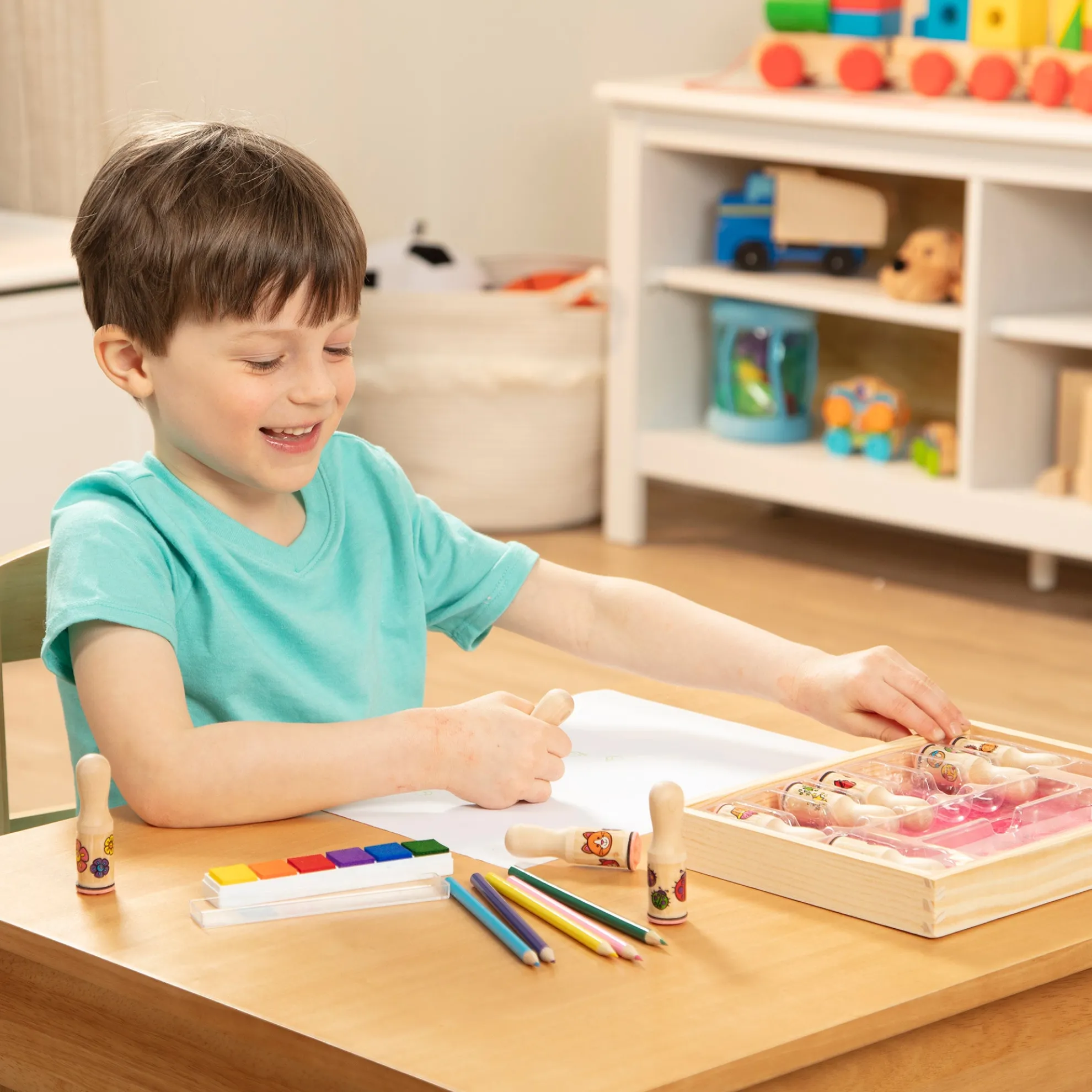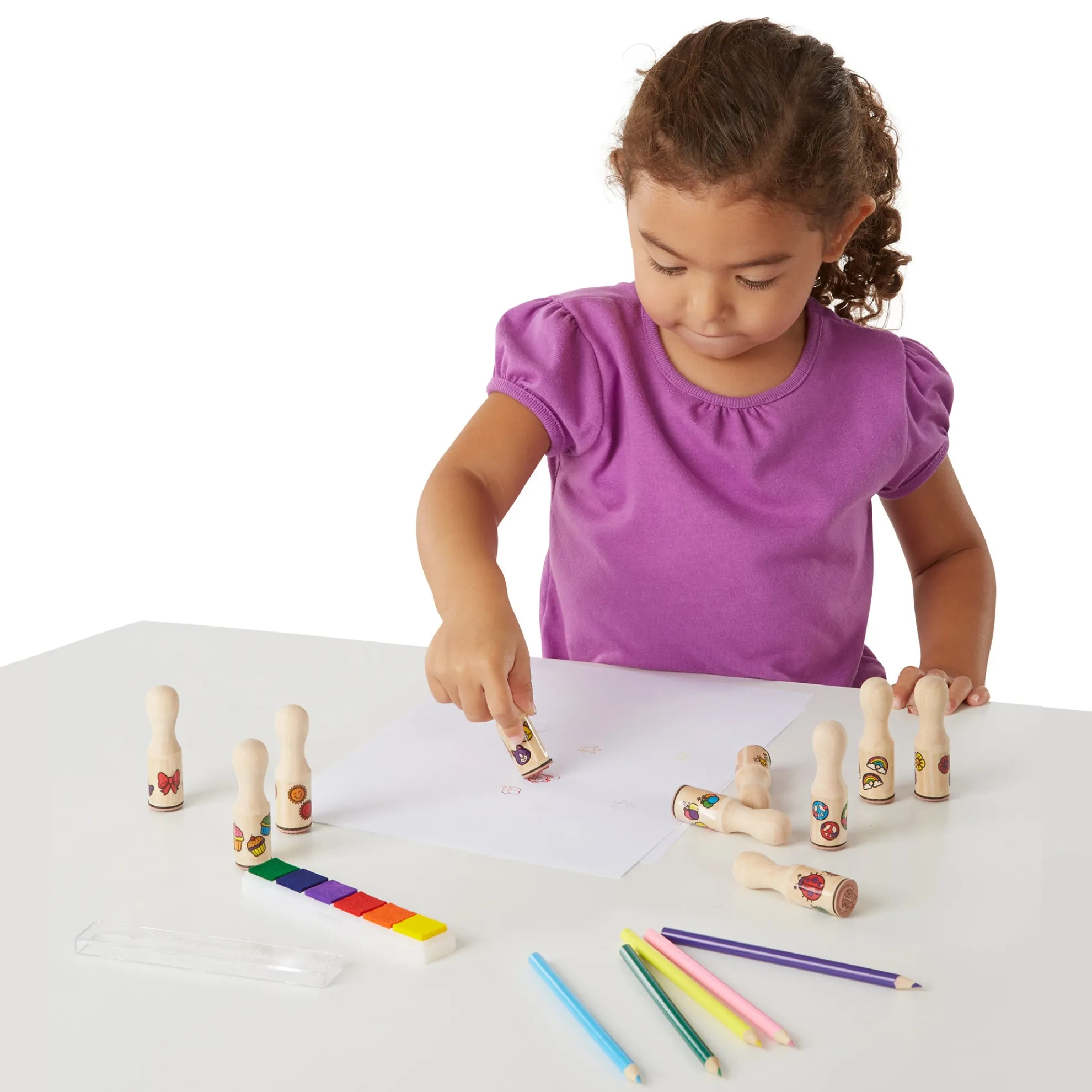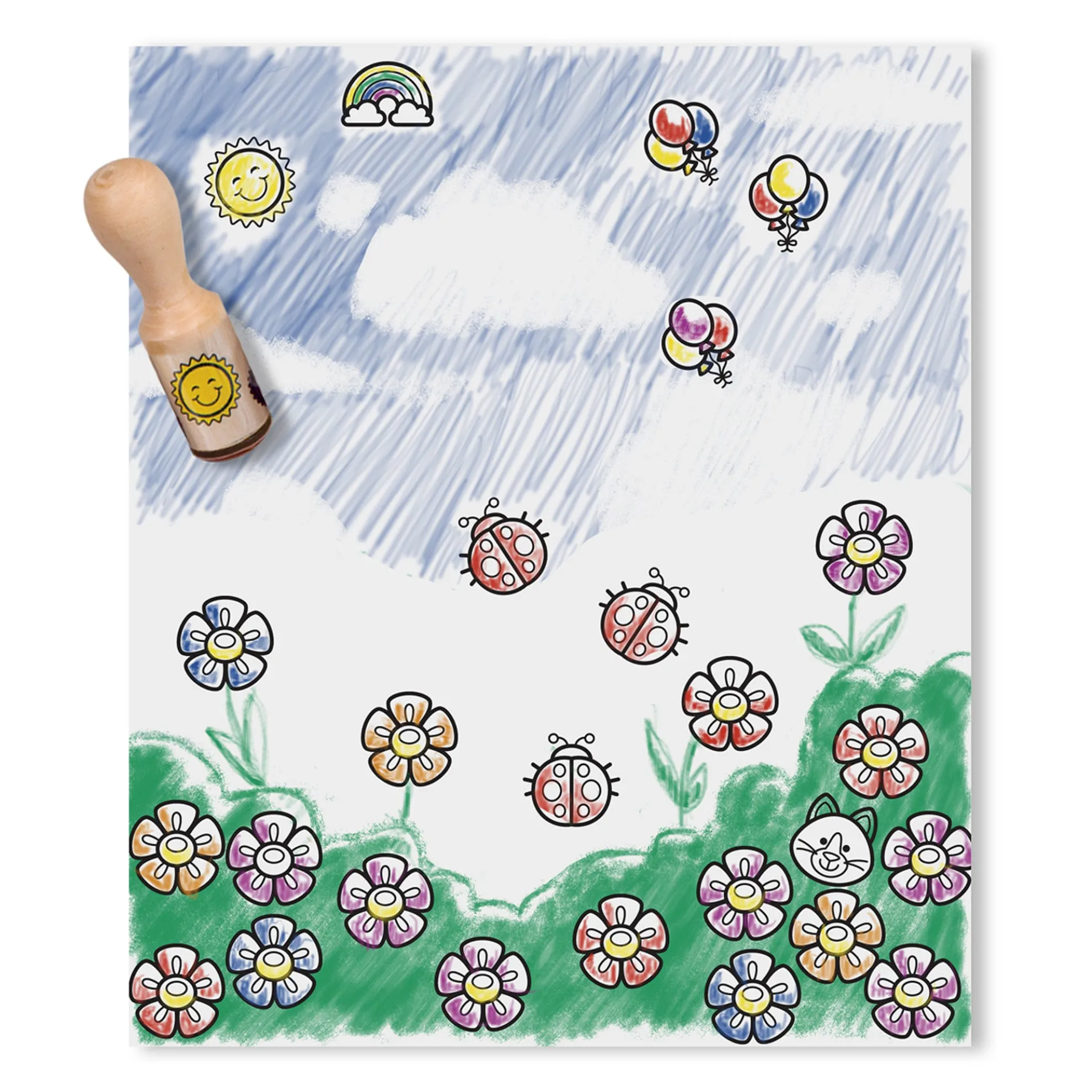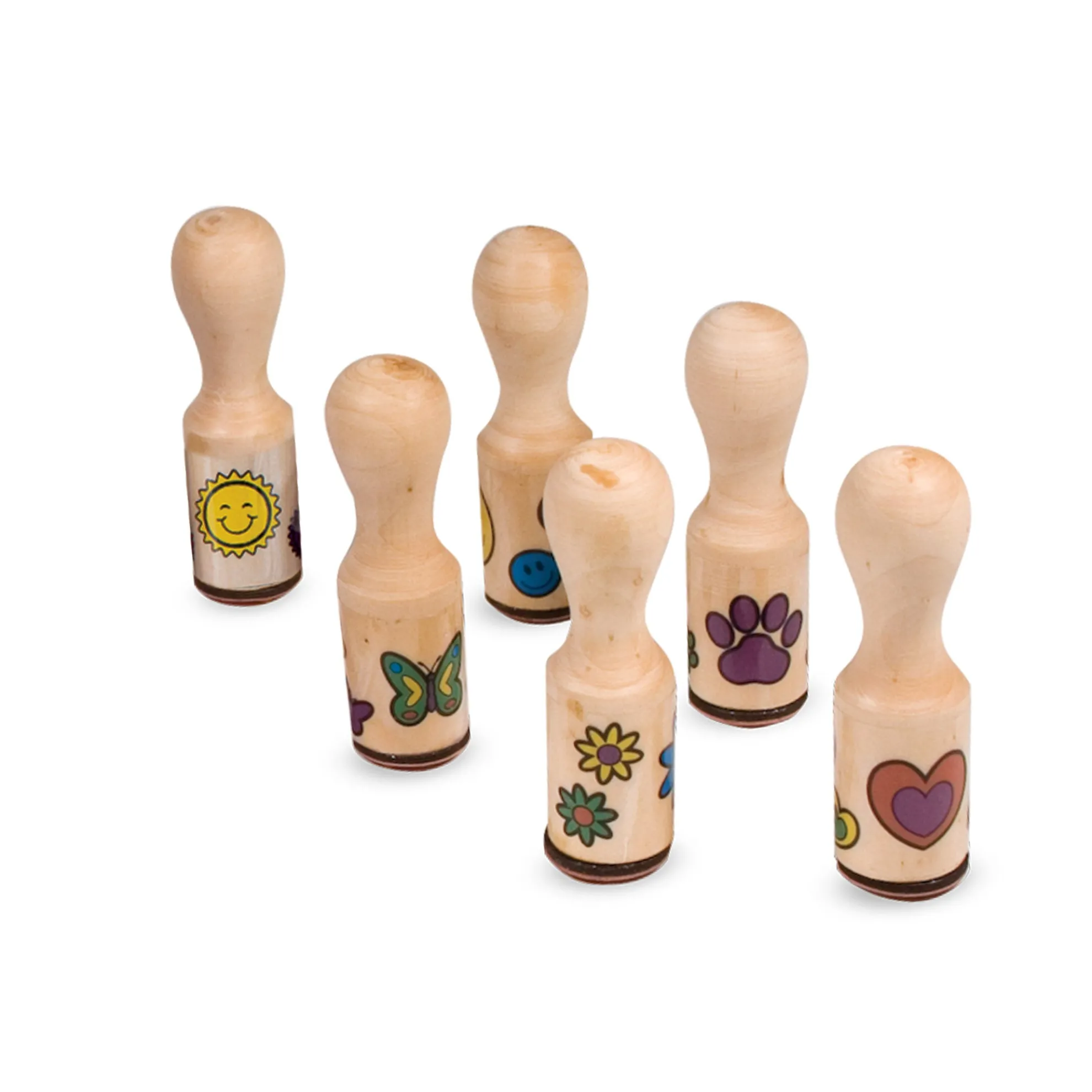 With cheerful artwork and easy-to-grasp handles, this set of 10 rubber stamps is perfect for preschoolers! The extra-long wooden handle keeps fingers off the ink pad as kids stamp rainbows, balloons, peace signs, stars, a smiling sun, and much more. Housed in a sturdy wooden storage tray, the set also includes a six-color ink pad, plus five pencils to color in each stamped shape. Ink is machine washable. With 10 unique designs, this deluxe set is the perfect complement to our Happy Handle Stamp Set . . . or a terrific gift set on its own!