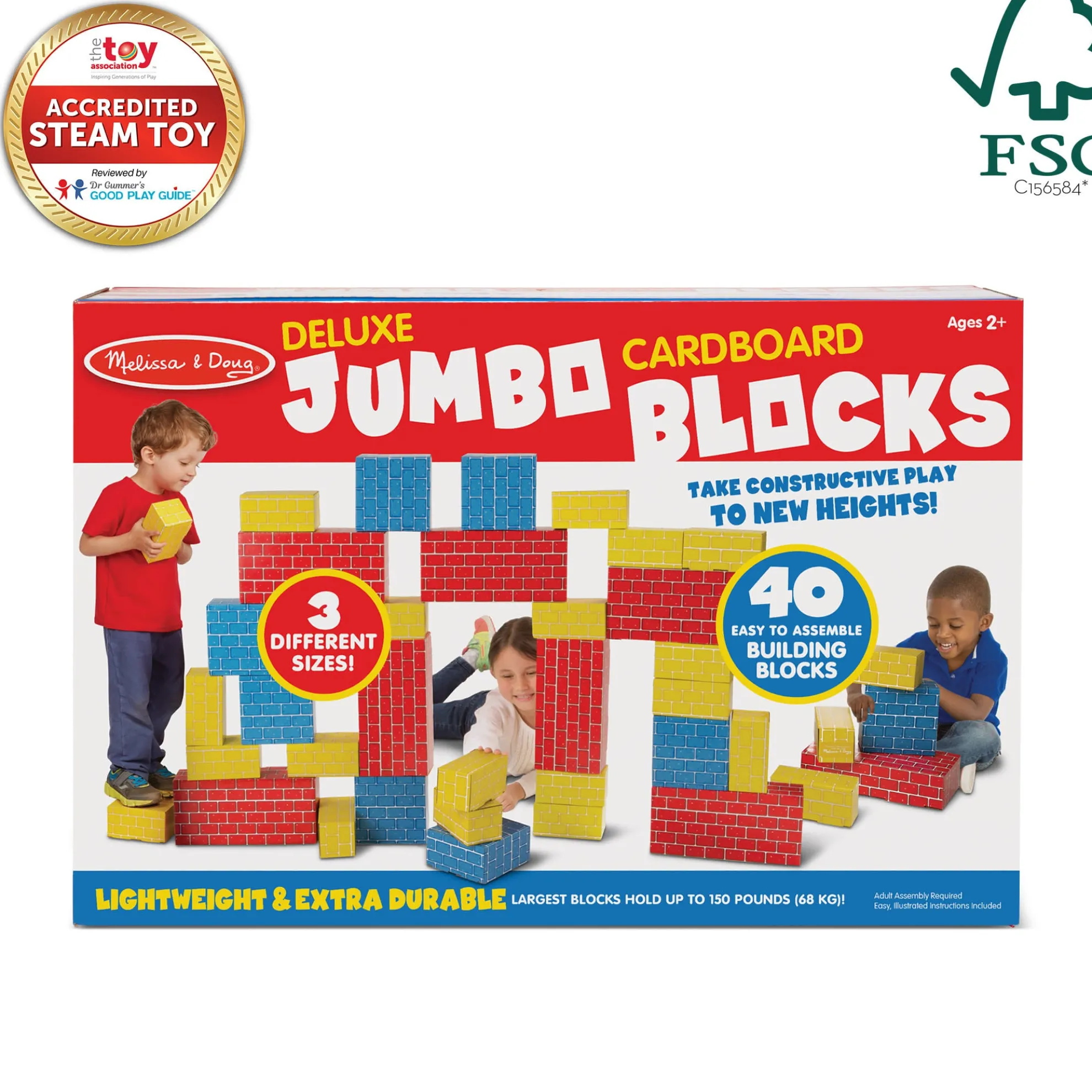 Young construction workers and architects will spend hours with these lightweight yet durable cardboard building blocks. This 40-piece set features three sizes of “bricks” for constructive imaginative play. Made of premium, extra-thick cardboard for strength, they are easy to assemble and feature a wipe-clean surface. The red blocks hold up to 150 lbs! This product is certified by the Forest Stewardship Council. FSC certification ensures that products come from responsibly managed forests that provide environmental, social, and economic benefits, and that forests are protected for future generations. Please note that FSC certification applies to new inventory only (FSC C156584)
