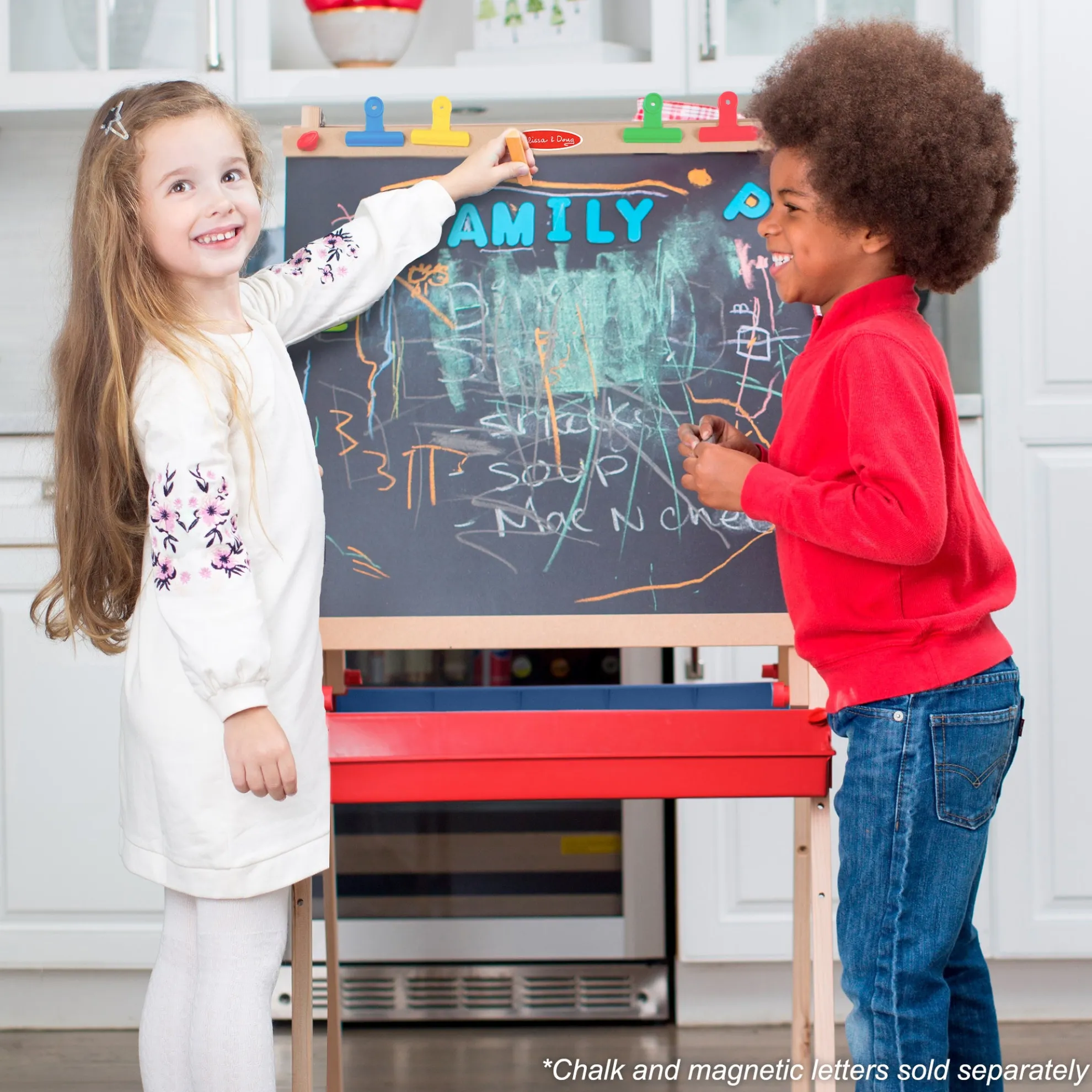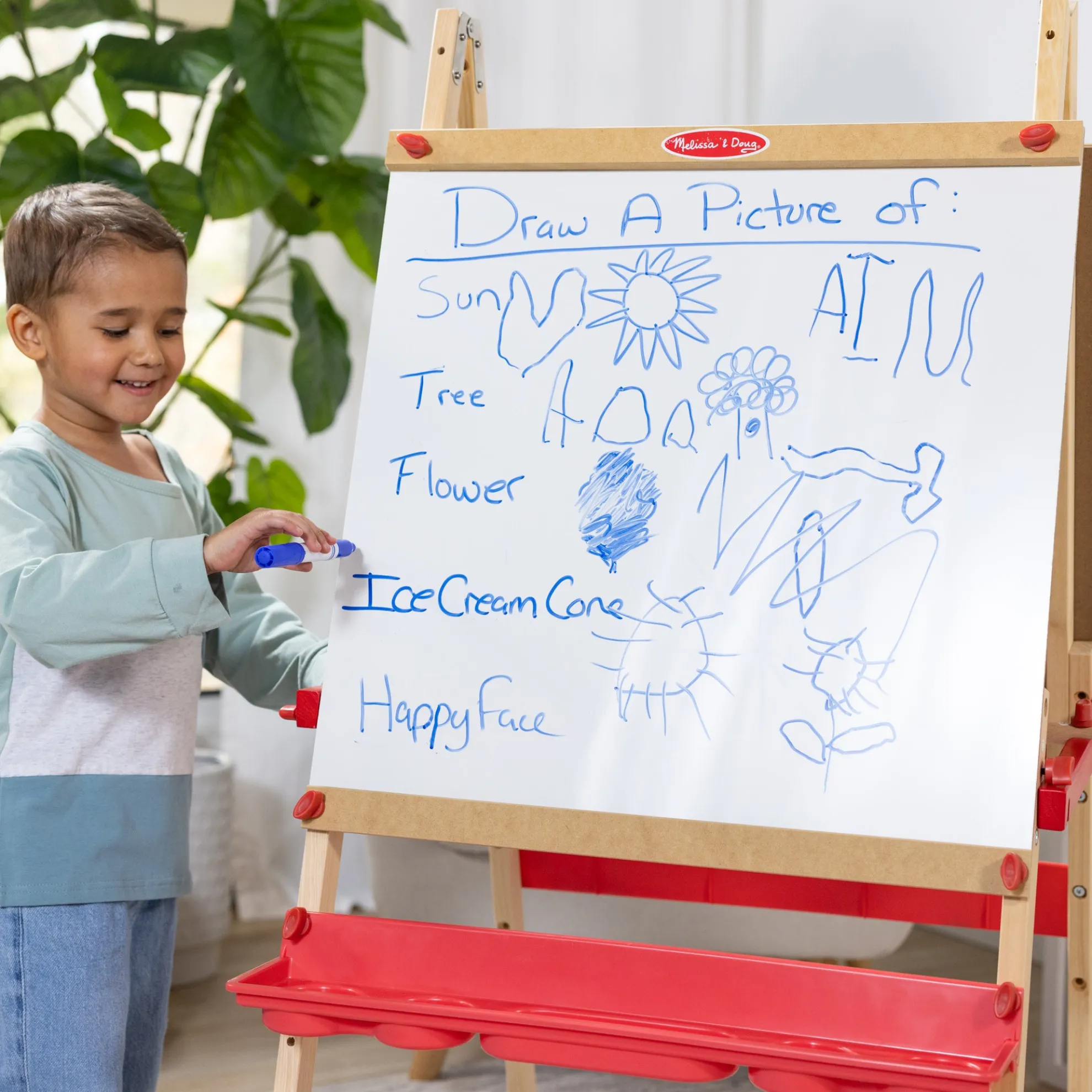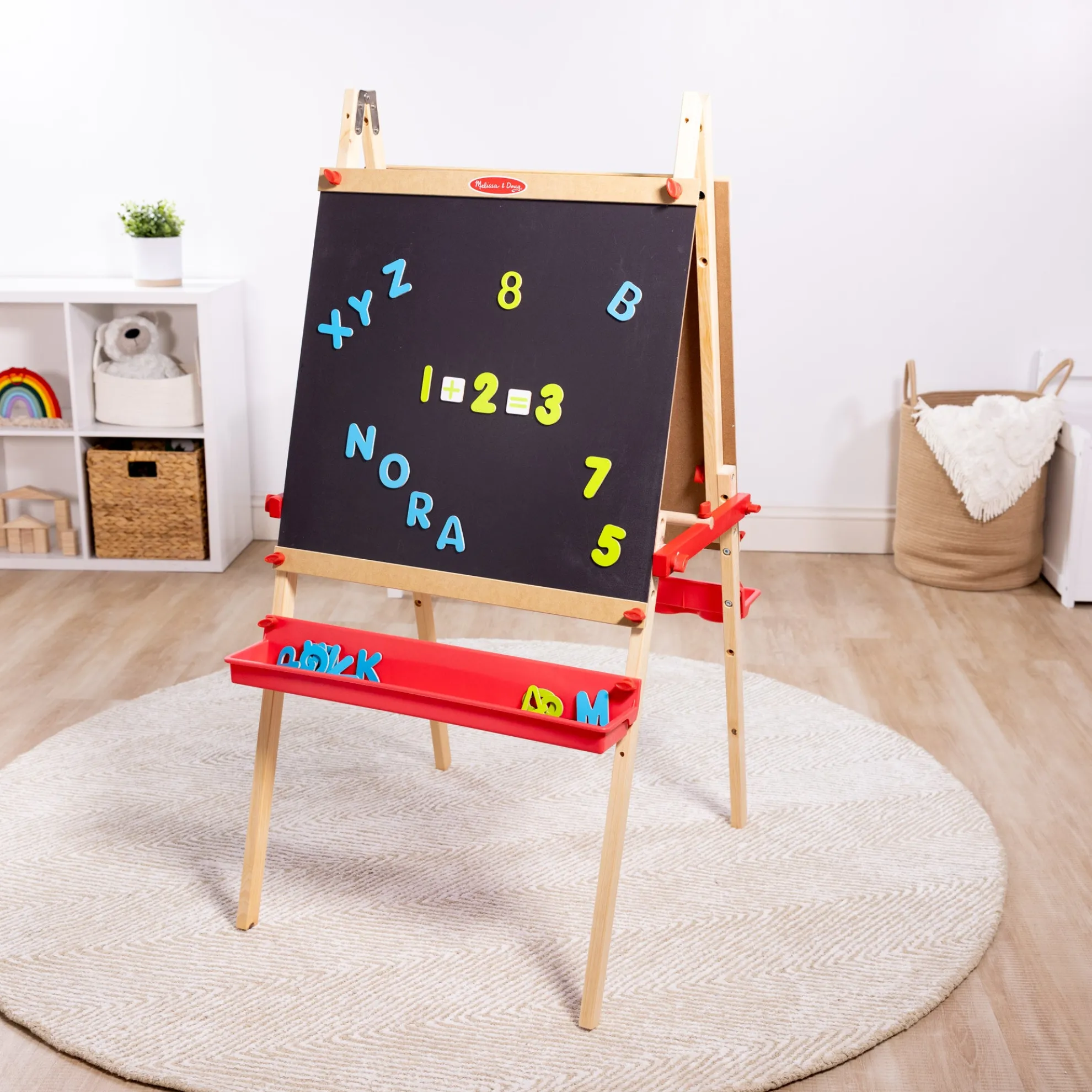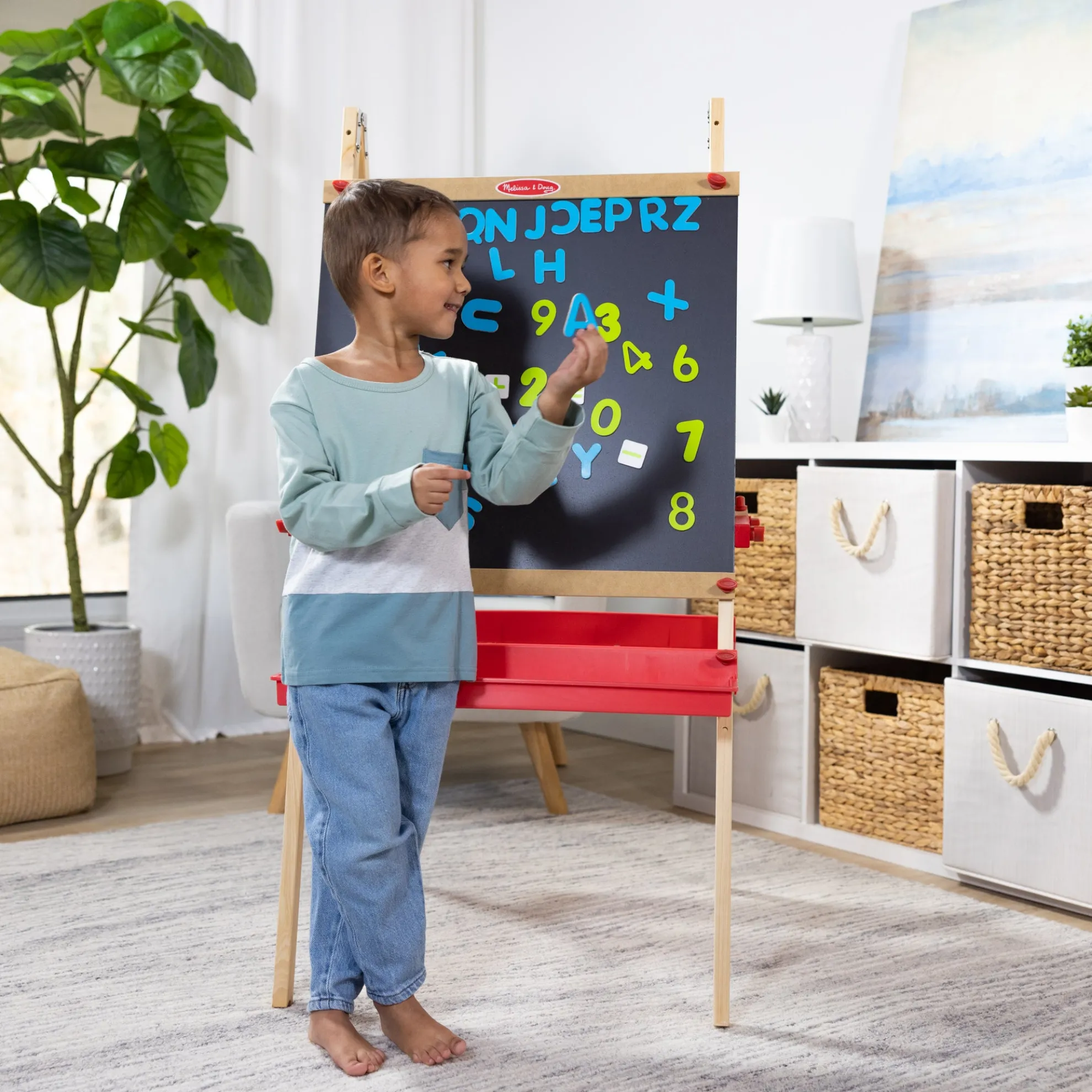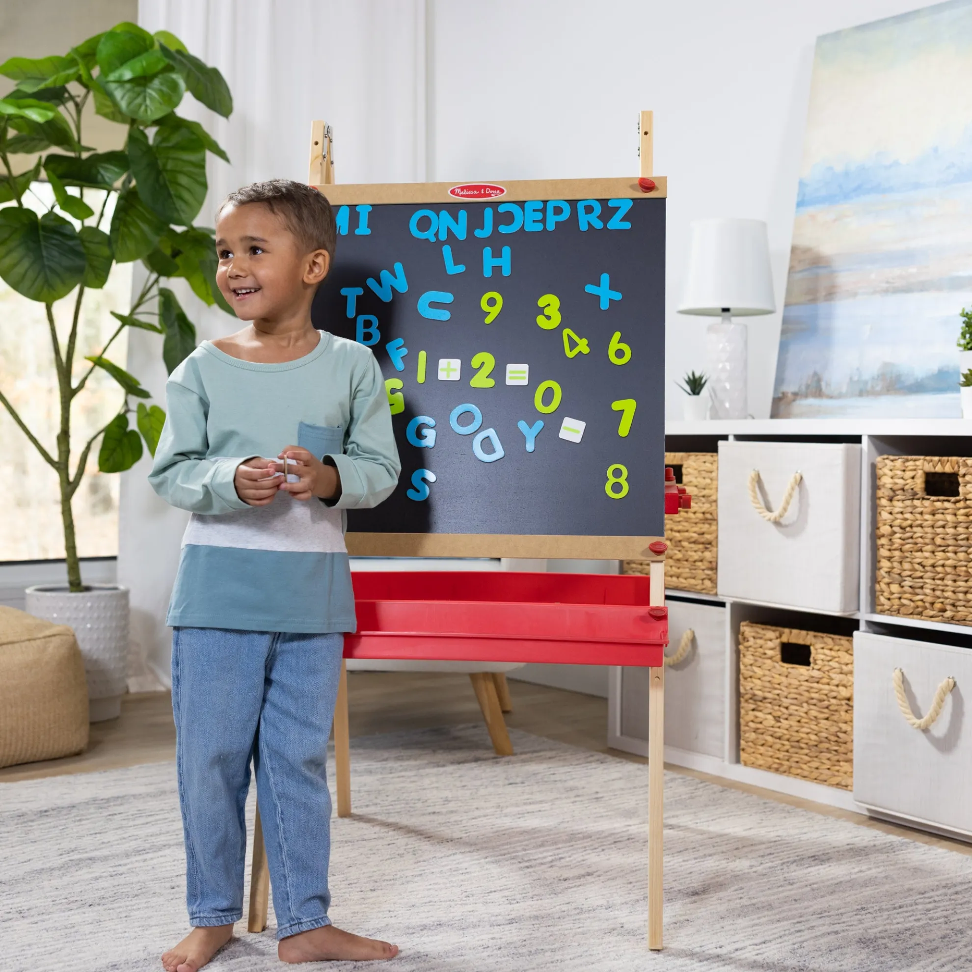 Help spark creative expression in your budding artist with this generously sized, deluxe wooden easel featuring both a magnetic chalkboard and a dry-erase board. The removable plastic trays mean that kids have loads of easy-reach art supplies (not included) at their fingertips. The set also includes 39 letter and number magnets that are great for extended play! The sturdy wooden easel makes a great gift for boys or girls, ages 3 to 8, for hands-on, screen-free play. Melissa & Doug products provide a launch pad to ignite imagination and a sense of wonder in all children so they can discover themselves, their passions, and their purpose. This product is certified by the Forest Stewardship Council. FSC certification ensures that products come from responsibly managed forests that provide environmental, social, and economic benefits, and that forests are protected for future generations. Please note that FSC certification applies to new inventory only (FSC C156584)