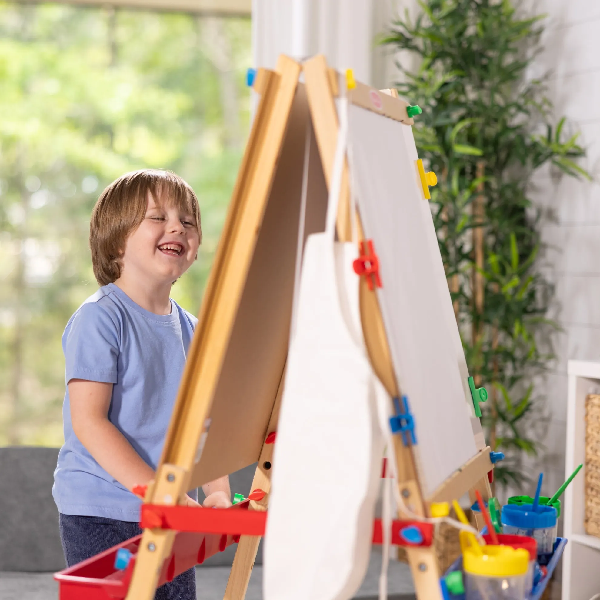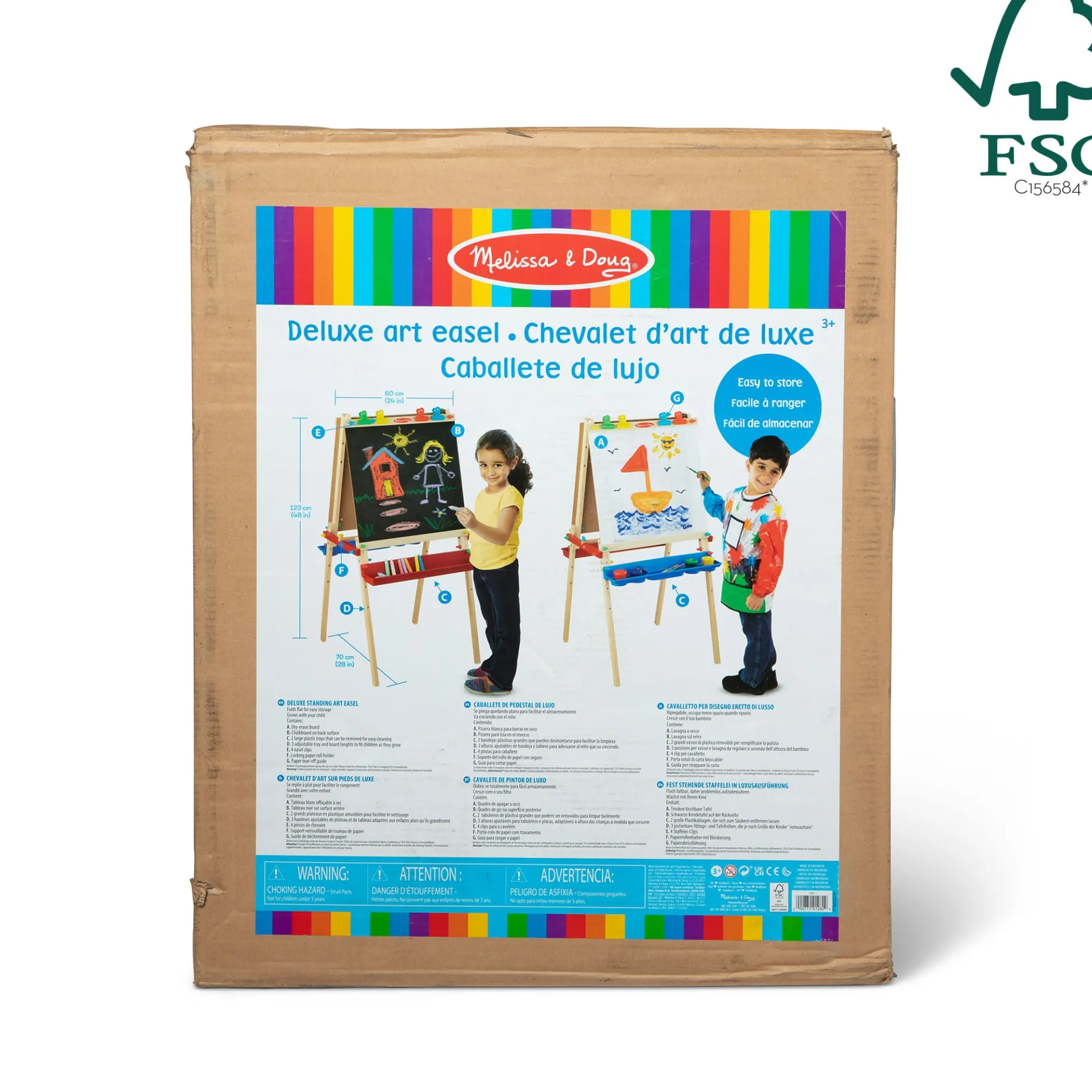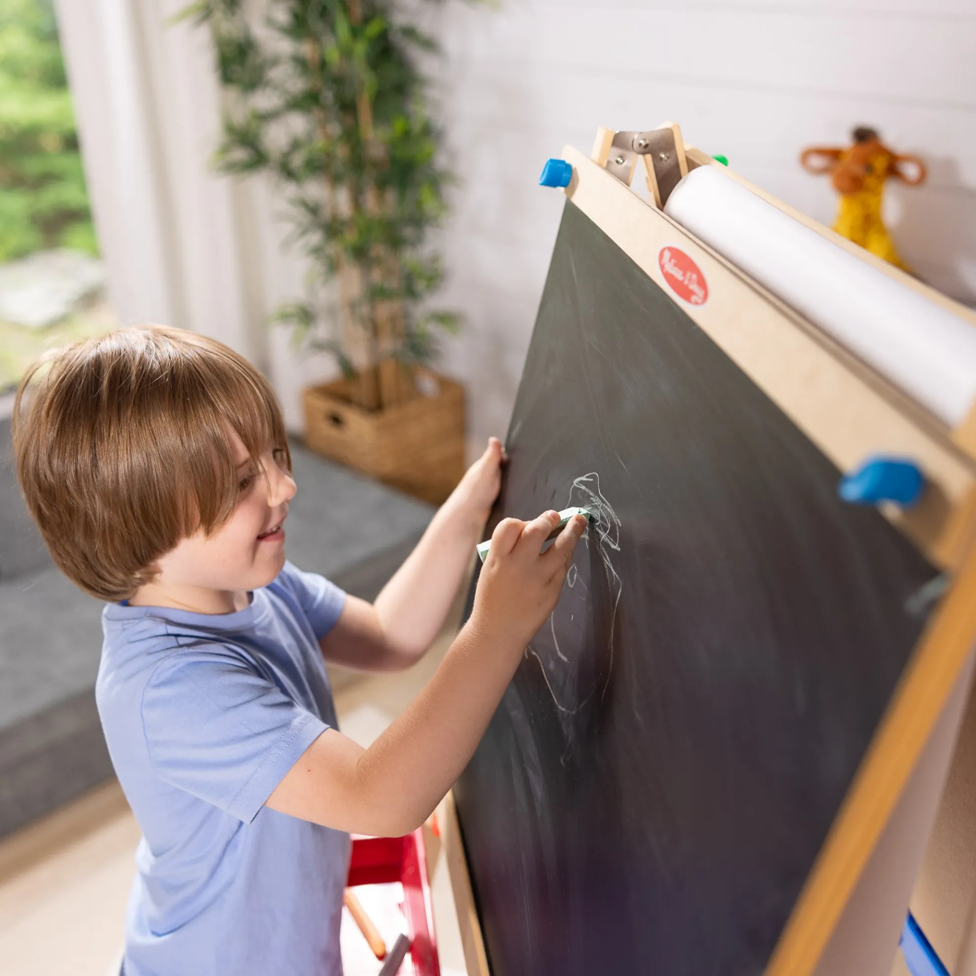 The Melissa & Doug Deluxe Art Easel makes any room into an art studio! Our double-sided, kid-sized art easel includes a dry-erase board, chalkboard, locking paper-roll holder (fits either an 18″ or 12″ wide paper roll), child-safe paper cutter, four easy-grip clips, and a plastic tray to attach to each side of the easel.It’s easy to assemble, so there’s little time waiting for the next masterpiece! Children’s easels are recommended for building fine motor skills and proper pencil grip — it’s great for beginning writers! Use the chalkboard and white board as the ideal practice surfaces for a child’s first letters and words. The easel features a sturdy wooden frame, folds flat for storage, and the height is adjustable so kids can create in comfort. The wooden easel makes a great gift for kids ages three and older for hands-on, screen-free play. (Paint, paint cups, and paint brushes sold separately.) This product is certified by the Forest Stewardship Council. FSC certification ensures that products come from responsibly managed forests that provide environmental, social, and economic benefits, and that forests are protected for future generations. Please note that FSC certification applies to new inventory only (FSC C156584)