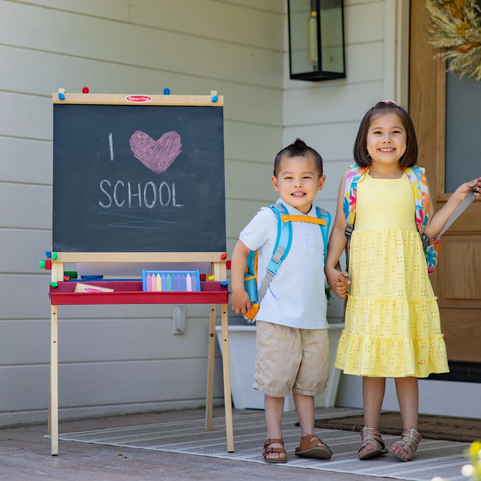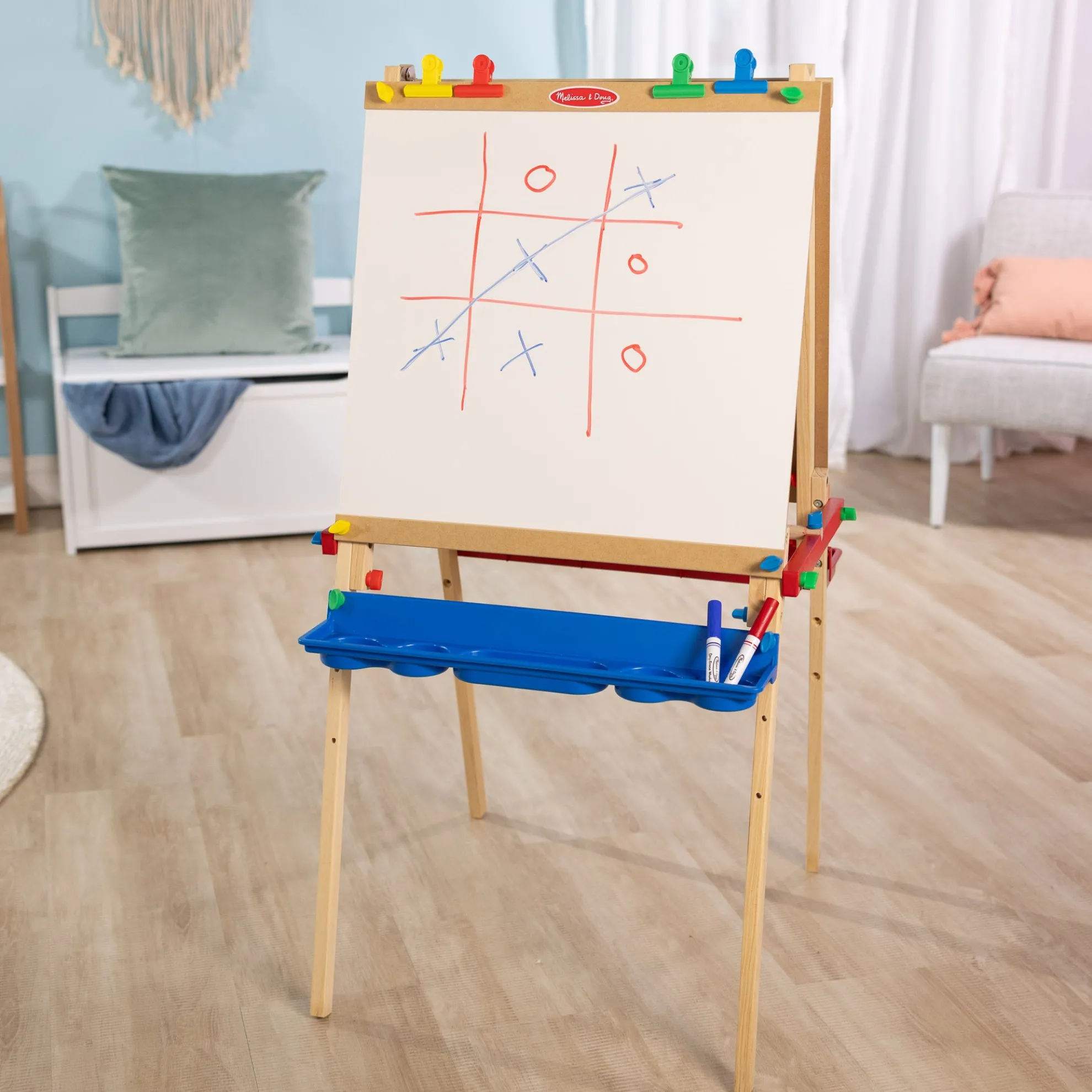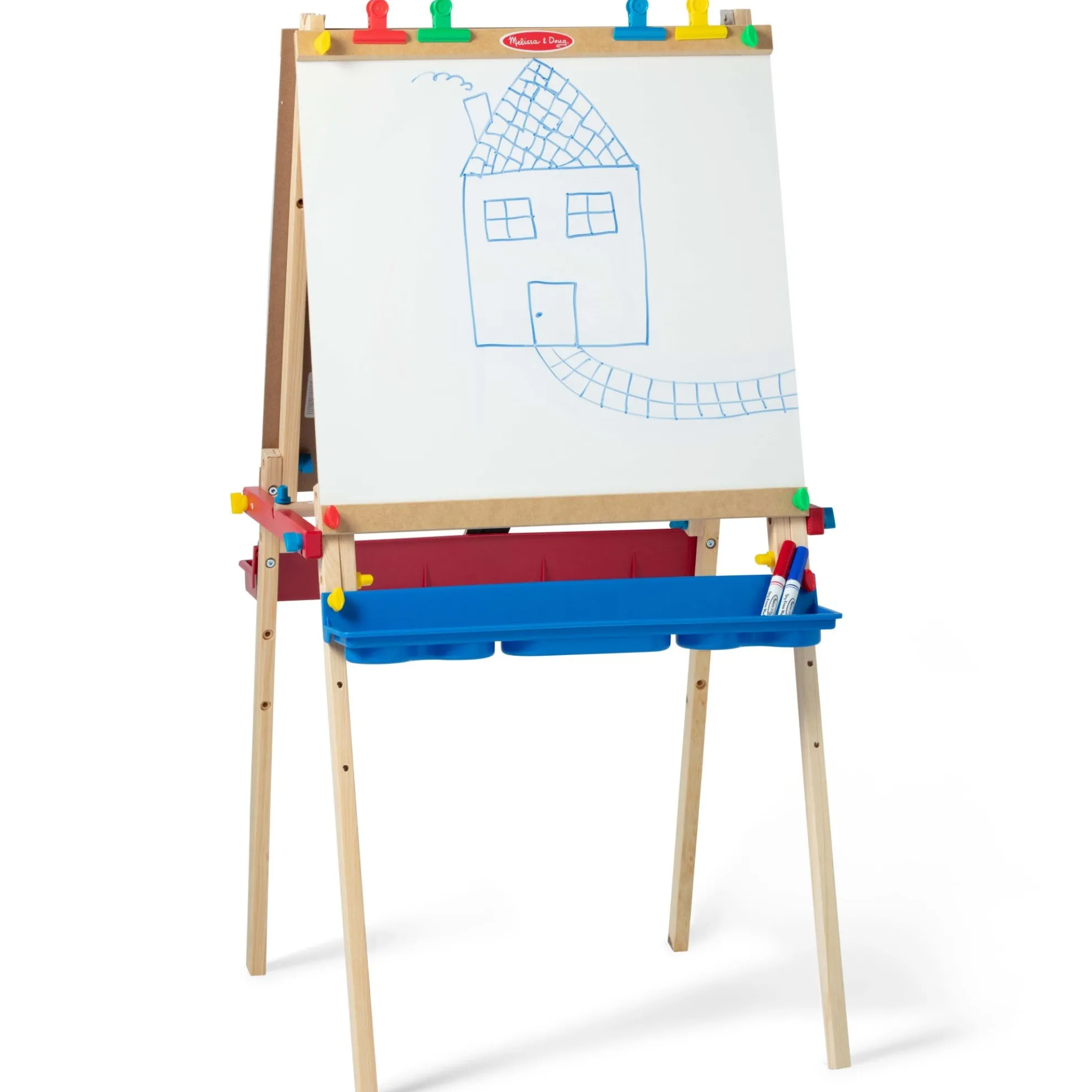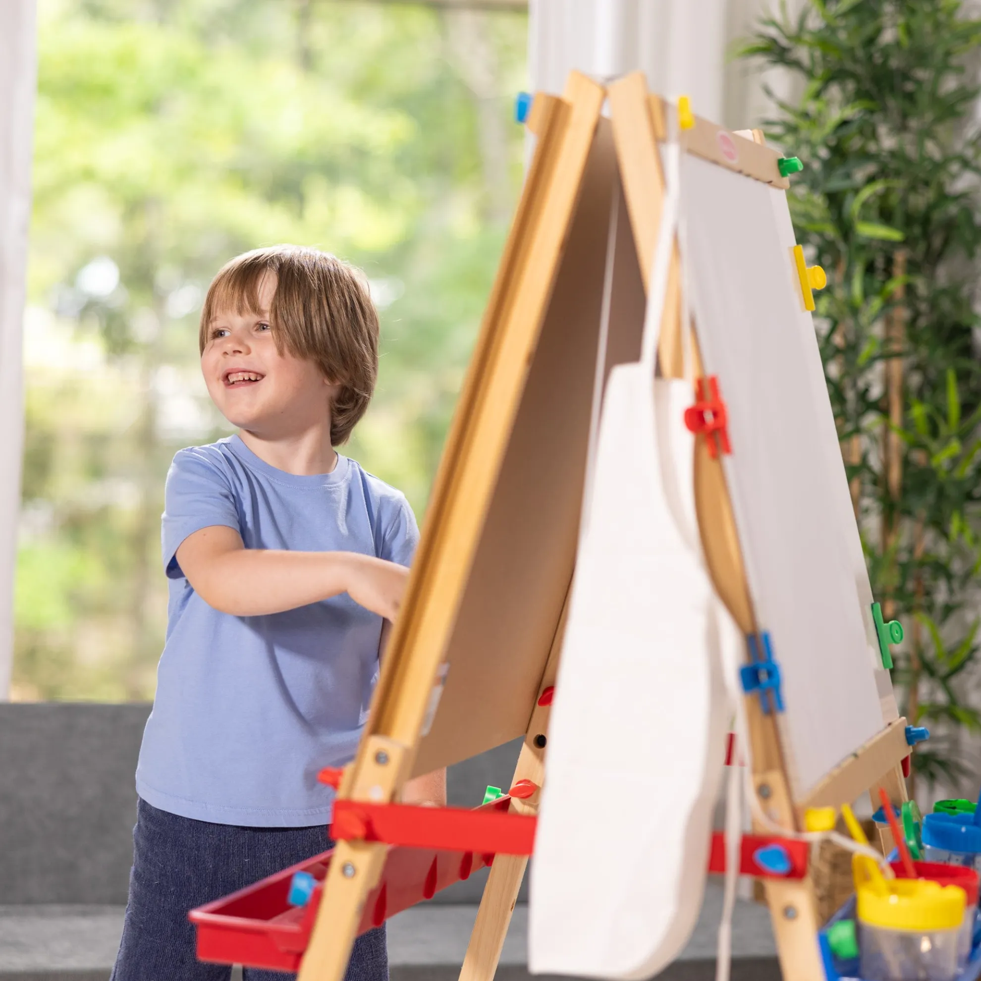 The Melissa & Doug Deluxe Art Easel makes any room into an art studio! Our double-sided, kid-sized art easel includes a dry-erase board, chalkboard, locking paper-roll holder (fits either an 18″ or 12″ wide paper roll), child-safe paper cutter, four easy-grip clips, and a plastic tray to attach to each side of the easel.It’s easy to assemble, so there’s little time waiting for the next masterpiece! Children’s easels are recommended for building fine motor skills and proper pencil grip — it’s great for beginning writers! Use the chalkboard and white board as the ideal practice surfaces for a child’s first letters and words. The easel features a sturdy wooden frame, folds flat for storage, and the height is adjustable so kids can create in comfort. The wooden easel makes a great gift for kids ages three and older for hands-on, screen-free play. (Paint, paint cups, and paint brushes sold separately.) This product is certified by the Forest Stewardship Council. FSC certification ensures that products come from responsibly managed forests that provide environmental, social, and economic benefits, and that forests are protected for future generations. Please note that FSC certification applies to new inventory only (FSC C156584)