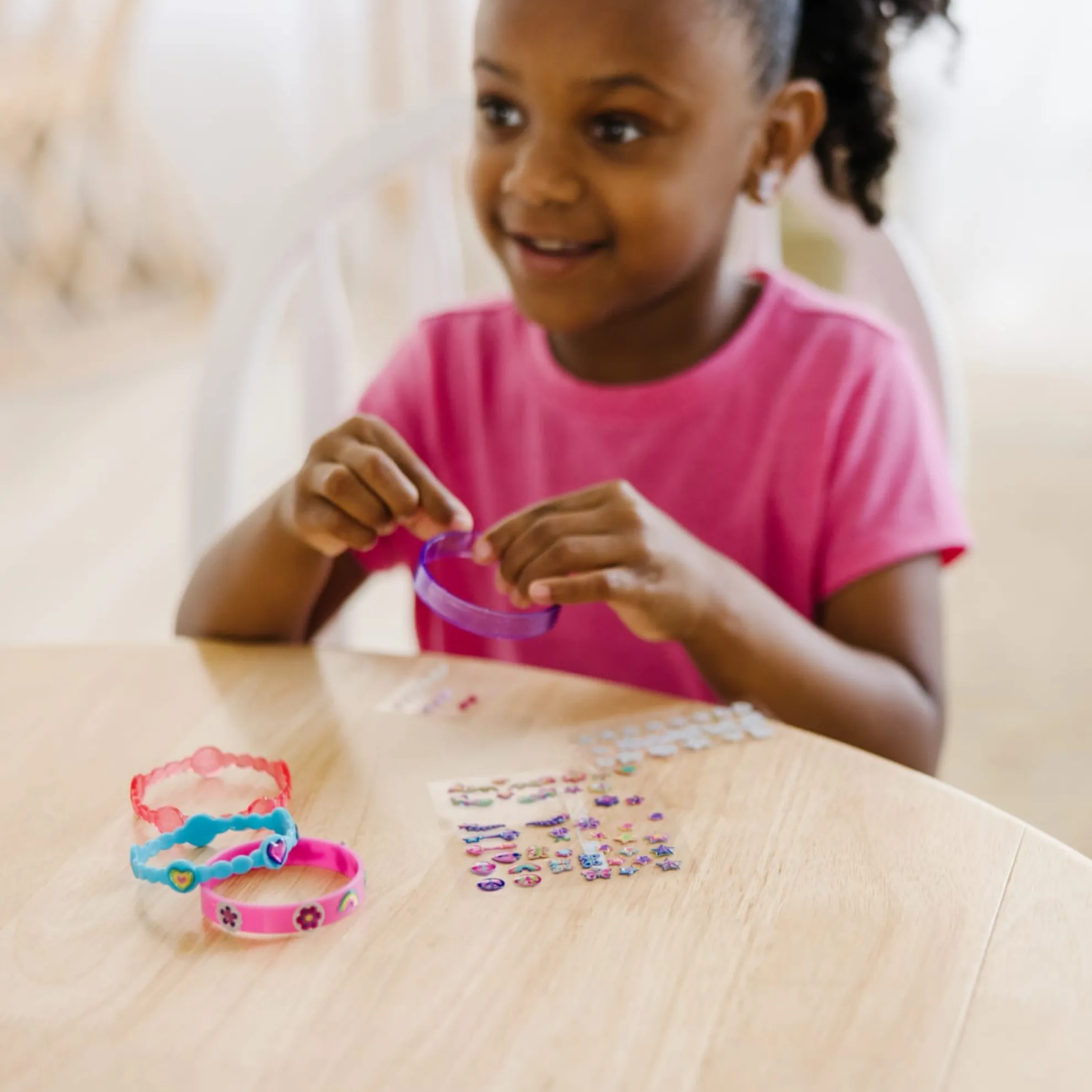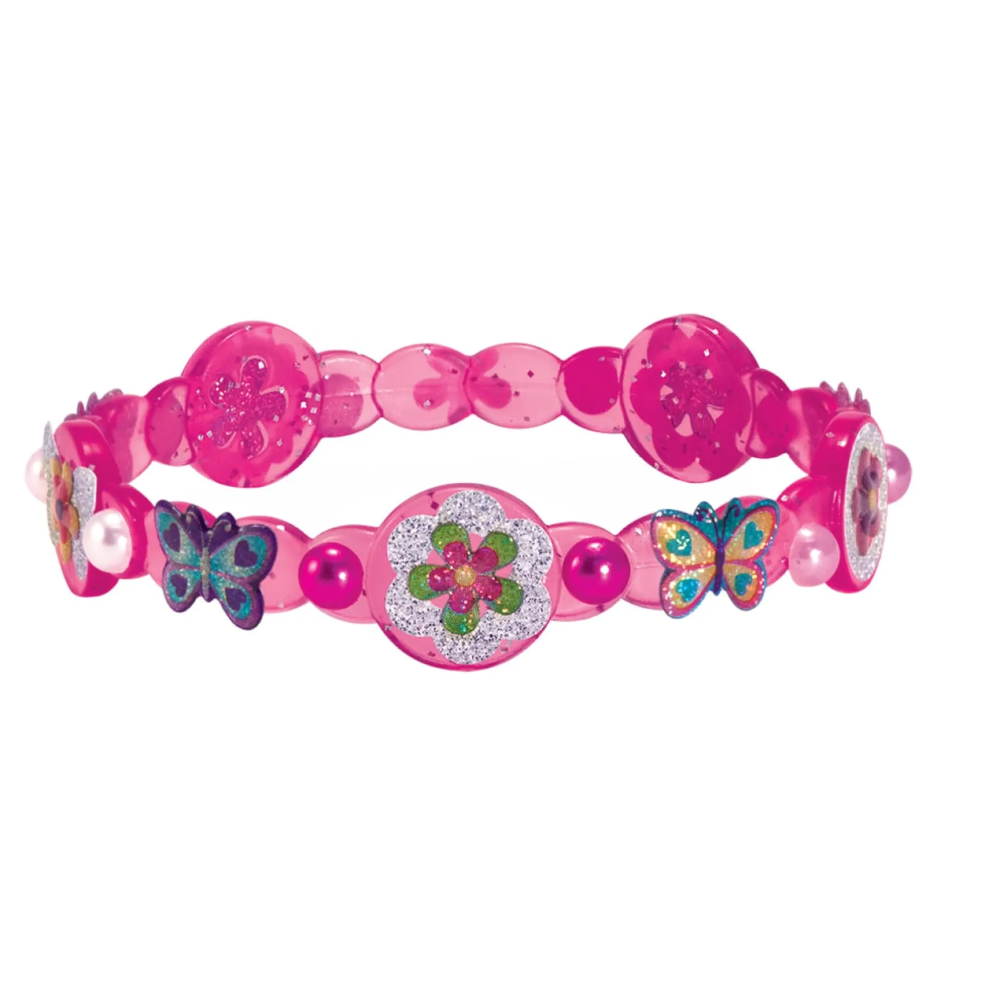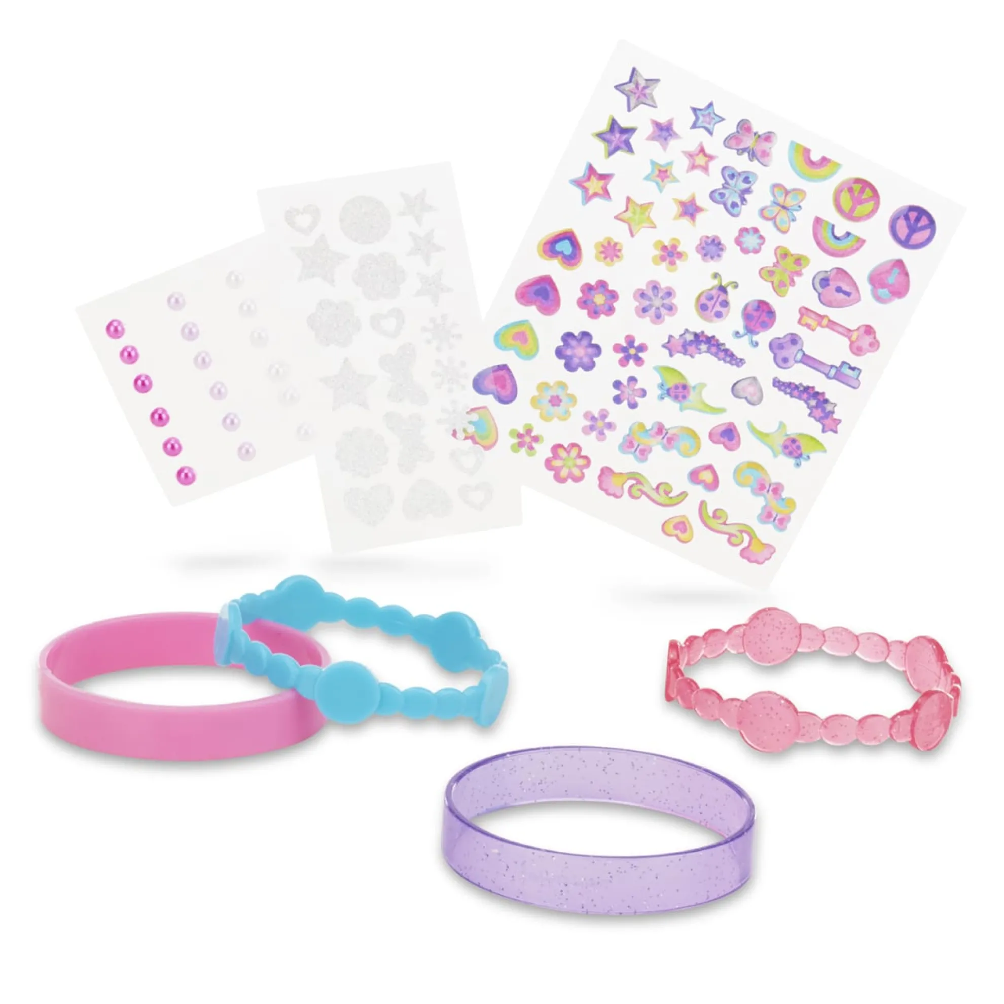 Kids can design, make, and wear their own fabulous bracelet styles with this all-inclusive craft kit! Shimmering gel stickers, sparkling glitter stickers, and stick-on pearls make it easy to customize the four bangle-style bracelets with a gorgeous array of shapes and designs. Kids can layer on the stickers or create one-of-a-kind patterns–whatever the design, the results always look fabulous!