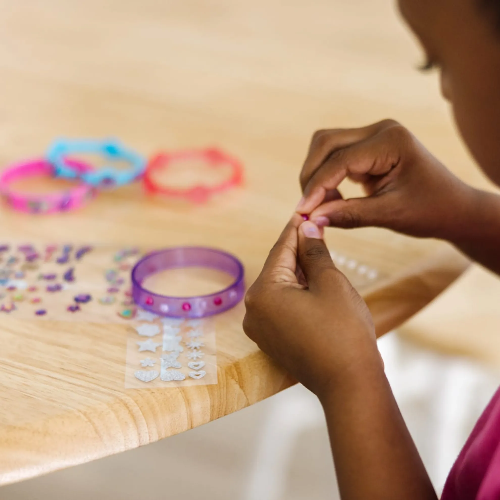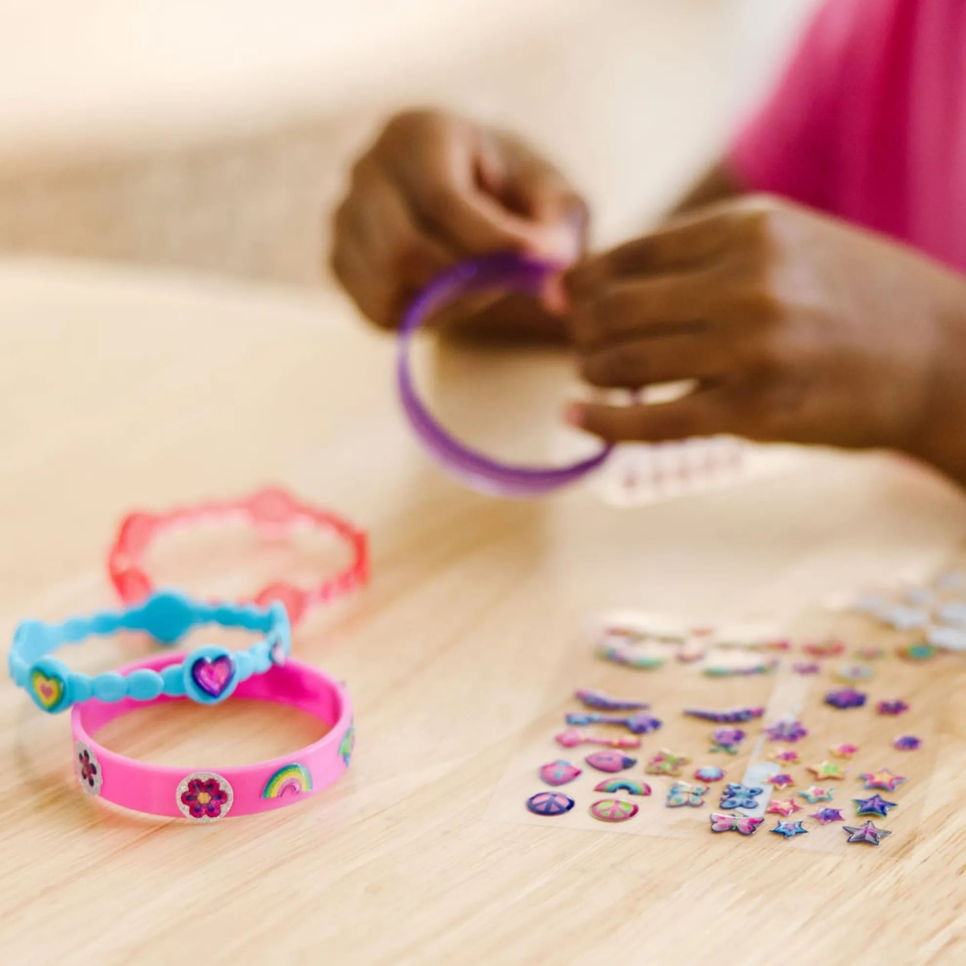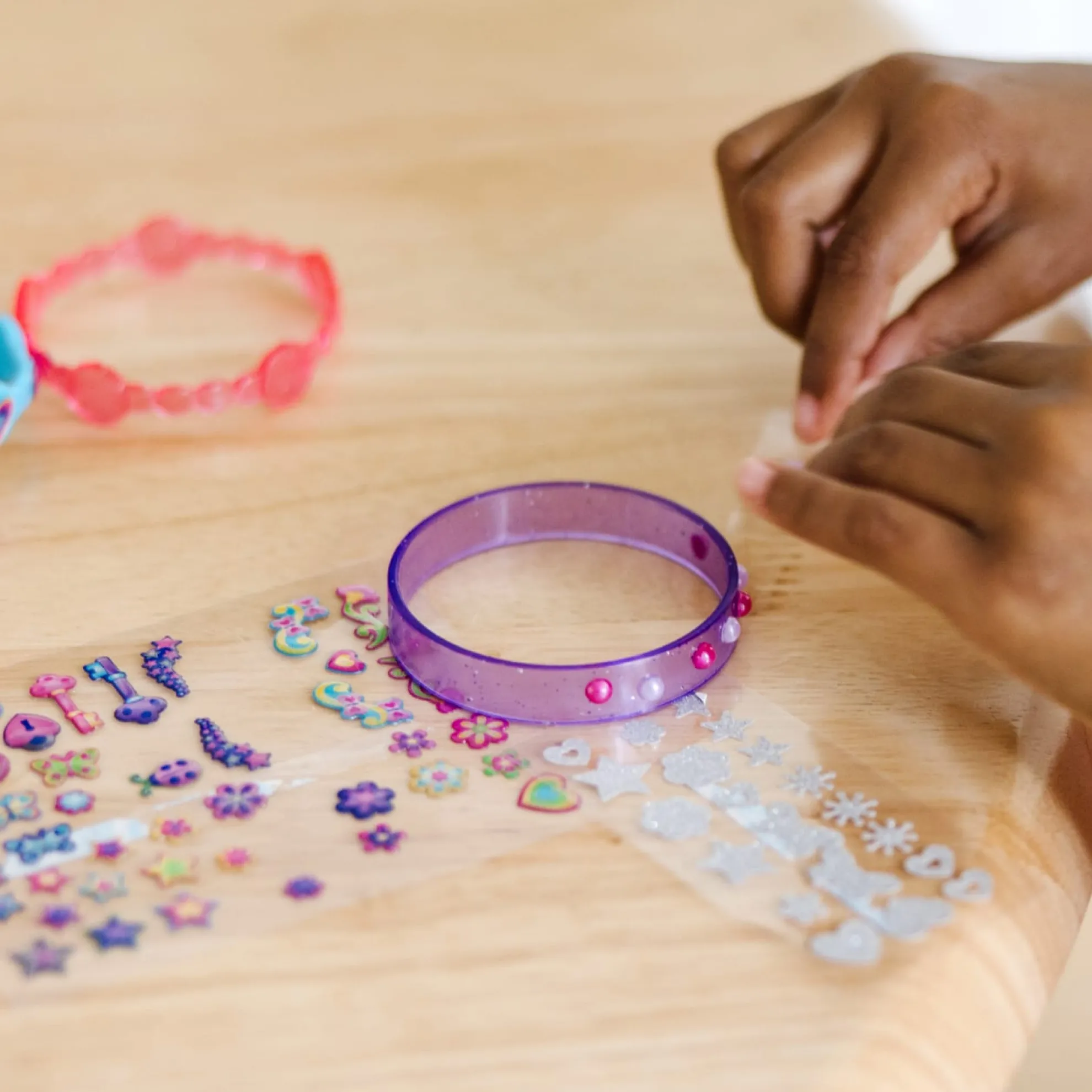 Kids can design, make, and wear their own fabulous bracelet styles with this all-inclusive craft kit! Shimmering gel stickers, sparkling glitter stickers, and stick-on pearls make it easy to customize the four bangle-style bracelets with a gorgeous array of shapes and designs. Kids can layer on the stickers or create one-of-a-kind patterns–whatever the design, the results always look fabulous!
