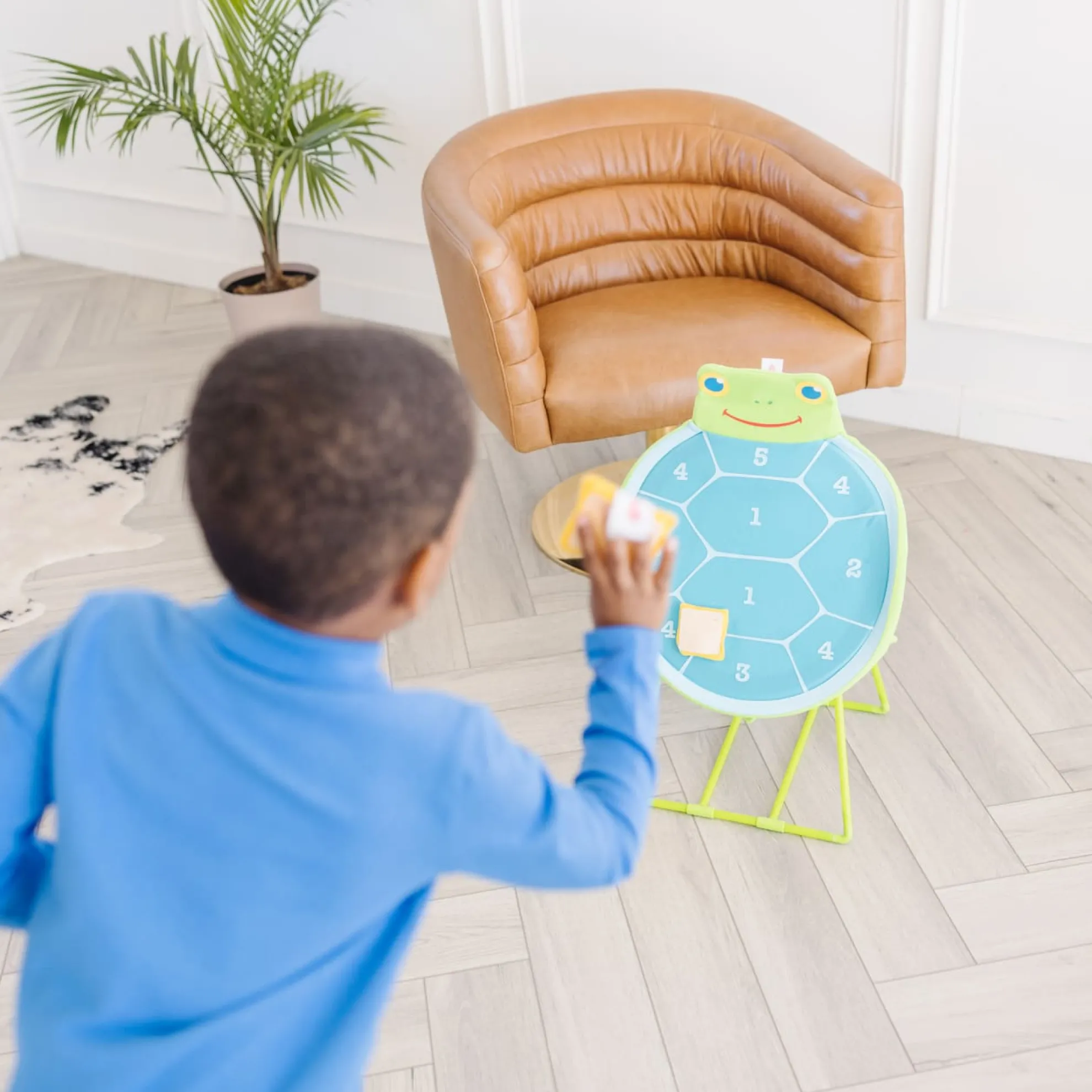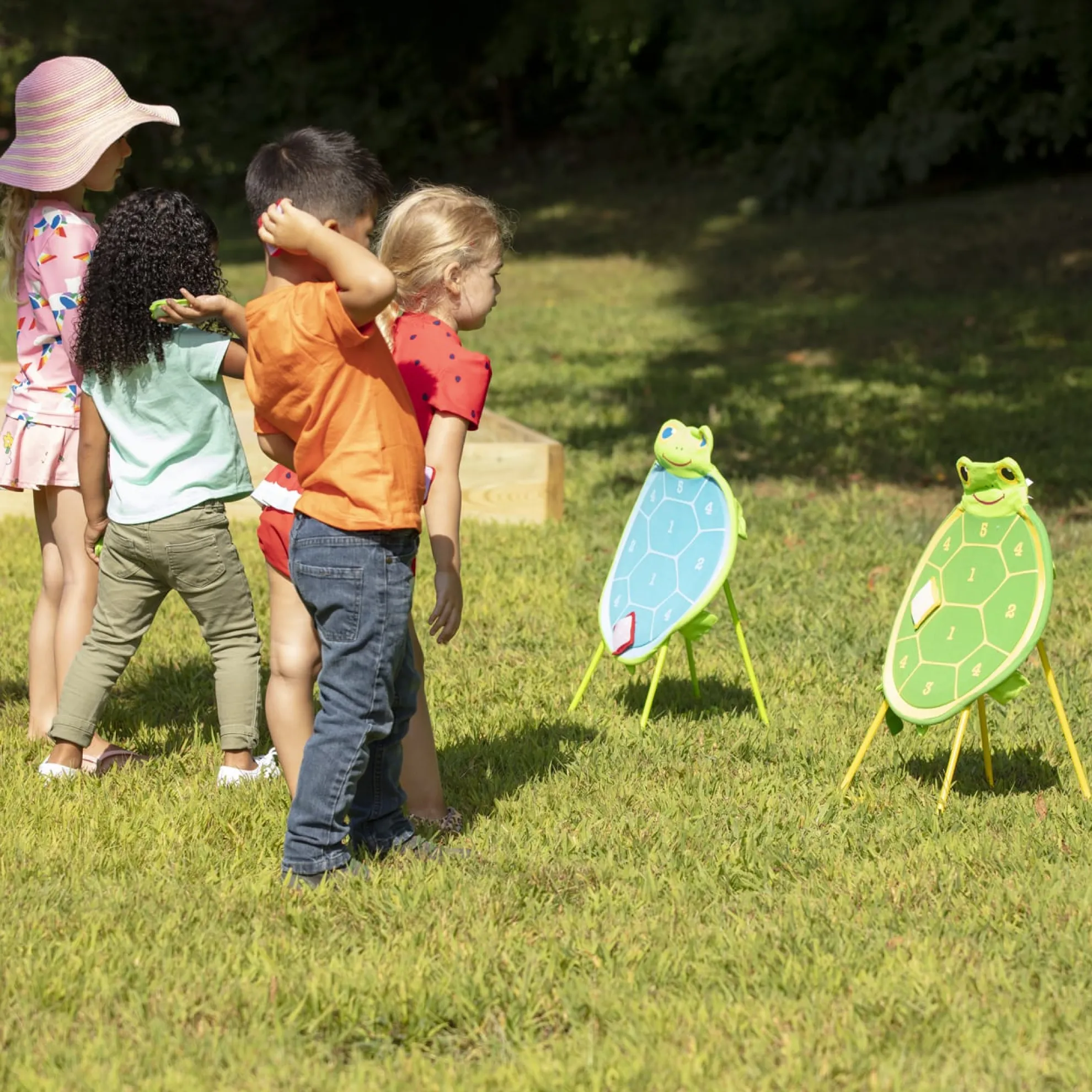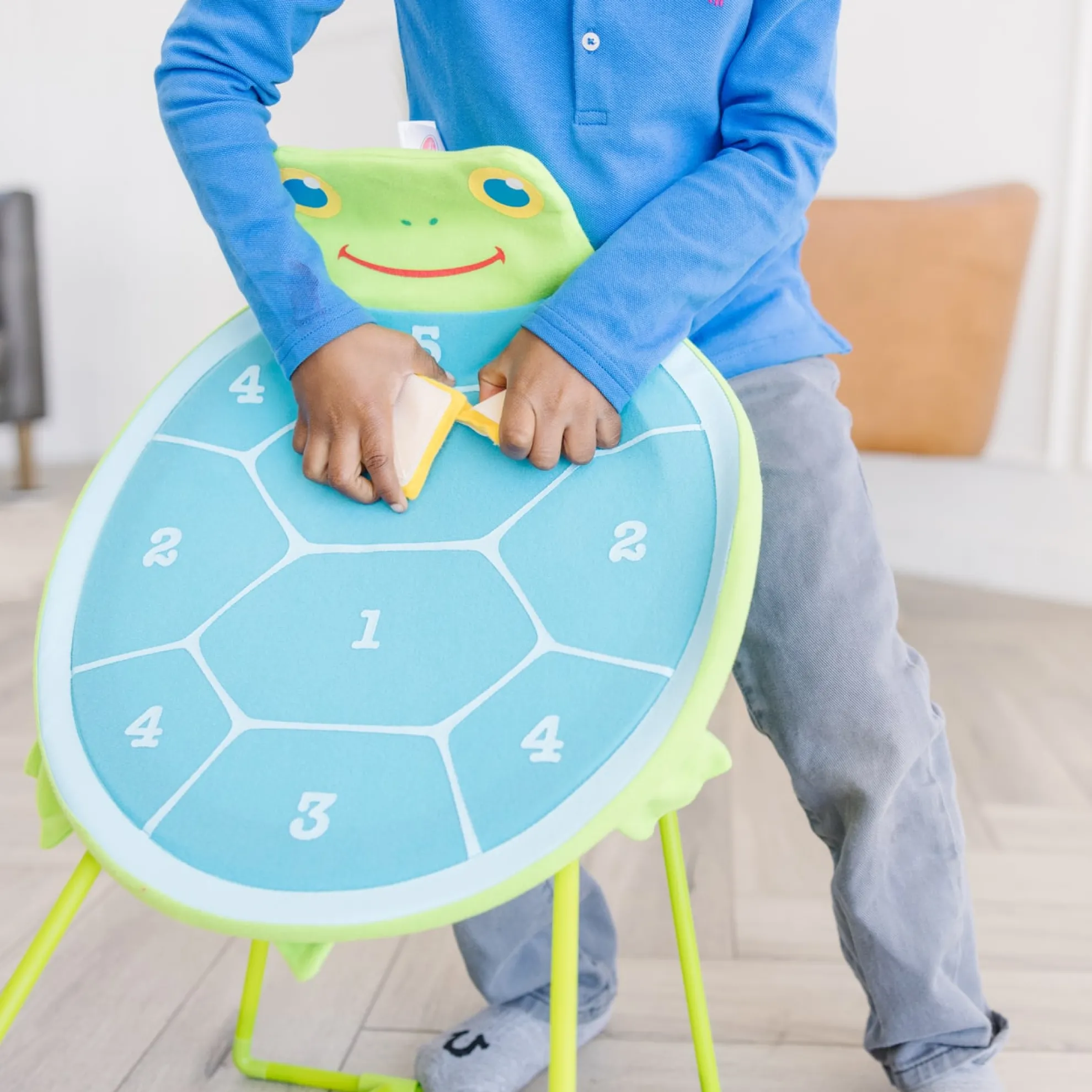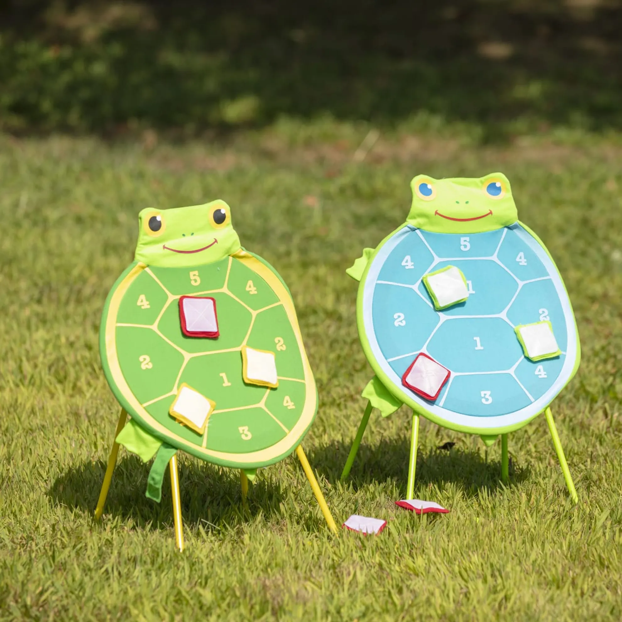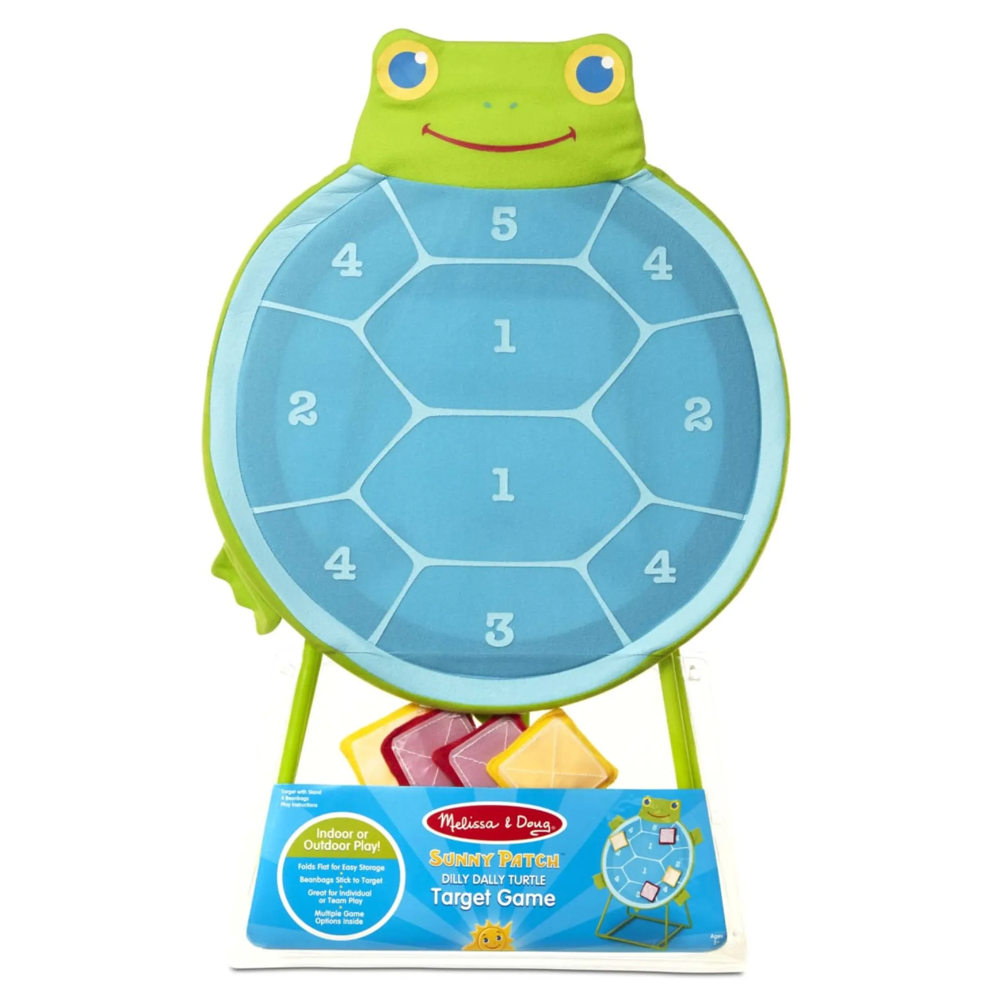 Pick a team–red or yellow–and take turns tossing the self-sticking beanbags at the turtle-shaped fabric target with numbered sections. Ideal for individual play, too. Durably constructed for use either indoors or outside, the non-wobbling sturdy base and a smiling Dilly Dally turtle face make this an exciting and inviting way for kids three and older to learn simple addition and practice hand-eye coordination.
