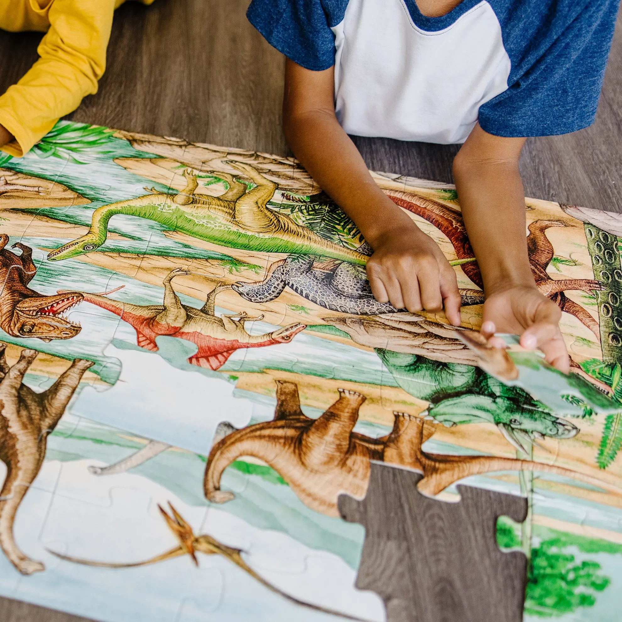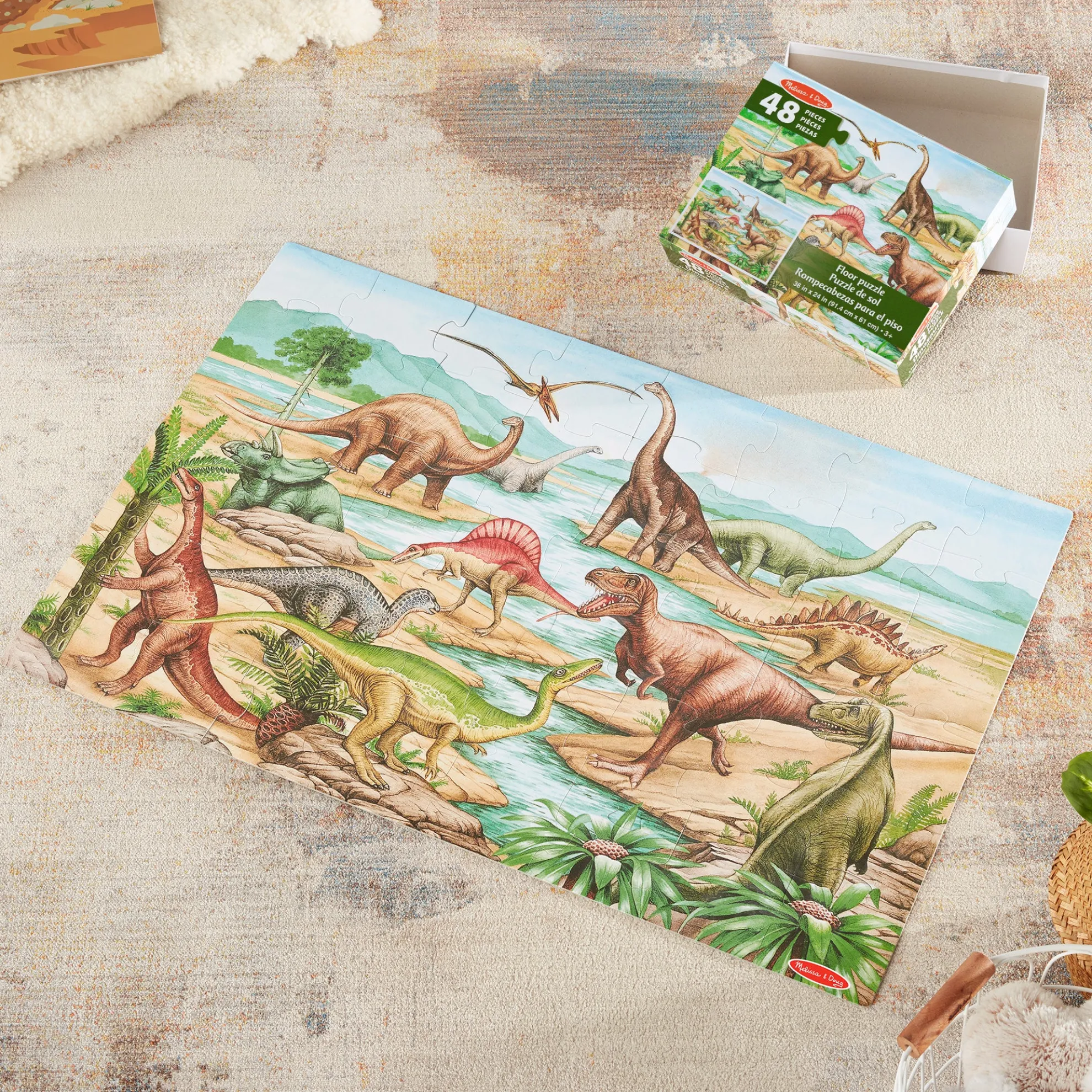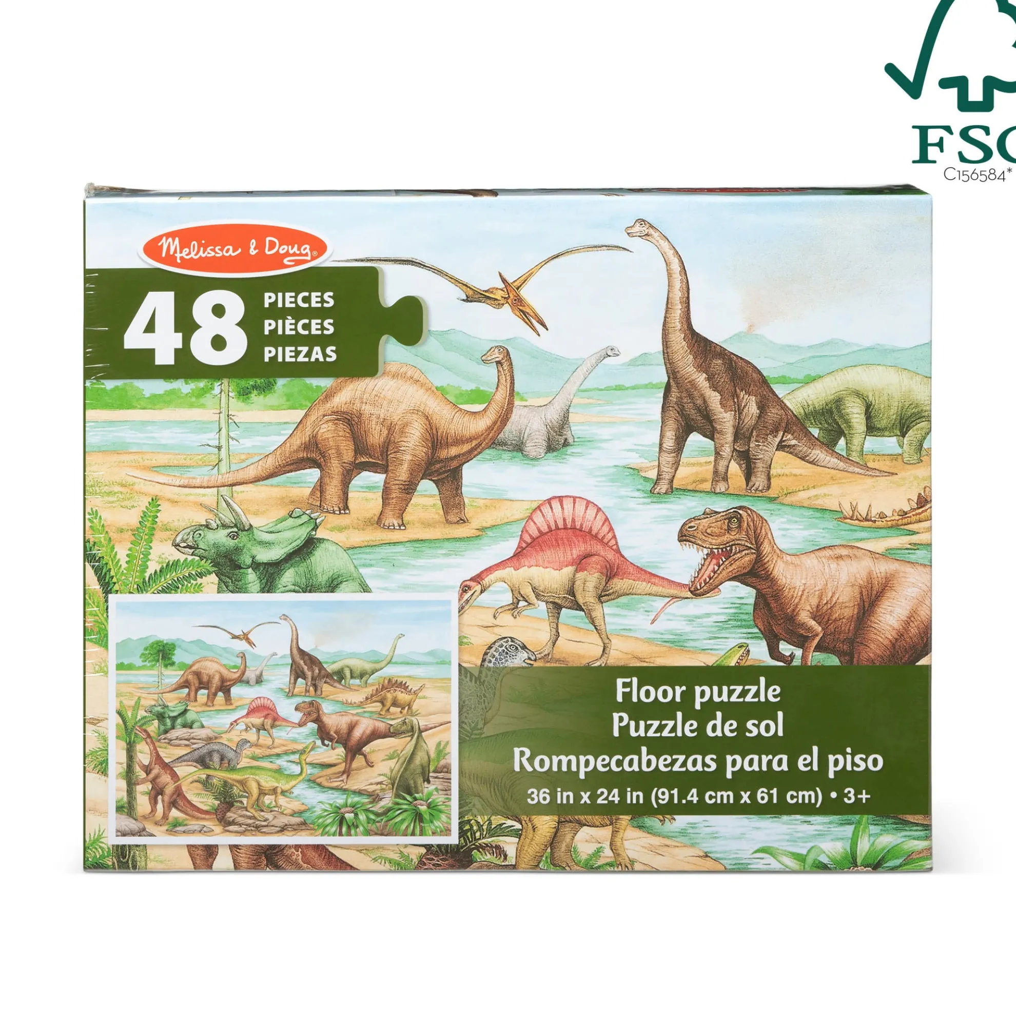 Kids’ excitement and interest in dinosaurs will never go extinct! This jumbo Dinosaurs Floor Puzzle features beautiful original artwork that depicts a scene from prehistoric times. It includes images of kids’ favorite dinosaurs including a spiny stegosaurus, a flying pterodactyl, and a mighty t-Rex. The floor puzzle measures an impressive three feet x two feet when it’s assembled, and the 48 extra-thick cardboard pieces feature an easy-to-clean surface to keep this exciting floor puzzle looking like new. Playing with puzzles is a great way for kids to explore their creativity while developing their cognitive, physical, and emotional skills. When children work on puzzles, they are fine-tuning their gross motor skills, improving their hand-eye coordination, strengthening their problem-solving skills, and beginning to develop logic and critical thinking processes. This Melissa & Doug Dinosaurs Floor Puzzle makes an exceptional gift for preschoolers and kids ages three and older for hands-on, screen-free play. This product is certified by the Forest Stewardship Council. FSC certification ensures that products come from responsibly managed forests that provide environmental, social, and economic benefits, and that forests are protected for future generations. Please note that FSC certification applies to new inventory only (FSC C156584).
