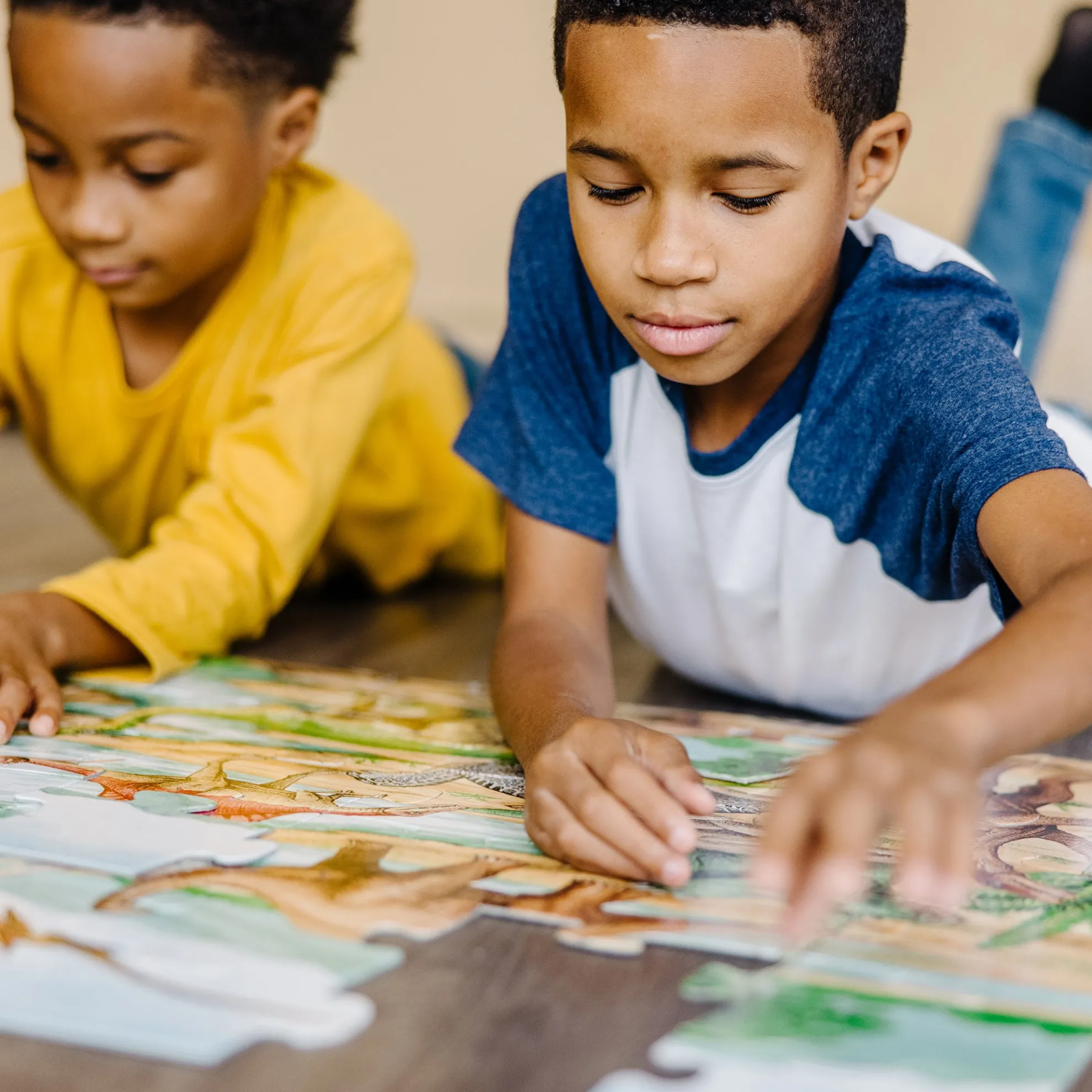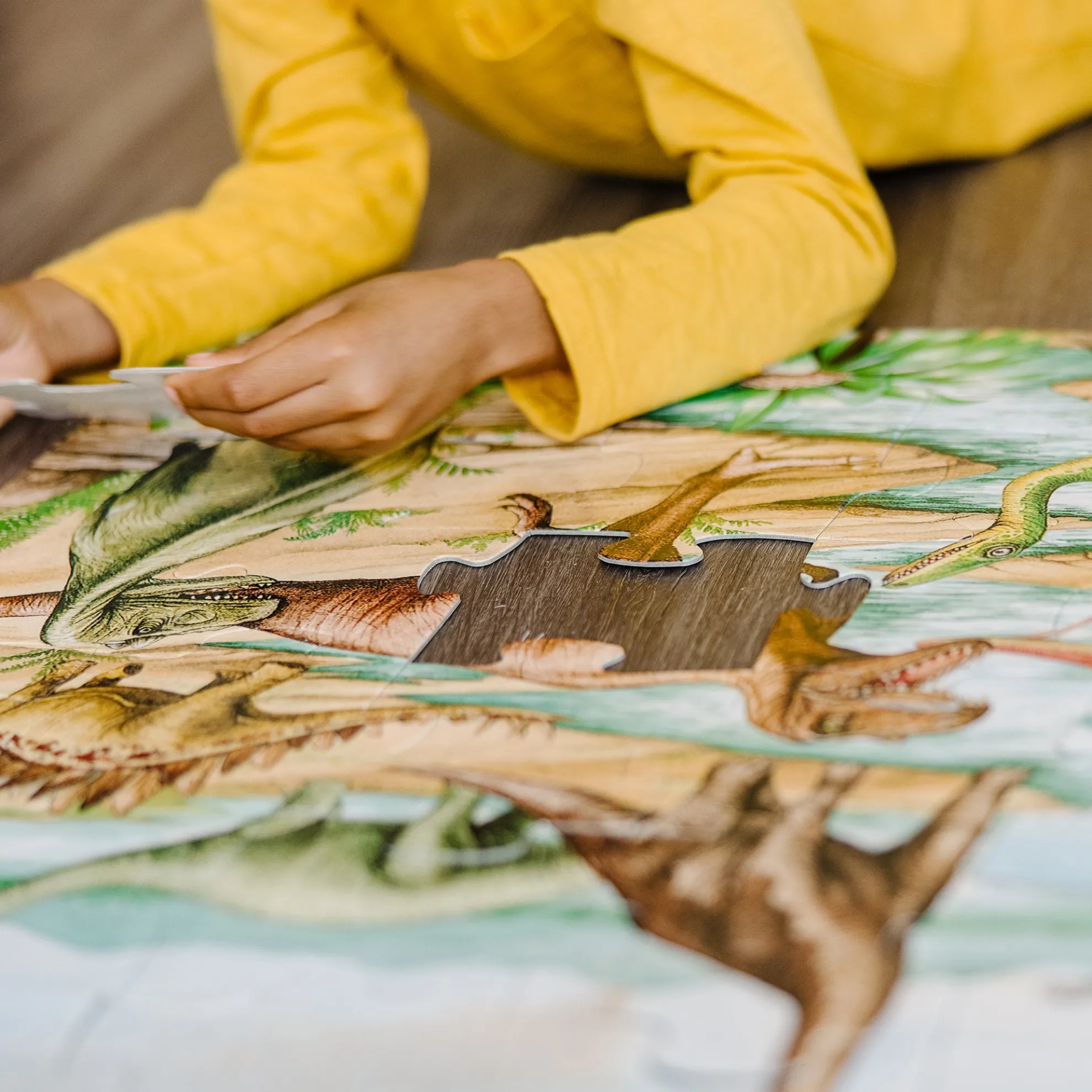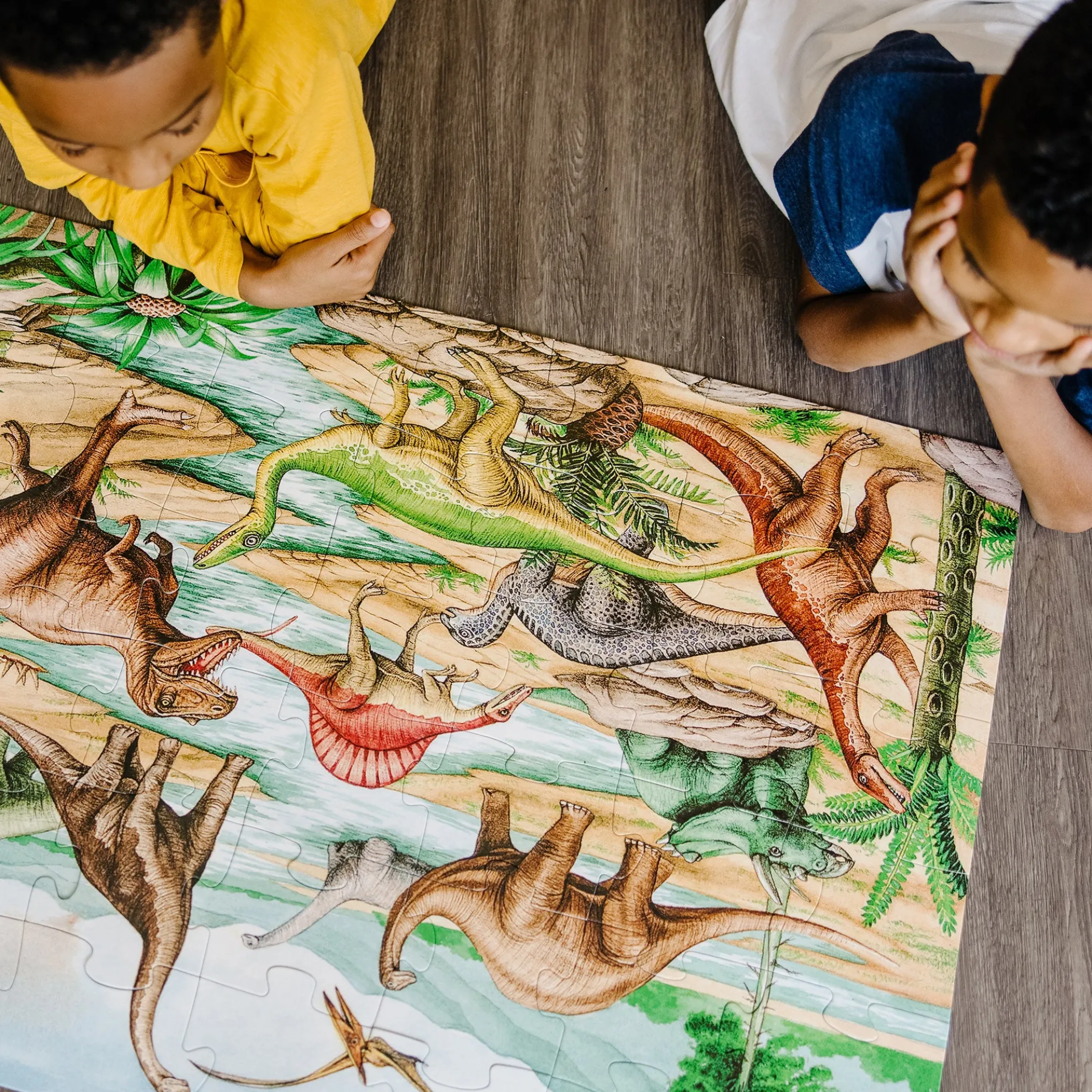 Kids’ excitement and interest in dinosaurs will never go extinct! This jumbo Dinosaurs Floor Puzzle features beautiful original artwork that depicts a scene from prehistoric times. It includes images of kids’ favorite dinosaurs including a spiny stegosaurus, a flying pterodactyl, and a mighty t-Rex. The floor puzzle measures an impressive three feet x two feet when it’s assembled, and the 48 extra-thick cardboard pieces feature an easy-to-clean surface to keep this exciting floor puzzle looking like new. Playing with puzzles is a great way for kids to explore their creativity while developing their cognitive, physical, and emotional skills. When children work on puzzles, they are fine-tuning their gross motor skills, improving their hand-eye coordination, strengthening their problem-solving skills, and beginning to develop logic and critical thinking processes. This Melissa & Doug Dinosaurs Floor Puzzle makes an exceptional gift for preschoolers and kids ages three and older for hands-on, screen-free play. This product is certified by the Forest Stewardship Council. FSC certification ensures that products come from responsibly managed forests that provide environmental, social, and economic benefits, and that forests are protected for future generations. Please note that FSC certification applies to new inventory only (FSC C156584).