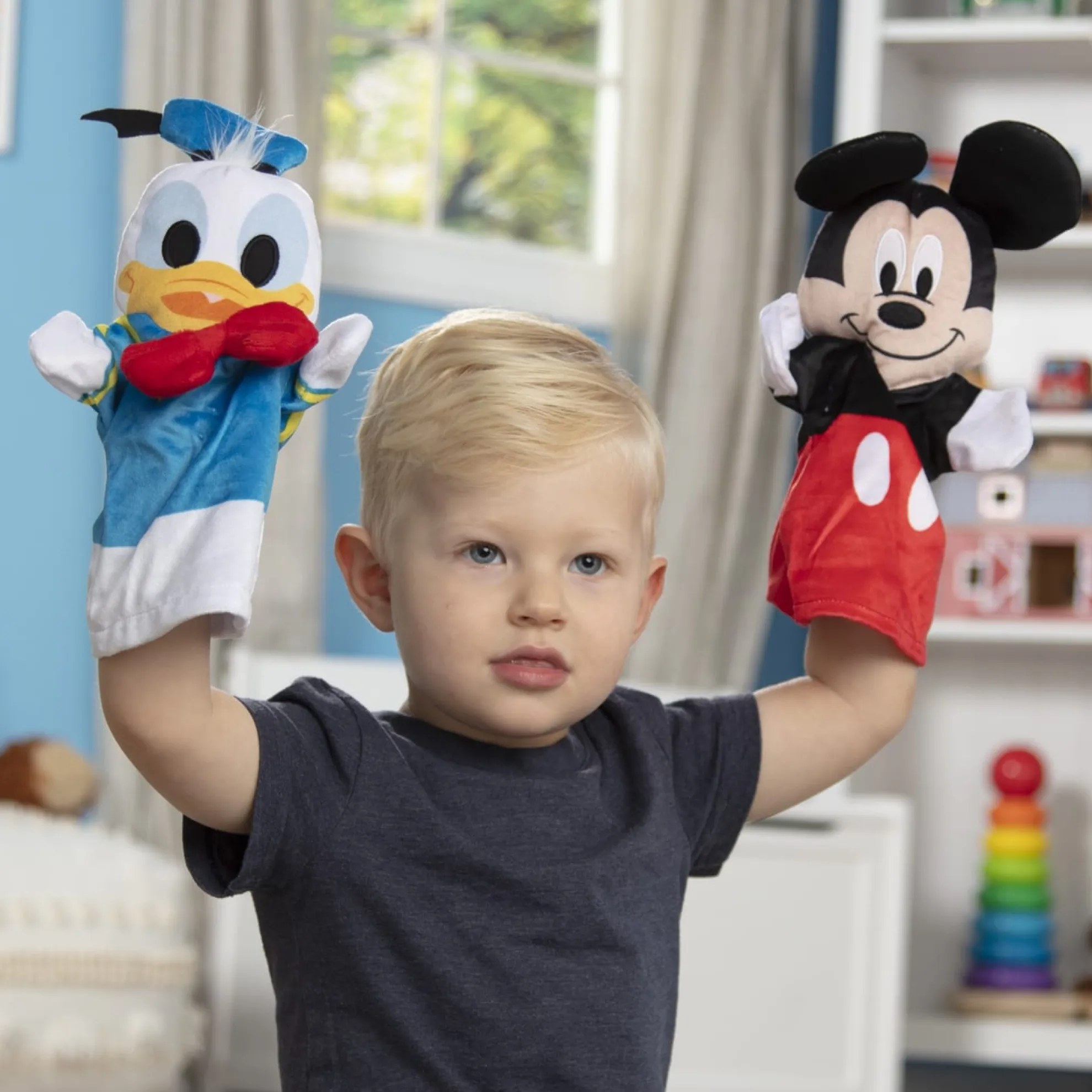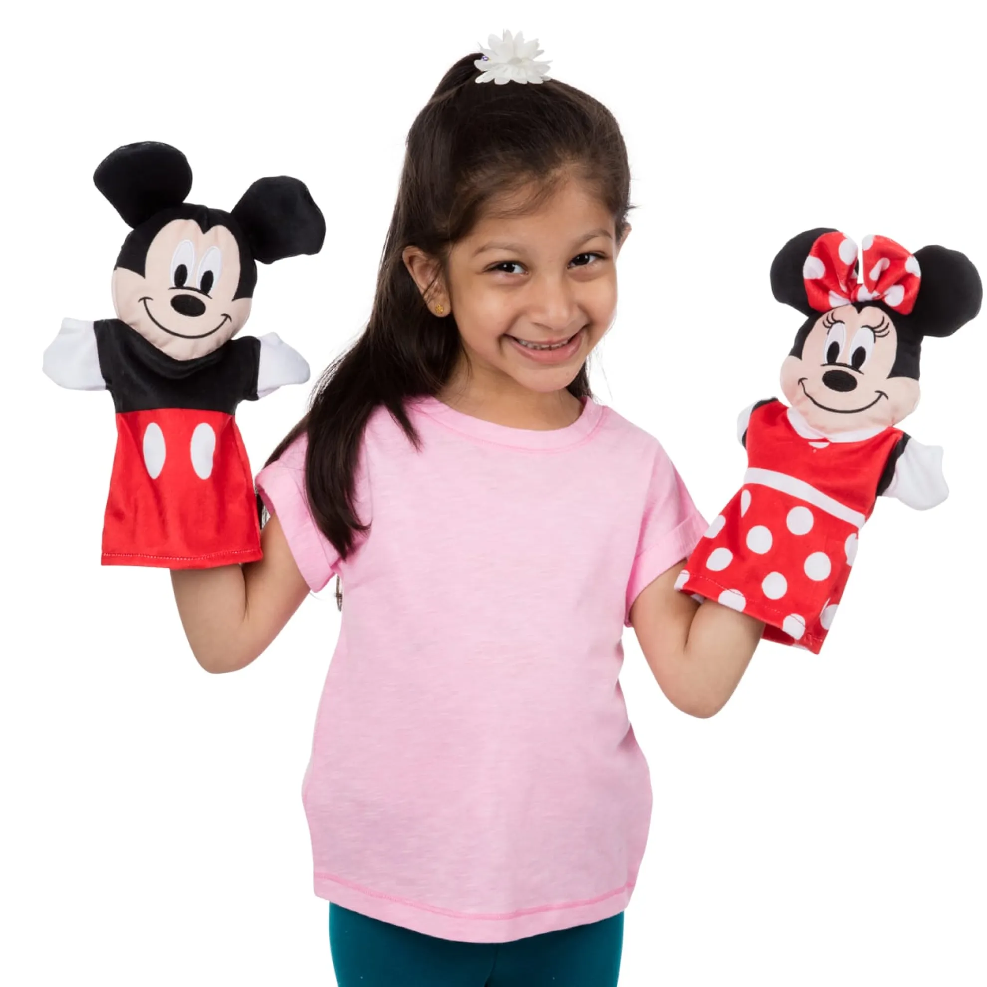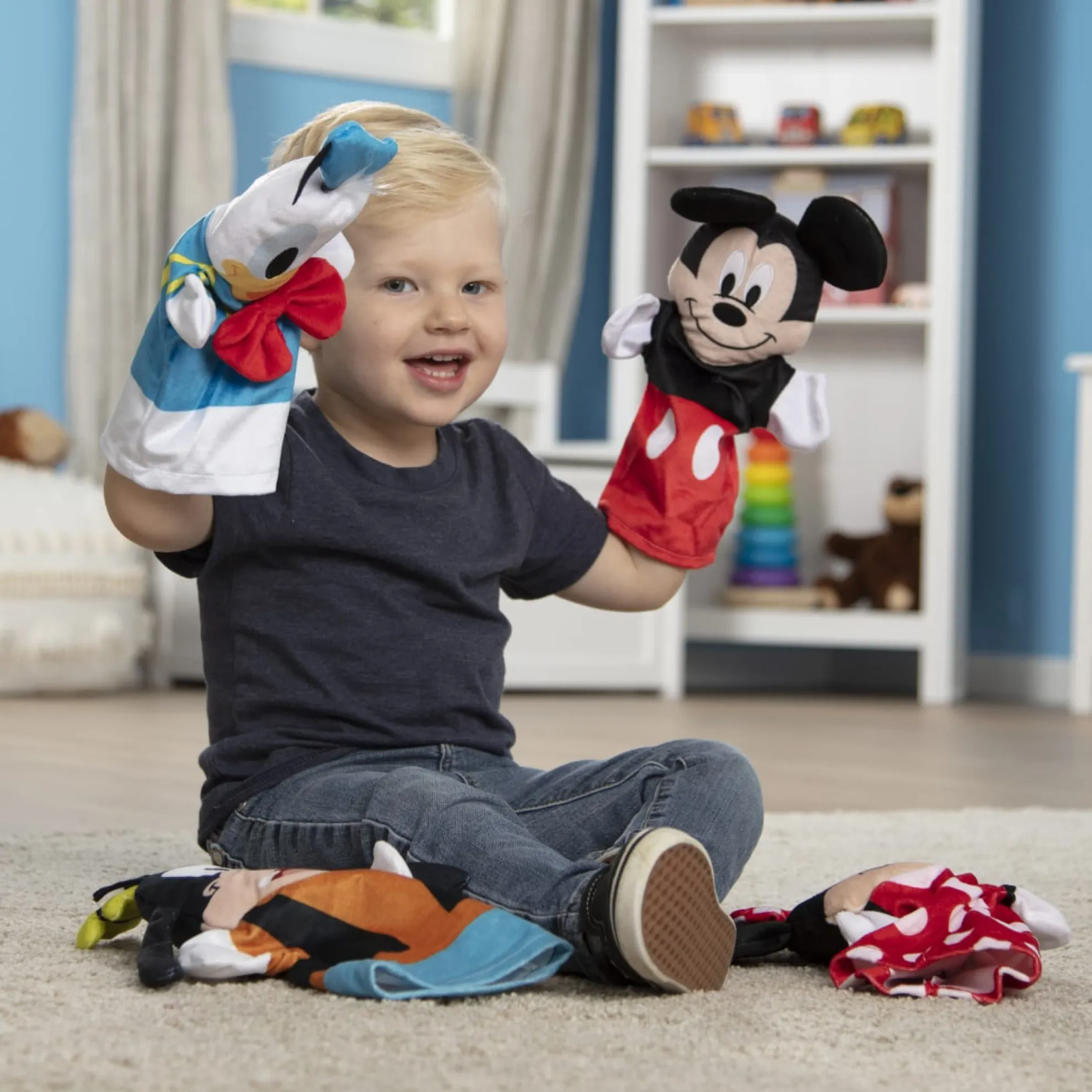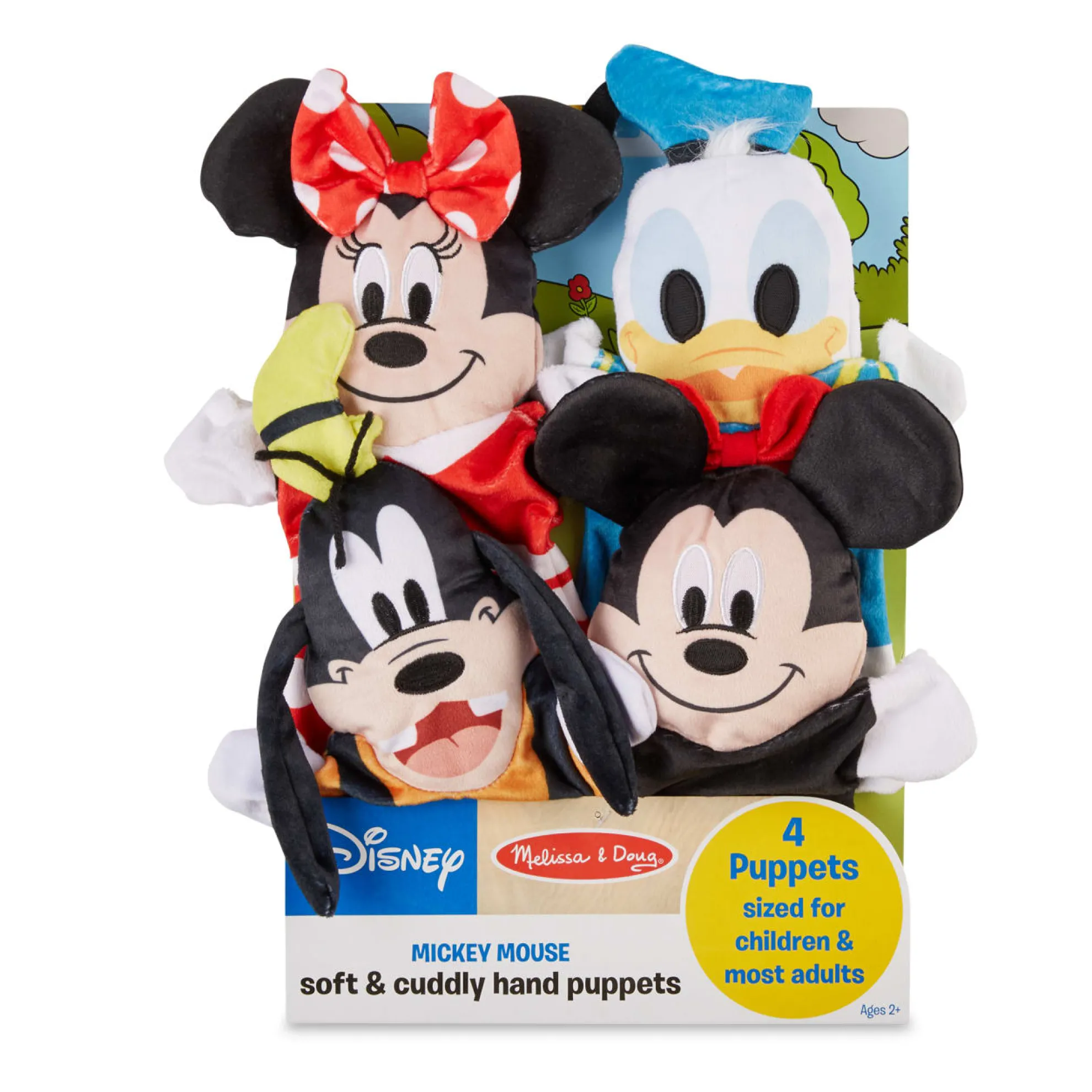 Enjoy hands-on fun with four favorite Disney characters (Mickey, Minnie, Donald, and Goofy), using these super-soft hand puppets! These approximately 10-inch hand puppets, sized to fit both young kids and adults, are a playful way to tell stories, build verbal and motor skills, engage in creativity, encourage self-confidence, and stimulate imagination. These puppets are great for at home or on the go. The washable fabric ensures these sweet hand puppets will provide years of play!