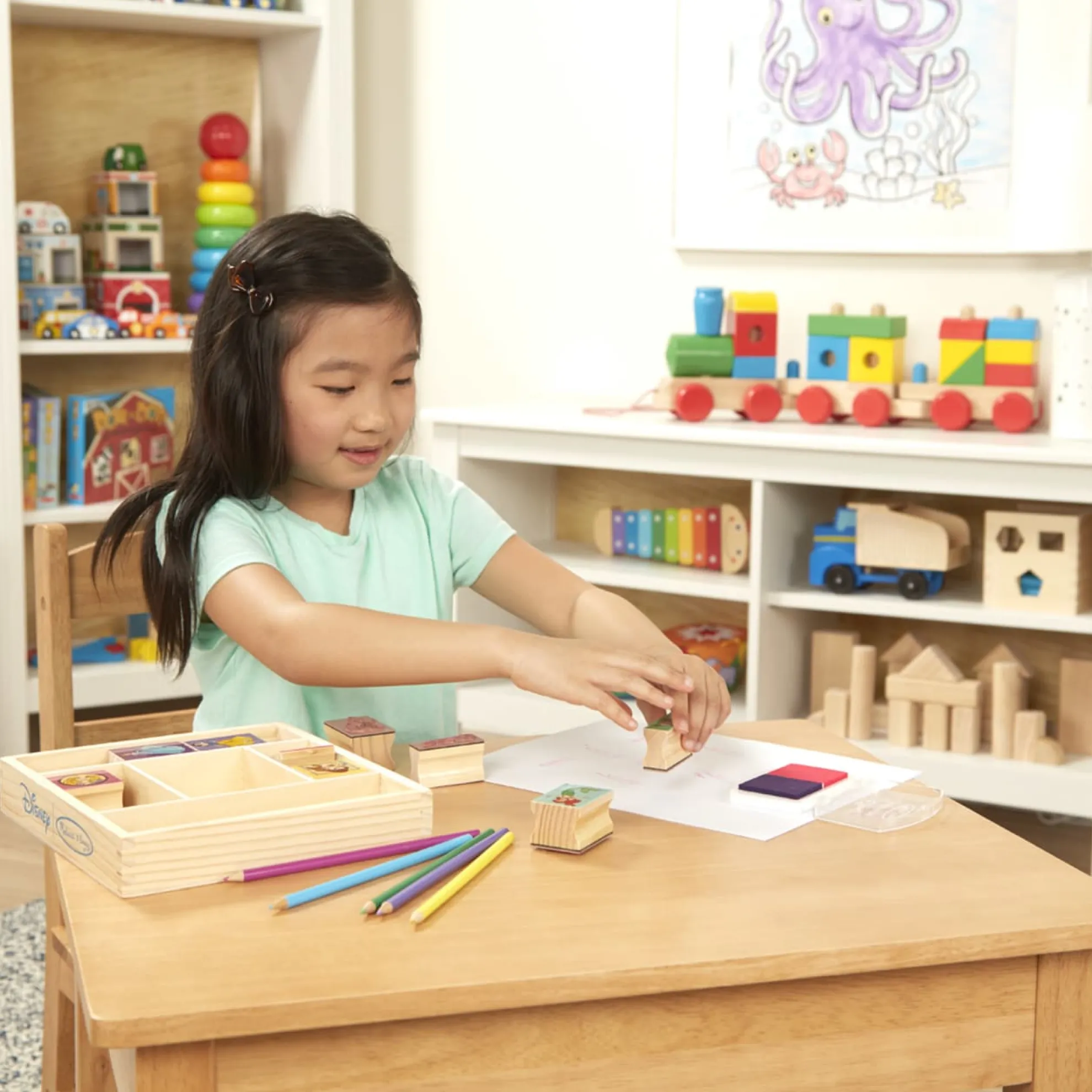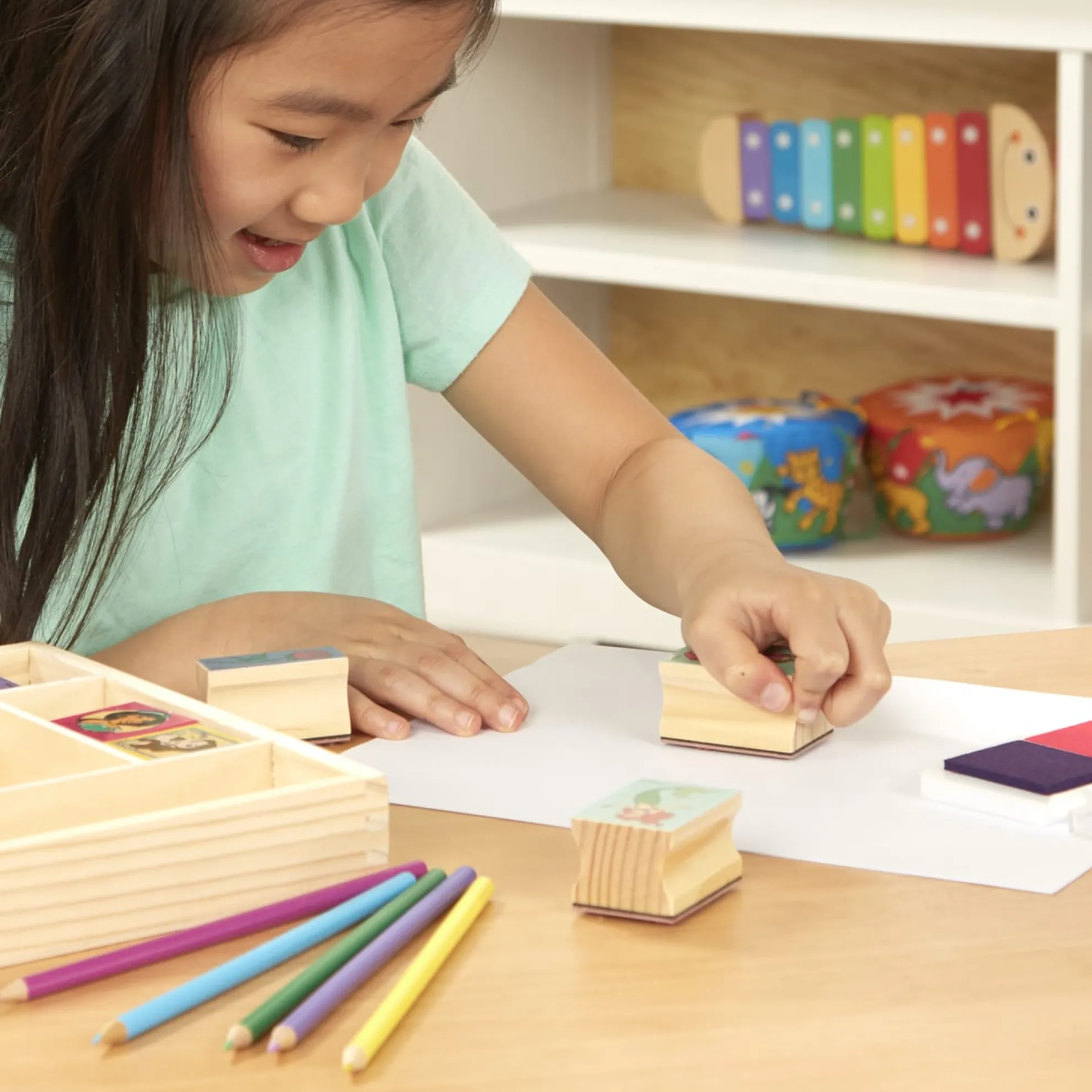 - Includes 9 wooden stamps, 5 colored pencils, and 2-color stamp pad
