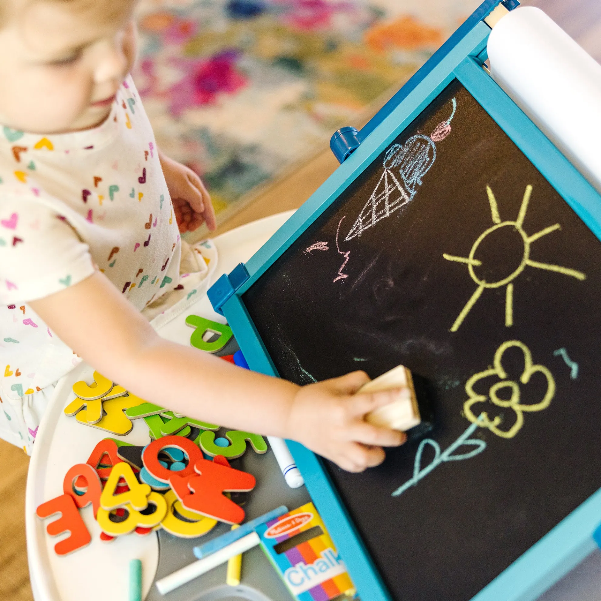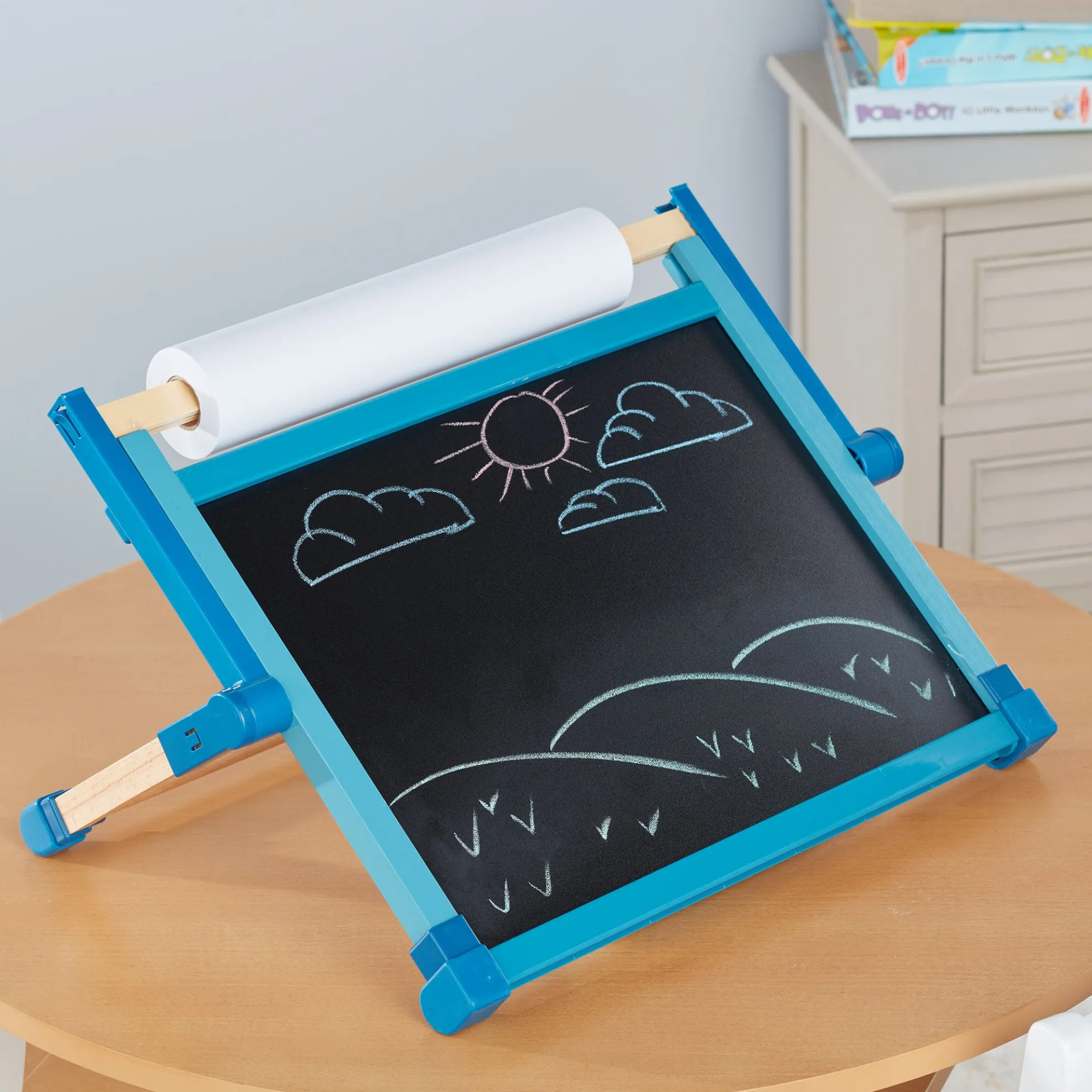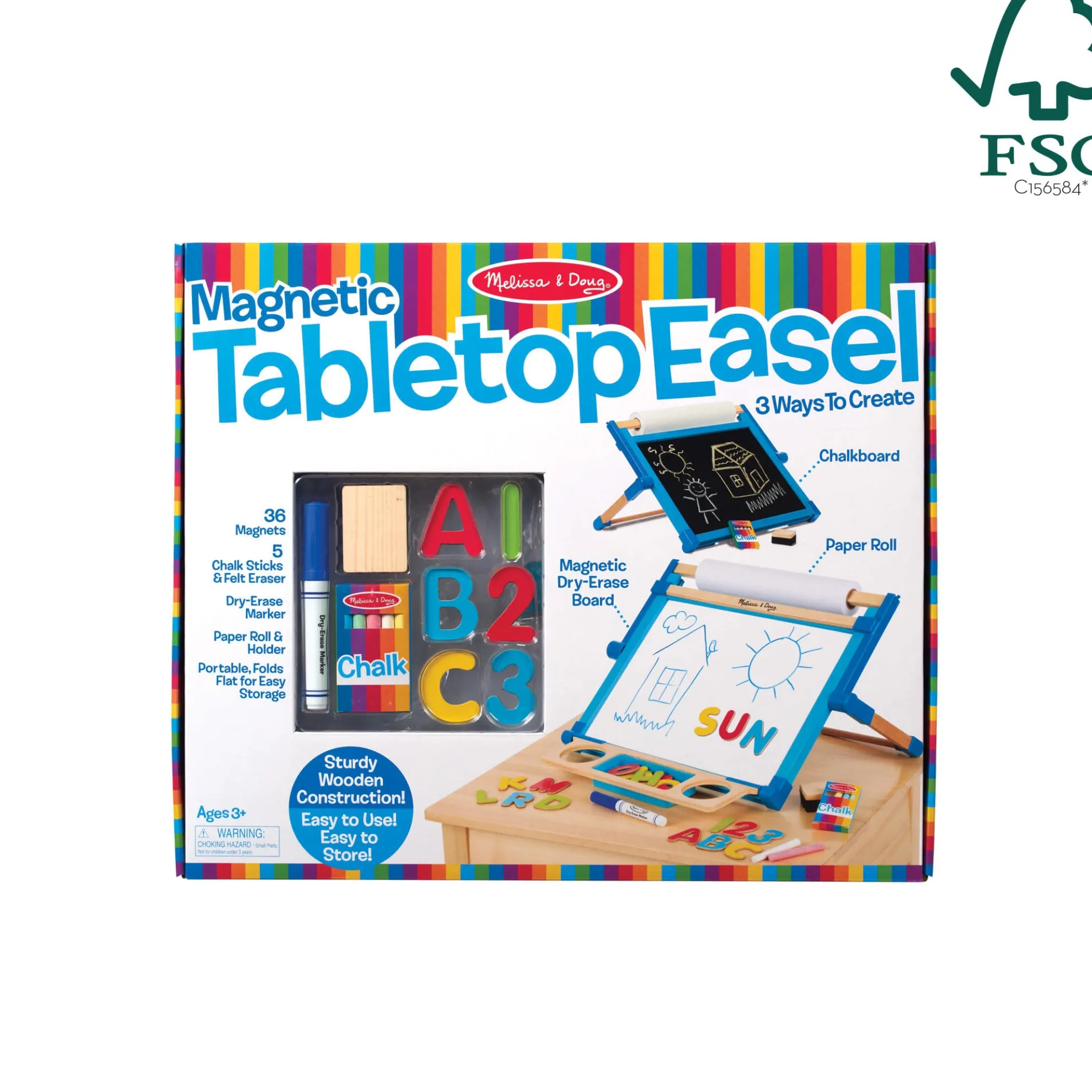 Inspire endless creativity with this double-sided tabletop easel, featuring a magnetic dry-erase board on one side, and a chalkboard on the other. The included paper-roll holder with a paper guide and tear-bar accommodates 12-inch paper rolls and adds even more ways to create masterpieces! The deluxe set comes with a dry-erase marker and felt eraser, five colored chalk sticks, a 50-foot-long paper roll, 36 letter and number magnets, and an art supply tray. The sturdy wooden easel folds flat for handy storage. This product is certified by the Forest Stewardship Council. FSC certification ensures that products come from responsibly managed forests that provide environmental, social, and economic benefits, and that forests are protected for future generations. Please note that FSC certification applies to new inventory only (FSC C156584).