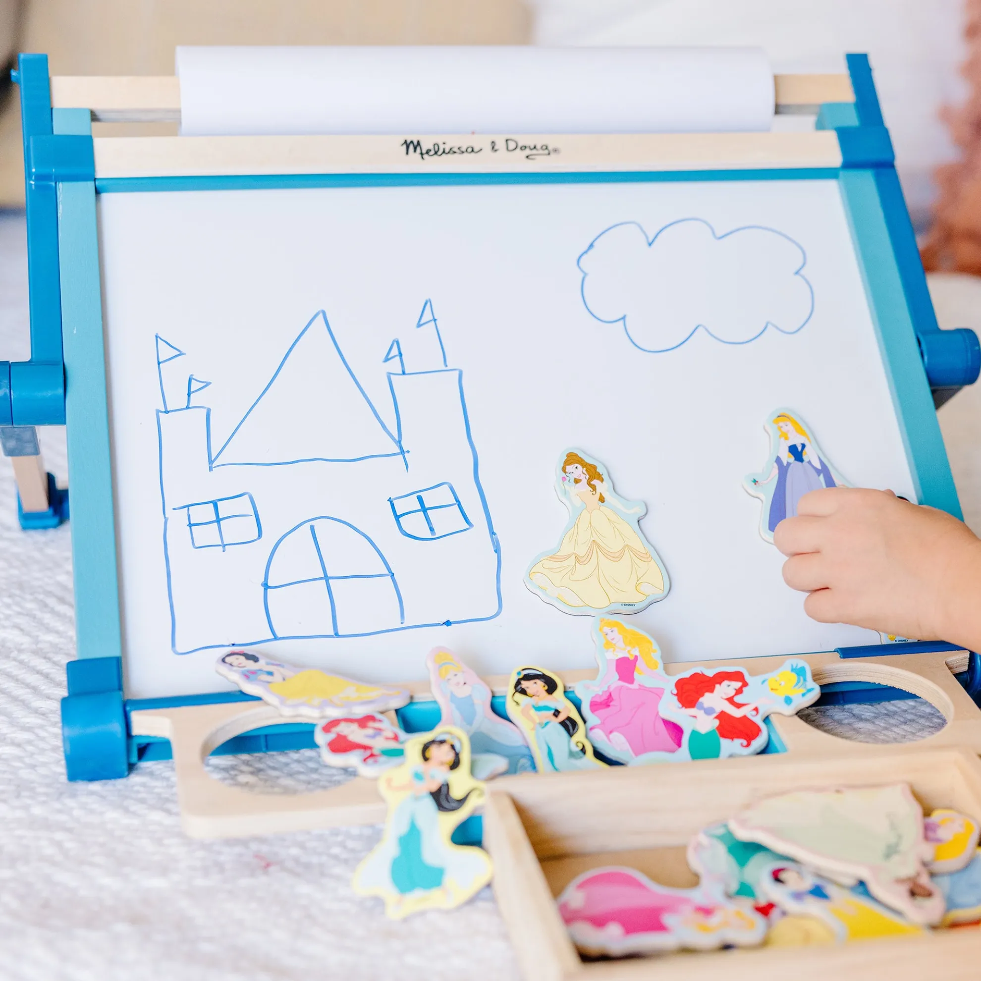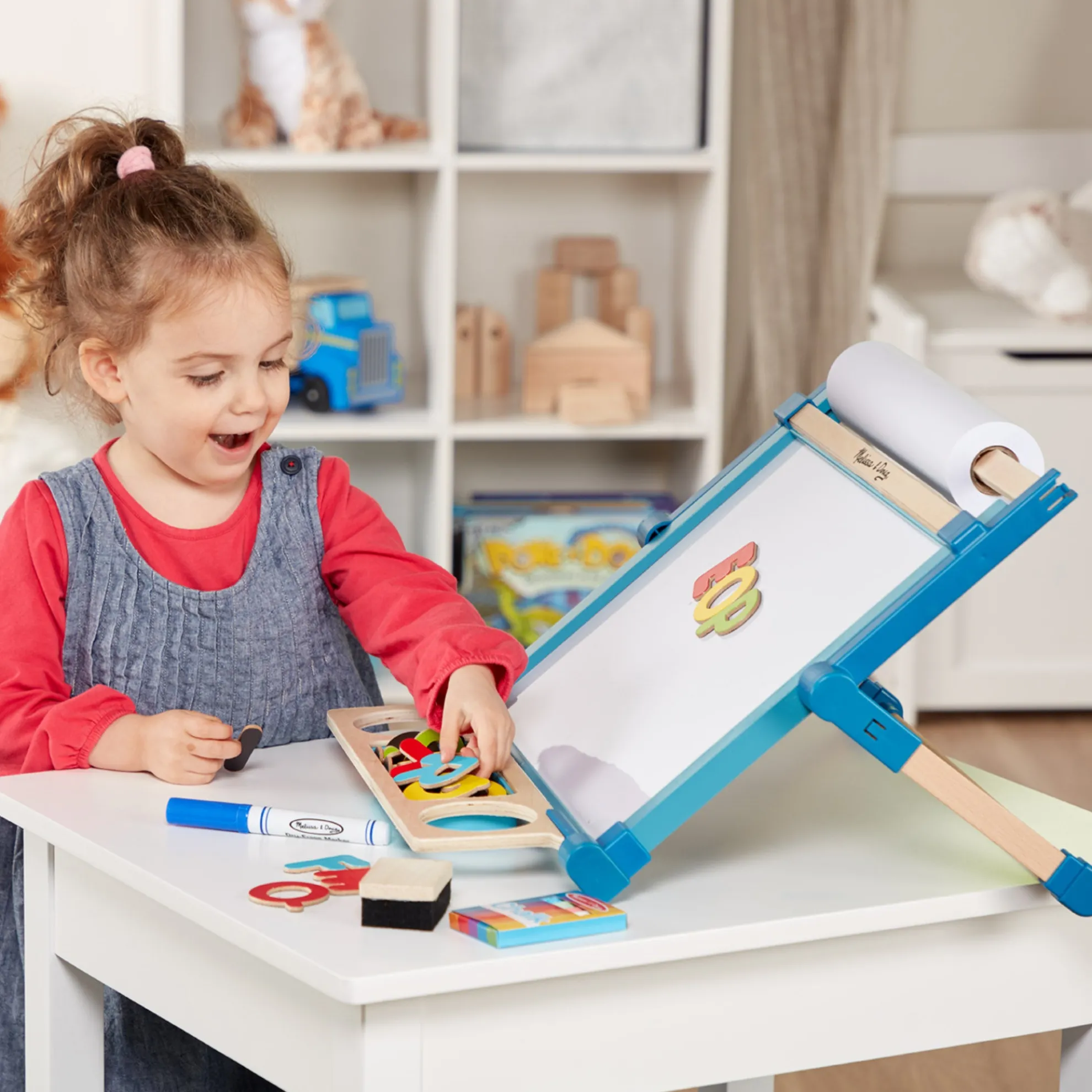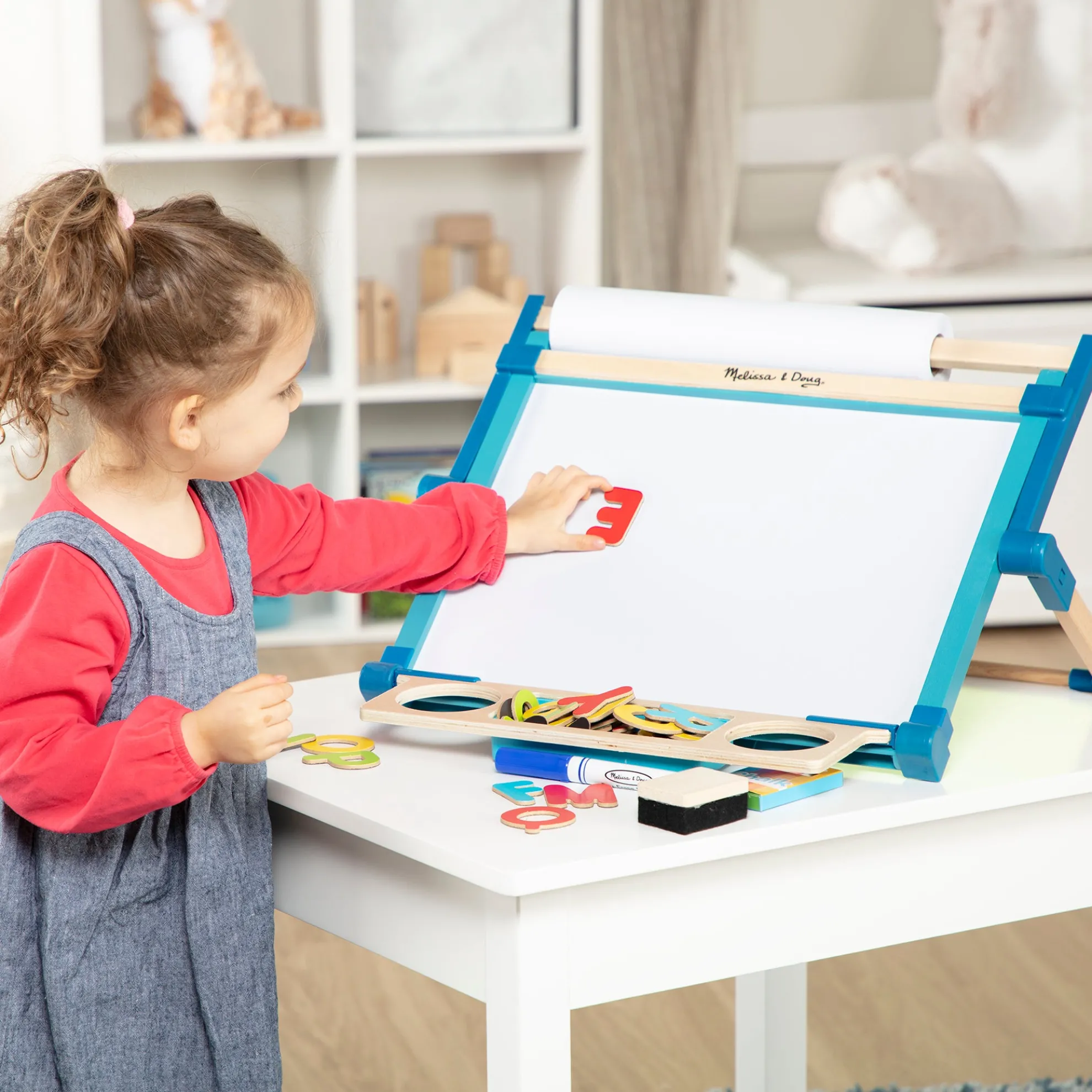 Inspire endless creativity with this double-sided tabletop easel, featuring a magnetic dry-erase board on one side, and a chalkboard on the other. The included paper-roll holder with a paper guide and tear-bar accommodates 12-inch paper rolls and adds even more ways to create masterpieces! The deluxe set comes with a dry-erase marker and felt eraser, five colored chalk sticks, a 50-foot-long paper roll, 36 letter and number magnets, and an art supply tray. The sturdy wooden easel folds flat for handy storage. This product is certified by the Forest Stewardship Council. FSC certification ensures that products come from responsibly managed forests that provide environmental, social, and economic benefits, and that forests are protected for future generations. Please note that FSC certification applies to new inventory only (FSC C156584).