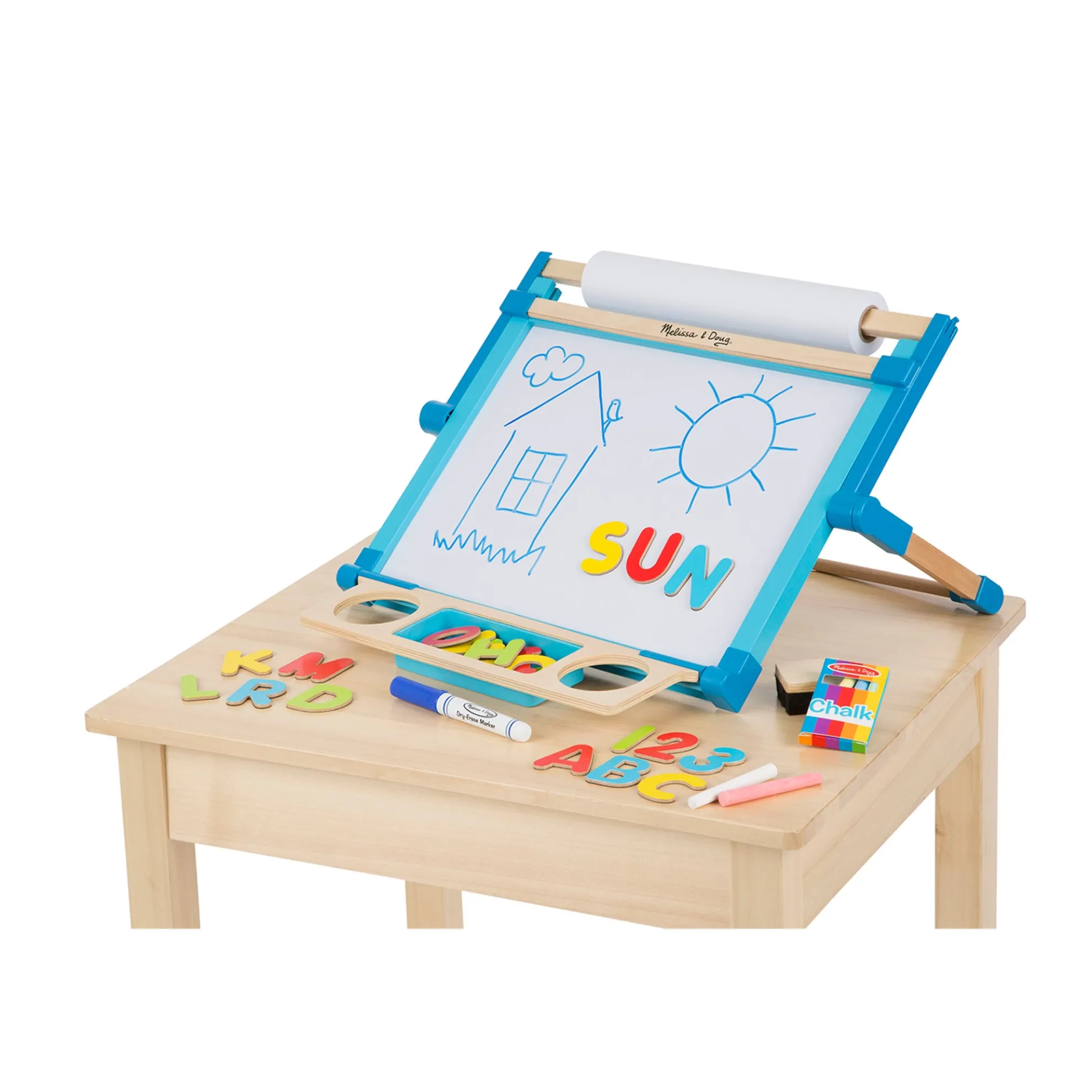 - Sturdy wooden double-sided tabletop art easel that folds flat to store