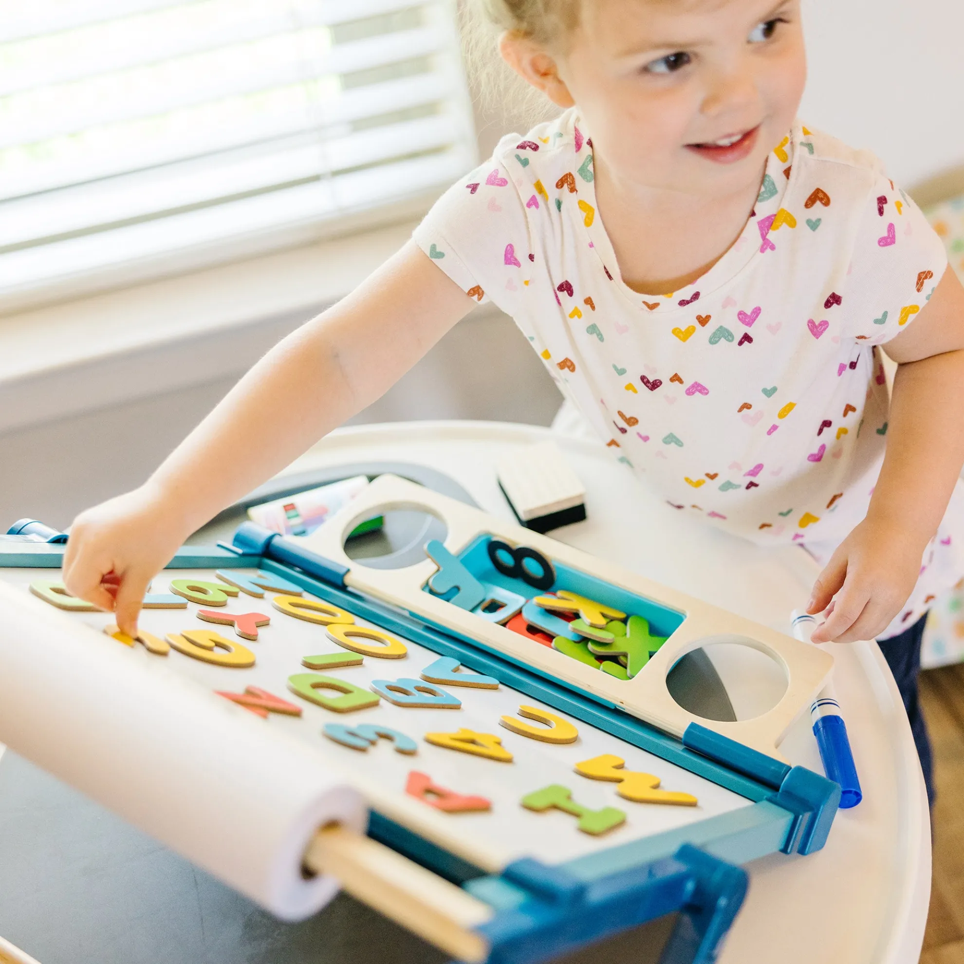 - Includes 50-foot long paper roll, dry-erase marker, 5 pieces of colored chalk, eraser, and 36 letter and number magnets