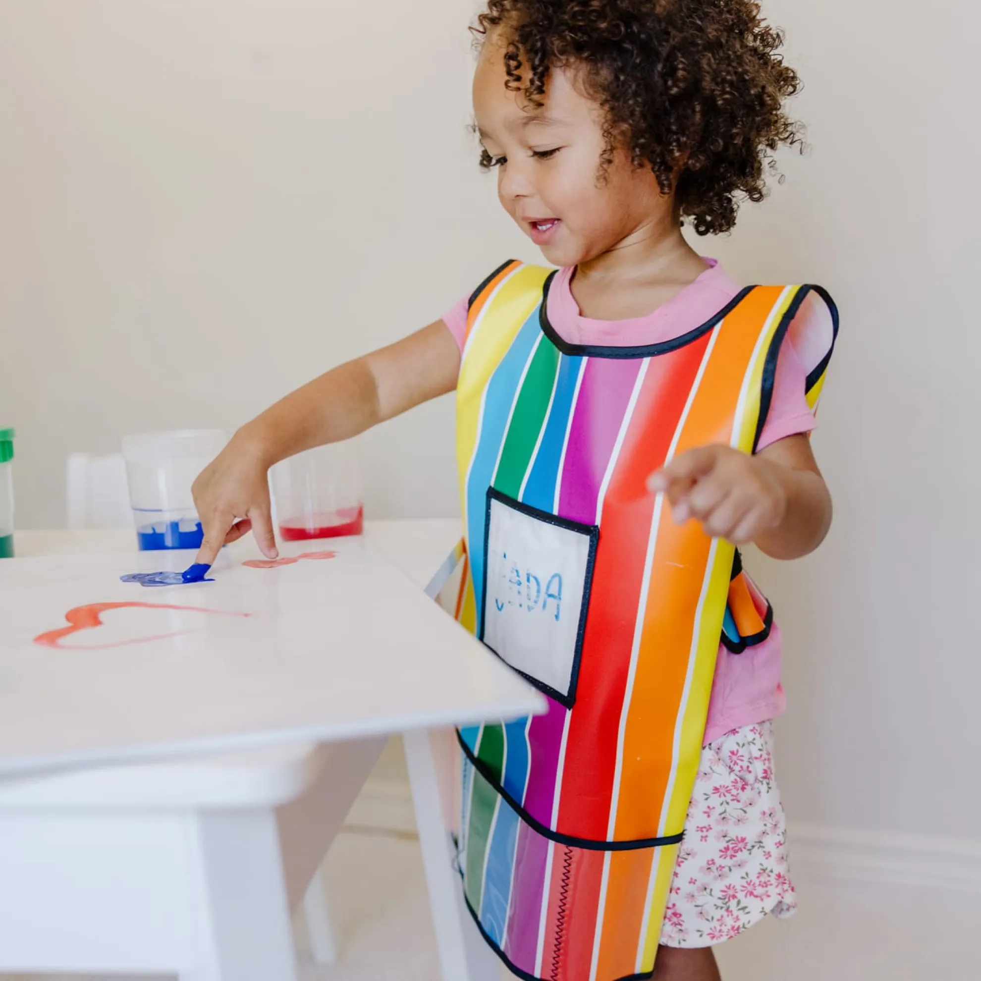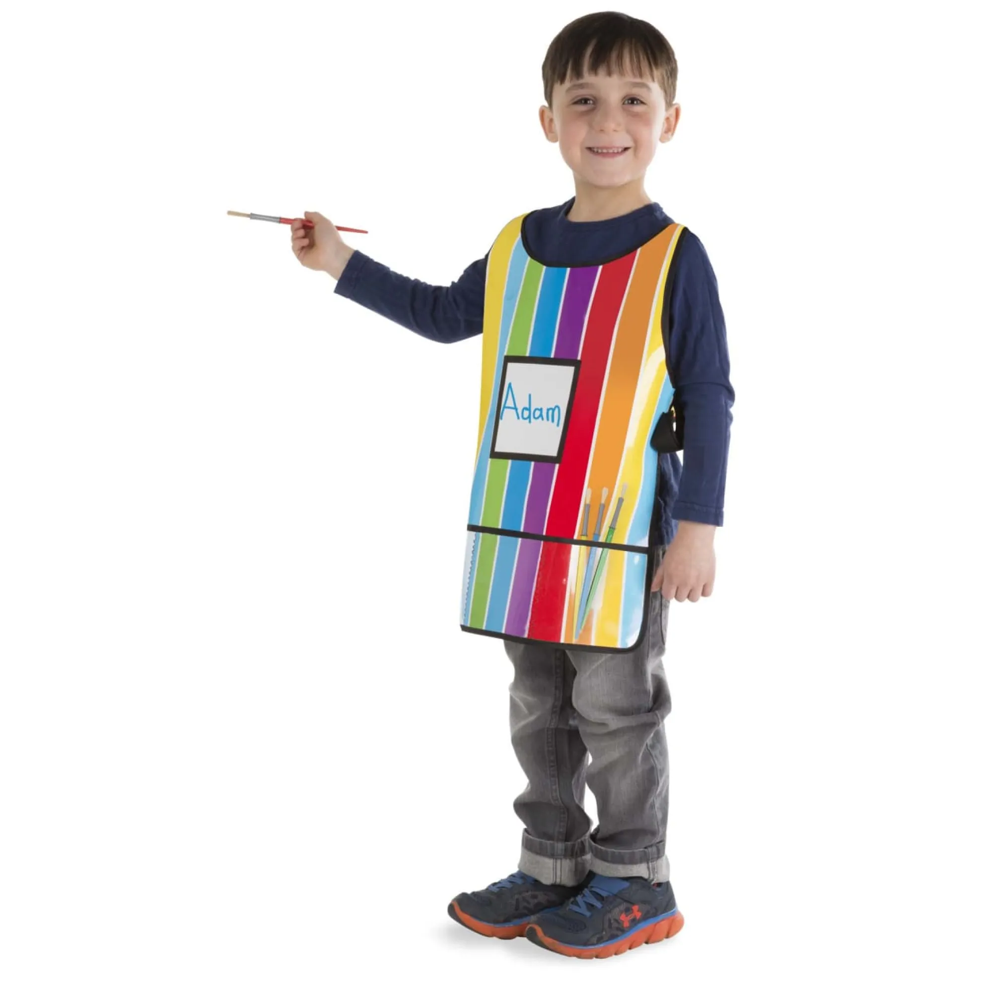 Creative kids can stay neat and clean in this durable art smock! Features a write-on chest pocket to personalize with dry-erase marker, an easy-clean apron surface and roomy storage pockets. Adjustable straps mean one size fits all!