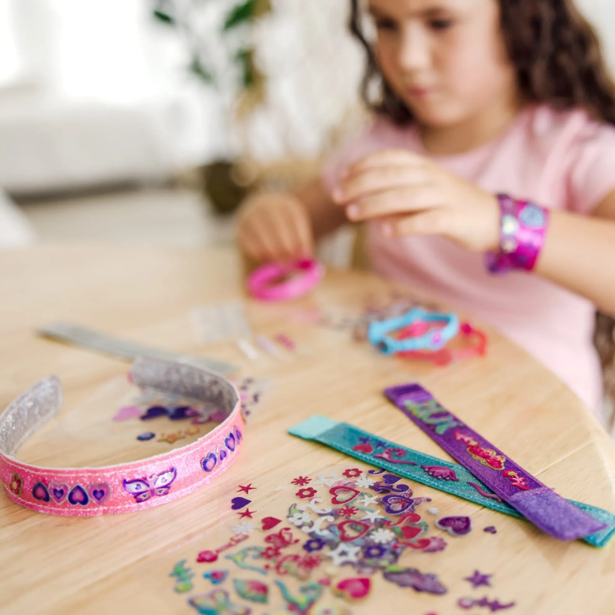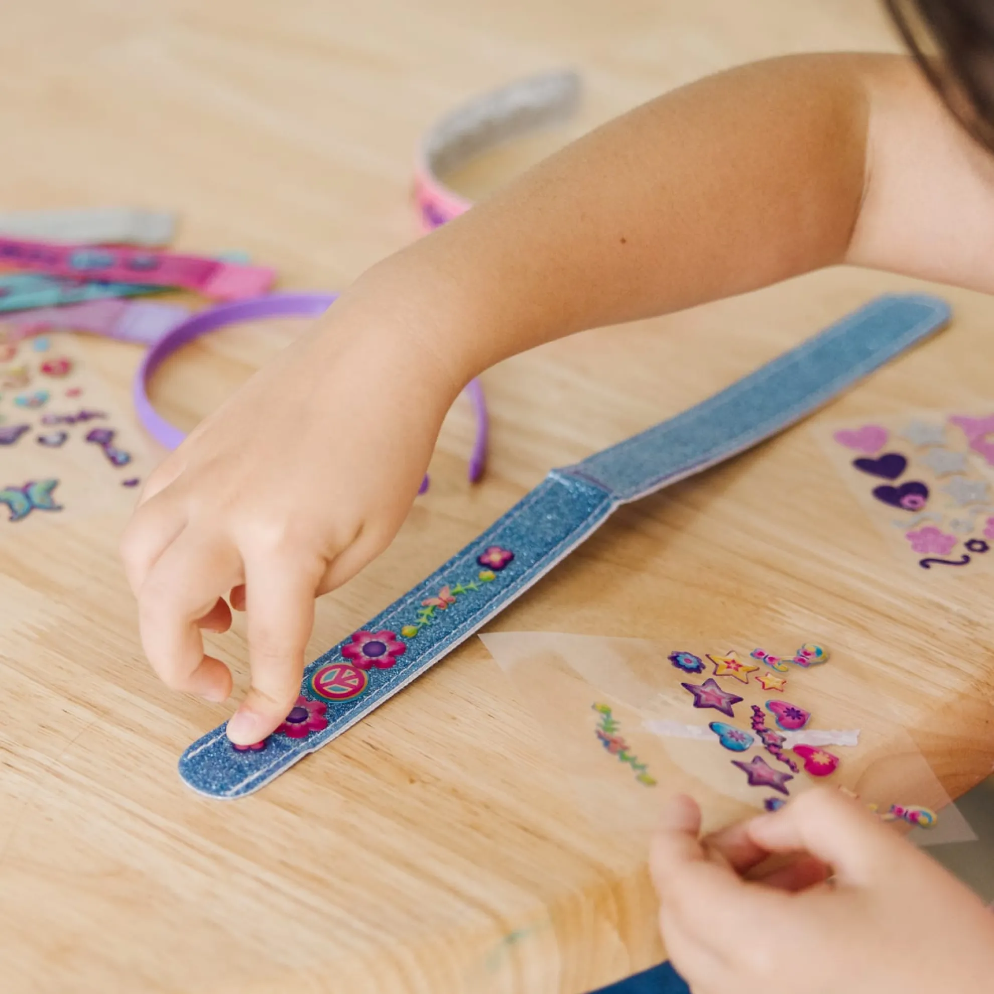 - Each kit contains sparkle-gem, glitter, and jewel peel-and-stick stickers to decorate the fashion accessories