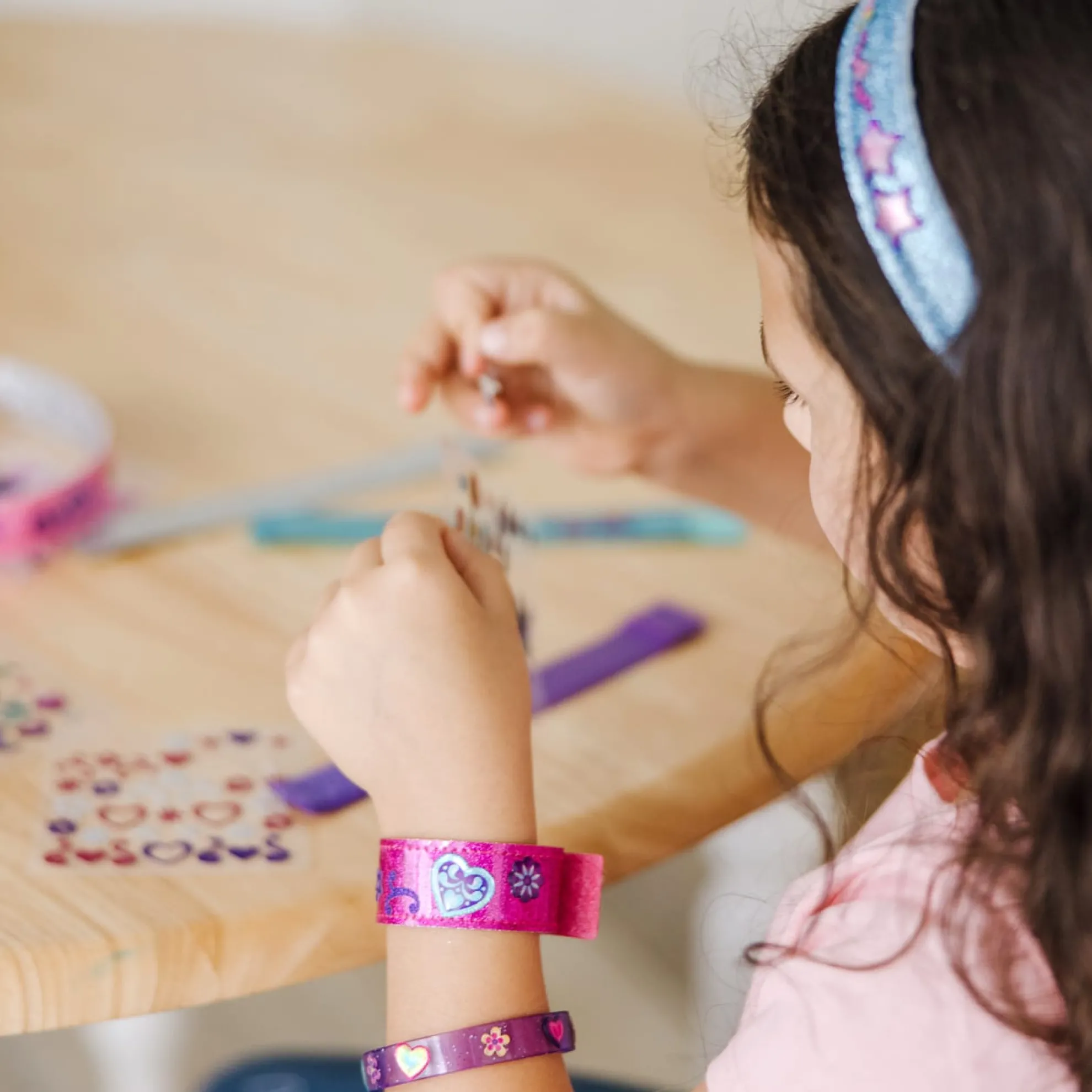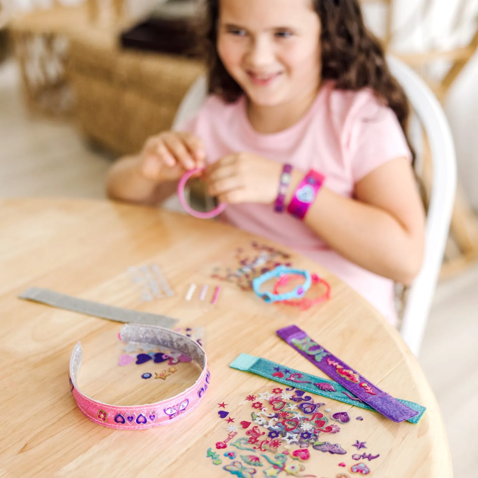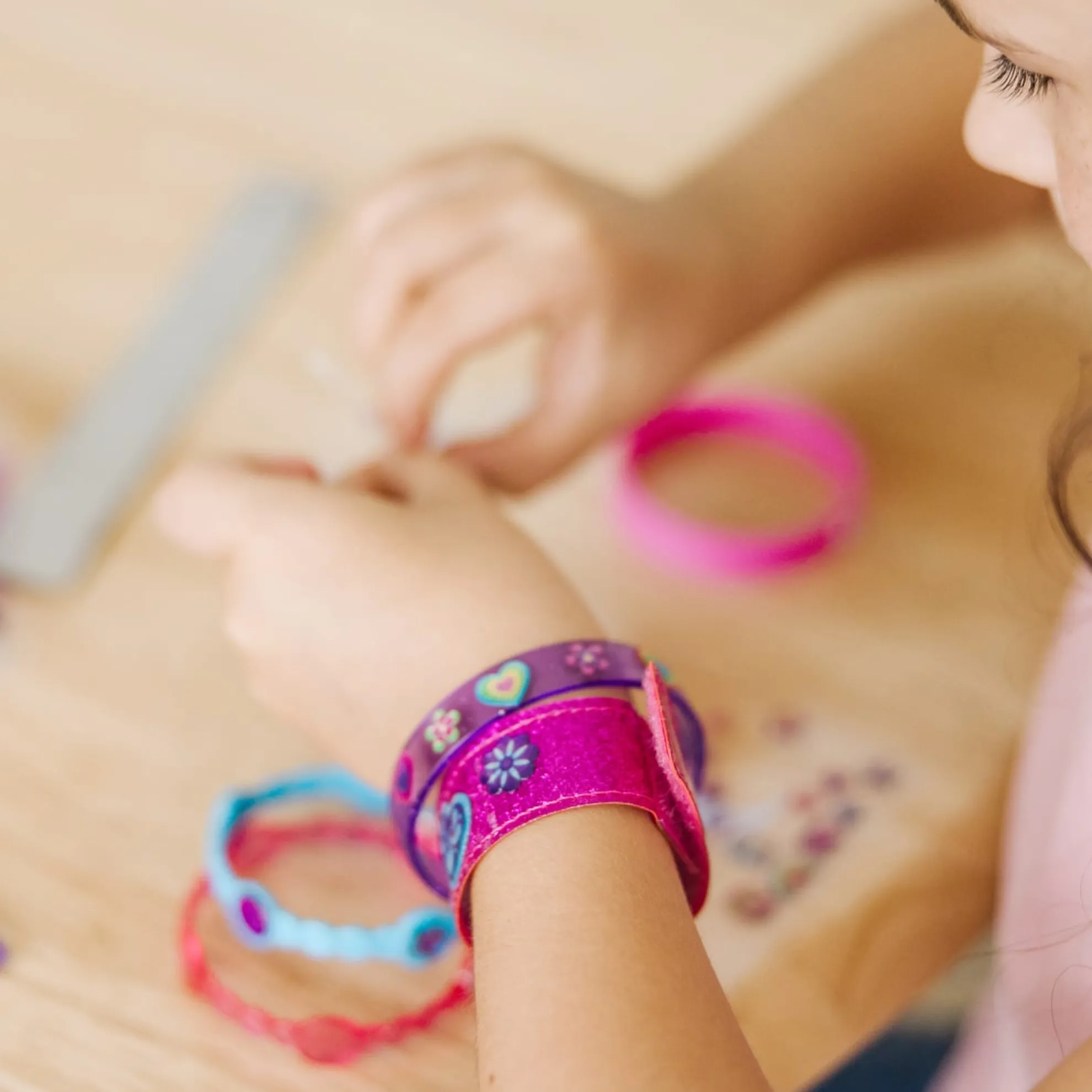 - Includes 4 bangle-style durable plastic bracelets, 4 soft reversible bracelets, and 2 reversible headbands to design and decorate