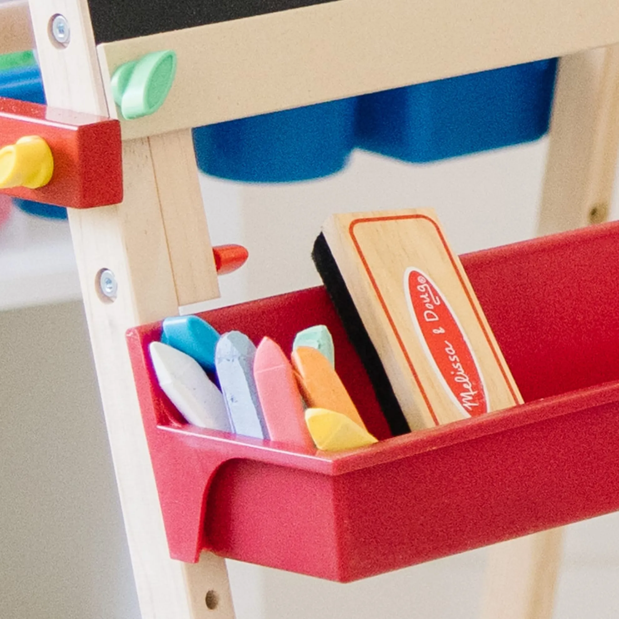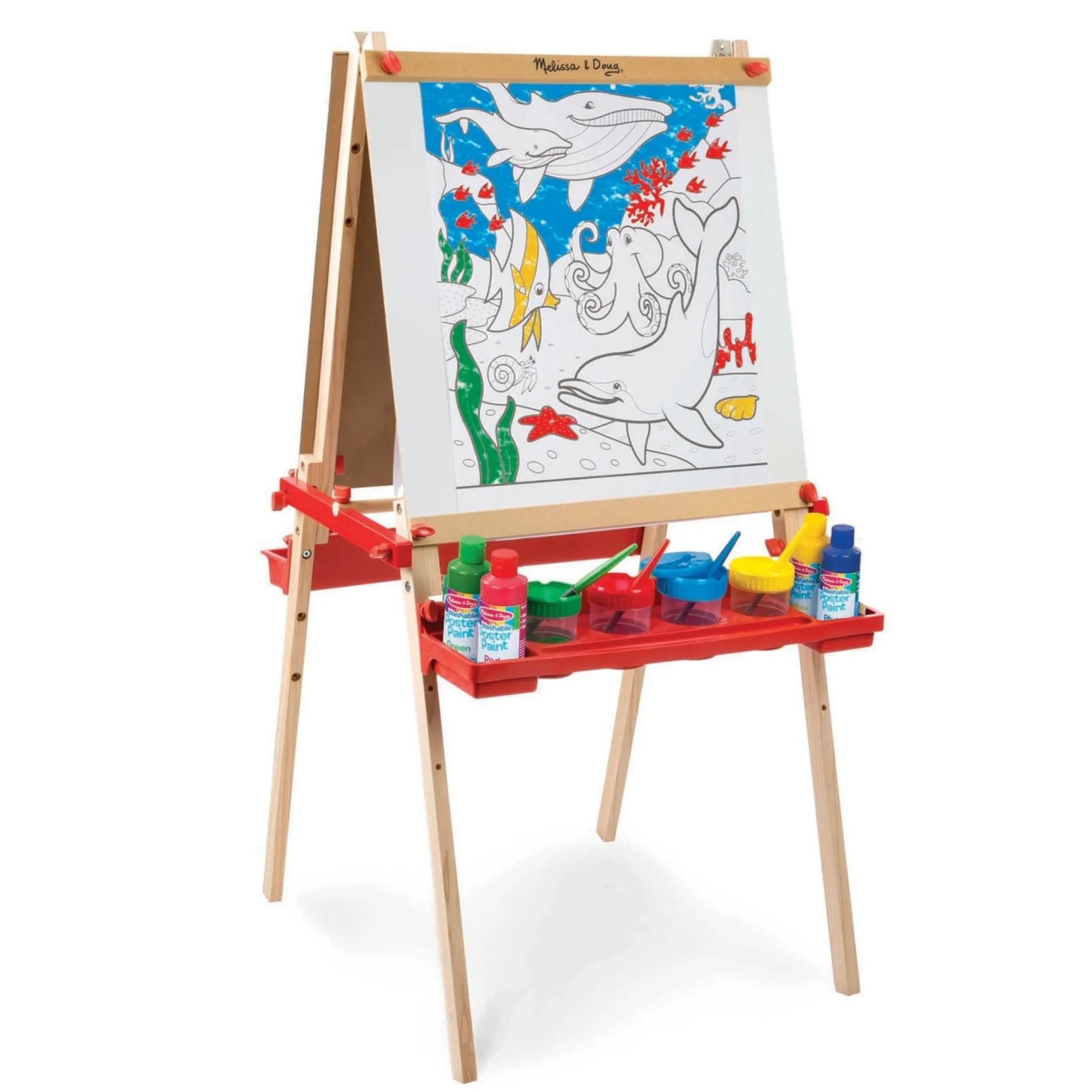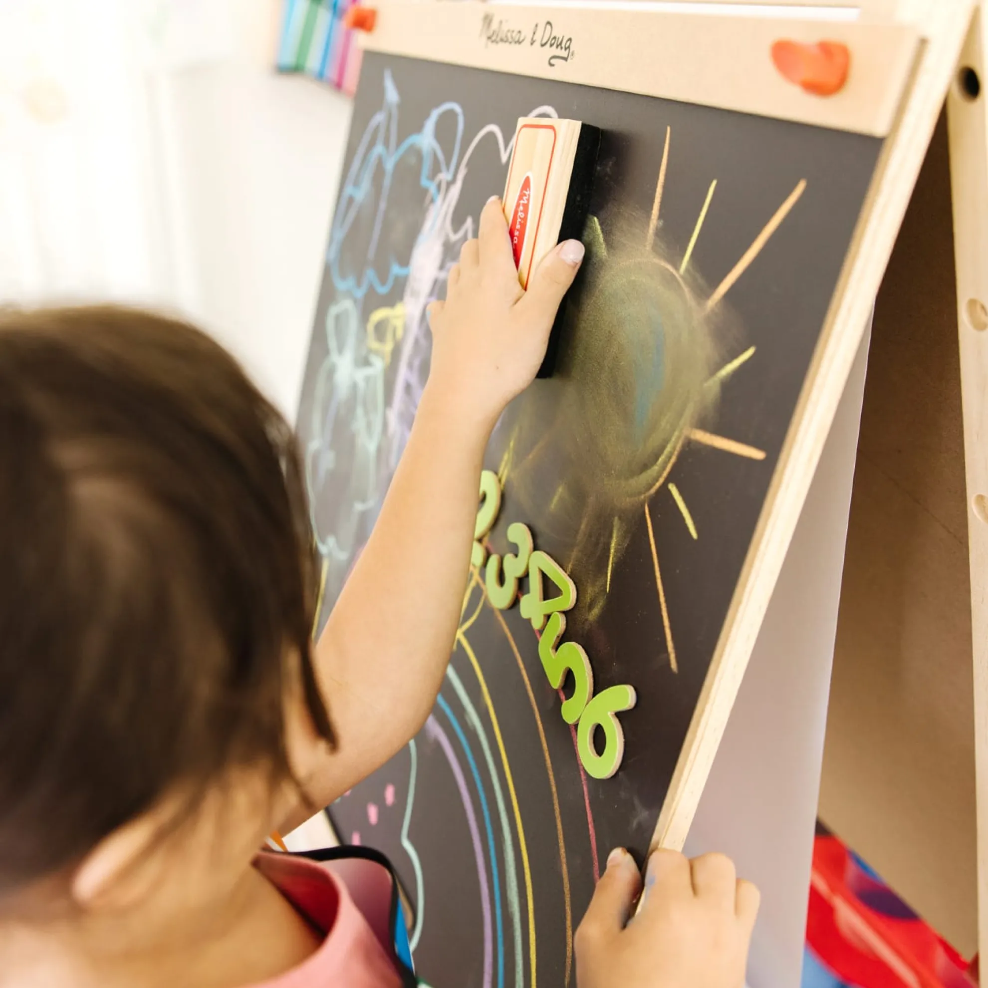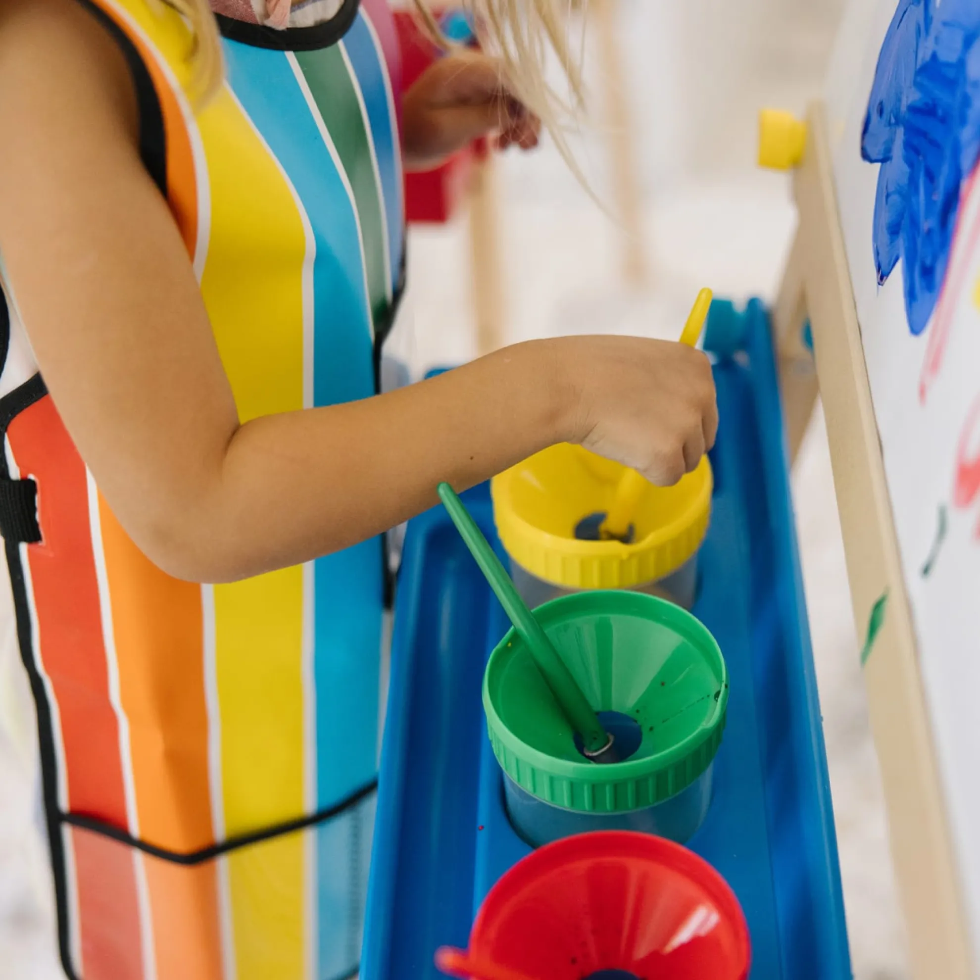 Everything your young artist needs when inspiration strikes: Four eight ounce bottles of vibrant poster paint (R/B/Y/G), four spill-proof paint cups, four medium sized brushes, an 18″ wide roll of easel paper, a 10-pack of jumbo rainbow chalk, an eraser and a dry erase marker. This generous set of kids’ art supplies is the perfect companion for our Standing Wooden Art Easel.
