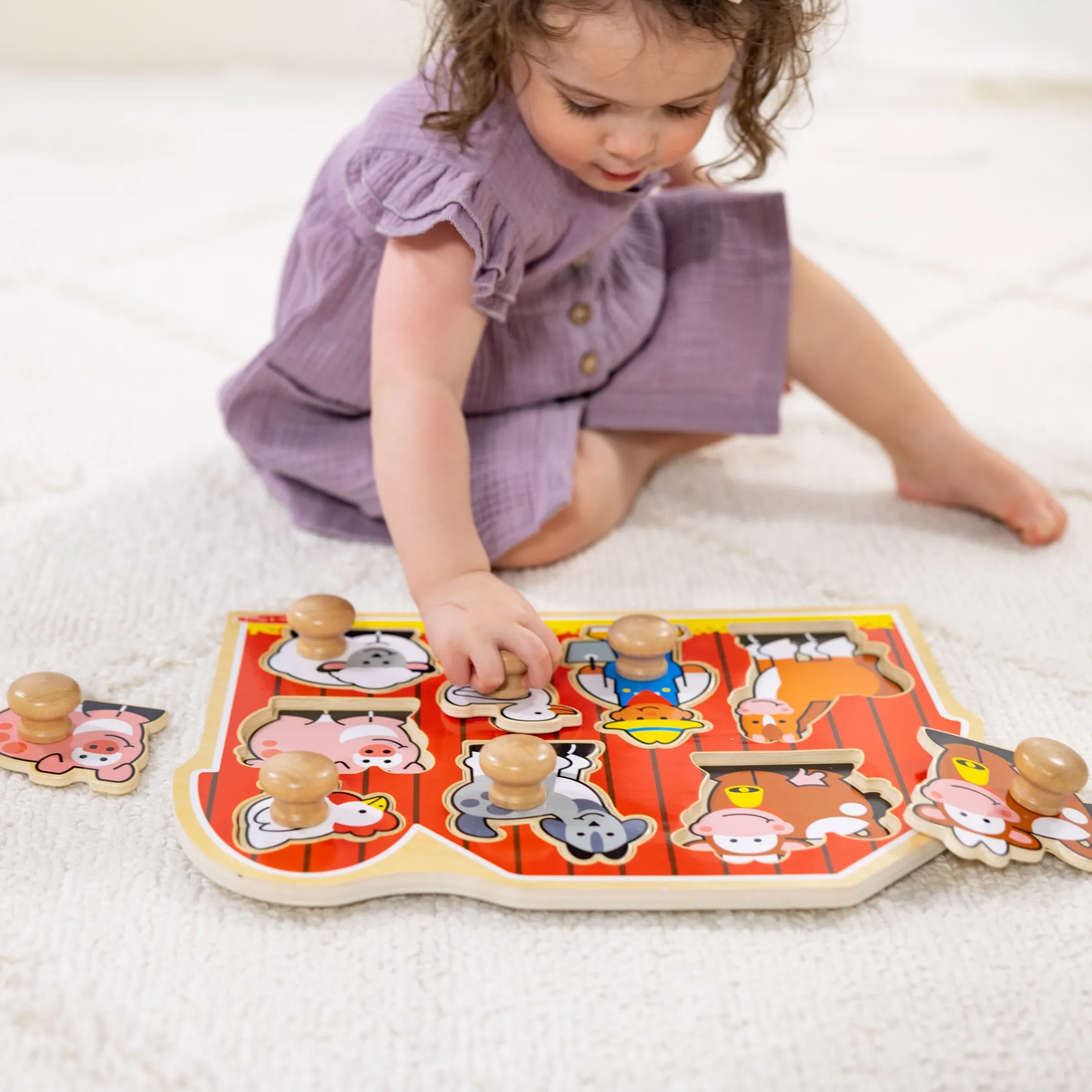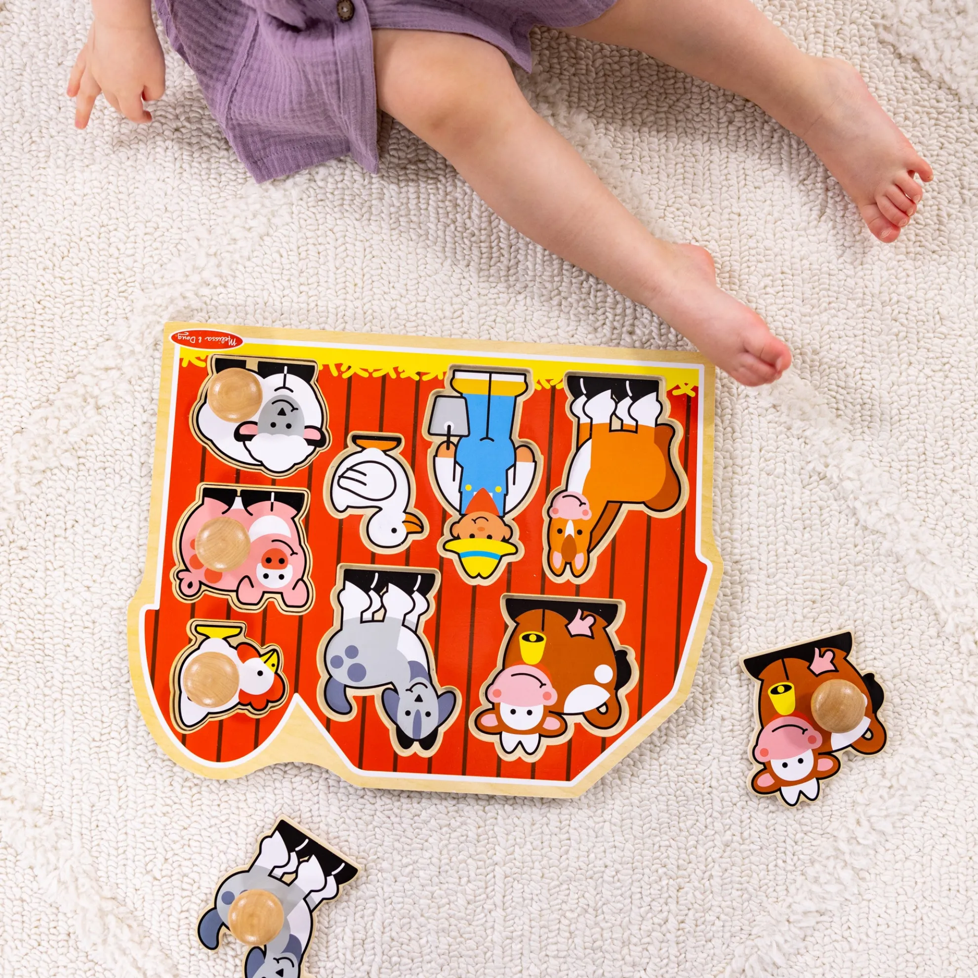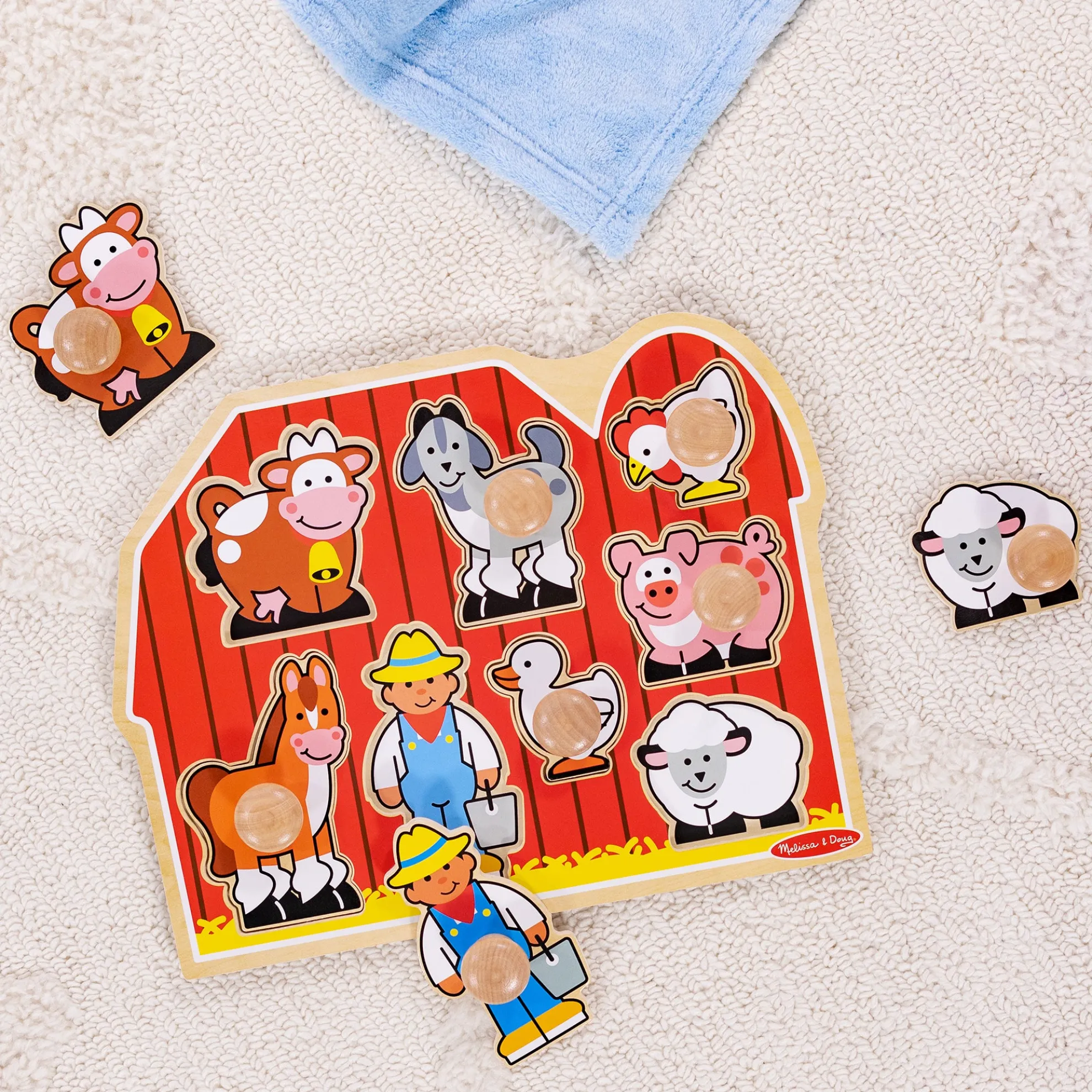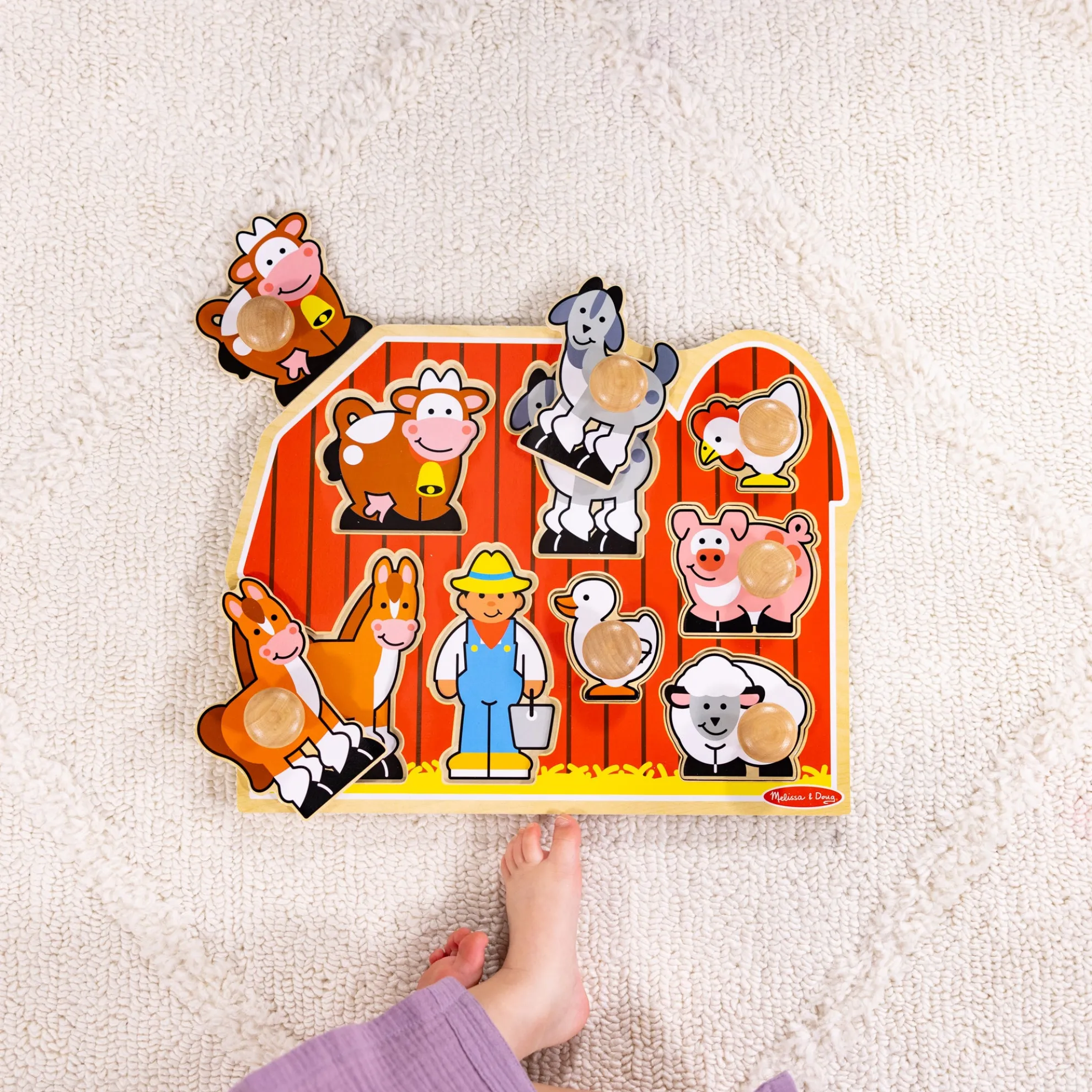 The Melissa & Doug Deluxe Jumbo Knob Puzzle features farm friends that are brightly colored and feature bold outlines. Each puzzle piece is constructed of extra thick, durable wood, and features a jumbo wooden knob so little ones can easily grasp each shape. The eight-piece puzzle includes a chicken, pig, sheep, duck, goat, cow, horse, and a happy farmer. Each piece has a full-color matching picture underneath it to help kids recognize the item. Playing with the puzzle is fun and engaging for kids while they learn about farm animals and practice eye-hand coordination, visual perception, color-recognition, memory, matching, and fine-motor skills. The wooden knob puzzle makes a great learning tool for the home as well as the classroom for hands-on, screen-free play. It makes an exceptional gift for babies and toddlers one year and older. We design every toy to the highest-quality standards, and to nurture minds and hearts.