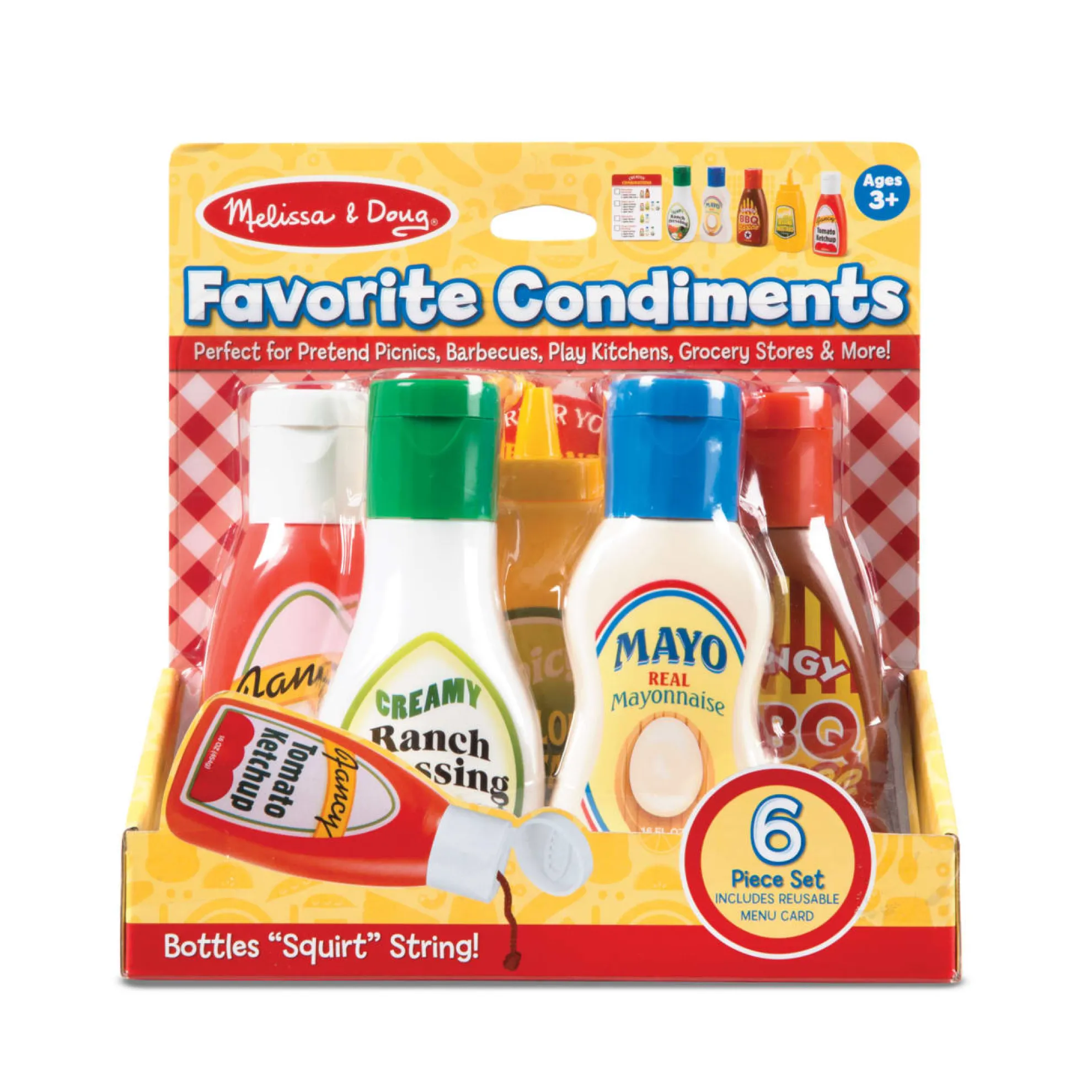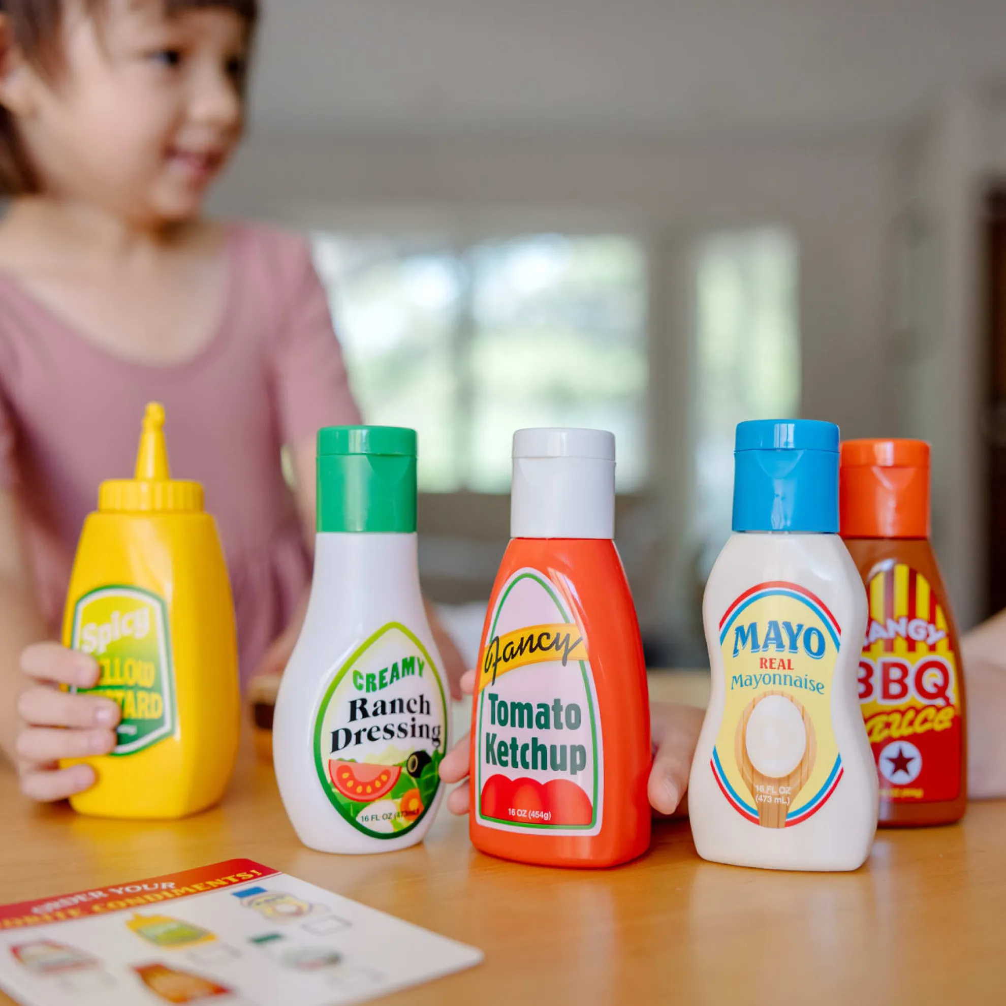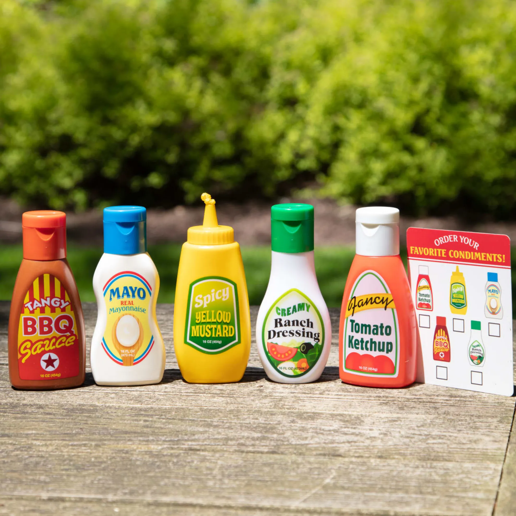 Be the hit of pretend picnics, barbecues, and other playtime meals with these favorite food toppers! Twist or flip the caps and tip the condiments to “squirt” ranch dressing, barbecue sauce, mustard, mayonnaise, or ketchup string to imaginatively add a creative twist to pretend meats, salads, sandwiches, and more! This set of five durable containers designed to look like the real thing, and a reusable menu card with creative combination ideas are sure to satisfy hungry imaginations at playtime.