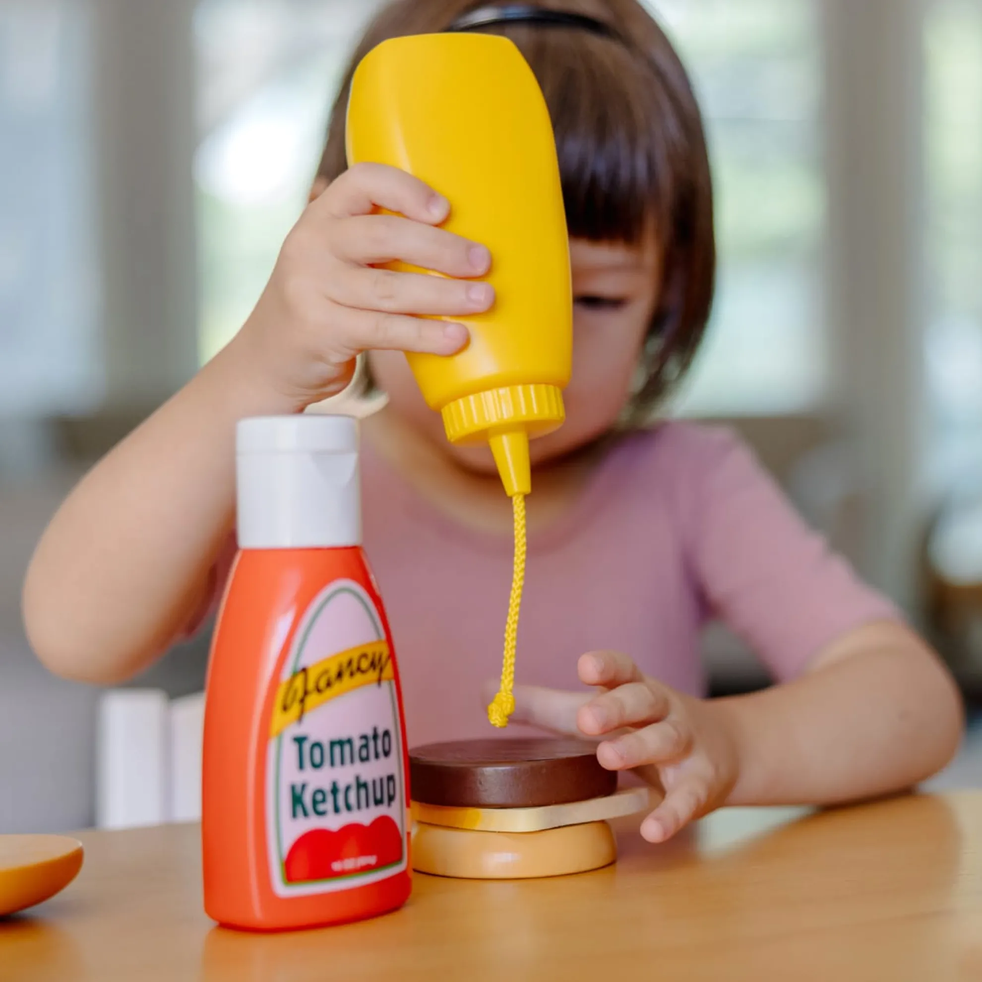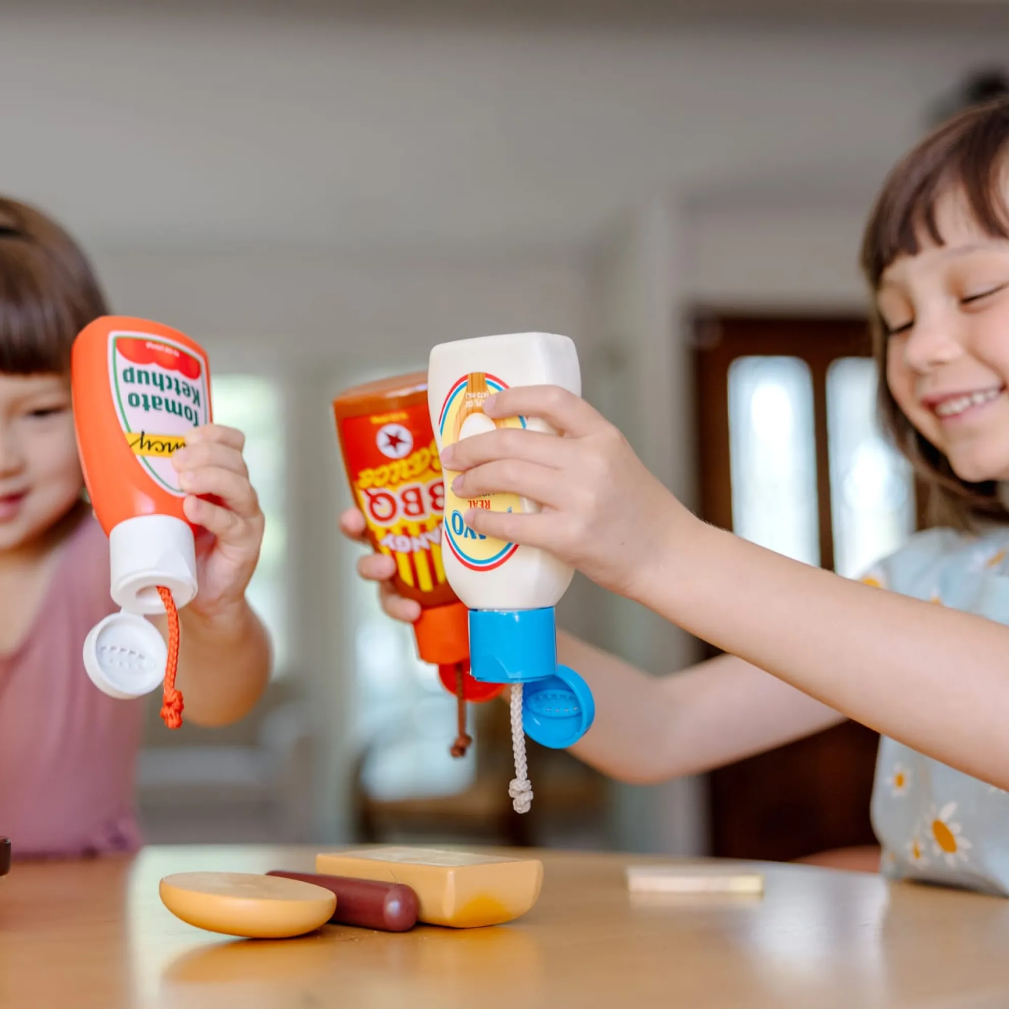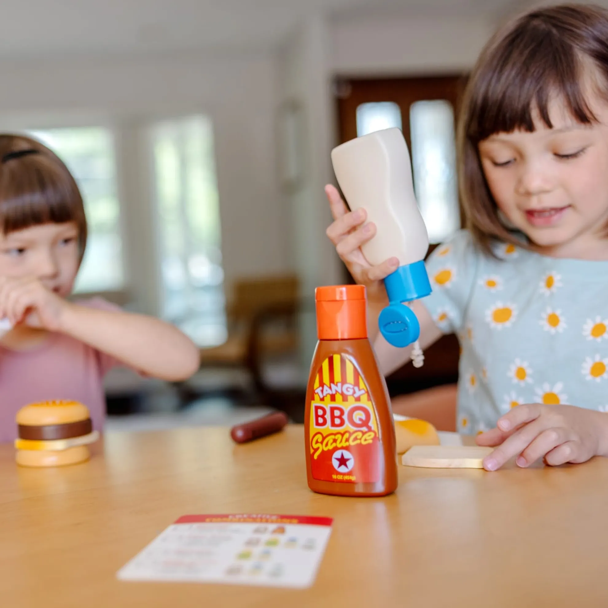 Be the hit of pretend picnics, barbecues, and other playtime meals with these favorite food toppers! Twist or flip the caps and tip the condiments to “squirt” ranch dressing, barbecue sauce, mustard, mayonnaise, or ketchup string to imaginatively add a creative twist to pretend meats, salads, sandwiches, and more! This set of five durable containers designed to look like the real thing, and a reusable menu card with creative combination ideas are sure to satisfy hungry imaginations at playtime.