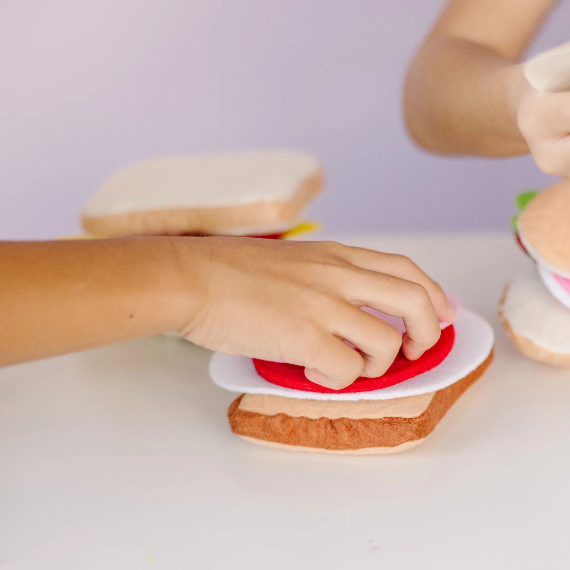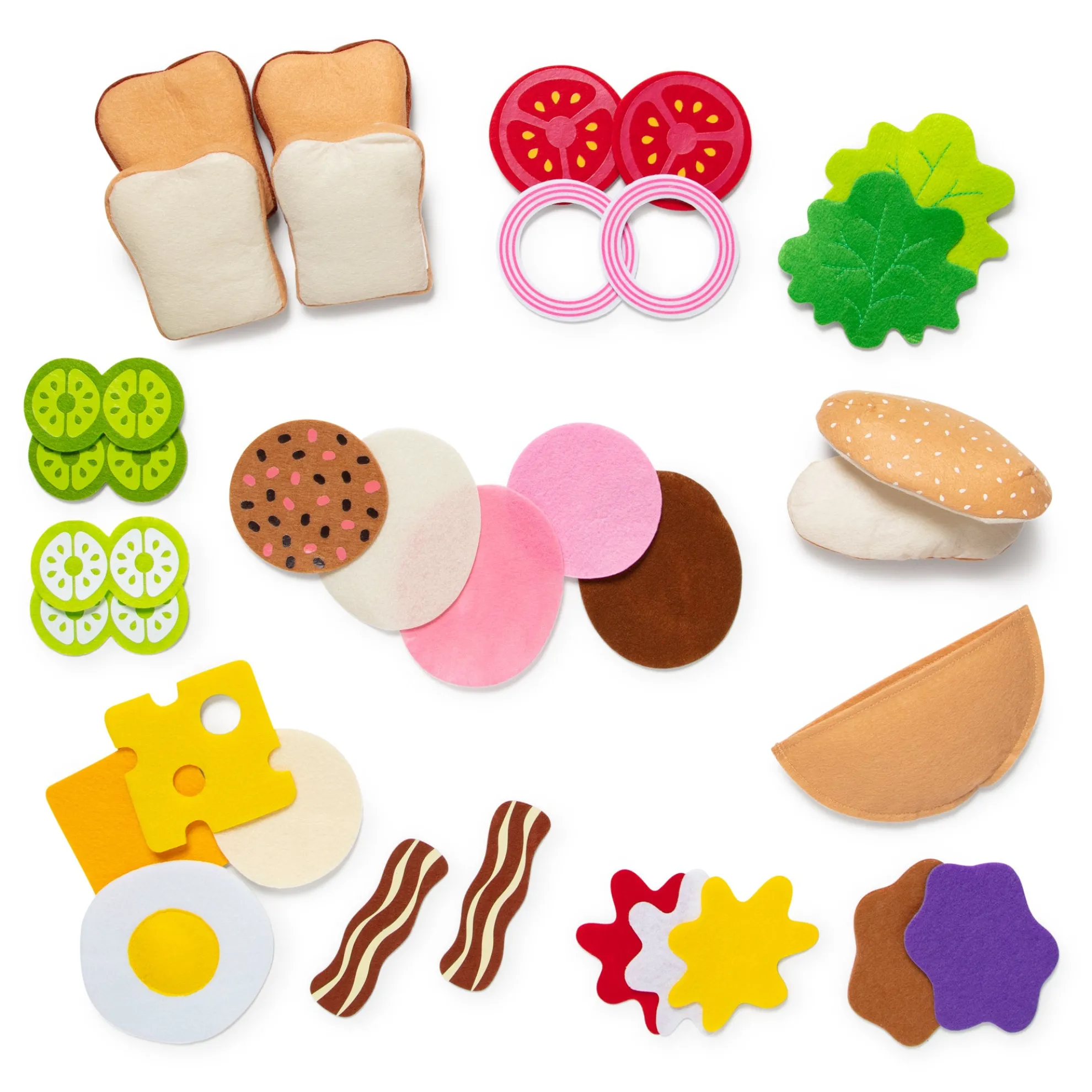 Open your own sandwich shop with this 33-piece smorgasbord of fabulous felt food pieces! Use white or wheat bread slices or a pita pocket, then layer on the meats, cheeses, vegetables, condiments and more. Build a submarine, a grinder, a hoagie or a Dagwood sandwich! With dozens of sandwich stuffers included, we’ve got the ingredients for any special order!