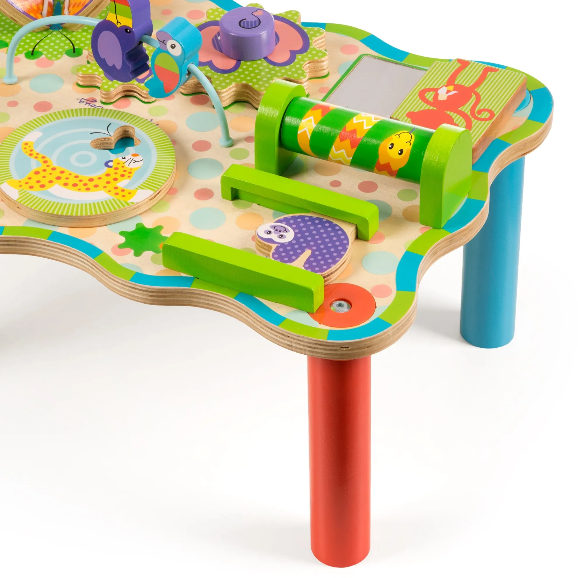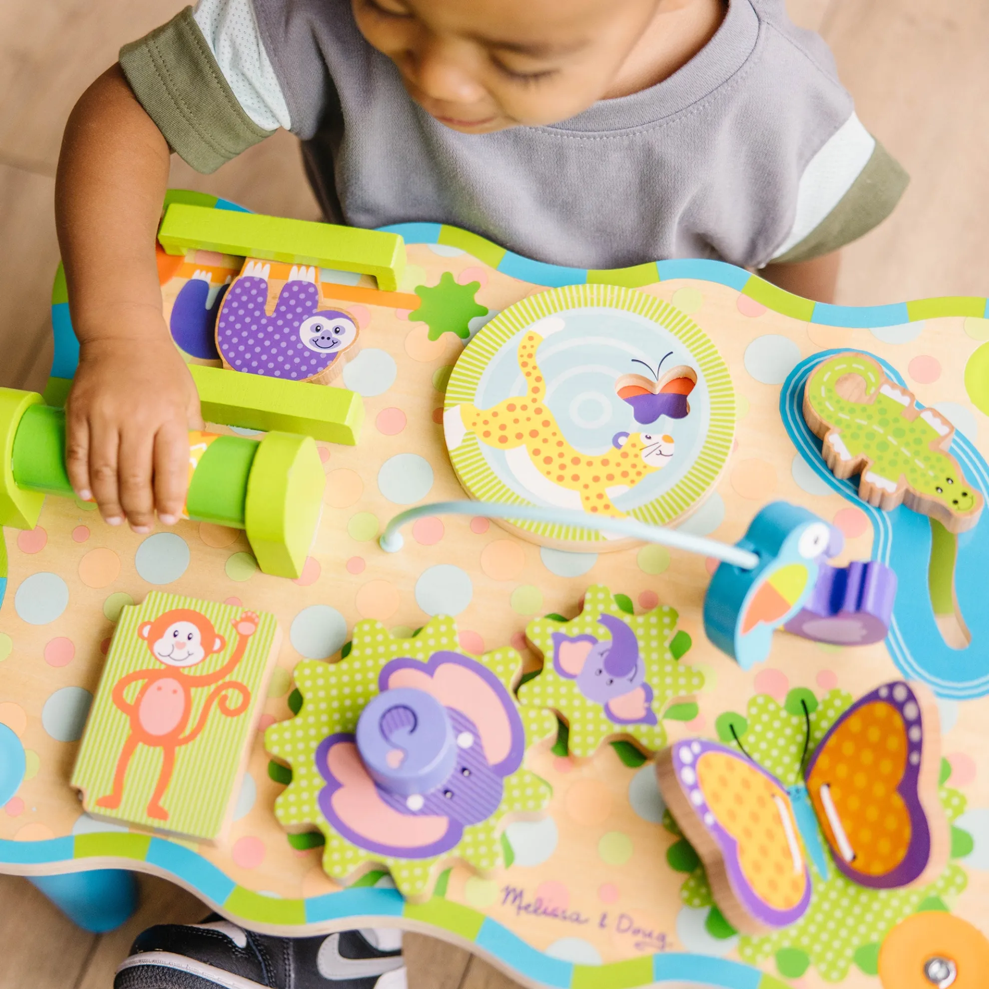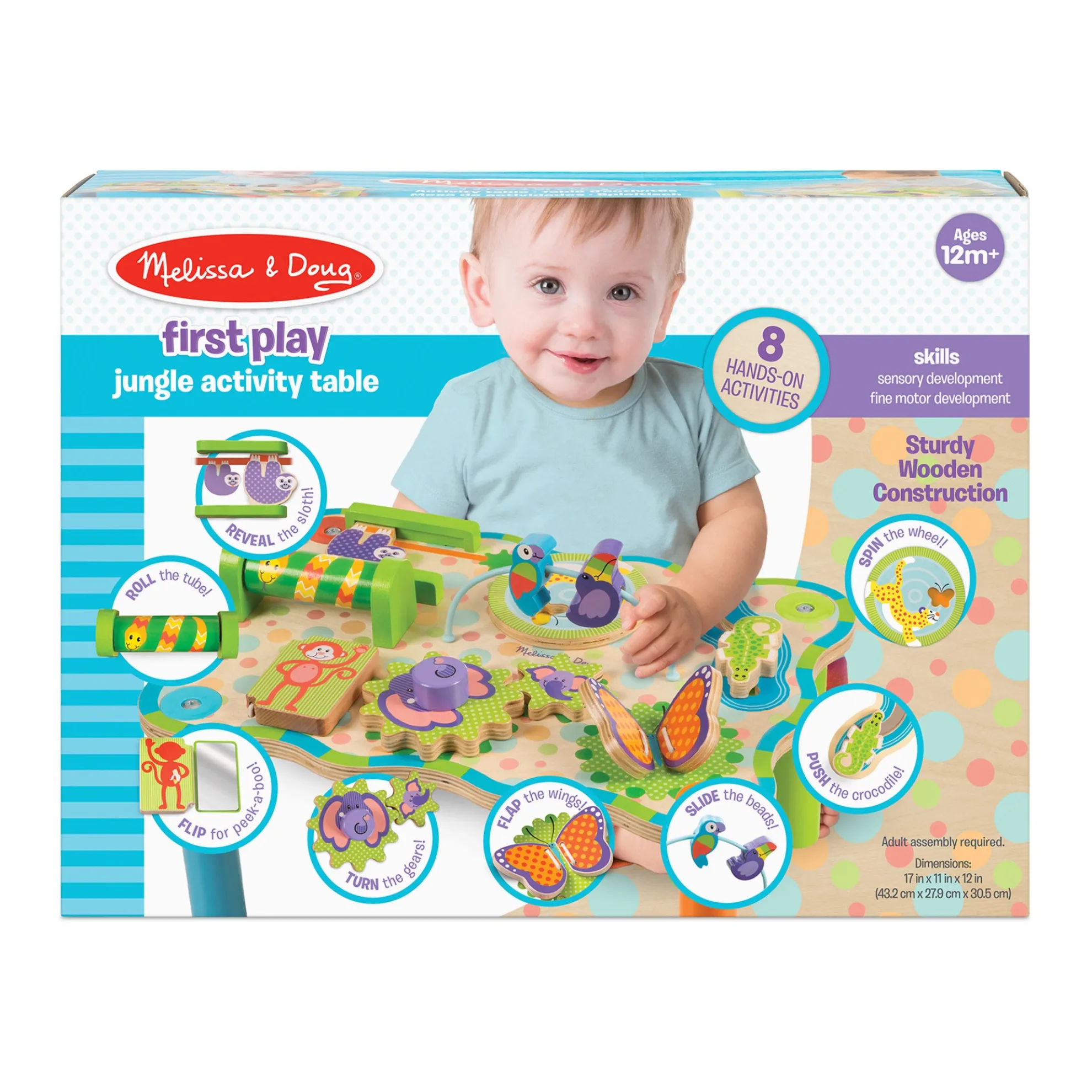 This hands-on multi-activity table keeps kids 12 months and older engaged and entertained, while encouraging important developmental skills. Features include gears to turn, a tube to roll, beads to slide, flaps to open, a wheel to spin, and easy-to-grasp pieces to flip, push, and pull! Sturdy wooden construction, paired with whimsical jungle-themed designs, make this a long-lasting and welcome addition to any playroom. First Play toys feature bright colors, bold patterns, and whimsical designs that boost skills while sparking imagination and wonder—right from the start!
