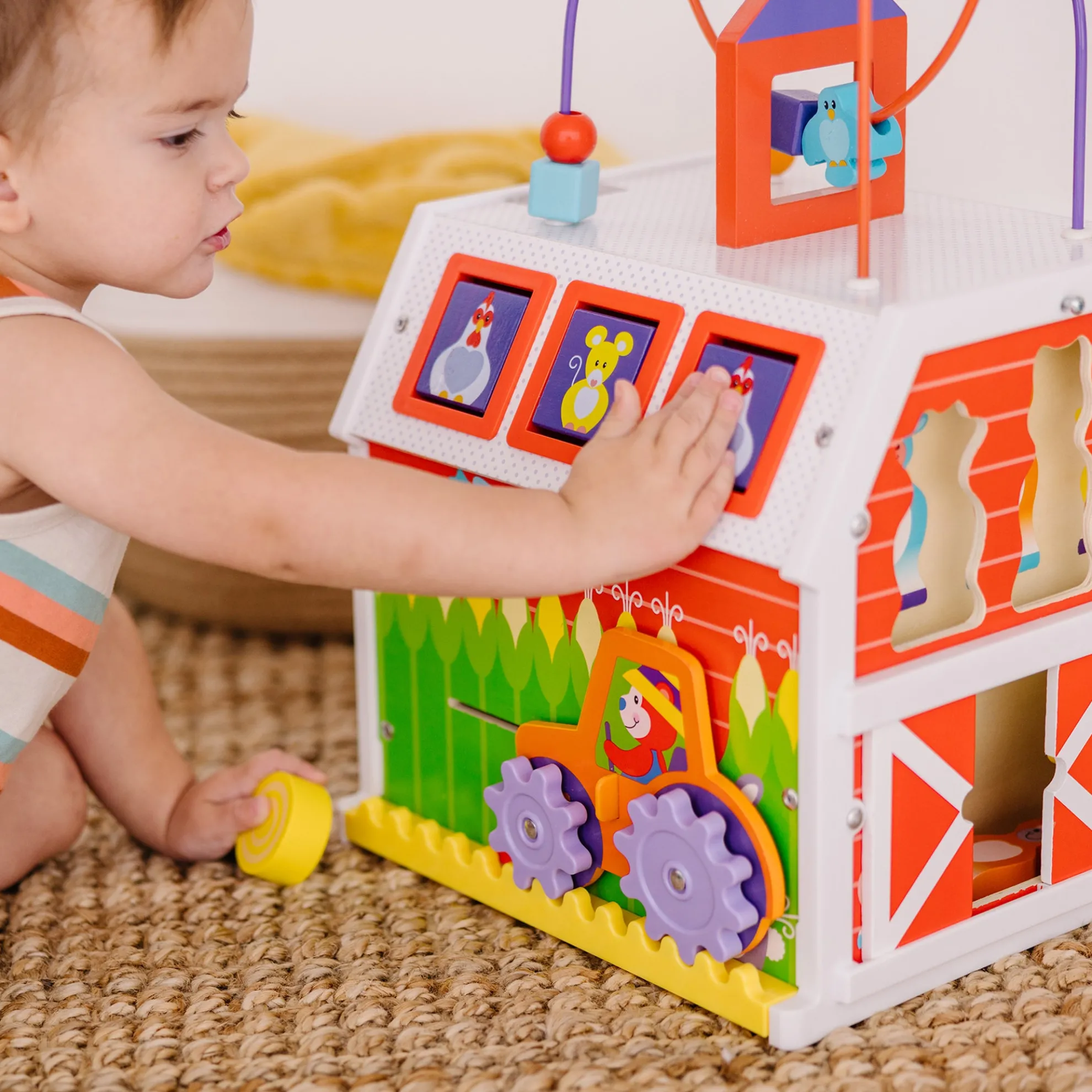 - Sturdy wooden farm-themed activity barn with both attached and removable pieces to slide, sort, and roll