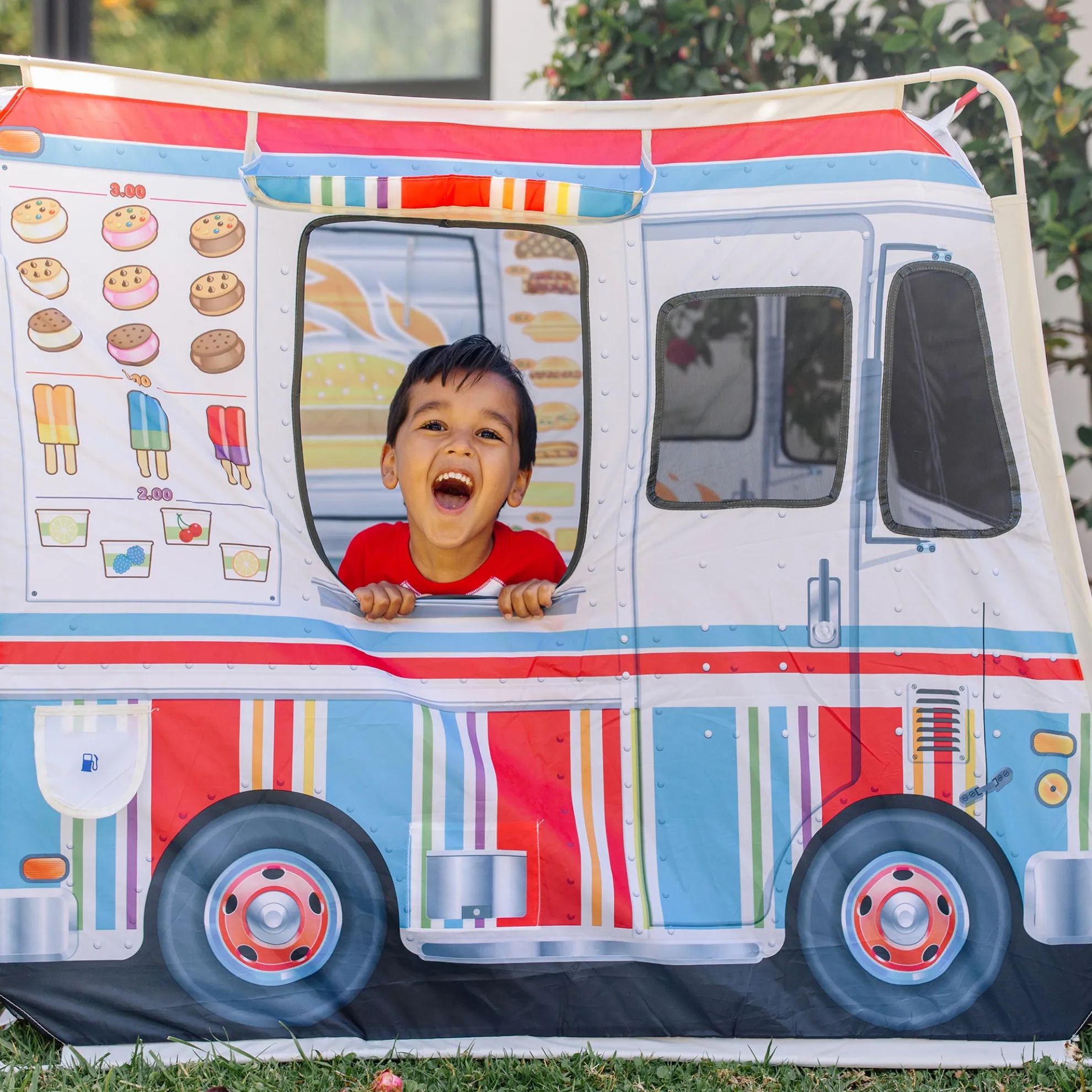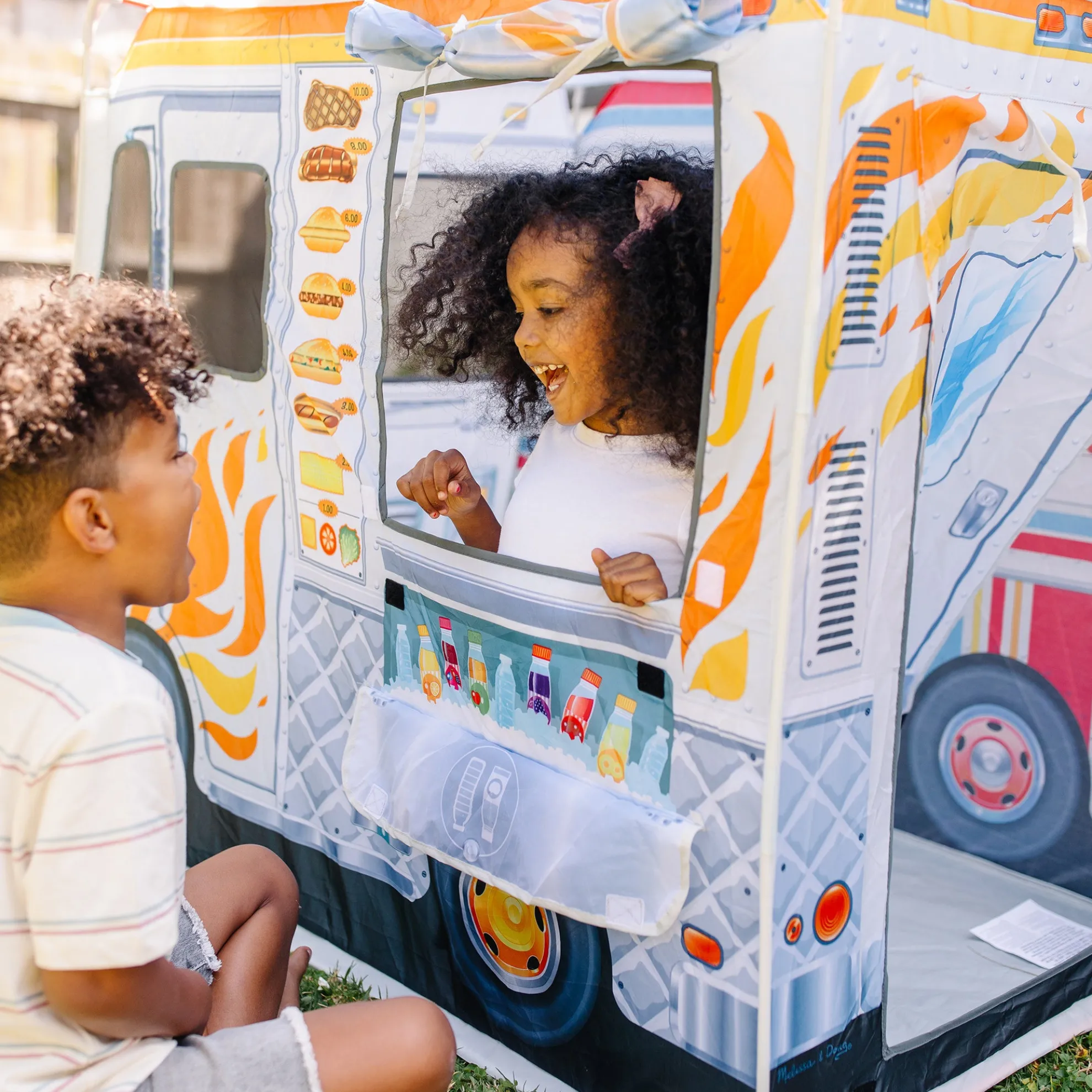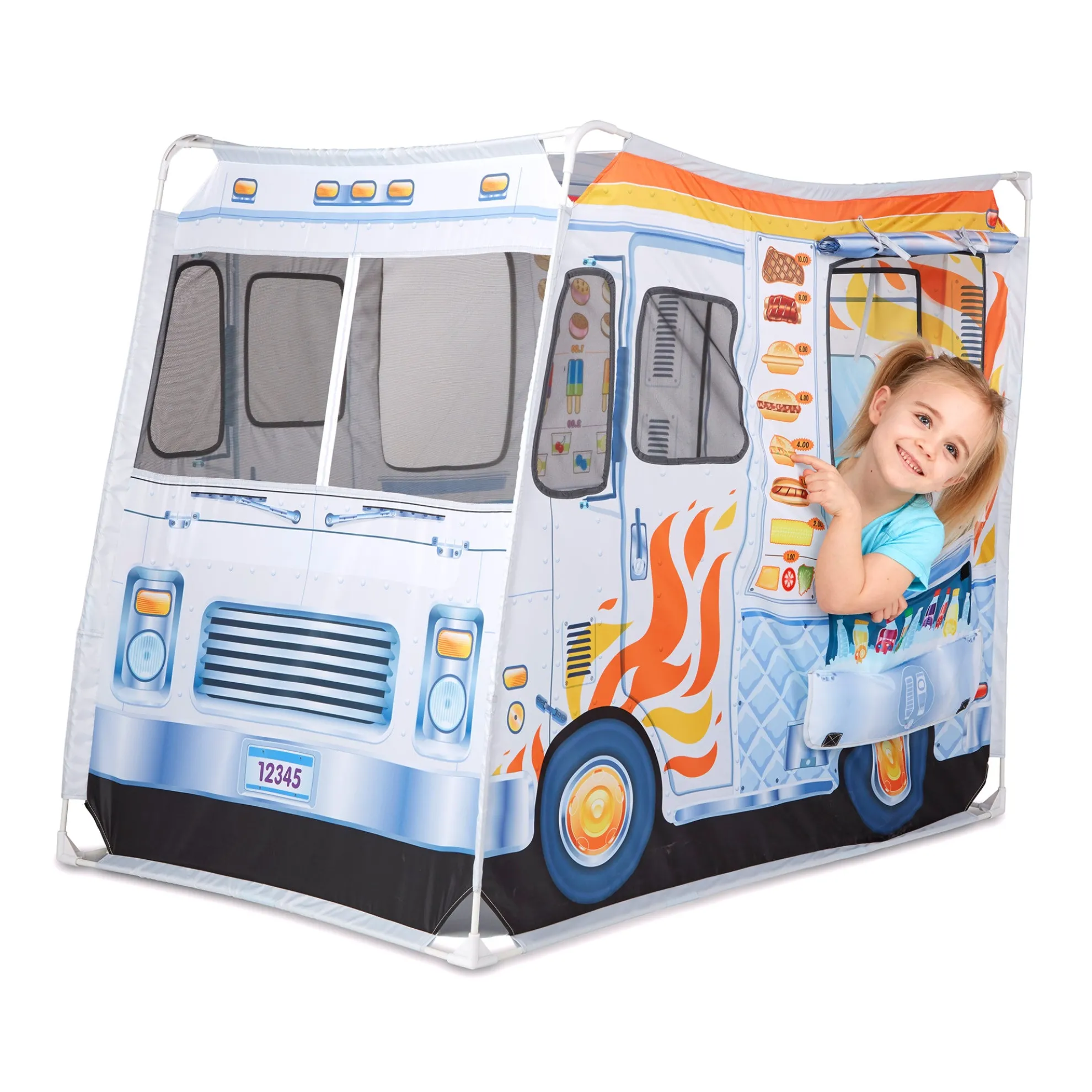 - Roomy and sturdy 4-foot-long food truck indoor or outdoor fabric tent playhouse with vibrant, full-color exterior artwork