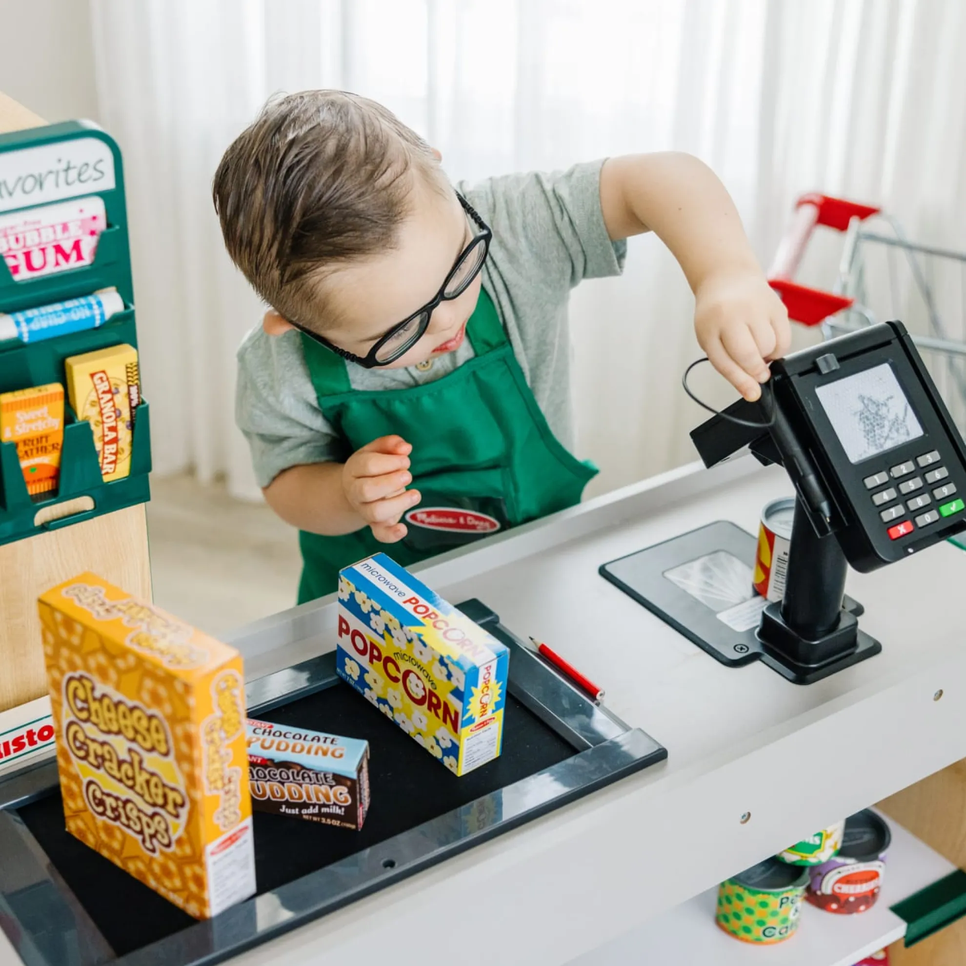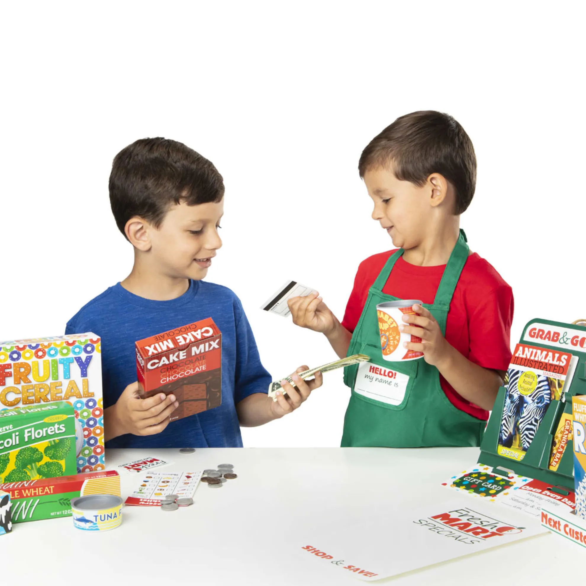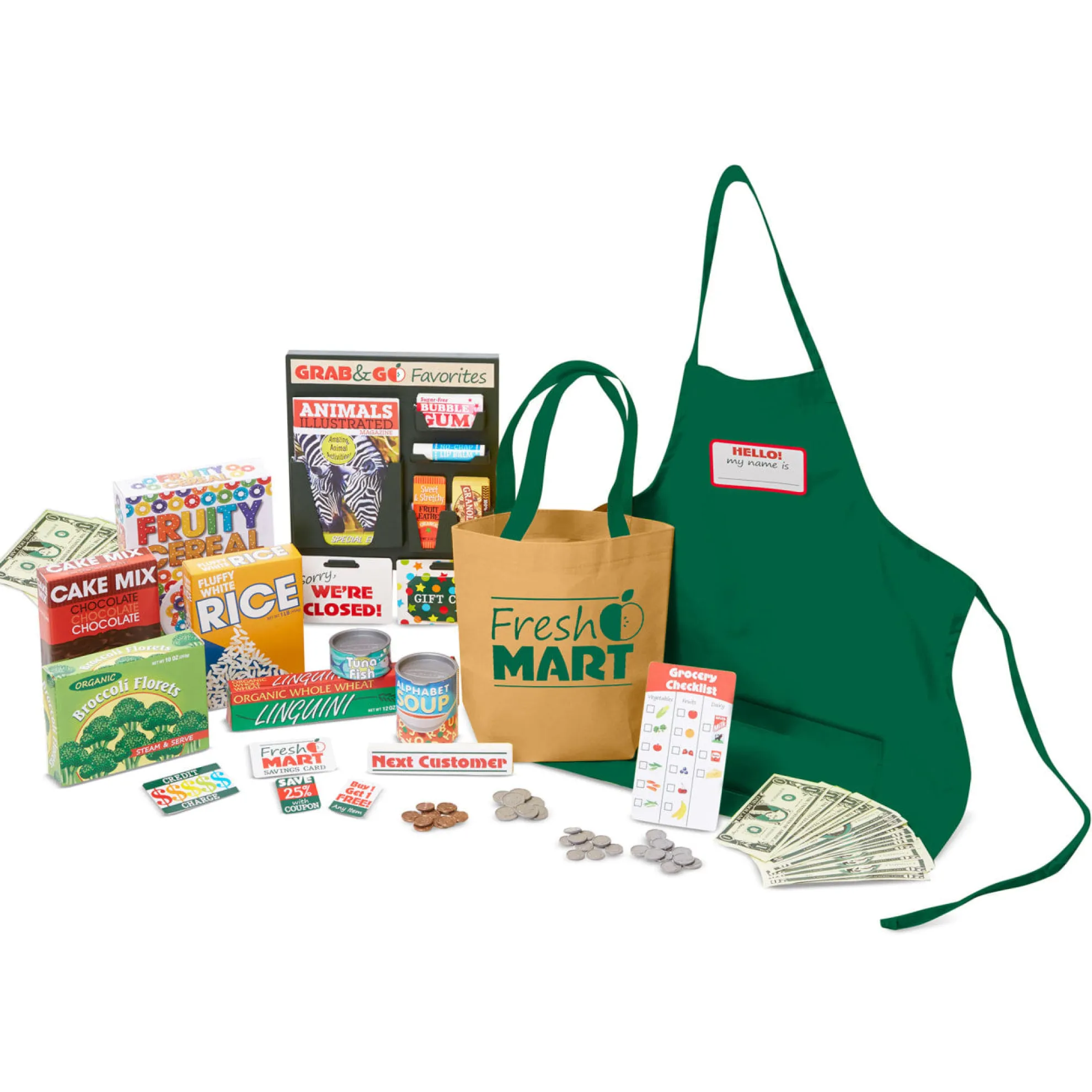 - Role play items include apron, conveyor belt divider bar, shopping bag, play money, cards, coupons