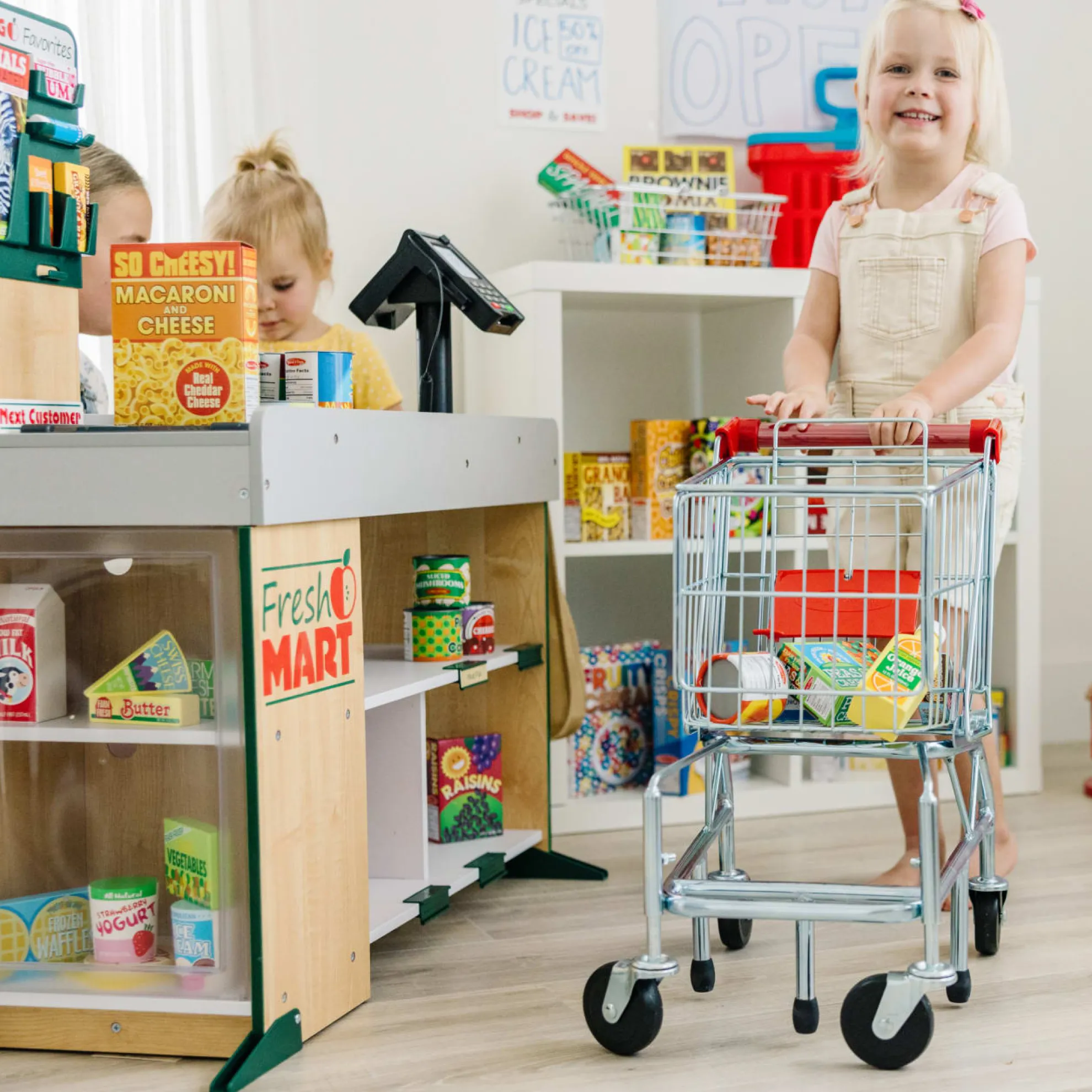 This companion set to the Fresh Mart Grocery Store has everything kids three and older need to stock shelves and get shopping! There are 70 pieces to play with, including grocer and shopper role-play items like an apron, conveyor belt divider bar, and a cloth shopping bag, a fully stocked grab-and-go rack designed to hang on the grocery store shelf (holds gum, granola bar, a magazine, and more!), play money, cards, and coupons, and grocery boxes and cans! This set plays perfectly with the Melissa & Doug Fresh Mart Grocery Store!