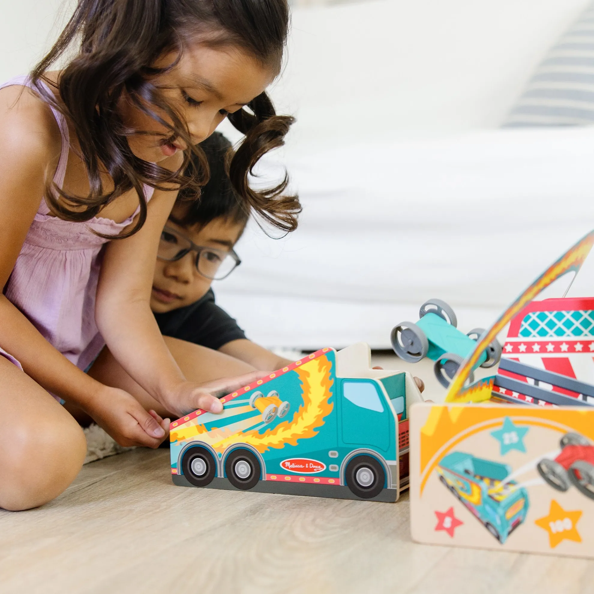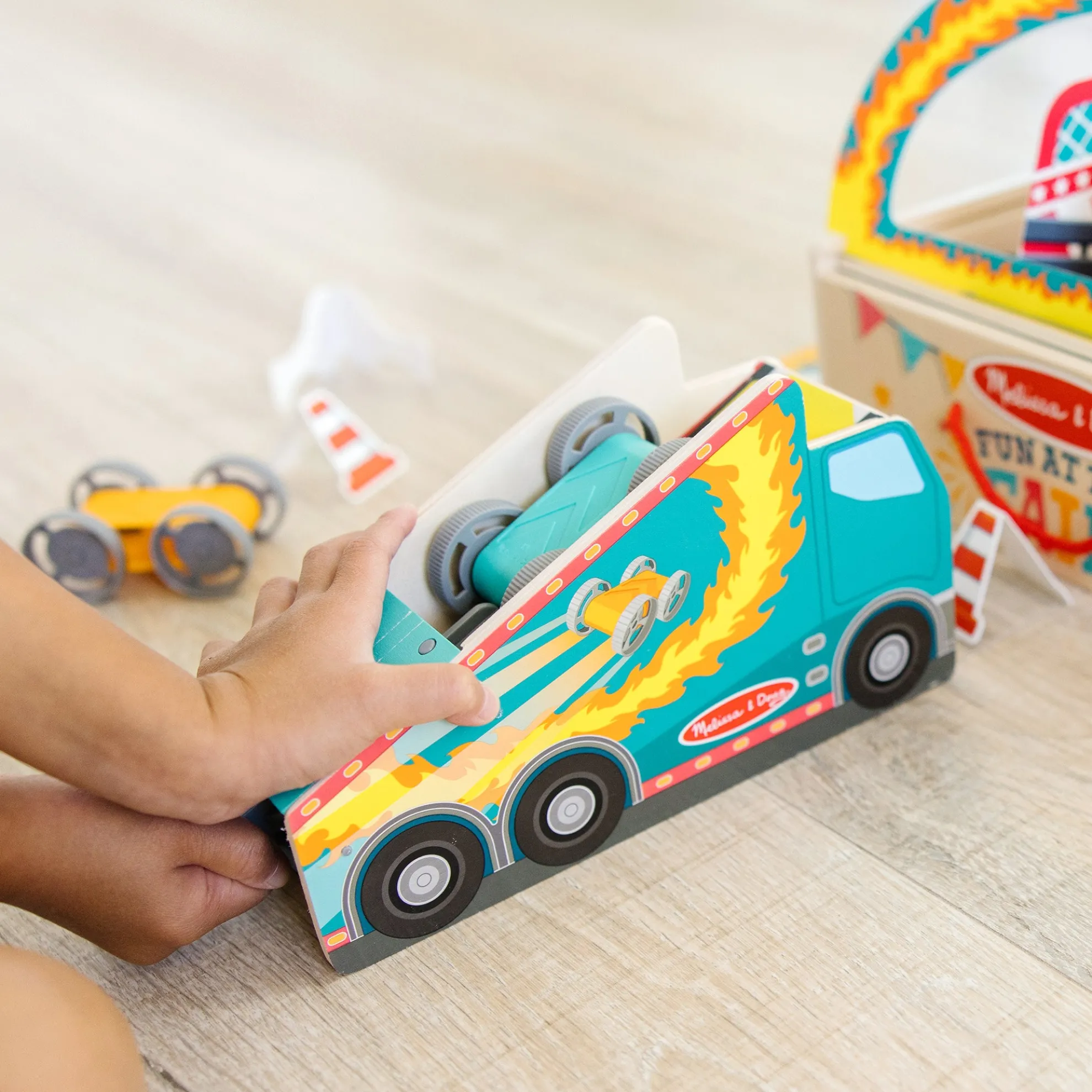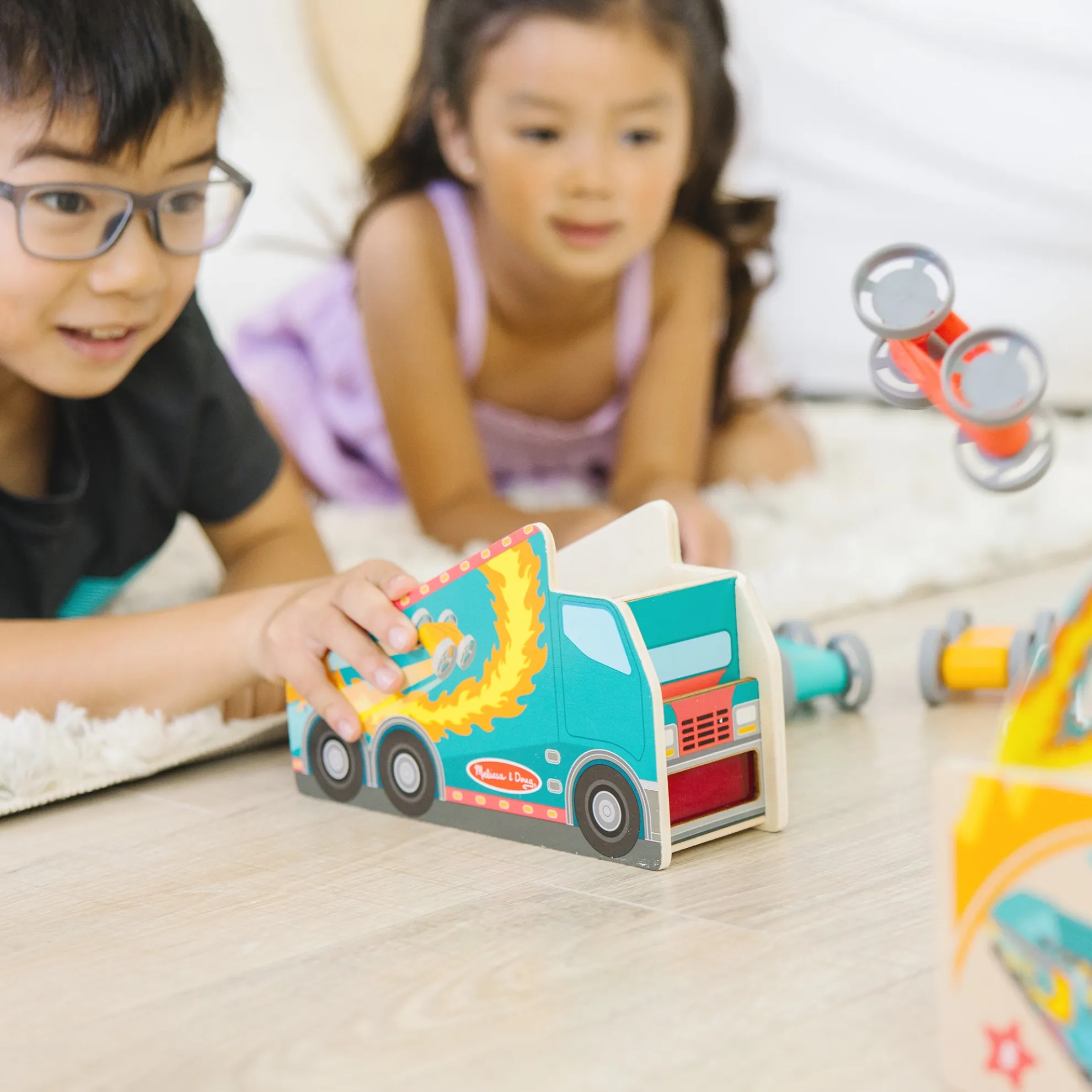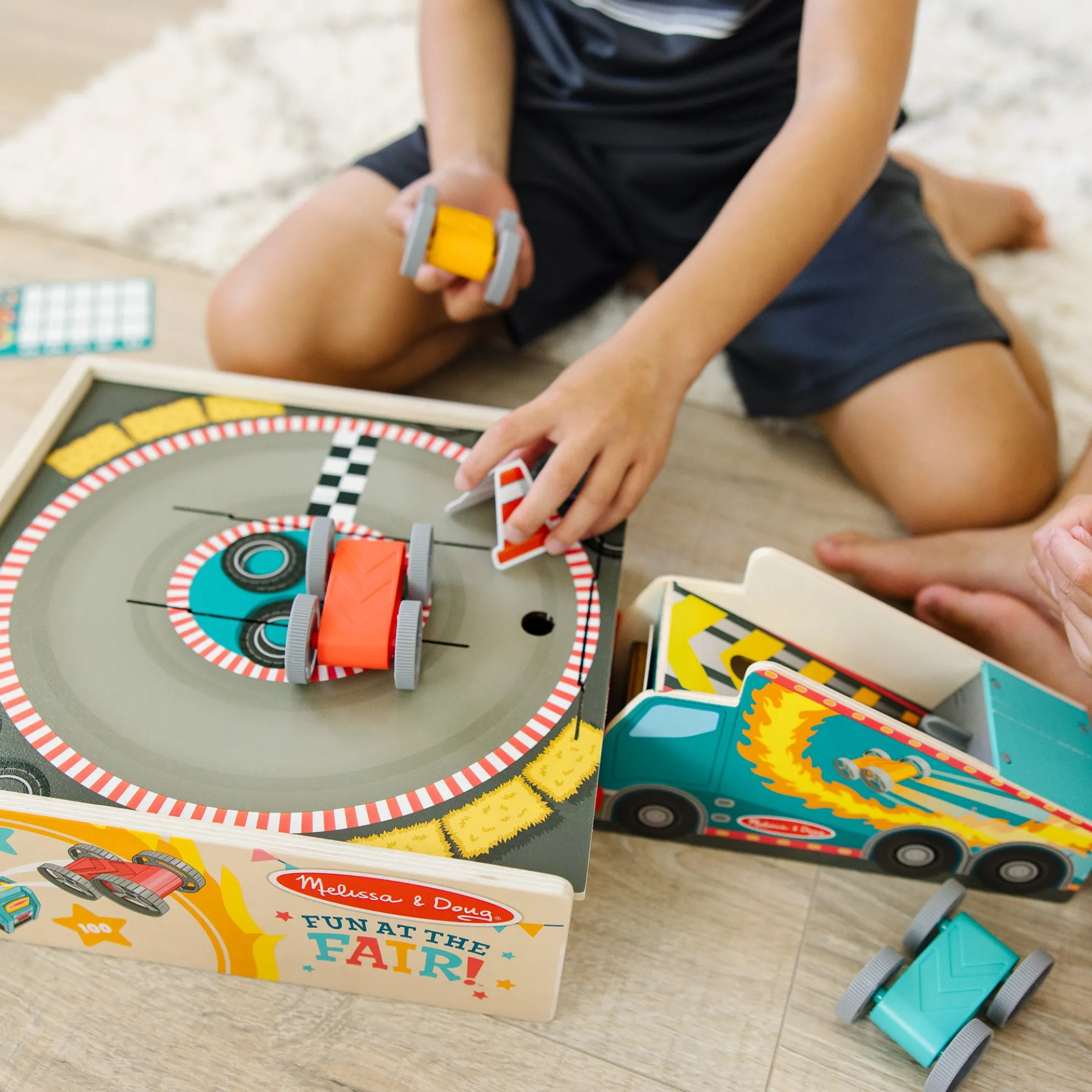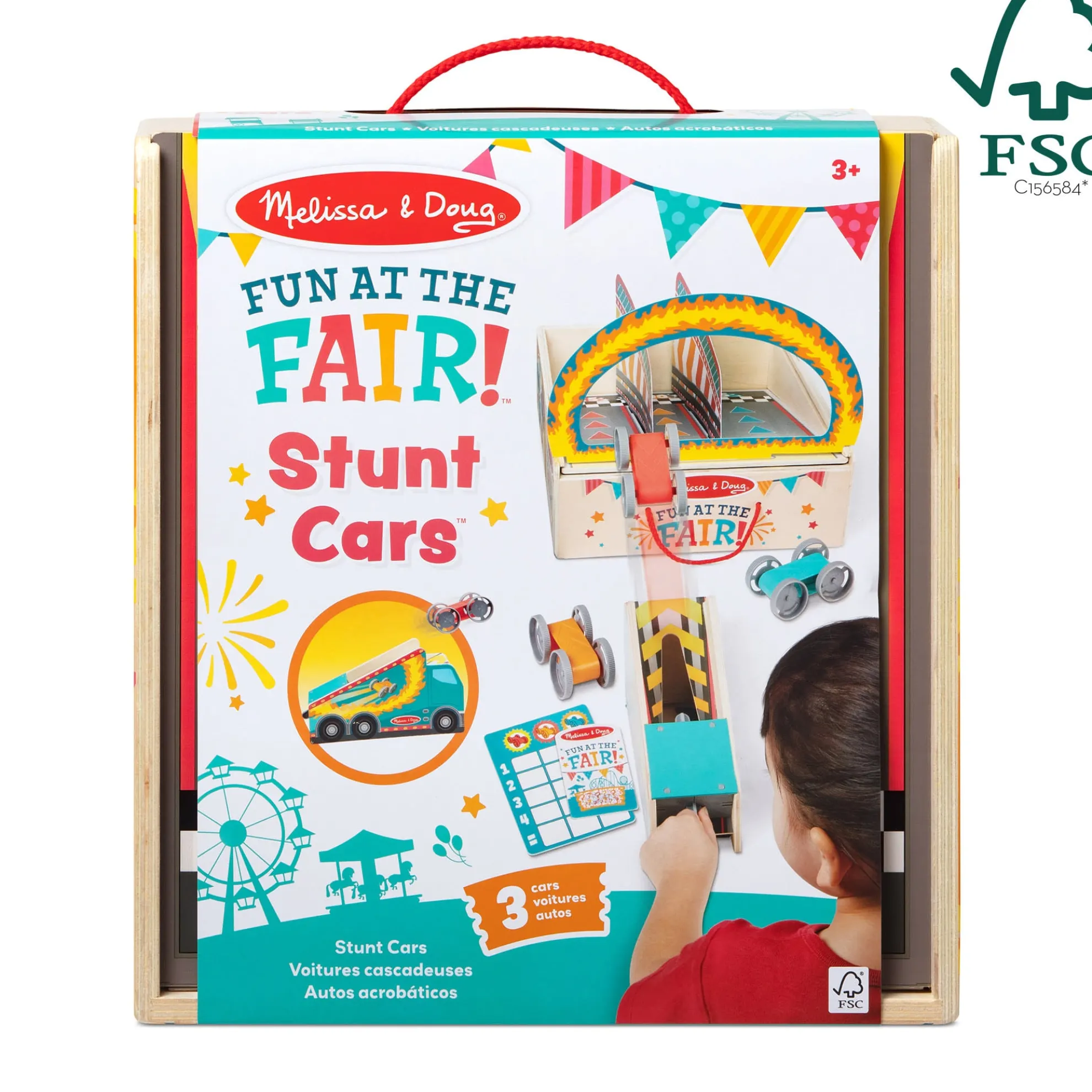 Step right up and turn any day into Fair Day! The Melissa & Doug Fun at the Fair!™ Stunt Cars lets kids three and older experience the excitement of stunt jumping race cars at home! Start playing by inserting the secret-reveal player card ticket in the front of the wooden truck-shaped launcher. Use the dividers to set up three landing zones, place a stunt car in the launcher, aim, pull and release the launch handle and send stunt cars soaring through the ring of fire! Earn points for each landing. Flip the double-sided landing pad to set up a racetrack with cone obstacles and a trophy for the winner. Fun for independent play or challenge friends. All pieces store in the landing zone box with lid. Designed to amuse, surprise, and challenge kids three and older to keep them laughing and learning through play, Stunt Cars is an engaging, hands-on way to introduce colors, counting, and cause-and-effect, and to encourage fine motor skills. From games of skill and chance to innovative carnival-inspired play sets, the Melissa & Doug Fun at the Fair!™collection brings home all the fun of a day at the fair! This product is certified by the Forest Stewardship Council. FSC certification ensures that products come from responsibly managed forests that provide environmental, social, and economic benefits, and that forests are protected for future generations. Please note that FSC certification applies to new inventory only (FSC C156584)