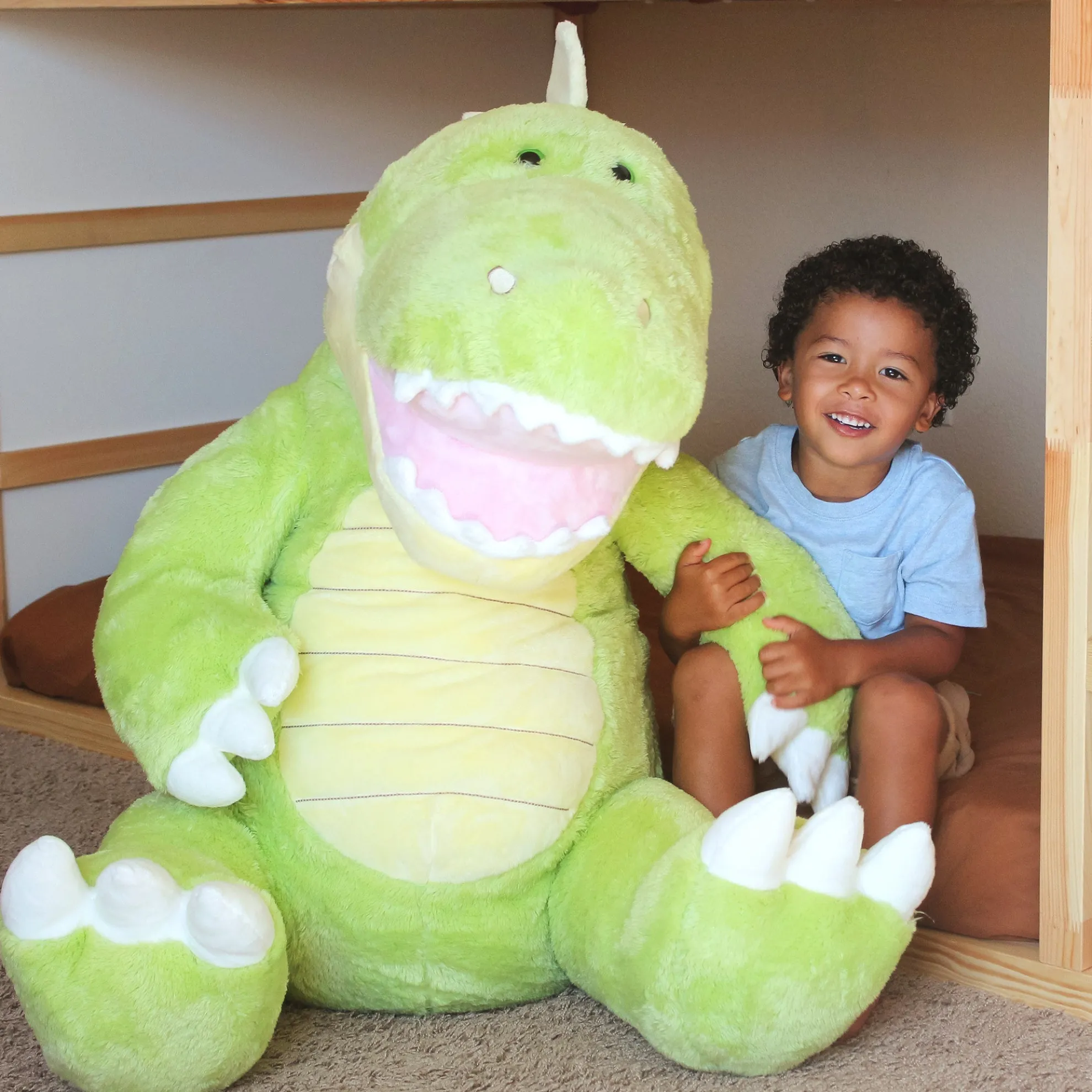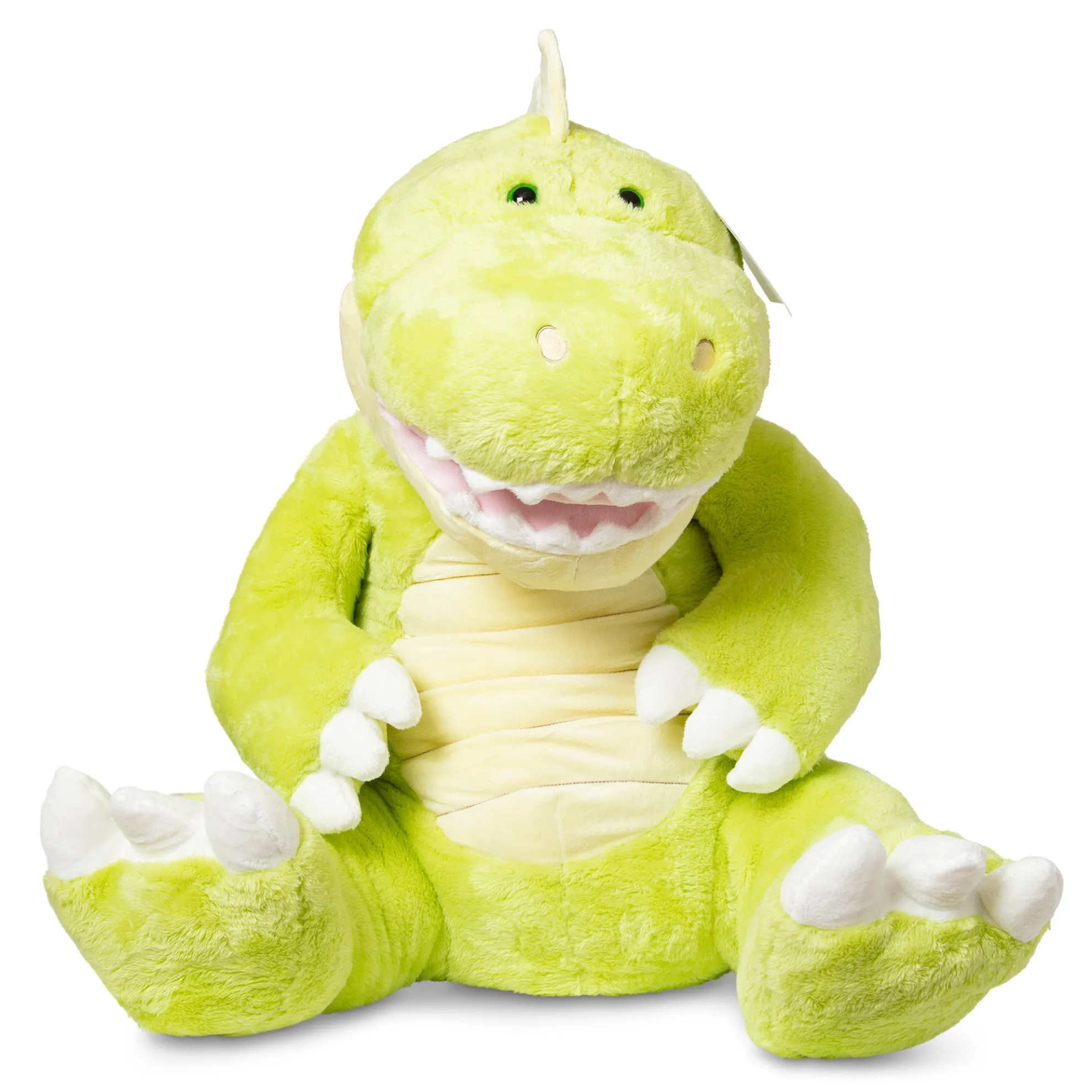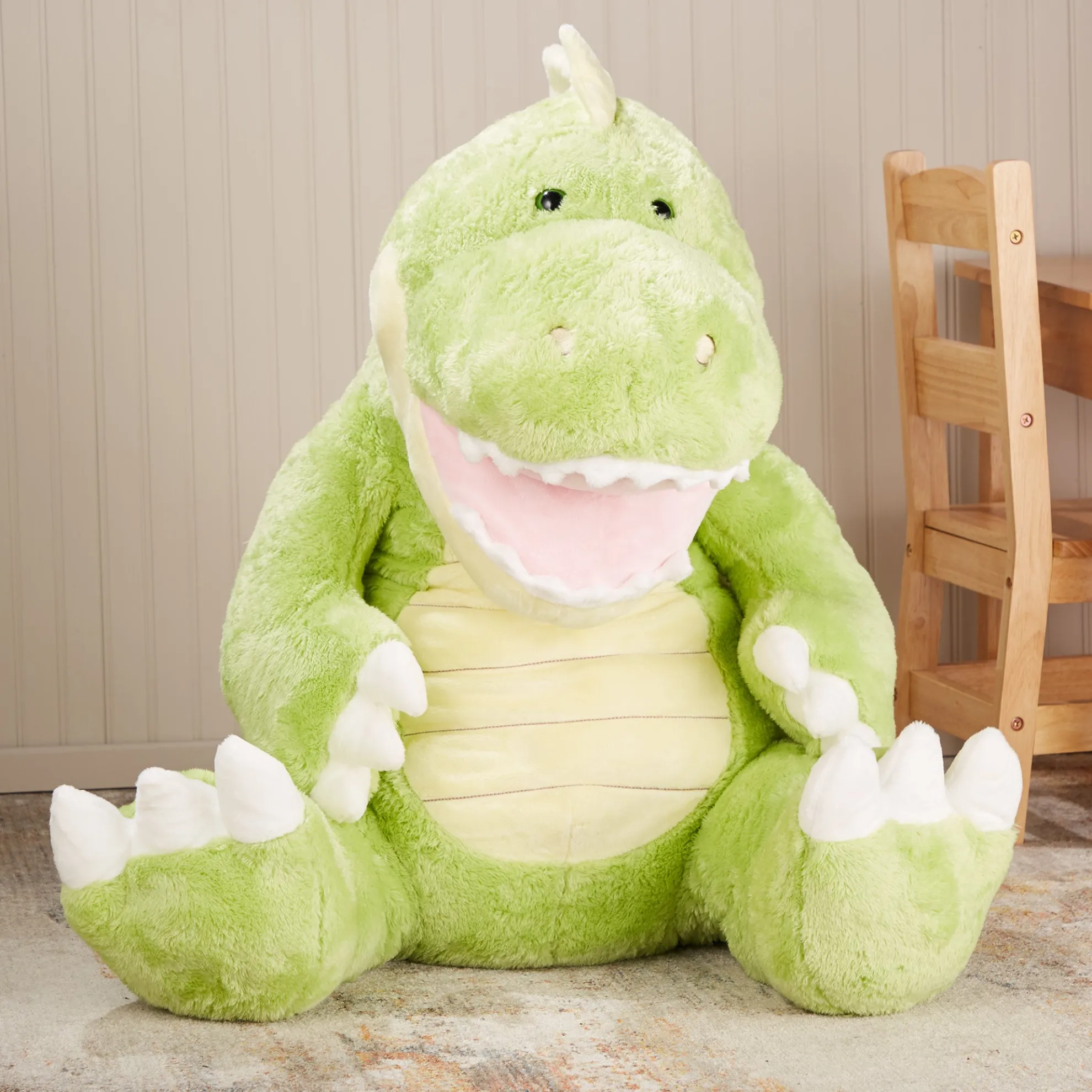 - Giant jumbo-sized stuffed plush green dinosaur with yellow accents sits nearly 3 feet tall