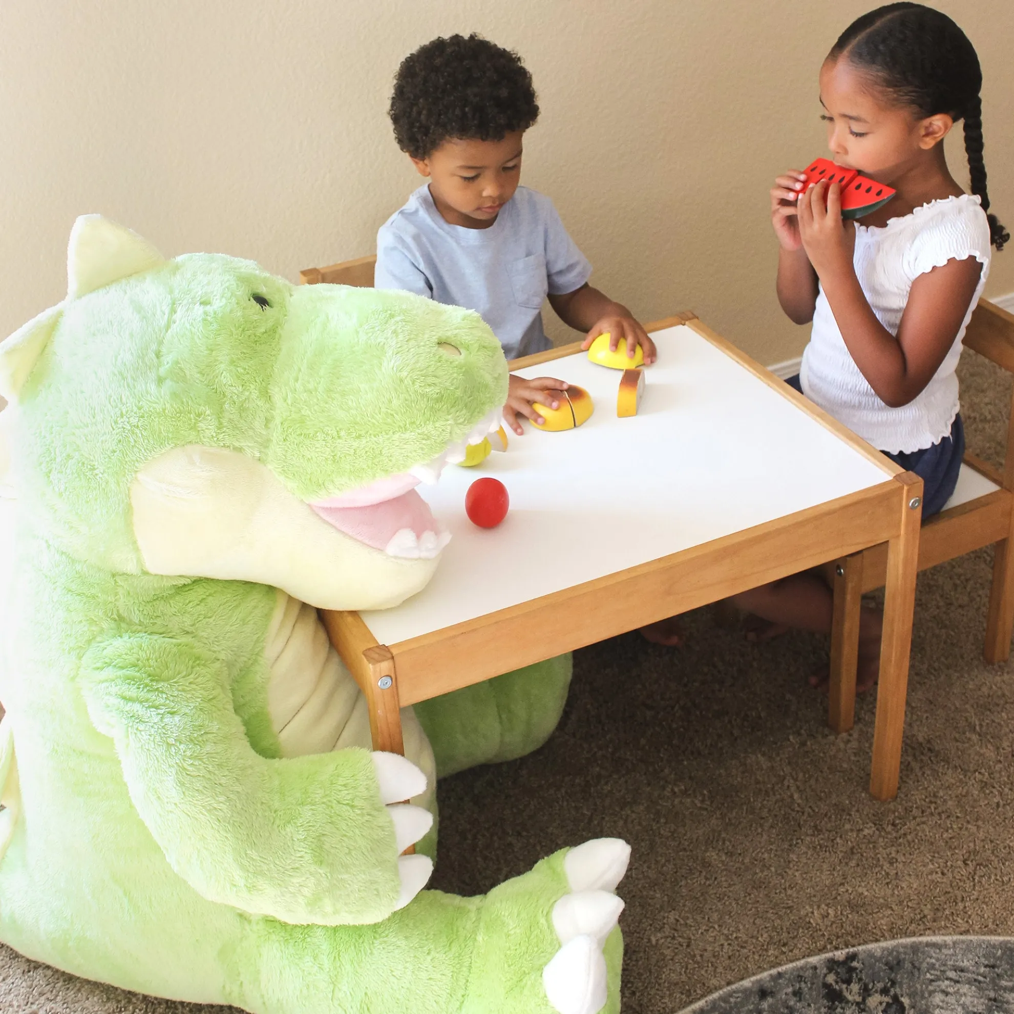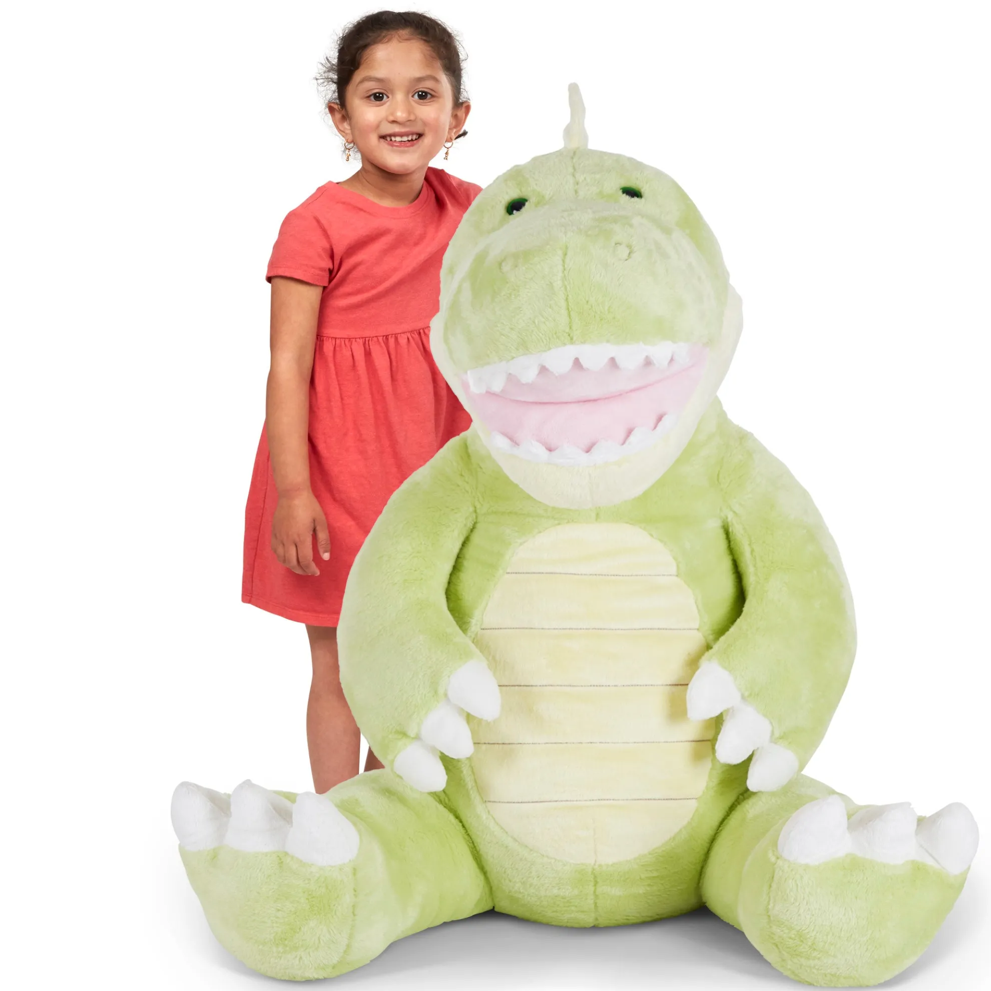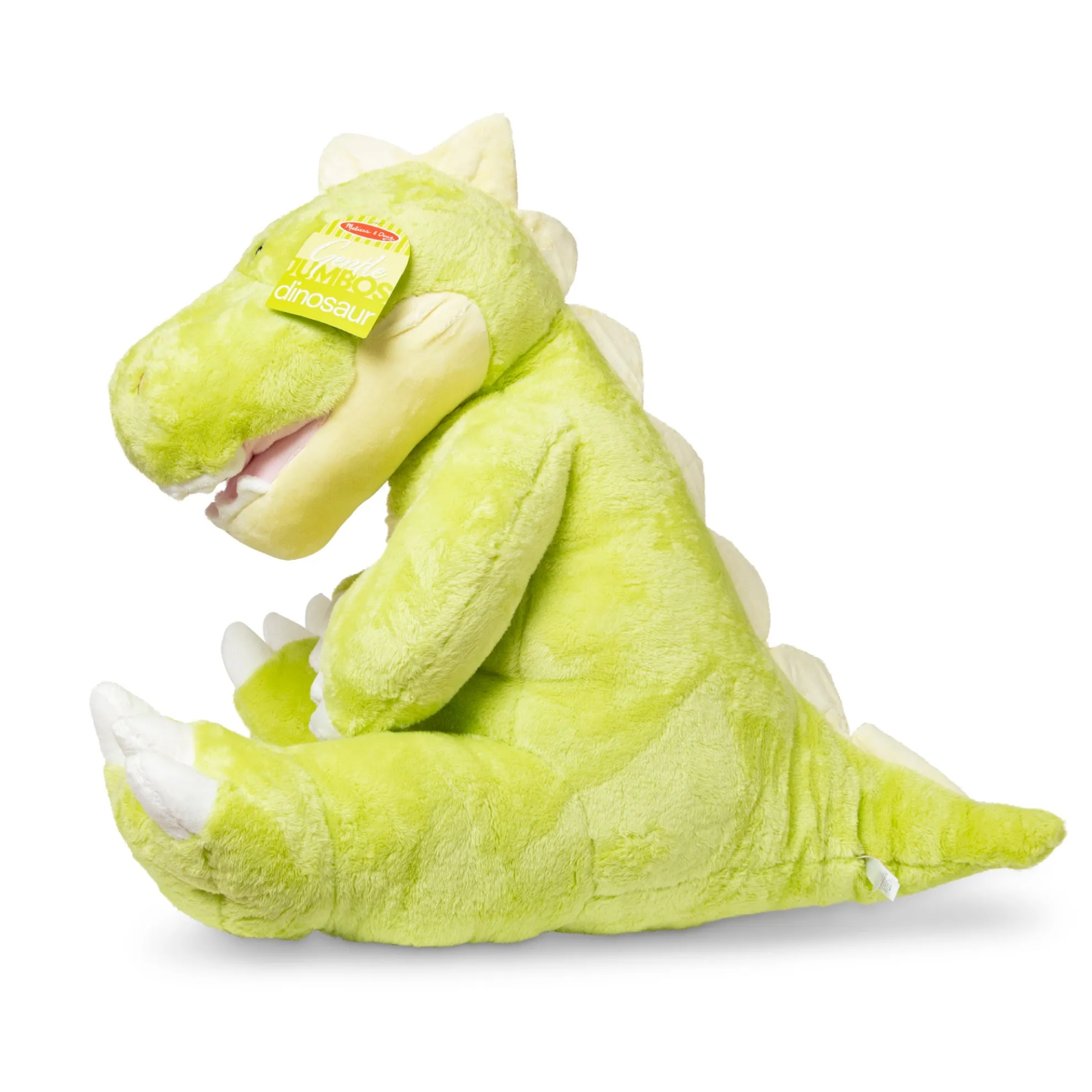 - Giant jumbo-sized stuffed plush green dinosaur with yellow accents sits nearly 3 feet tall