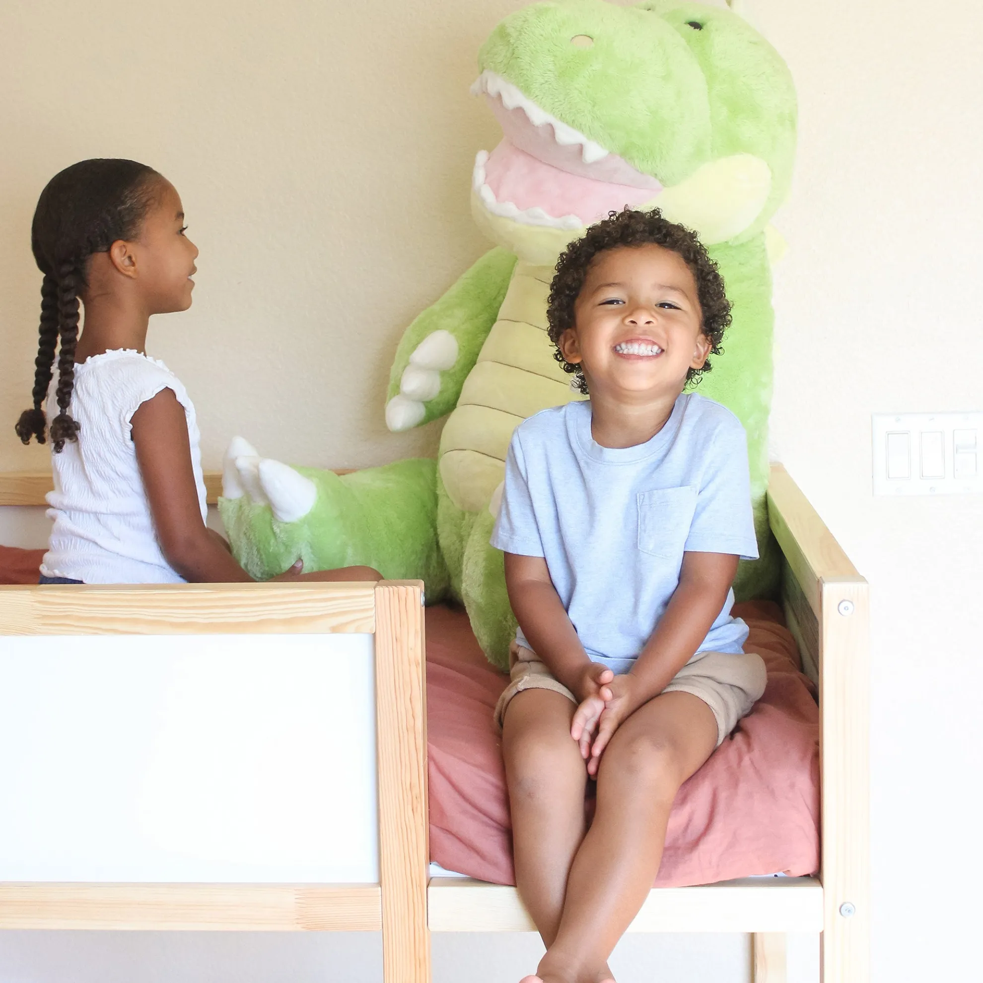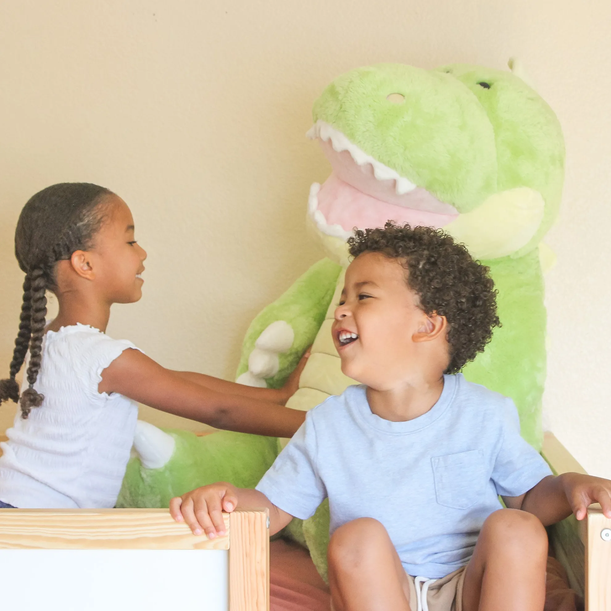 This Gentle Jumbos Dinosaur is the friendliest beast you’ll ever meet! Sitting nearly three feet tall, the oversized sweet stuffed dinosaur features soft teeth, floppy scales on its back and tail, soothing colors, and a friendly expression. The squishy three-toed feet and substantial body covered in ultra-soft green fur with yellow accents encourage jumbo-sized hugs and make this plush pal great to snuggle with and lean against! Gentle Jumbos are the perfect companions for kids two and older and add a unique decorative touch to any nursery, bedroom, or playroom!