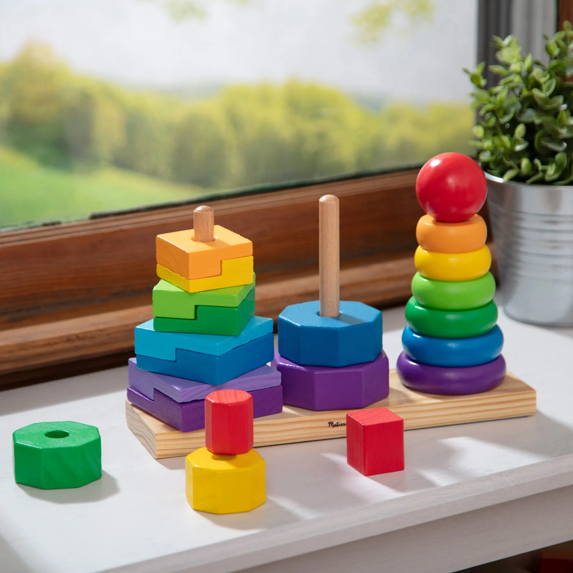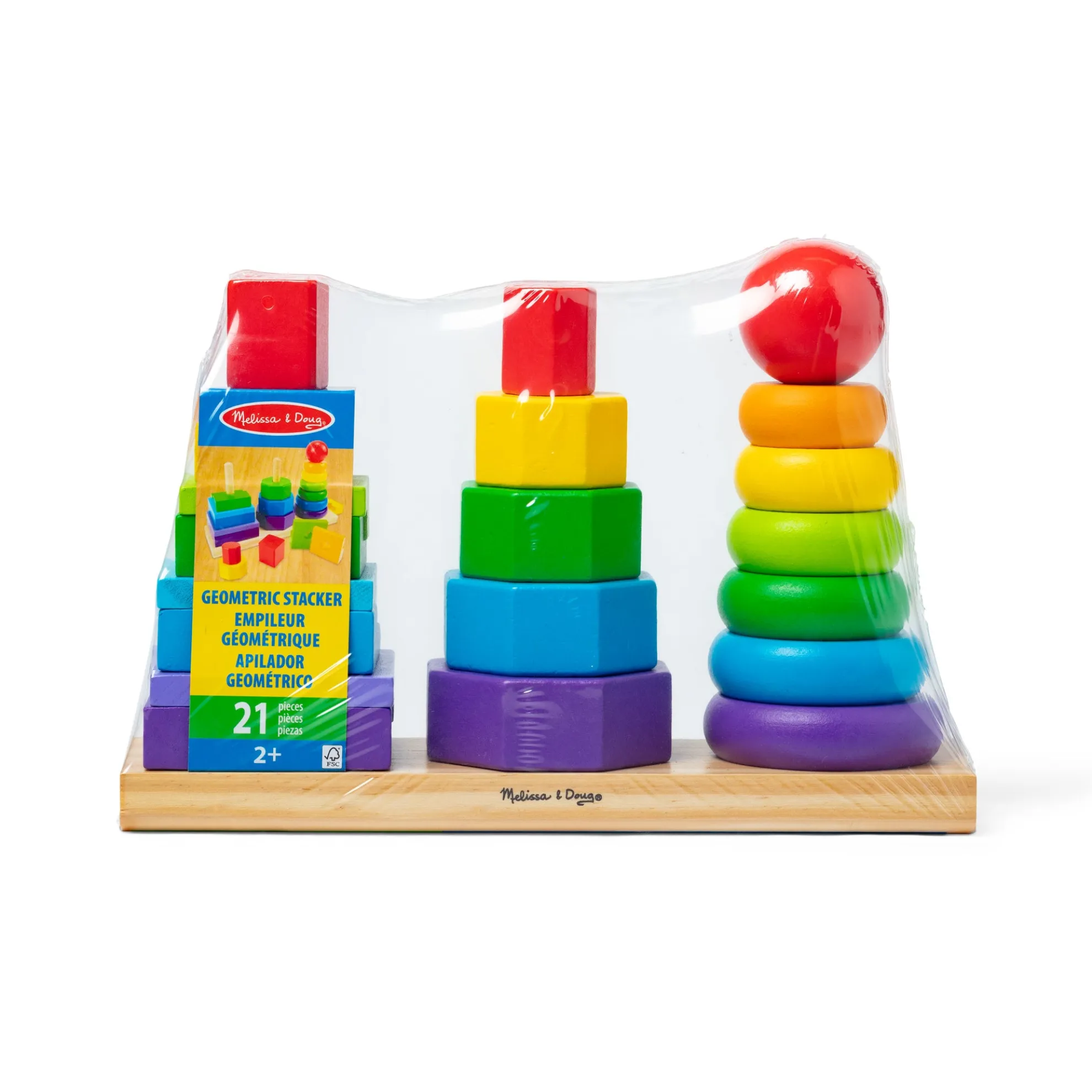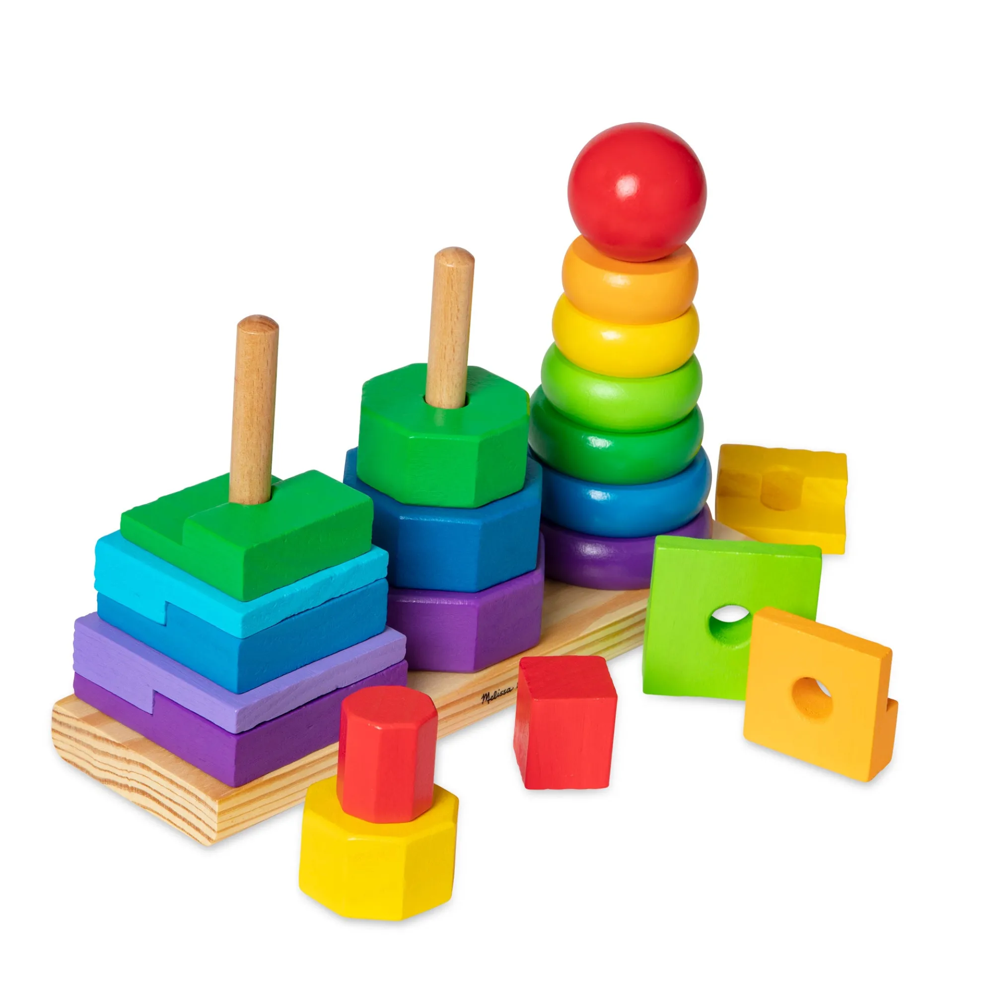 Building new skills is just part of the fun when little ones match and sort these colorful wooden pieces. The Geometric Stacker toy for toddlers includes rings, octagons, and rectangles that can be slotted onto the three rods attached to the wooden base. Kids can stack the shapes on the rings according to size, or explore other ways to play such as sorting by color or creating patterns. The 21 wooden pieces are sized for little hands, and they’re made from high-quality, child-safe materials. This early-childhood learning toy provides endless possibilities for creative expression while building shape, color, and size differentiation skills. The first-concepts set is a manipulatives all-star and makes a great gift for children ages two and older for hands-on, screen-free play. Today, Melissa & Doug is proudly partnering with the American Academy of Pediatrics to foster early brain development and help children build important life skills through play.
