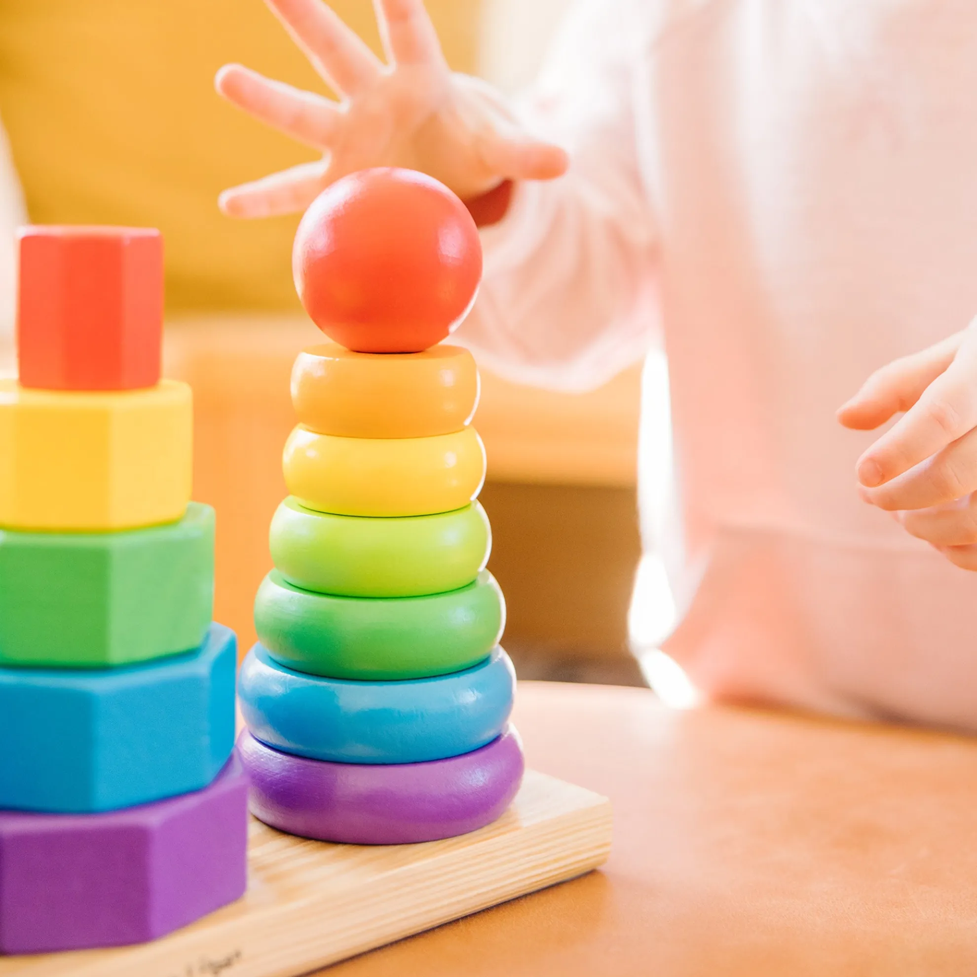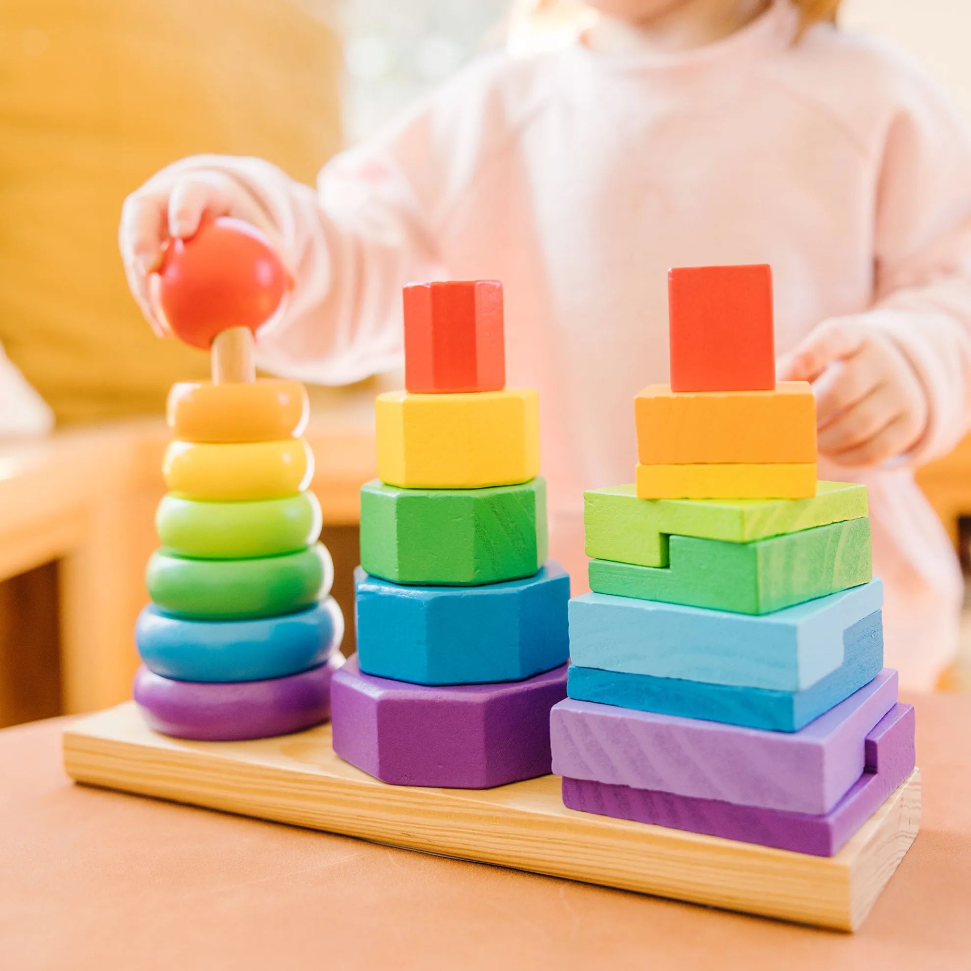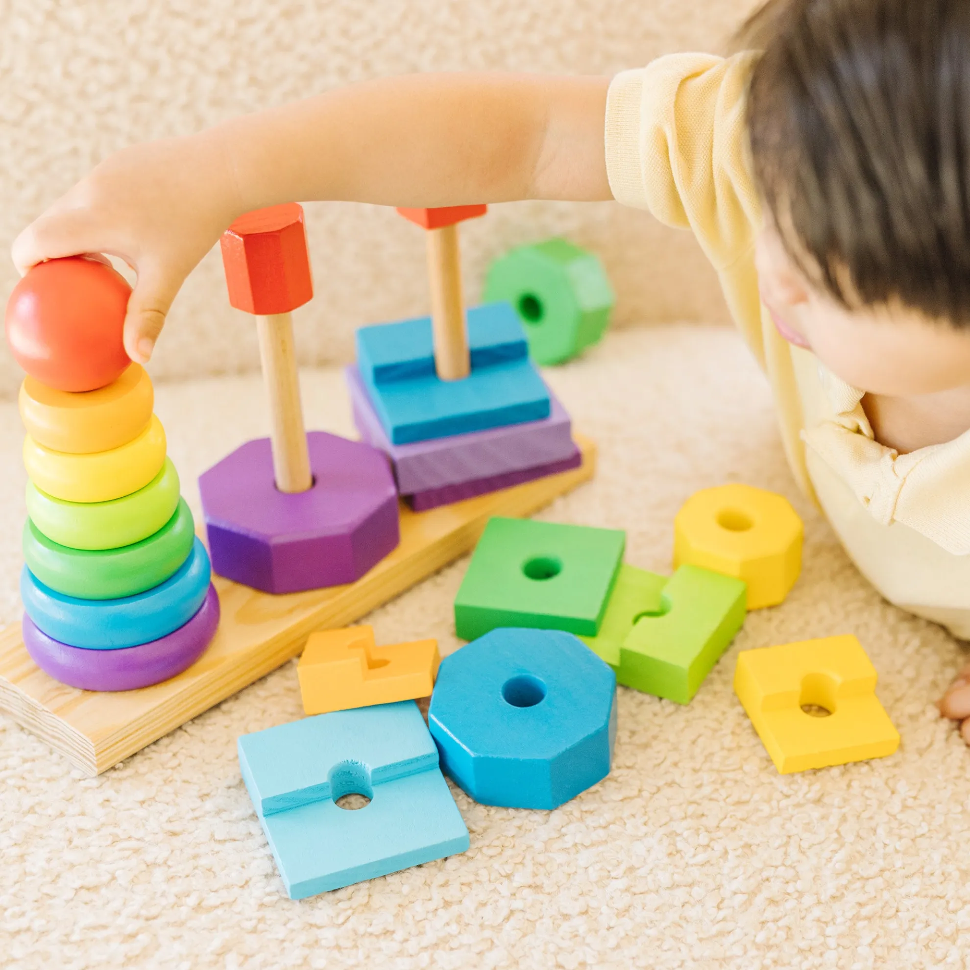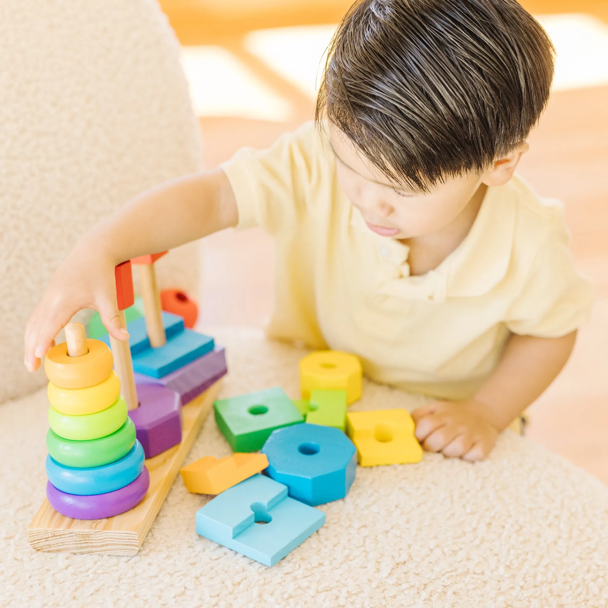 Building new skills is just part of the fun when little ones match and sort these colorful wooden pieces. The Geometric Stacker toy for toddlers includes rings, octagons, and rectangles that can be slotted onto the three rods attached to the wooden base. Kids can stack the shapes on the rings according to size, or explore other ways to play such as sorting by color or creating patterns. The 21 wooden pieces are sized for little hands, and they’re made from high-quality, child-safe materials. This early-childhood learning toy provides endless possibilities for creative expression while building shape, color, and size differentiation skills. The first-concepts set is a manipulatives all-star and makes a great gift for children ages two and older for hands-on, screen-free play. Today, Melissa & Doug is proudly partnering with the American Academy of Pediatrics to foster early brain development and help children build important life skills through play.