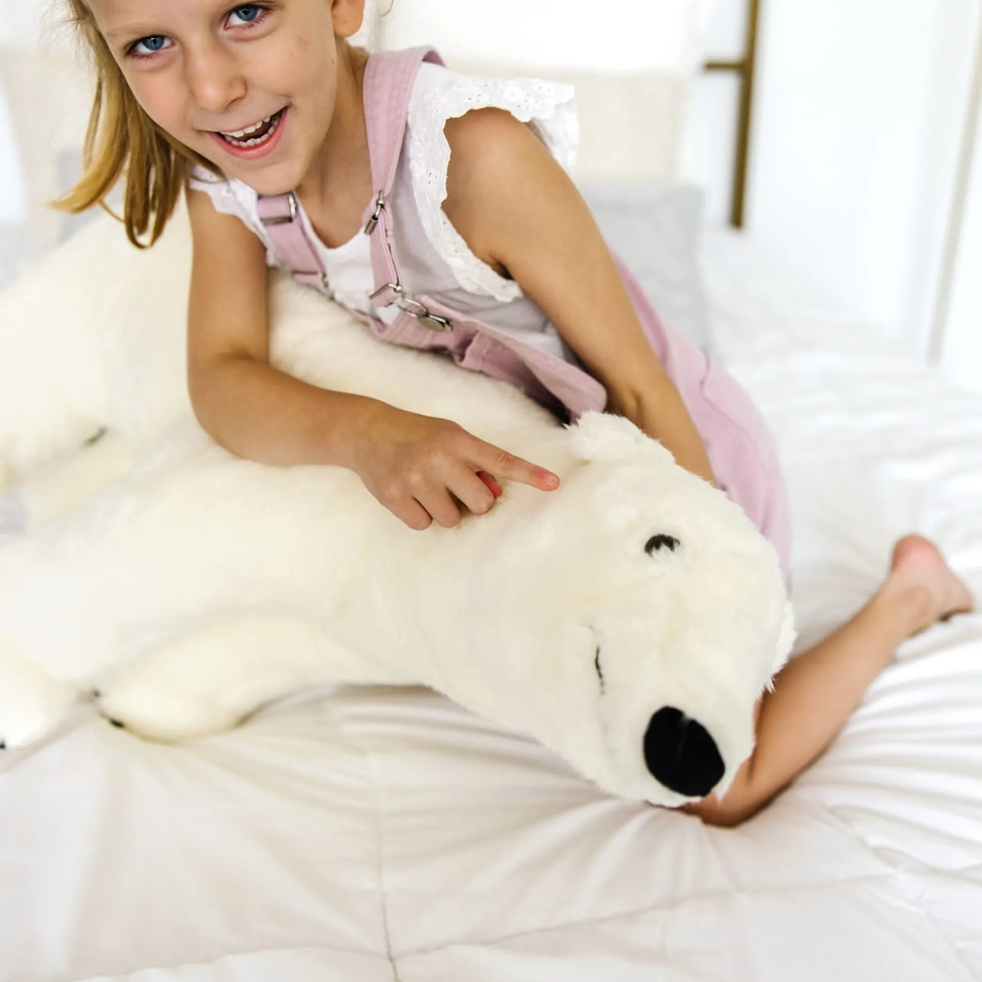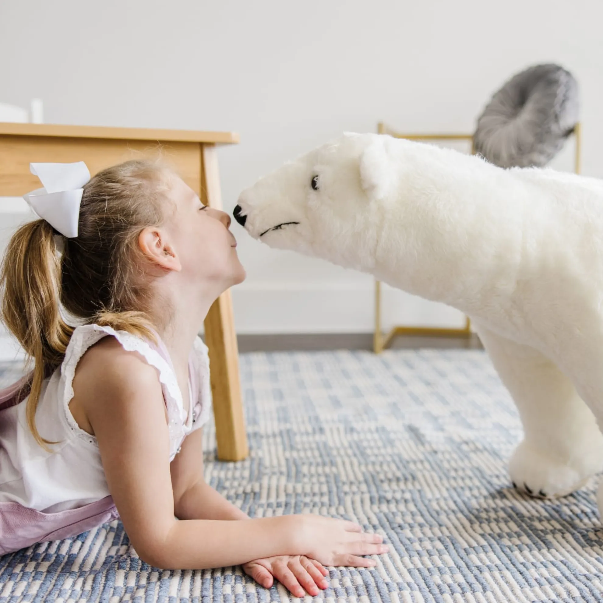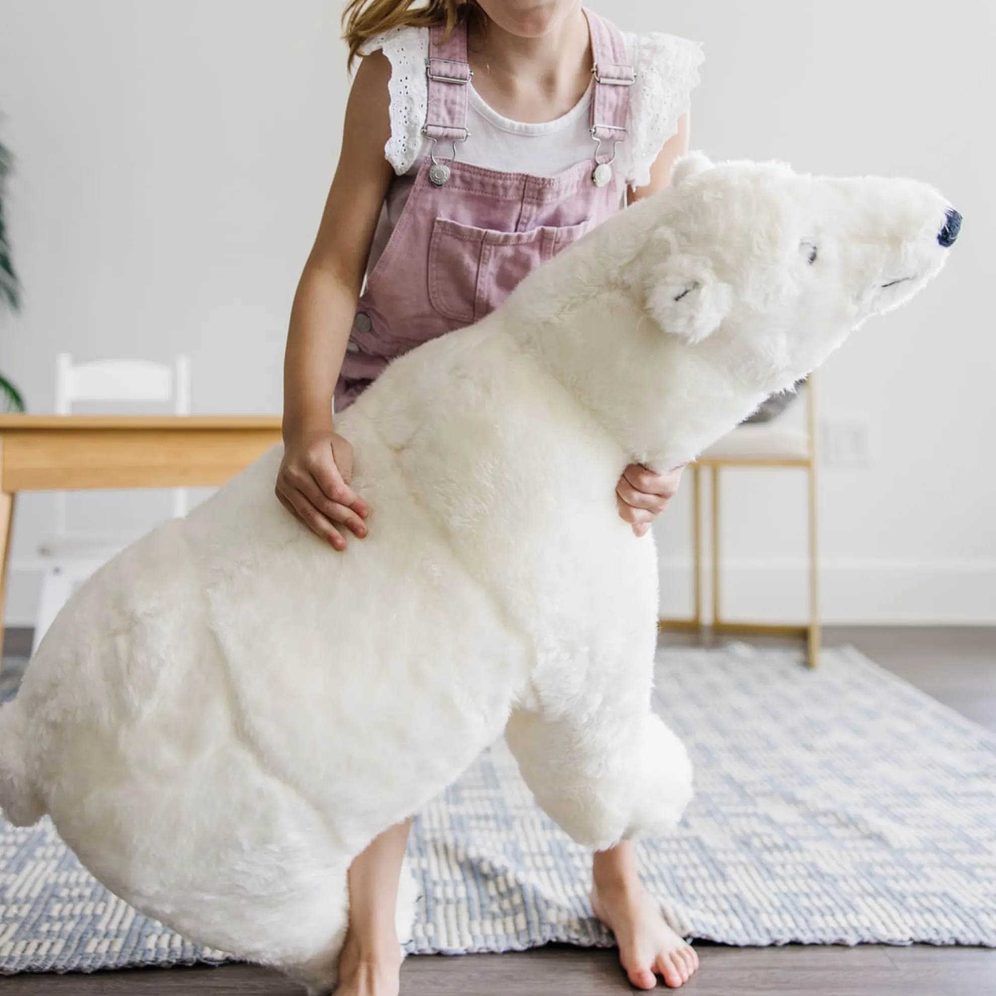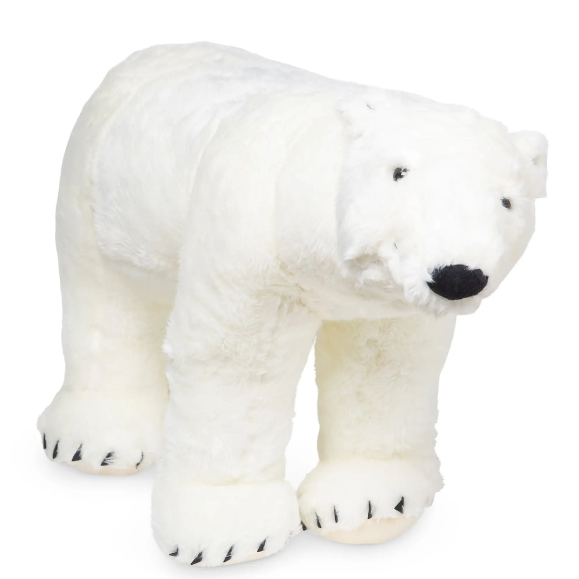 Make chilly days extra cozy with your very own polar bear! The beautiful white plush fur is both durable and incredibly soft to the touch, while the quality construction and a strong interior structure means it will hold up to years of hugs and snuggling. Its impressive size (nearly three feet long and standing 20 inches tall!) and an attention to realistic details–felt claws, padded huge paws, a soft, black nose, and a lovable expression–make this a big bear that’s sure to warm any heart!